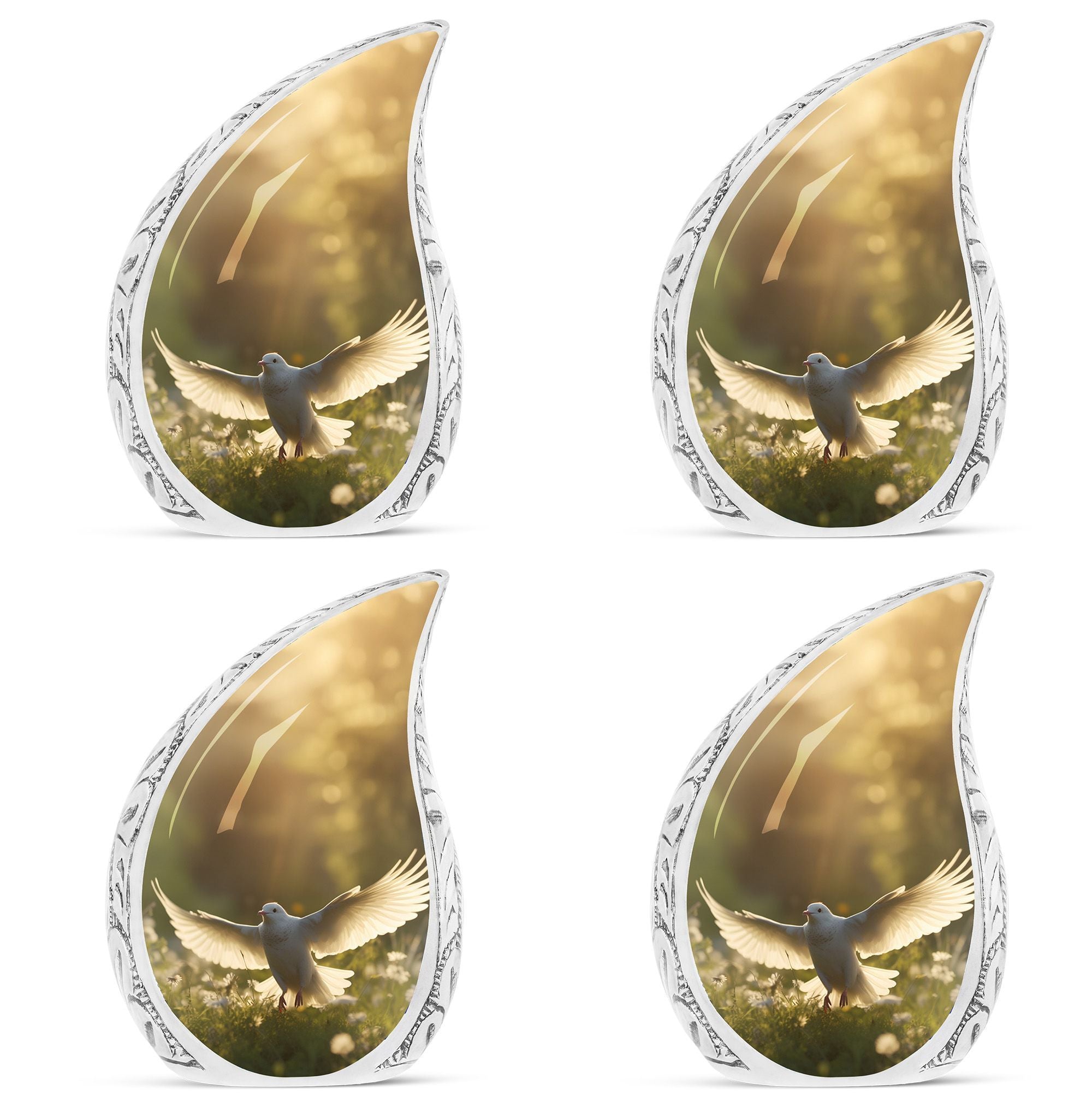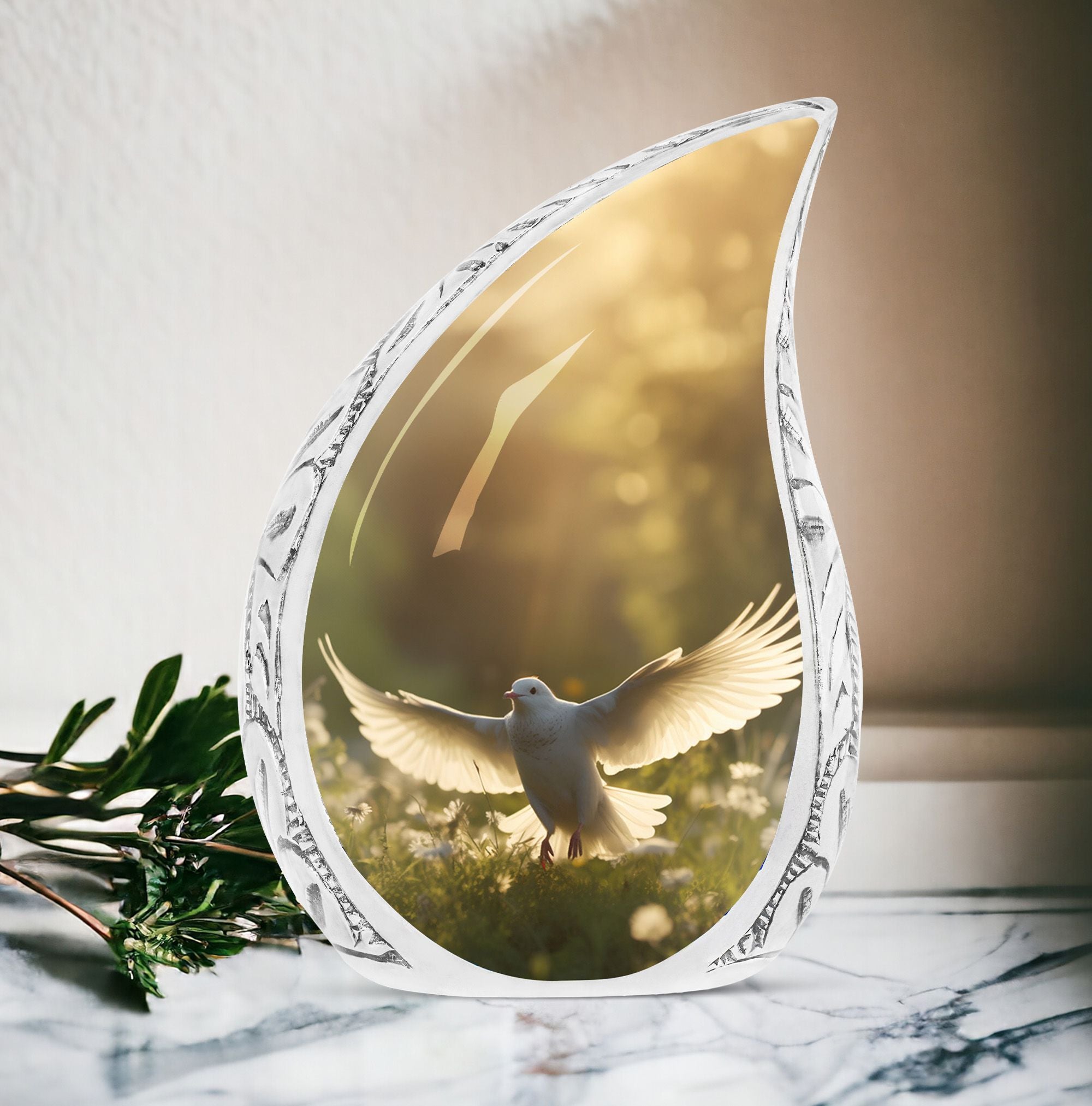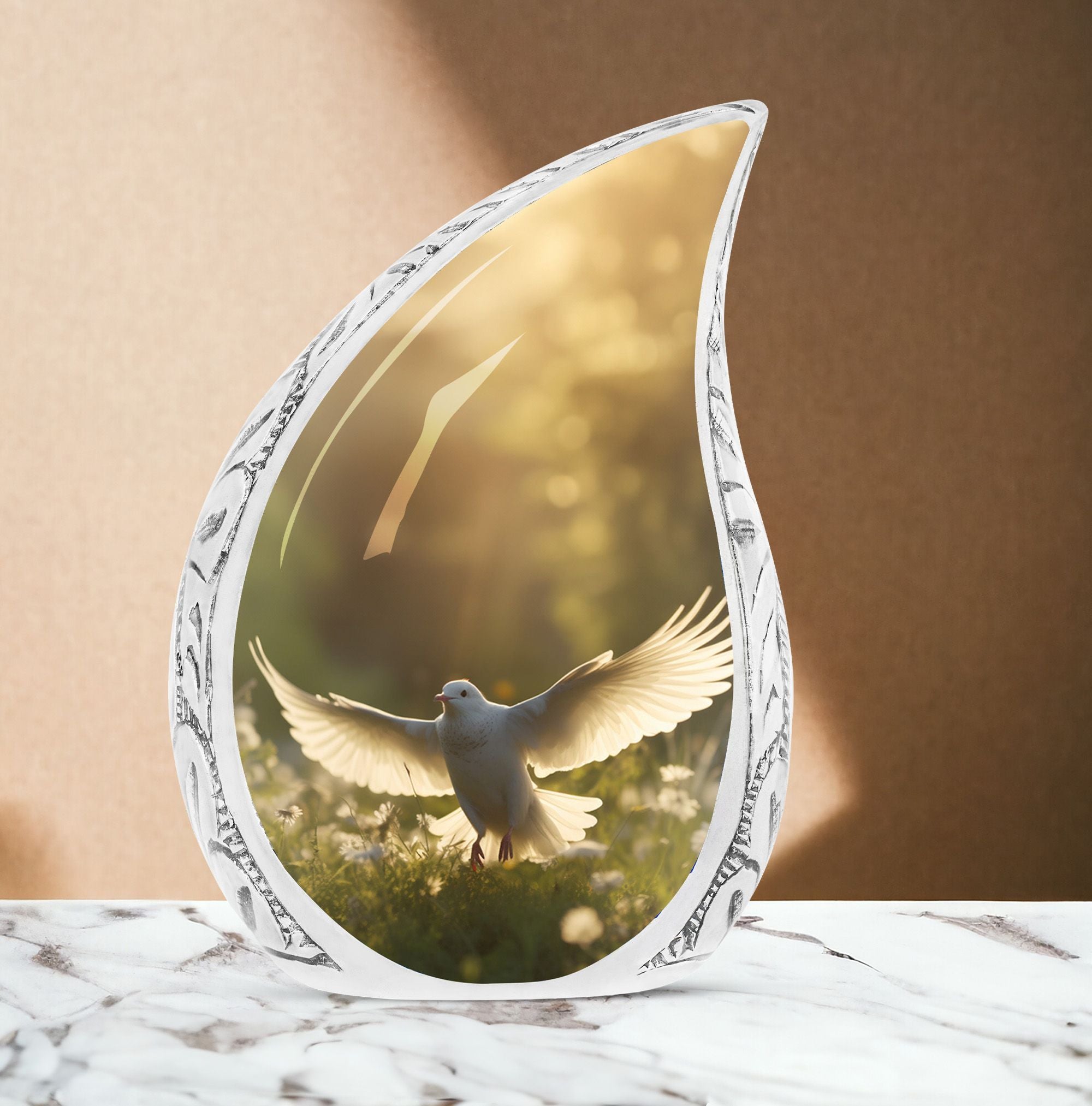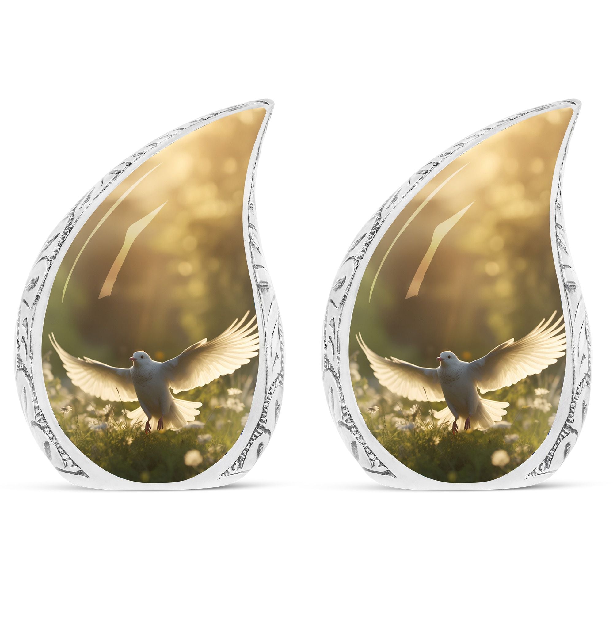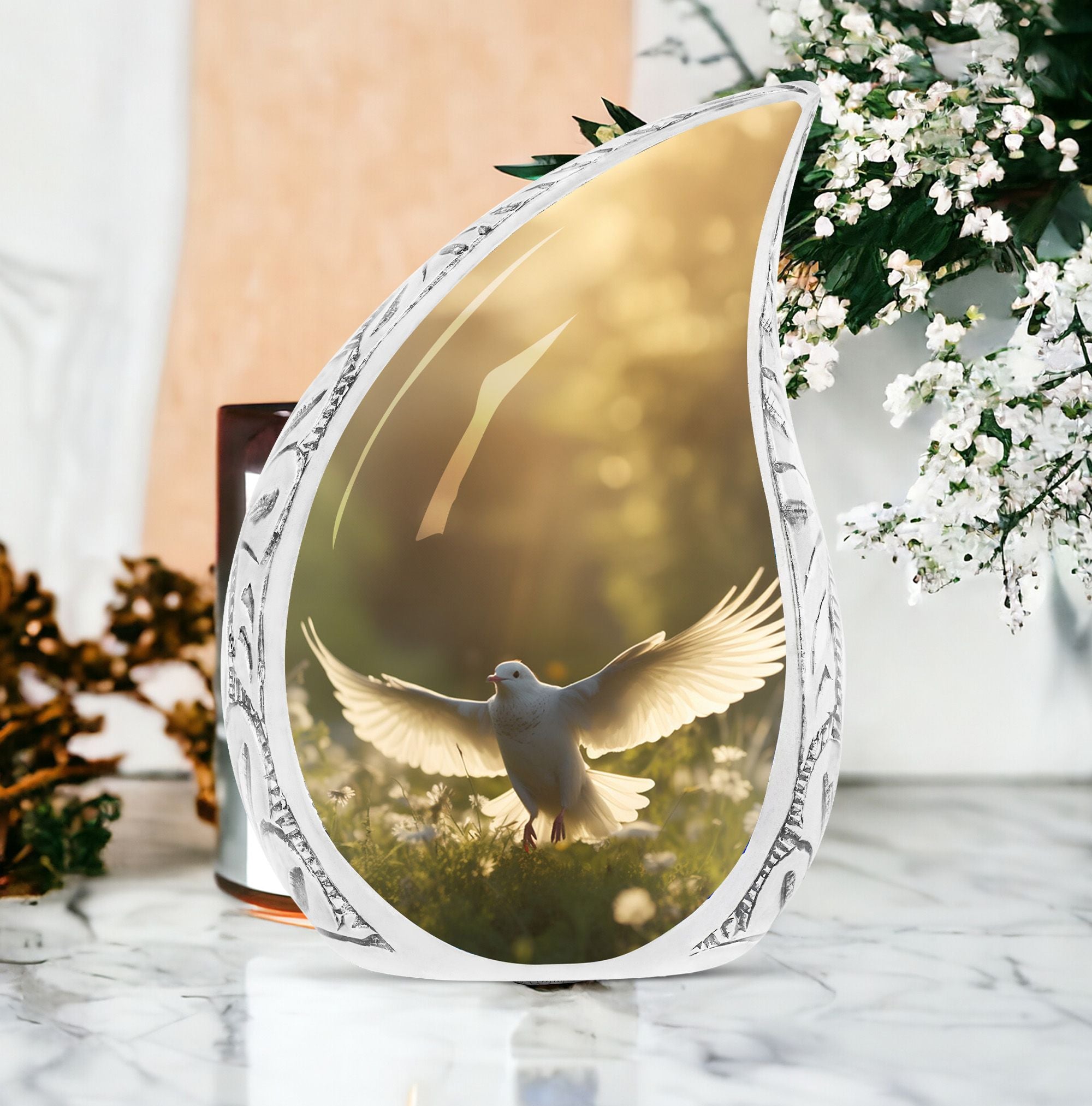 Introducing our Dove Cremation Urn, a meaningful tribute to your dearly departed. This large urn is impressive in stature at 10 inches in height, weighing a steady 3.3 pounds. Crafted to delicately balance the weight of your memories, it's capable of holding up to 200 cubic inches of ashes. The urn is manufactured with high-quality aluminium, assuring its durability and extending its lifespan substantially. This modern urn is paired with a chic velvet pouch which provides a safe containment for the ashes, emphasizing sophistication and reverence. Personalizing your memorial tribute is made possible with our customization option, allowing engraved names onto the urn, making it unique and personal. While its classic design reinforces its timeless appeal, our Dove Cremation urn embodies style, durability, and heartwarming emotional value encapsulated in a single product. Discover the peace of honouring your loved ones with our personalised urns that showcase enduring elegance and heartfelt remembrance.