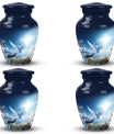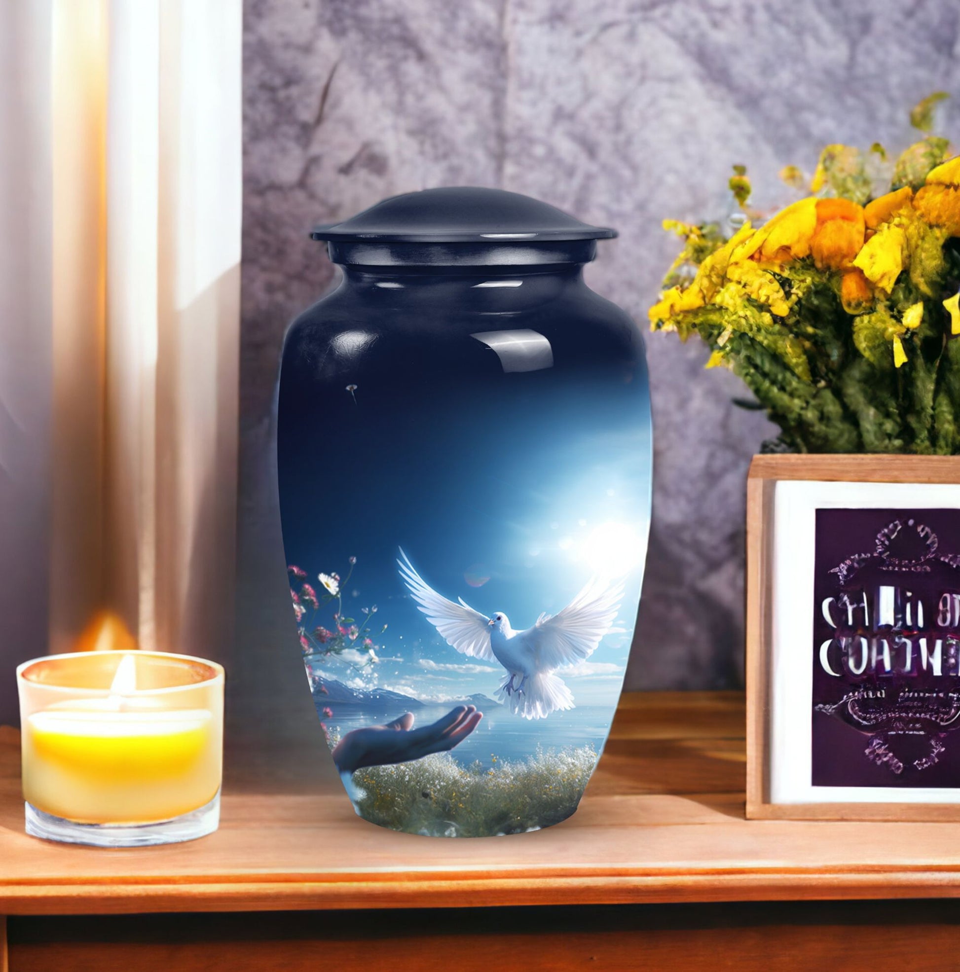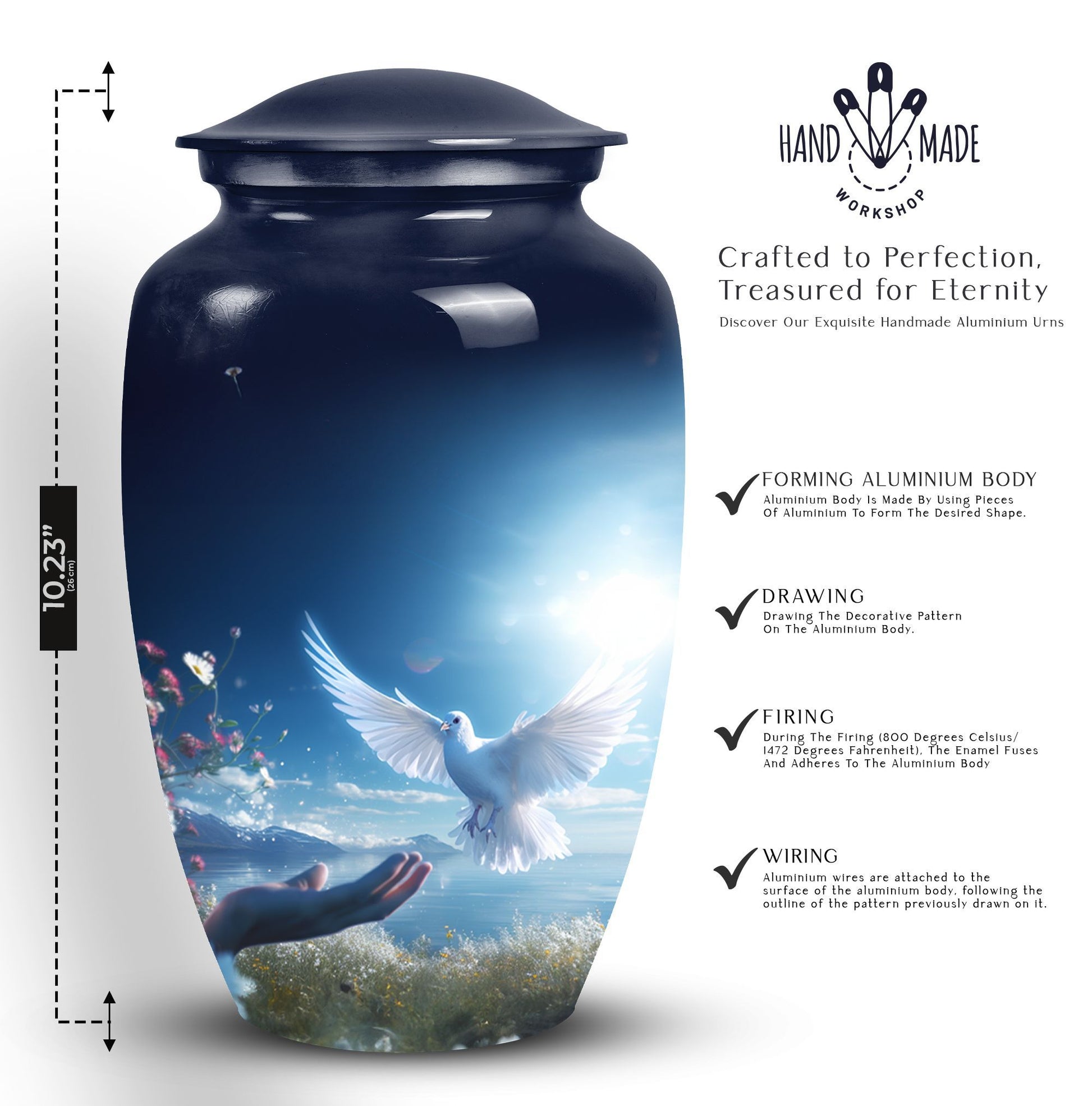 Remarkable in both elegance and craftsmanship, our Aluminium Classic Urn presents a serene and calming tribute for the beloved. These Large Urns are flawless for any memorial ceremony and a timeless accompaniment to your home. Garnering prominence as Dove Urns for Human Ashes, their size of 3 inches and weight of 3.3 pounds lends them a comfortable steadiness. They exude an exquisite charm by emanating a height of 10 inches. The urn's capacity of 200 cubic inches ensures it can encapsulate sentiments in an ample, warm embrace. A unique feature of our urns is the customization option, allowing you to personalize your piece with engraved names, narrating an intimate tale of love and reverence. Not to forget, their purchase includes a velvet pouch, promising secure containment of the ashes. Beautiful Urns for Mom, Large Cremation Urns, or Personalized Urns for Adults and Ashes, our collection caters to diverse preferences and honors memories in the most sublime manner.