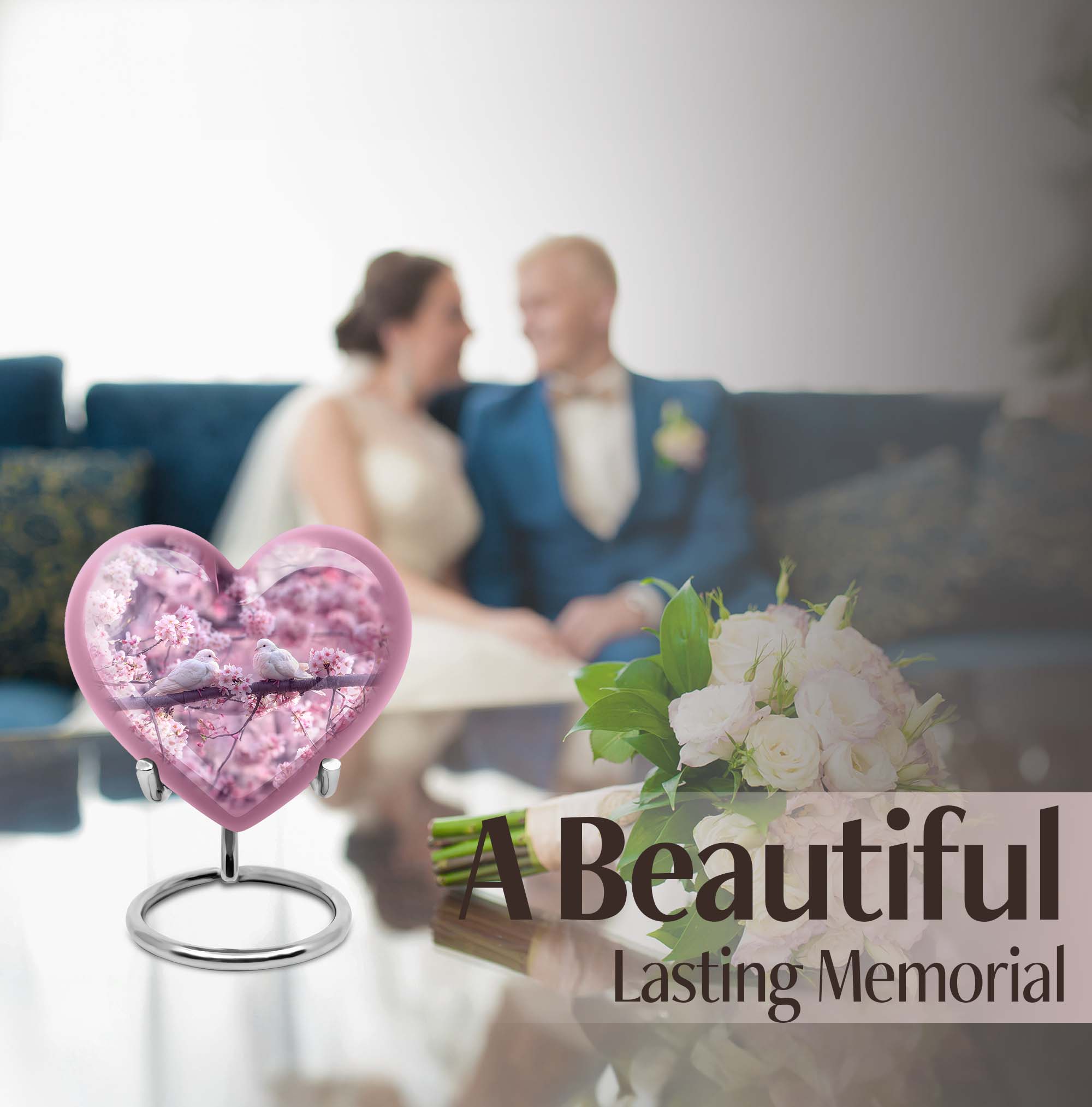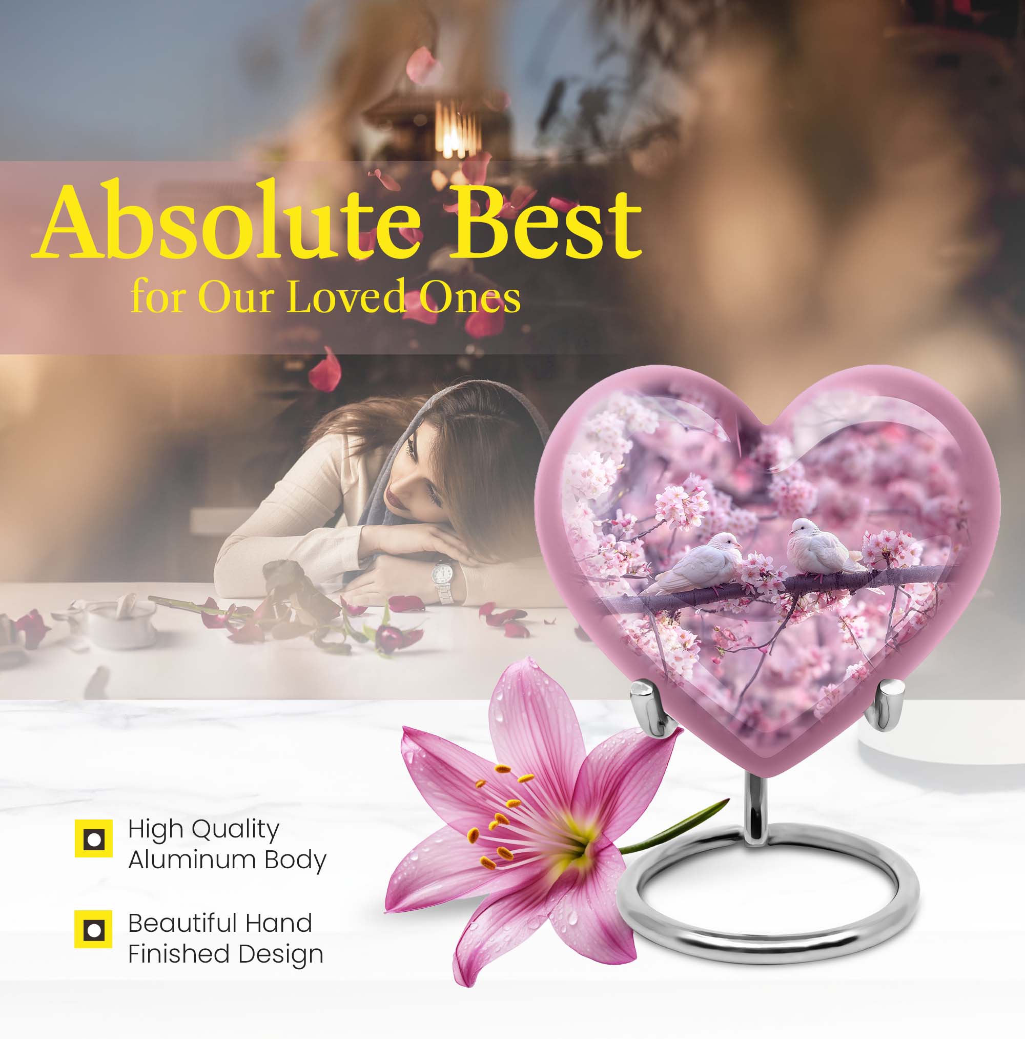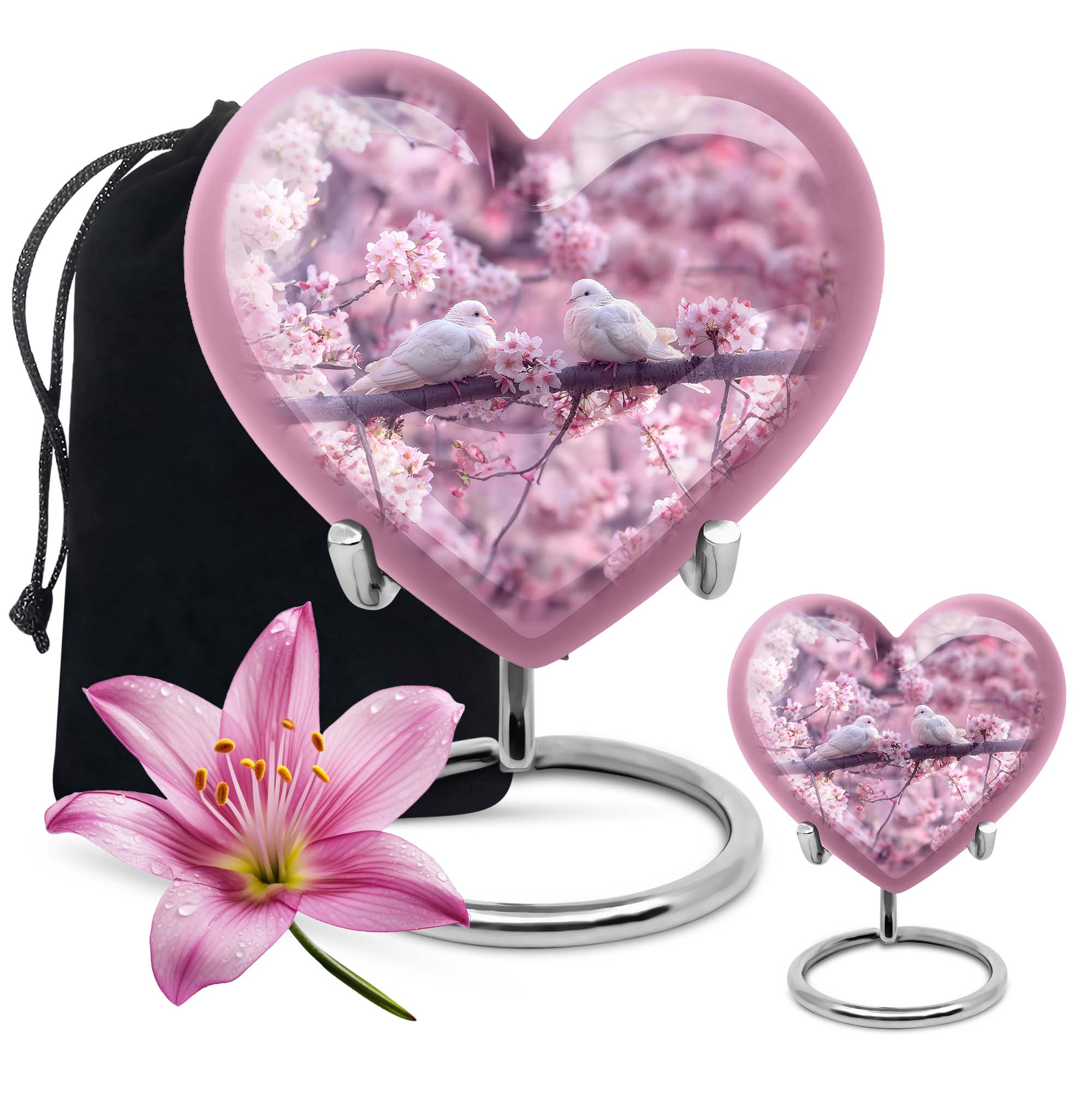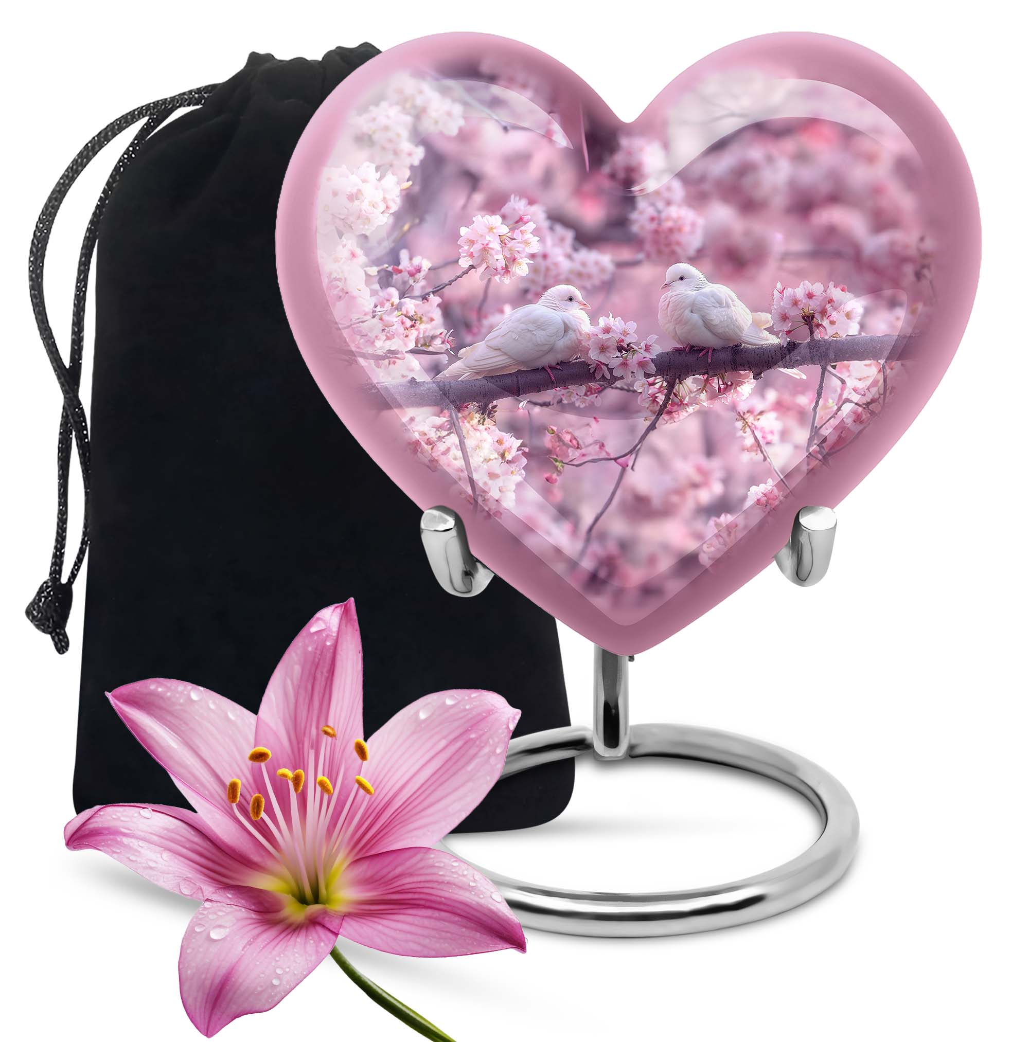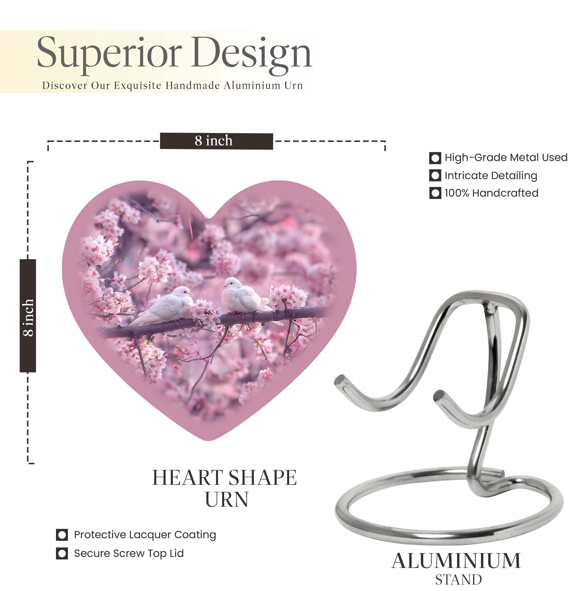Discover the elegance and serenity in our 10-inch dove urn, an exceptional choice for memorial urns for ashes of adult men. Our large urn, formed from durable aluminium, weighs a substantial 3.3 pounds and can accommodate up to 200 cubic inches of ashes. It emanates a soothing abstract theme, lovely for those seeking solace during testing times. Your loved ones' remains will stay securely within, as the cremation urn comes accompanied by a velvet pouch for containment of ashes. For a personal touch, we offer customization options where you can engrave names on it. Our urn highlights an exquisite heart urn design, a special way to remember and honor your beloved. Reverence, love, and memories, encapsulated in an urn. Acquiring this funeral urn can also add a refined decor element to your household. Not merely a vessel for ashes, but a celebration of life and enduring love. An exquisite selection for funeral urns for adult ashes for women and men.