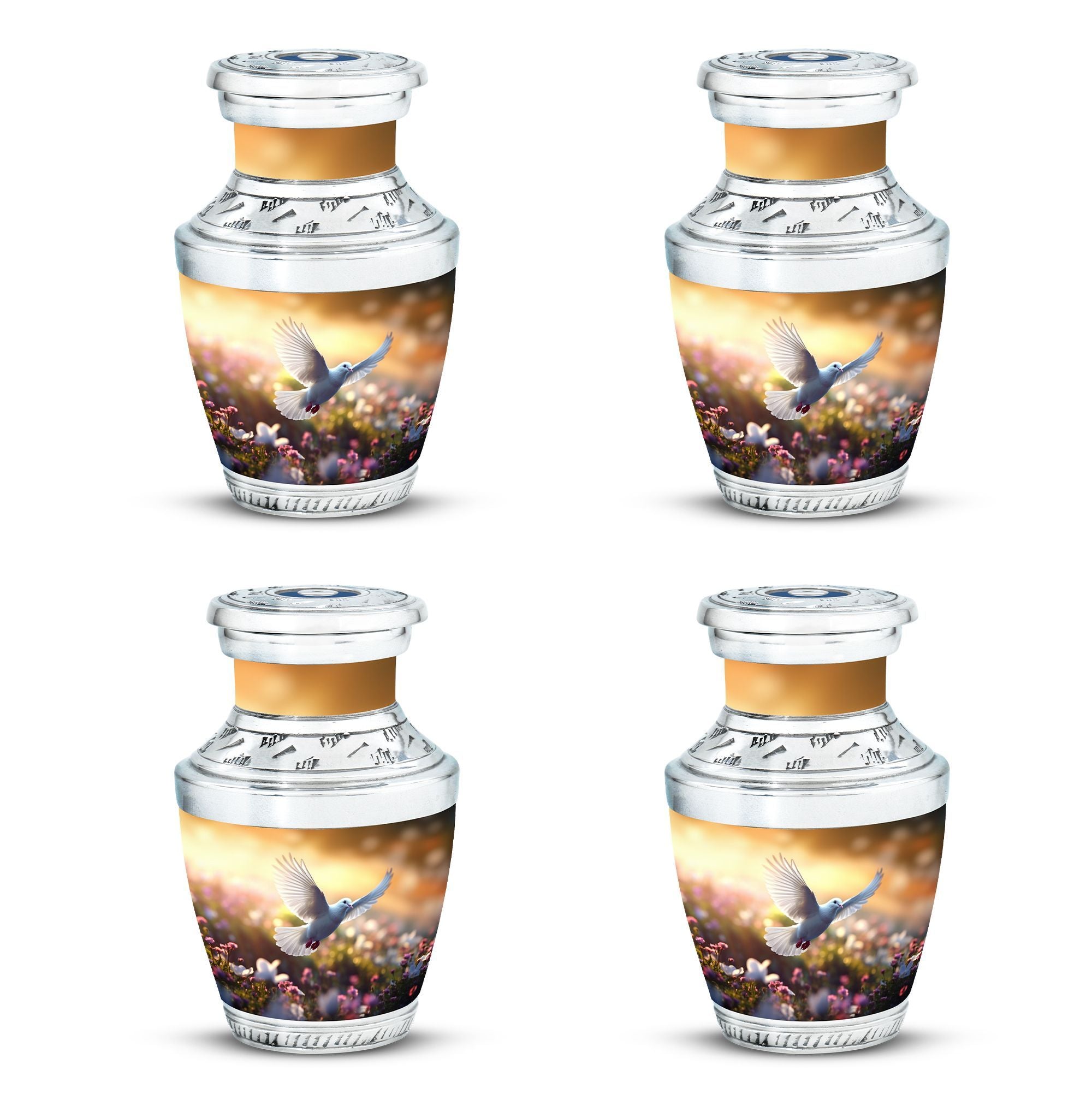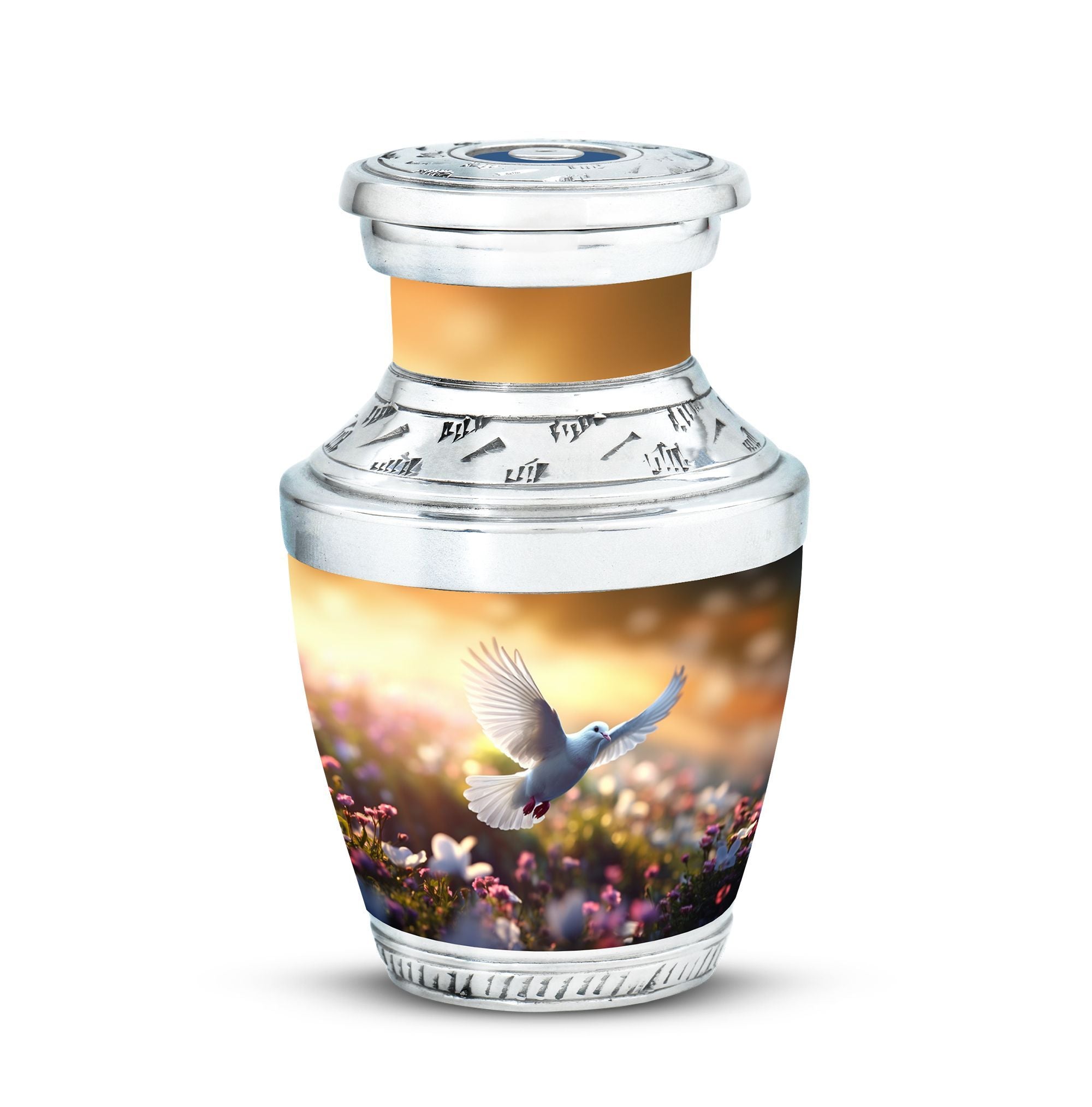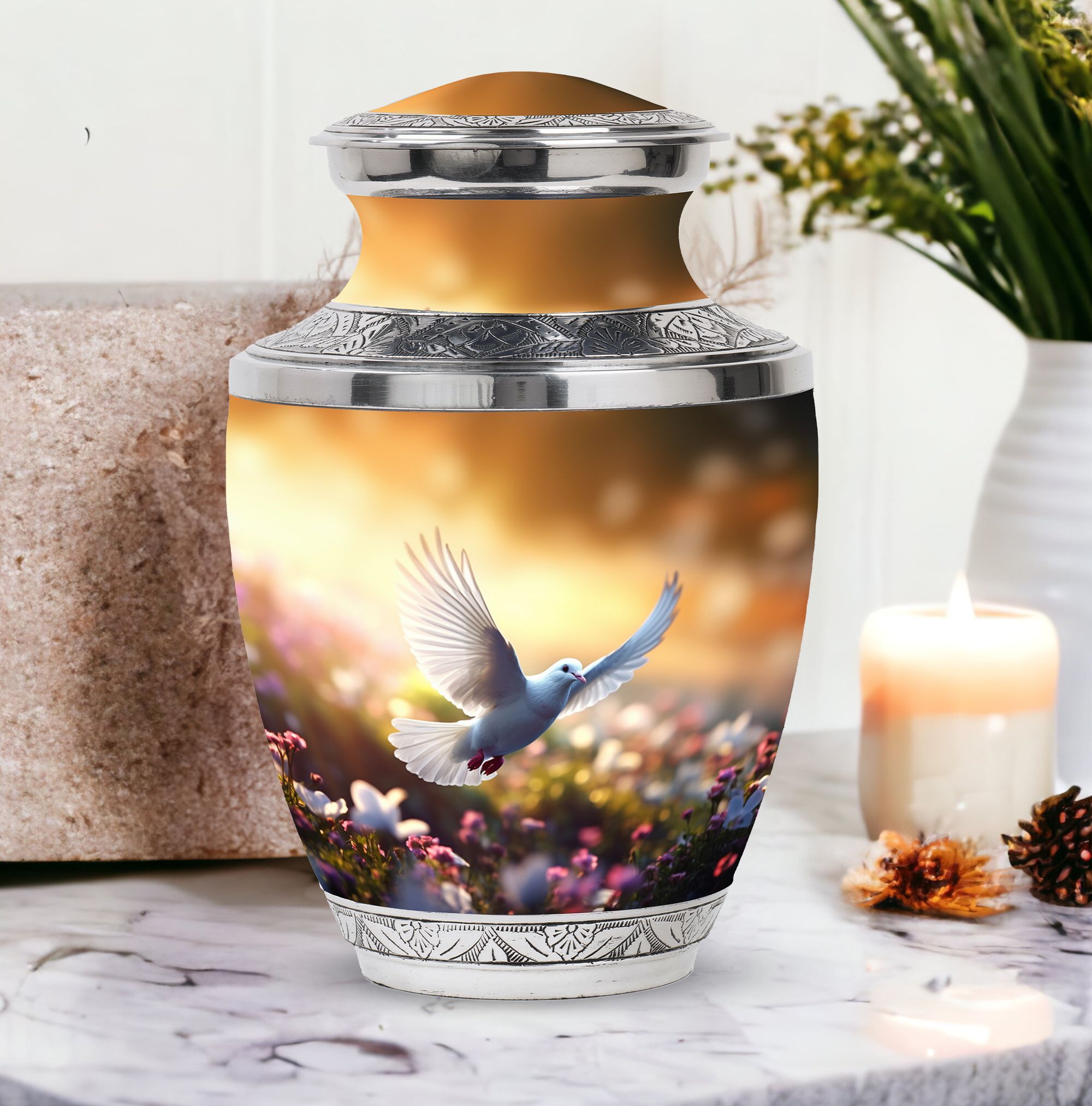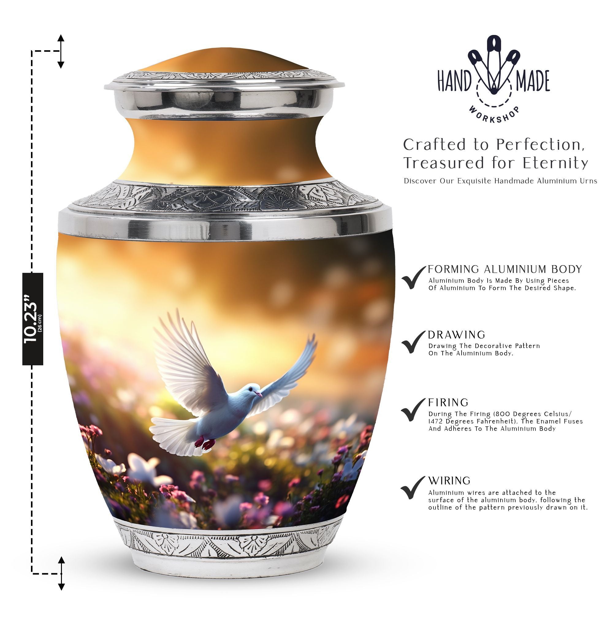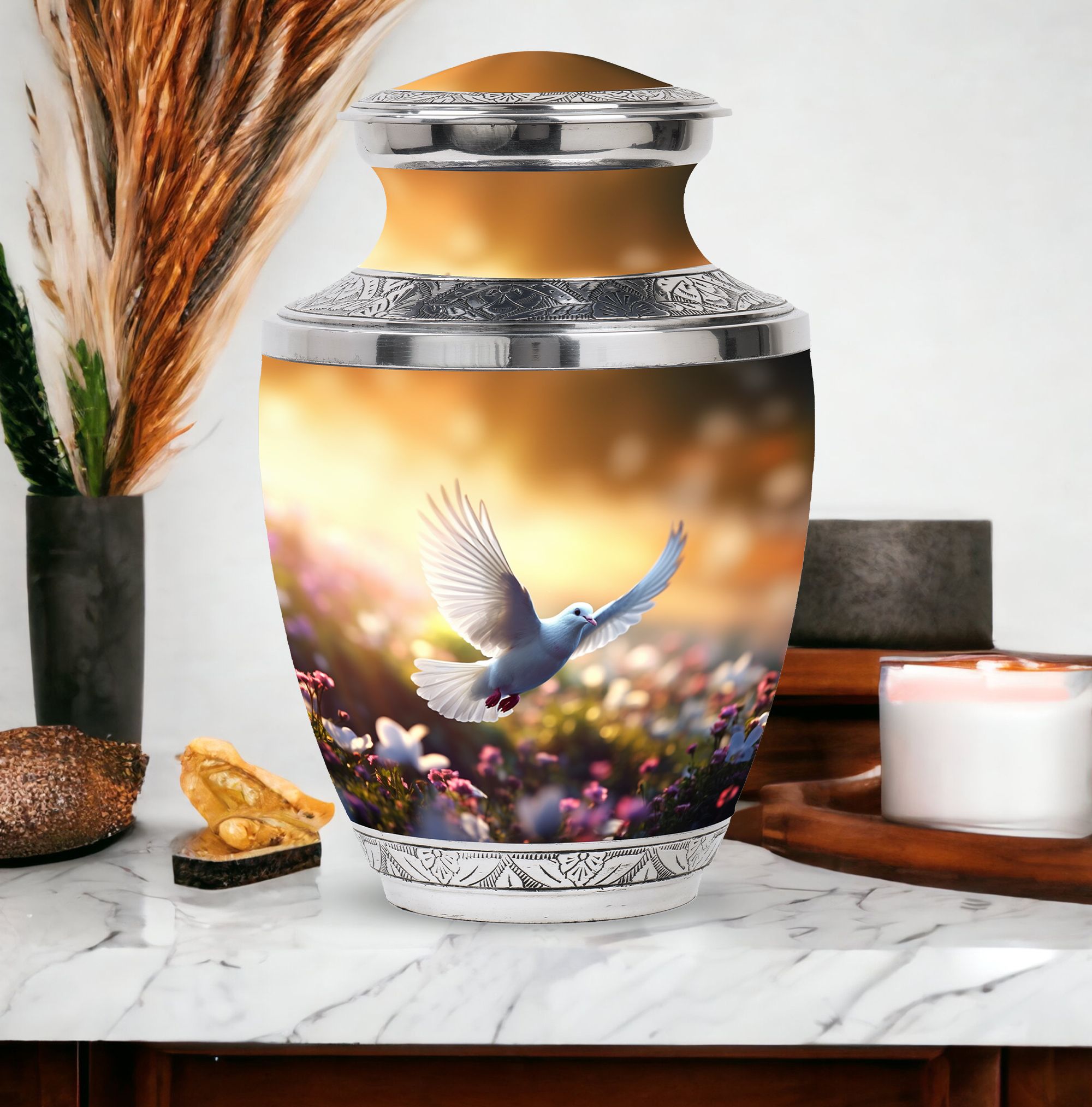 Honour the memory of your beloved with our aluminium 'Classic Urn', an epitome of respect and reverence, designed specifically for memorial rituals. This 'Large Urn', weighing 3.3 pounds, stands tall at a height of 10 inches with a spaciously designed capacity of 200 cubic inches. This beautifully crafted 'Dove Urn' is perfect for human ashes, a symbol of peace and serenity. It includes a velvet pouch, offering secure containment and respectful presentation. With personalization options available, you can have the loved one's name engraved, making this a truly unique keepsake. This 'memorial urn' perfectly suits the needs for your cremation ritual, echoing your sentiment with dignity. Thanks to its size of 3 inches, this urn perfectly fits anywhere in your home, preserving the memories while maintaining the decor. Notably, the urn is a significant choice for 'cremation containers for ashes' and stands out amongst 'metal urns for ashes'.
