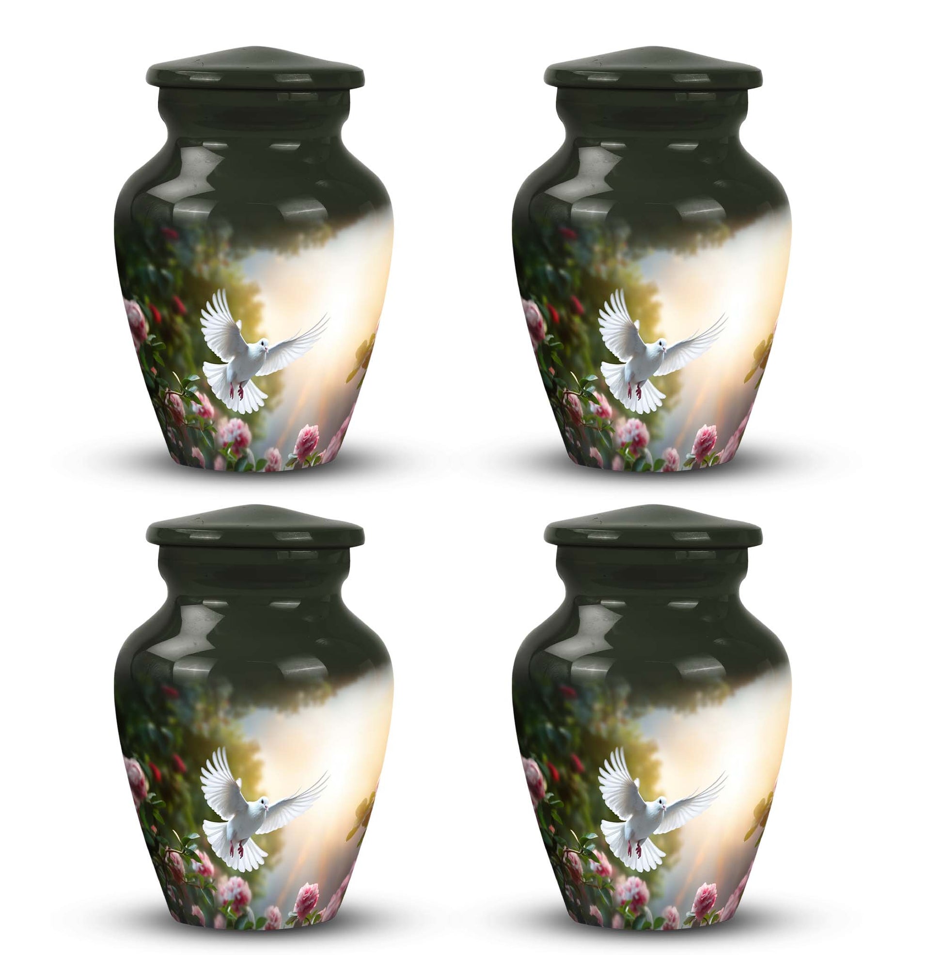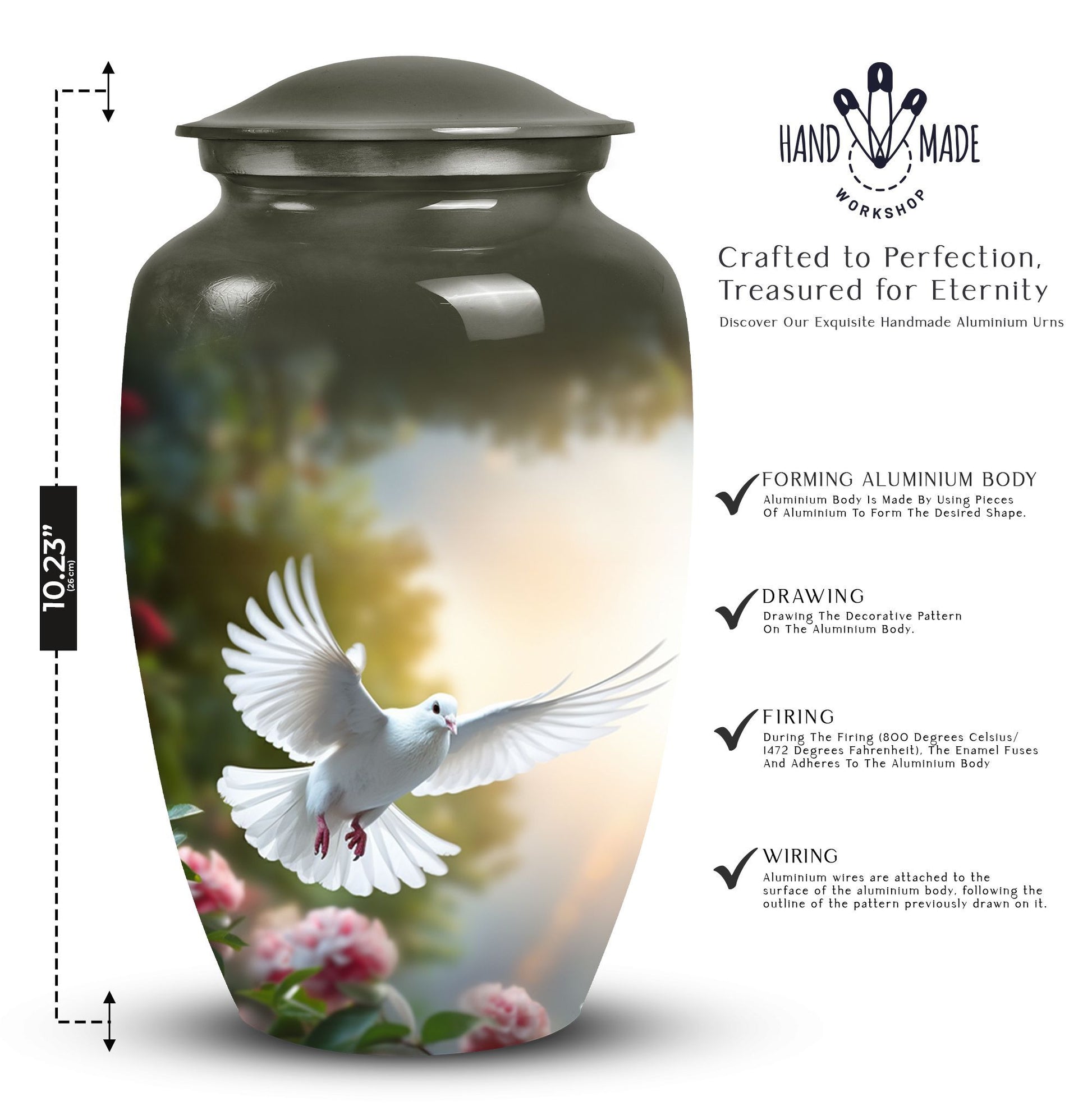 Celebrate the cherished memories of your loved ones with our Dove Flying Memorial Urn, a stunning piece of art more than just an urn for cremation. This large urn, standing gracefully at 10 inches in height and weighing 3.3 pounds, offers a significant capacity of 200 cubic inches. Crafted with great precision from quality Aluminium, our classic urn is designed to withstand the test of time. Its 3-inch size makes it a prominent and beautiful remembrance in your home. For a more personal touch, we offer the option to customize the urn with engraved names, adding a unique sentimental value to it. The package comes complete with a velvet pouch, perfect for the safe containment of ashes. This blend of beauty and practicality makes our urn an excellent selection among memorial urns, burial urns for ashes, modern urns, personalized urns, and beautiful urns. Make this lasting tribute a part of your memorial ceremony supply today.