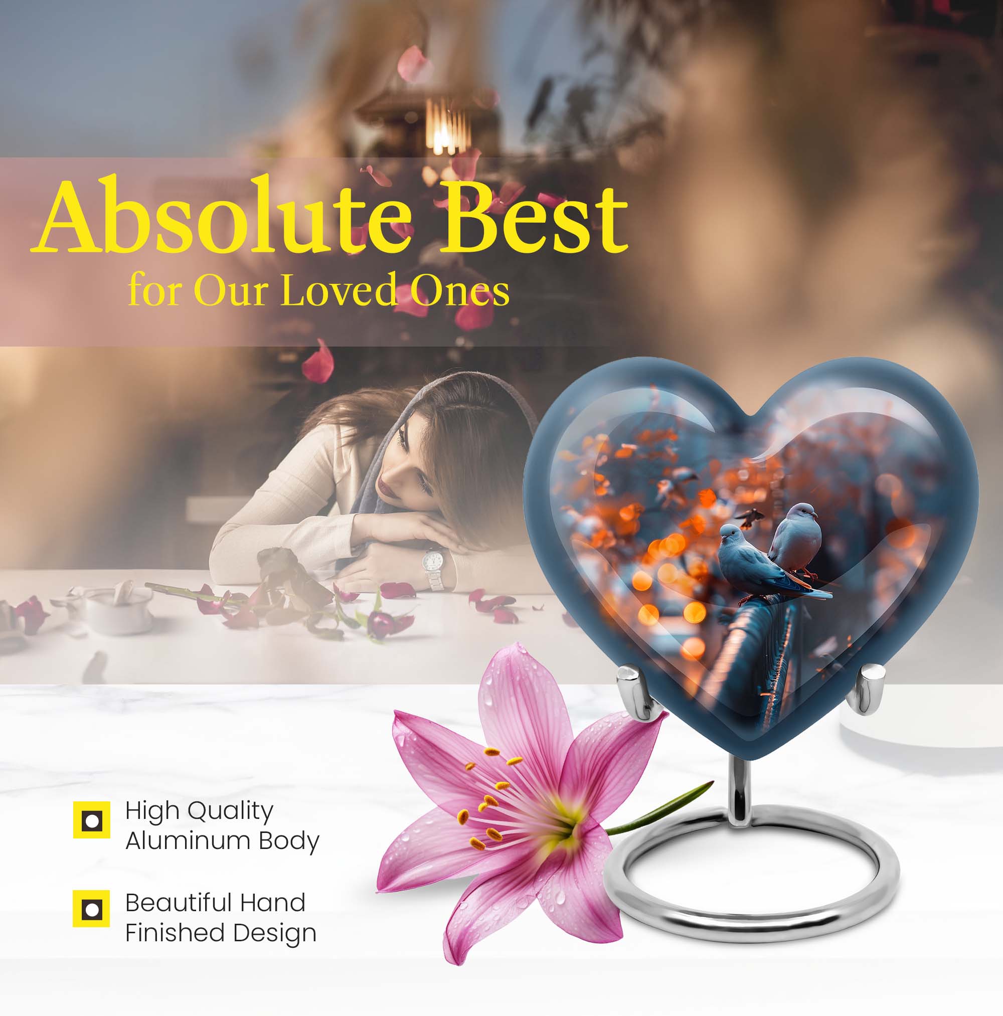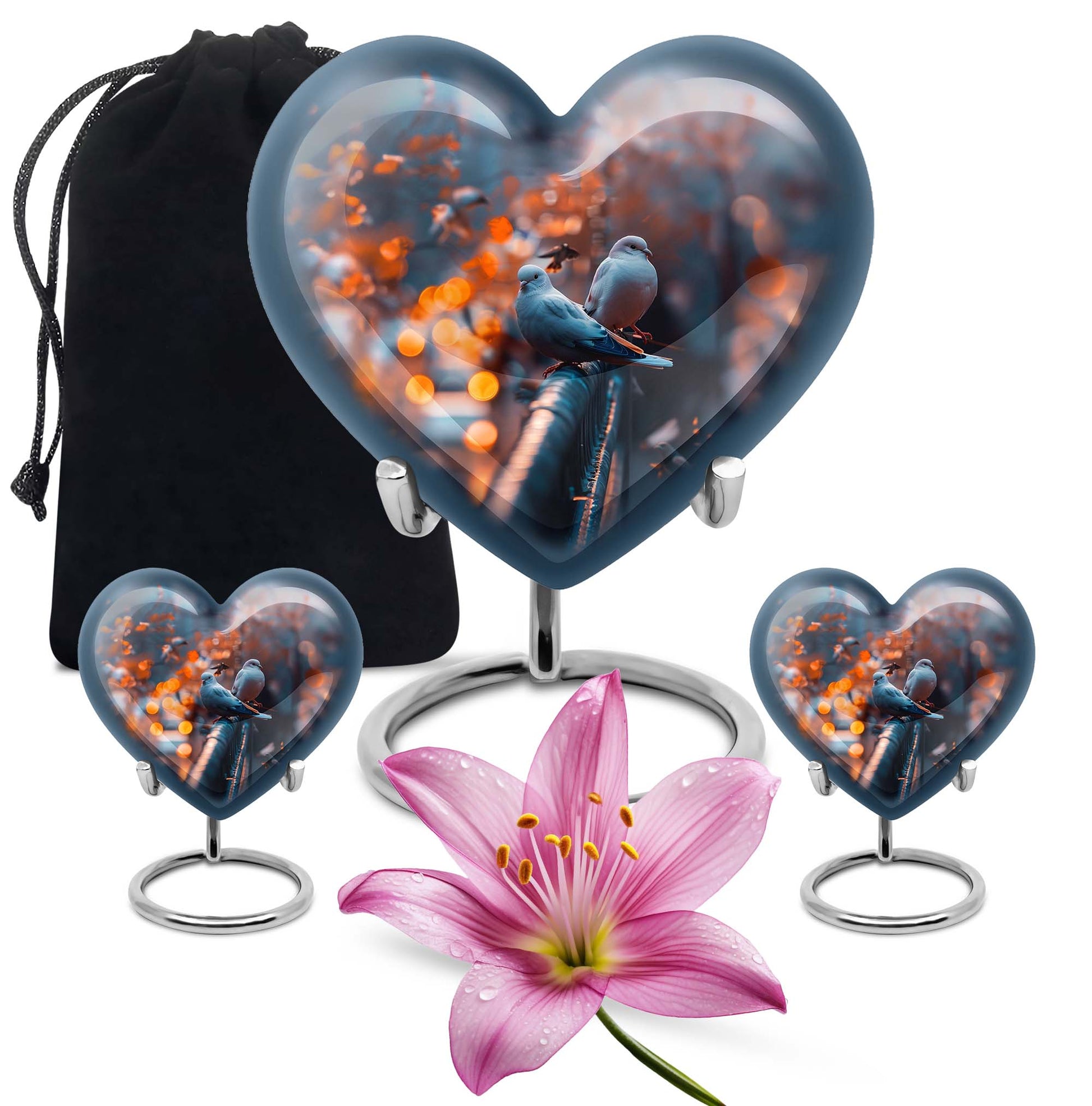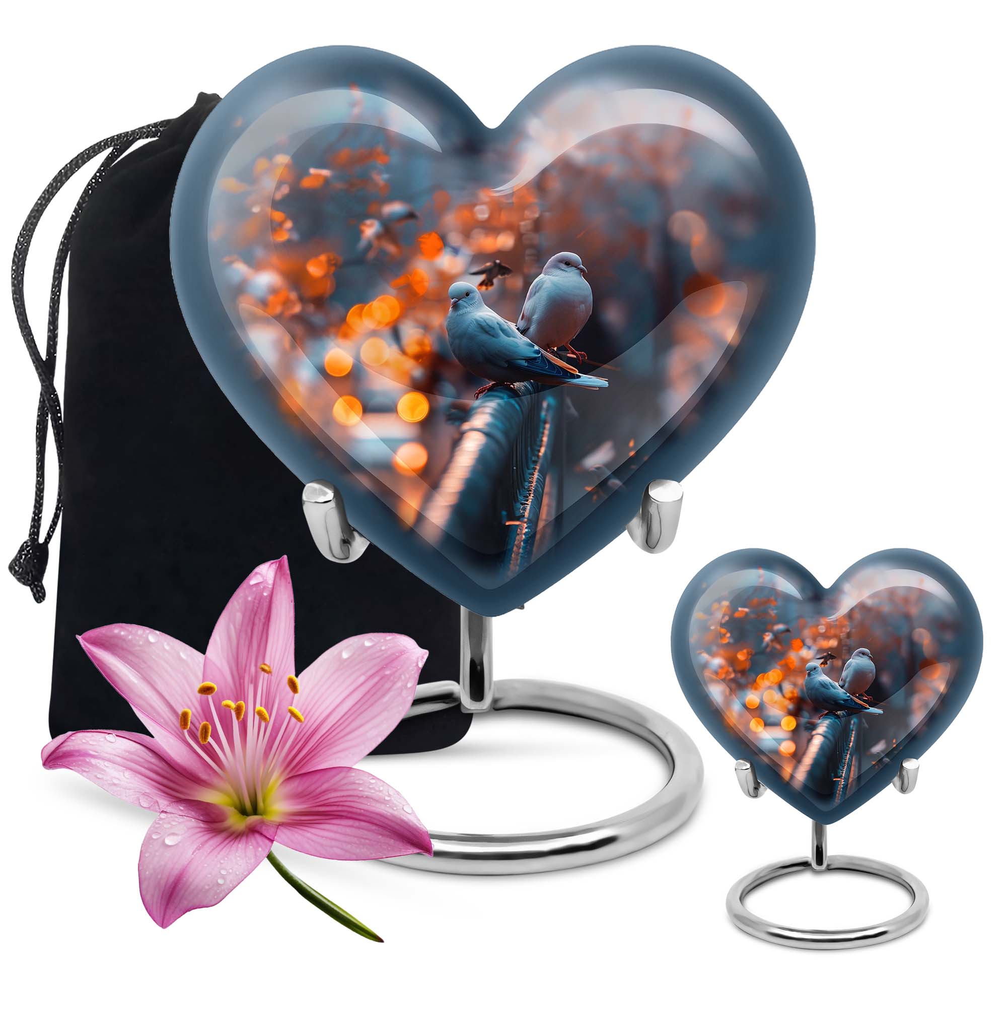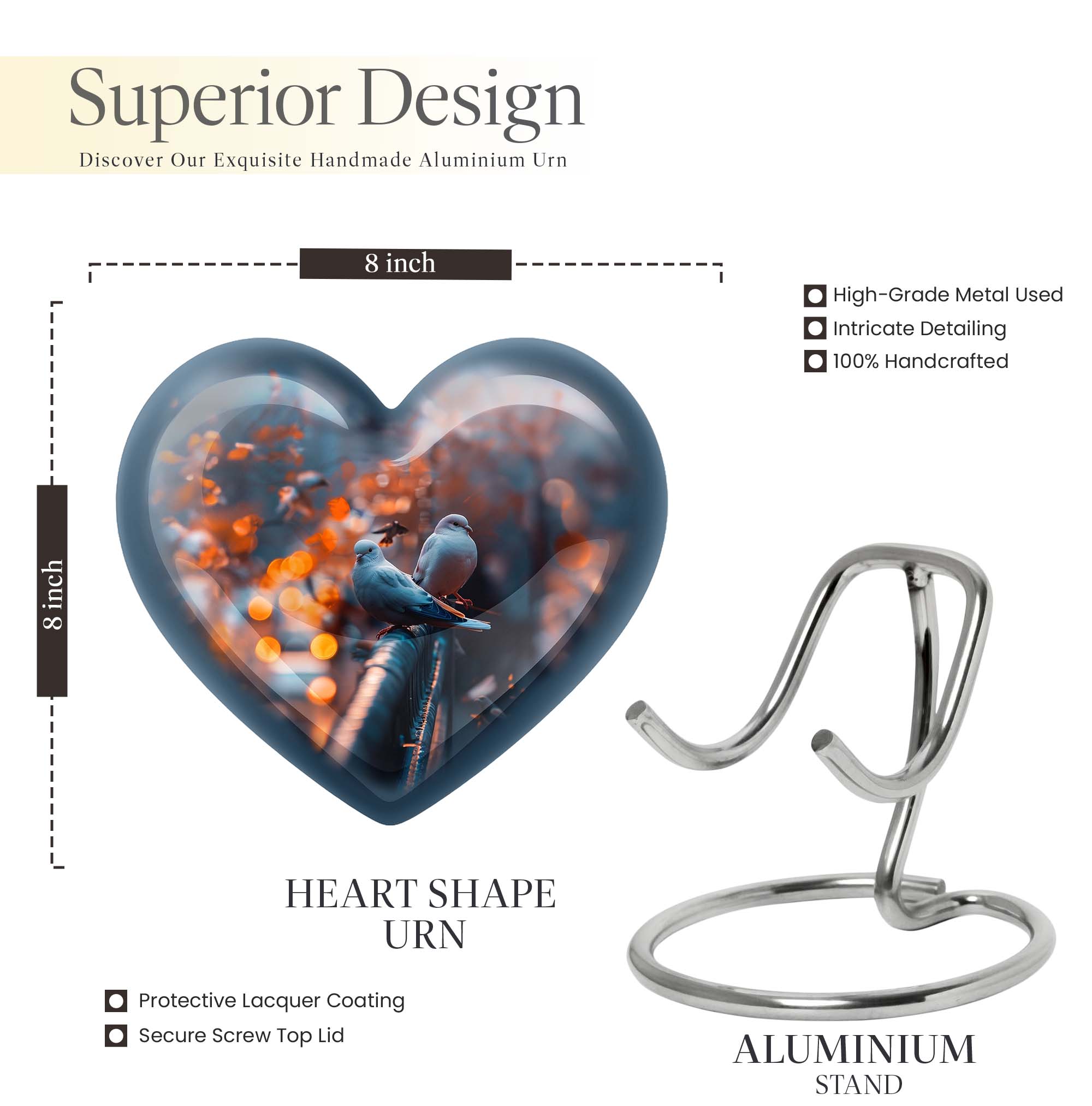 Honour your departed loved ones with our large dove urn, a meaningful and significant addition to your memorial ceremony supplies. Crafted from high-quality aluminium, this 10-inch urn embodies longevity and resilience, exemplifying the enduring nature of love. The urn has a capacity of 200 cubic inches, making it suitable for human cremation ashes. Weighing in at 3.3 pounds, it showcases a flower theme resonating with the serenity and peace associated with serene final resting places. The urn comes with a velvet pouch, ensuring safe containment and offering another layer of respect towards cherished memories. Customization is available, you can personalize this funeral urn with engraved names, adding a unique touch to this remembrance piece. This product resonates with keywords such as 'memorial forever urns' and is relevant for searches related to 'human cremation urn' and 'urns metal'. With its heart design and substantial size, it also might appeal to people looking for 'large urns'.