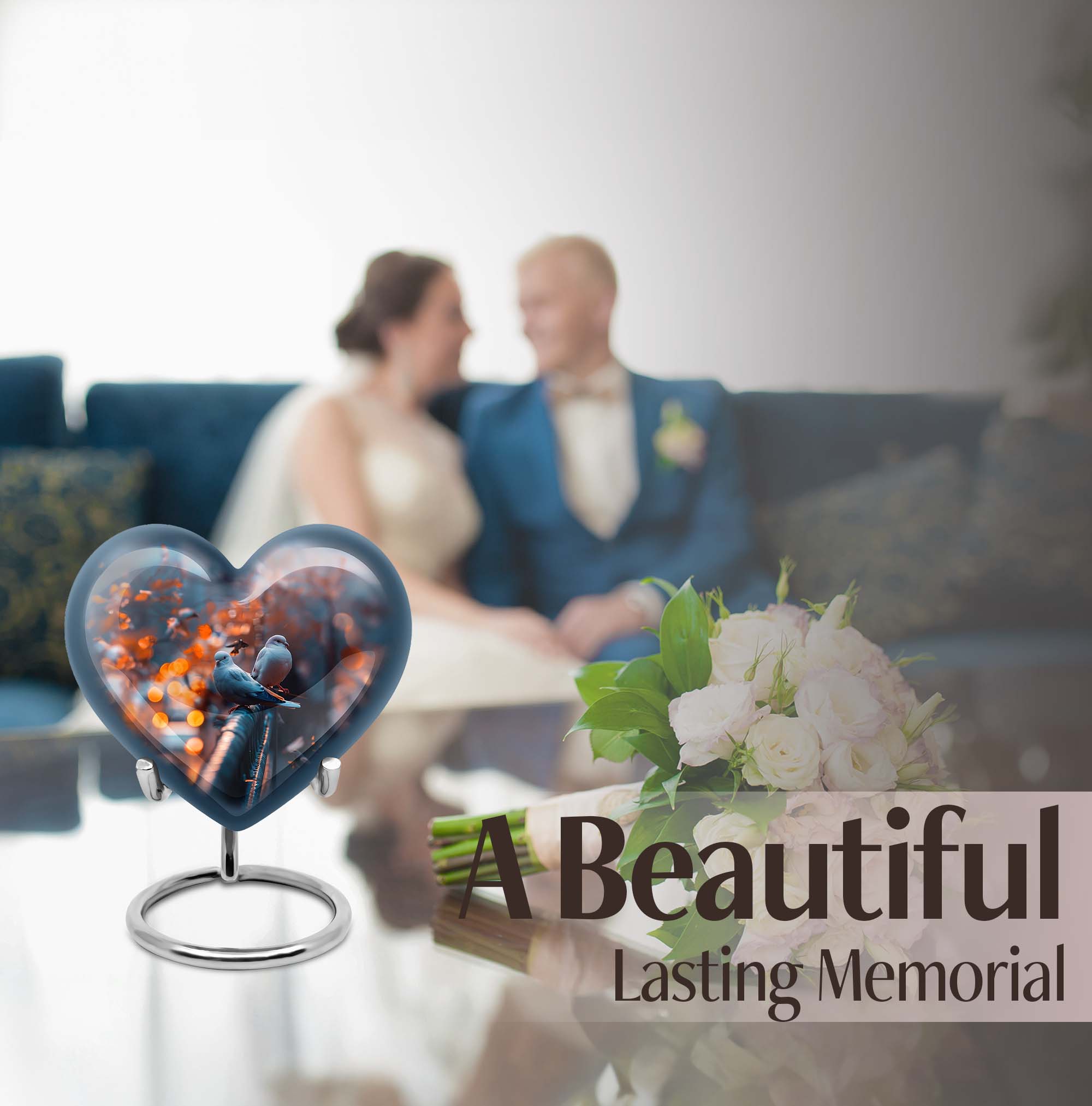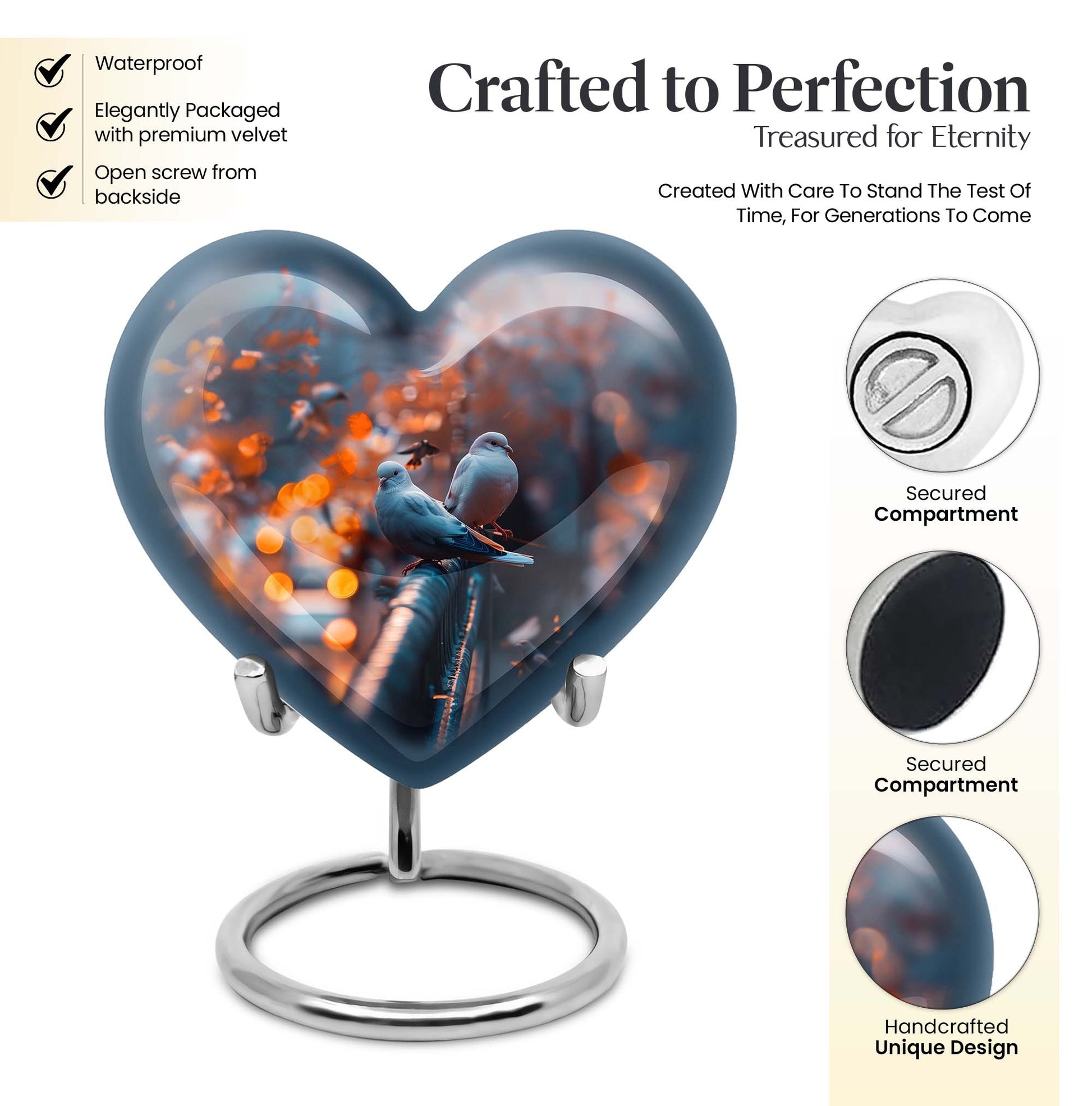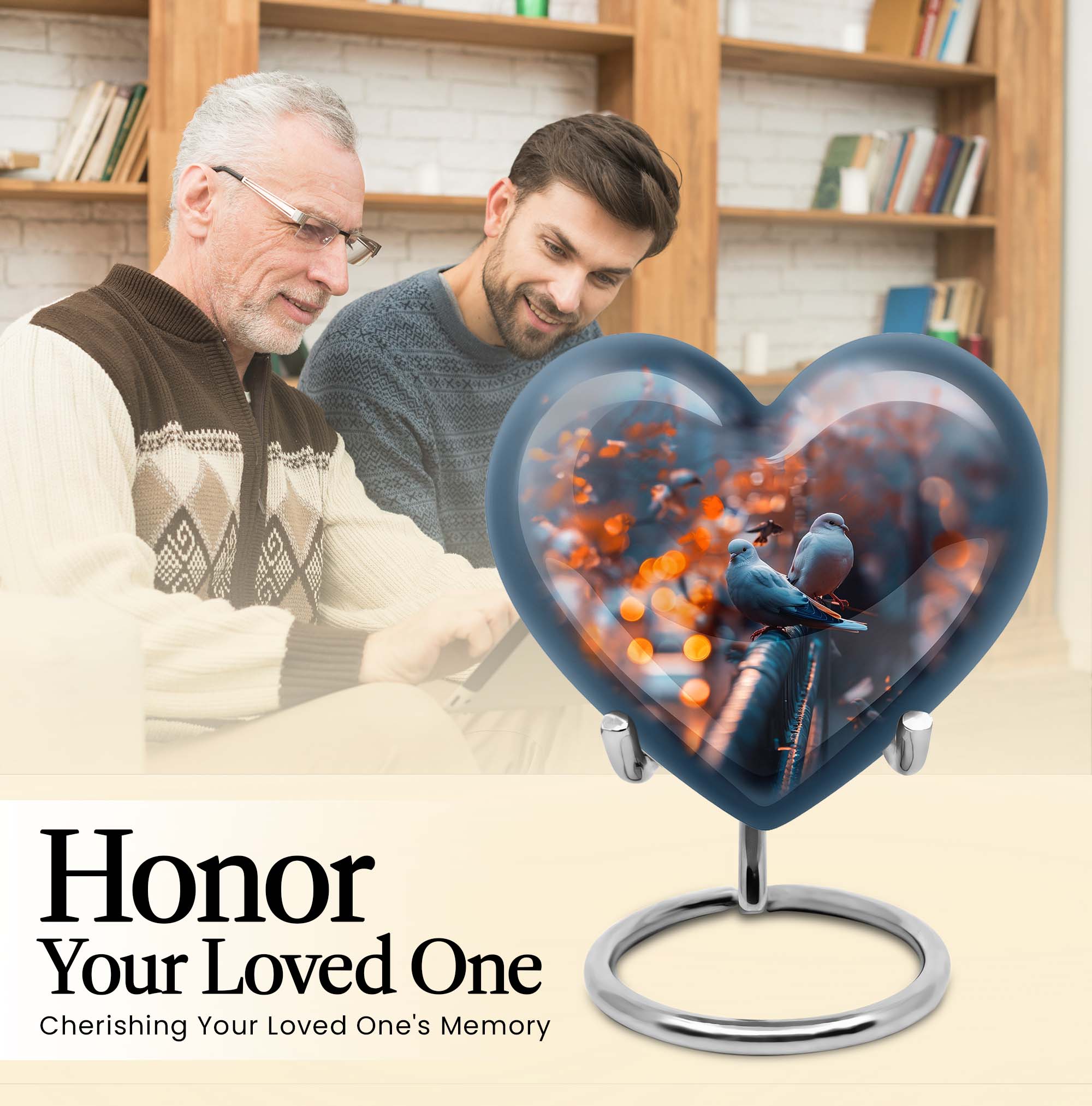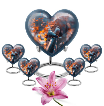 Honour your departed loved ones with our large dove urn, a meaningful and significant addition to your memorial ceremony supplies. Crafted from high-quality aluminium, this 10-inch urn embodies longevity and resilience, exemplifying the enduring nature of love. The urn has a capacity of 200 cubic inches, making it suitable for human cremation ashes. Weighing in at 3.3 pounds, it showcases a flower theme resonating with the serenity and peace associated with serene final resting places. The urn comes with a velvet pouch, ensuring safe containment and offering another layer of respect towards cherished memories. Customization is available, you can personalize this funeral urn with engraved names, adding a unique touch to this remembrance piece. This product resonates with keywords such as 'memorial forever urns' and is relevant for searches related to 'human cremation urn' and 'urns metal'. With its heart design and substantial size, it also might appeal to people looking for 'large urns'.