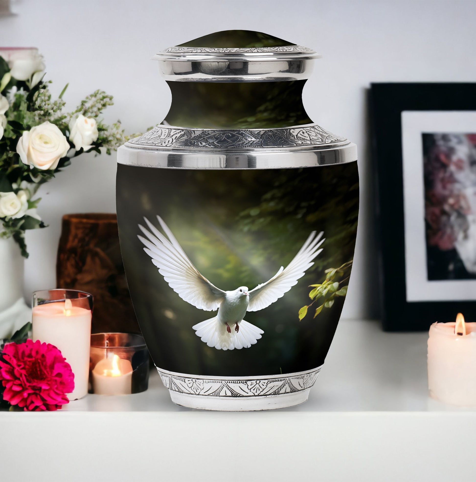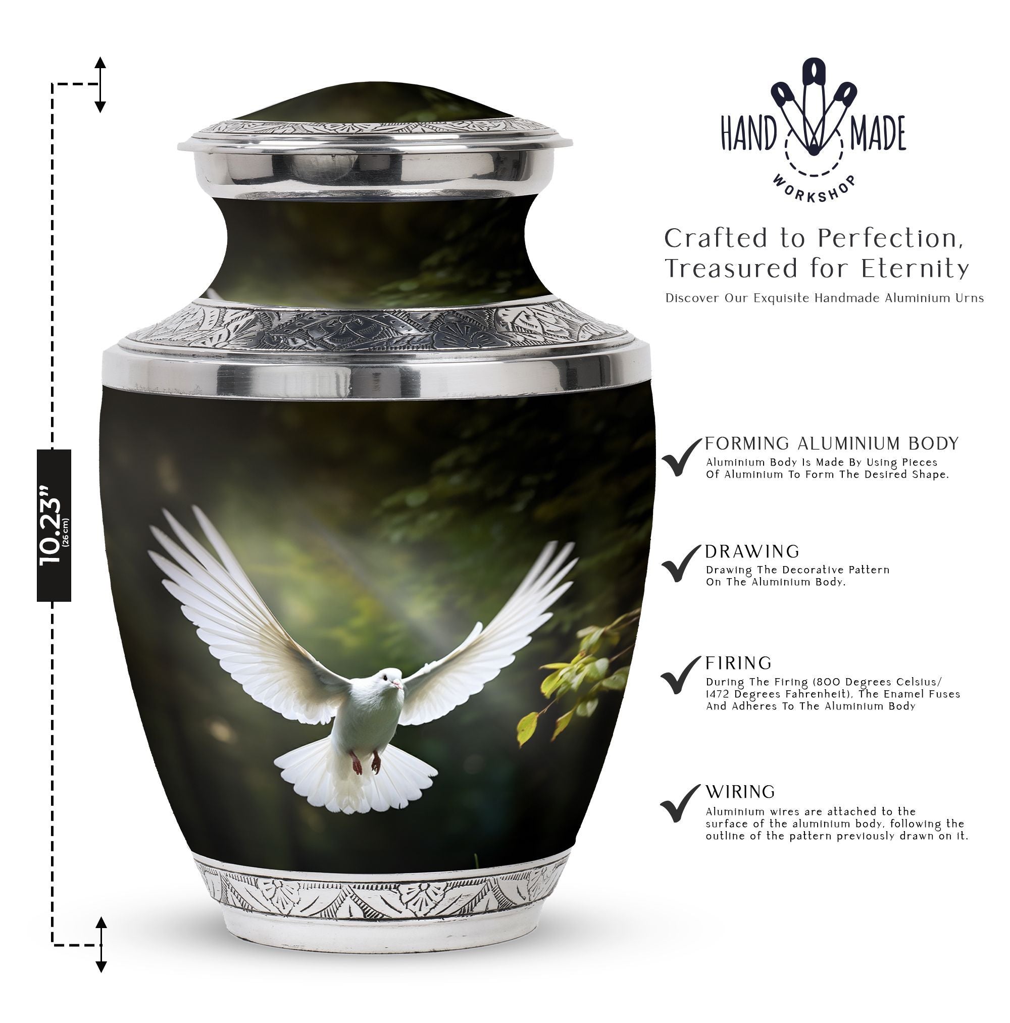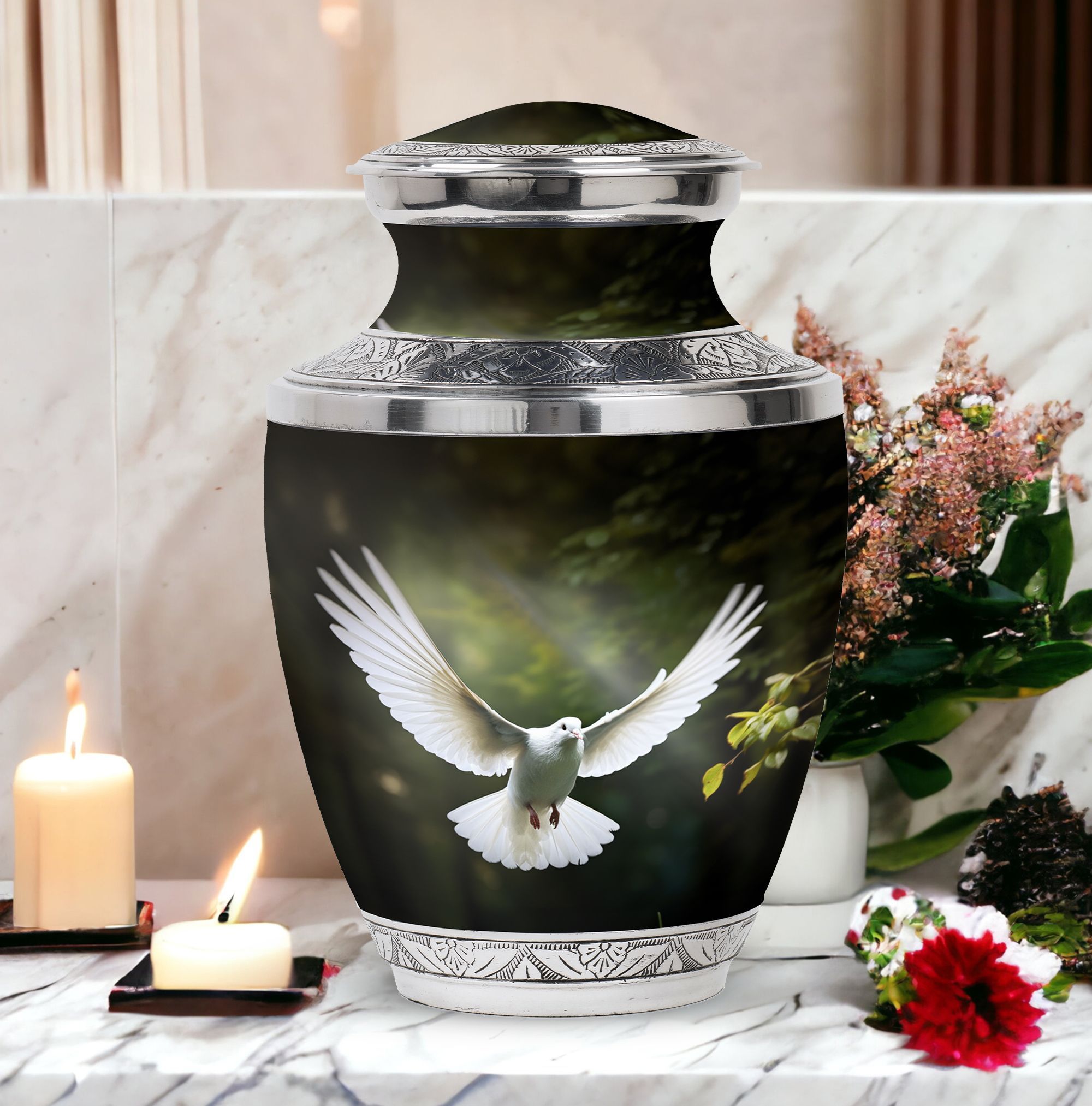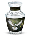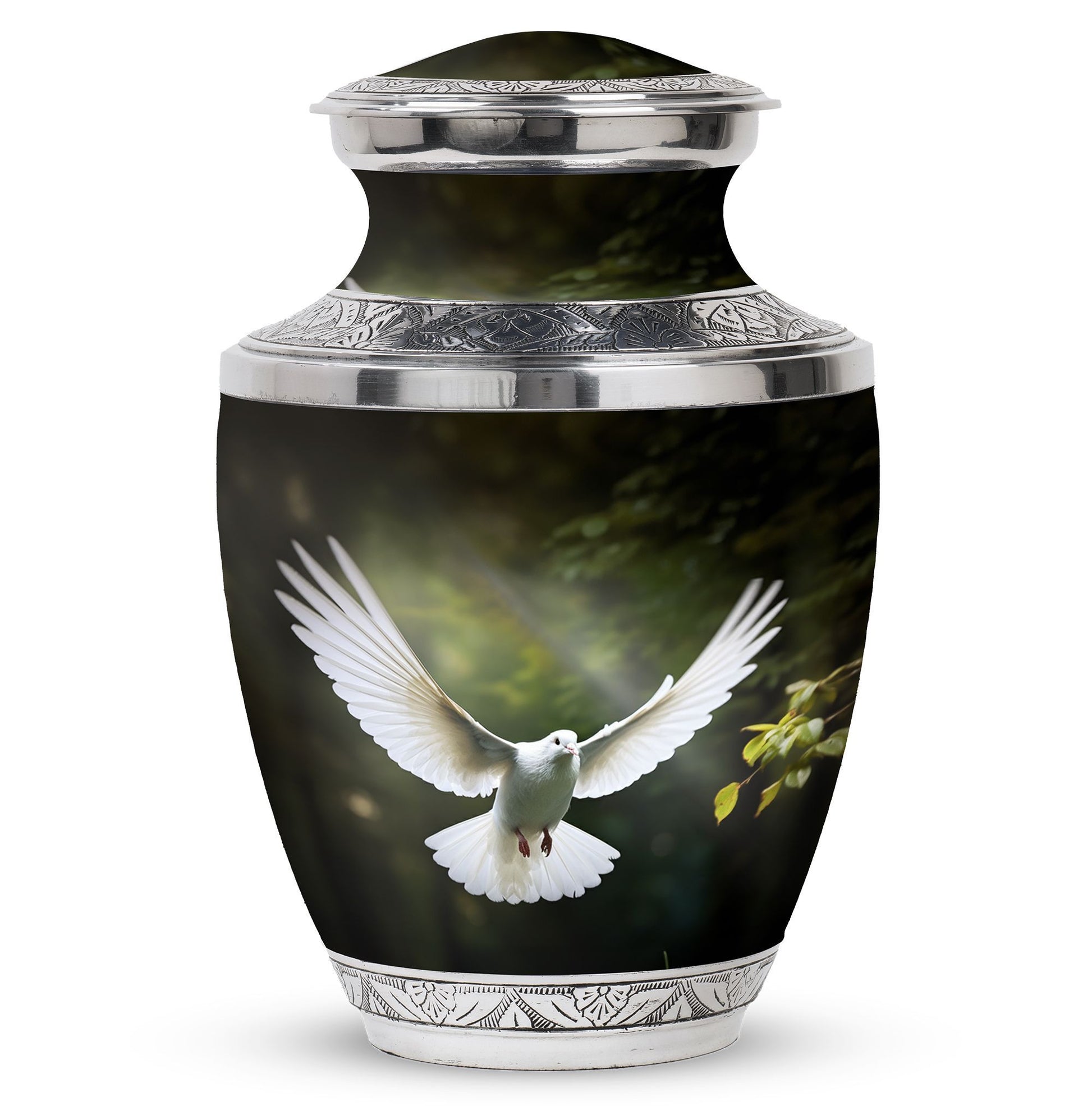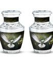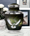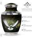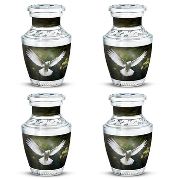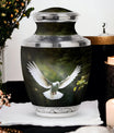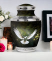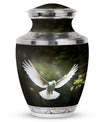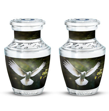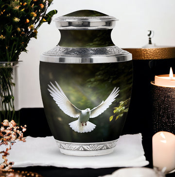 Reverence towards the departed loved ones is expressed eloquently in our 3-inch Dove Urn - an embodiment of profound dignity. Our memorial urns, meticulously crafted from high-quality Aluminium, promise longevity and serve as an eternal keepsake. It possesses an exquisitely Classic Urn design, a visual metaphor for the respecting the cycle of life and vigilant stewardship of memories. Dimensioned at 10 inches in height, it comfortably holds upto 200 cubic inches of your loved one’s ashes. The urn, which weighs a substantial 3.3 pounds, is designed to accommodate larger volume requirements. We also offer customization options to personalize the urn with engraved names, enhancing the sentiment and individuality. The Dove Urn comes with a complementary velvet pouch - an elegant solution for containment of ashes.
