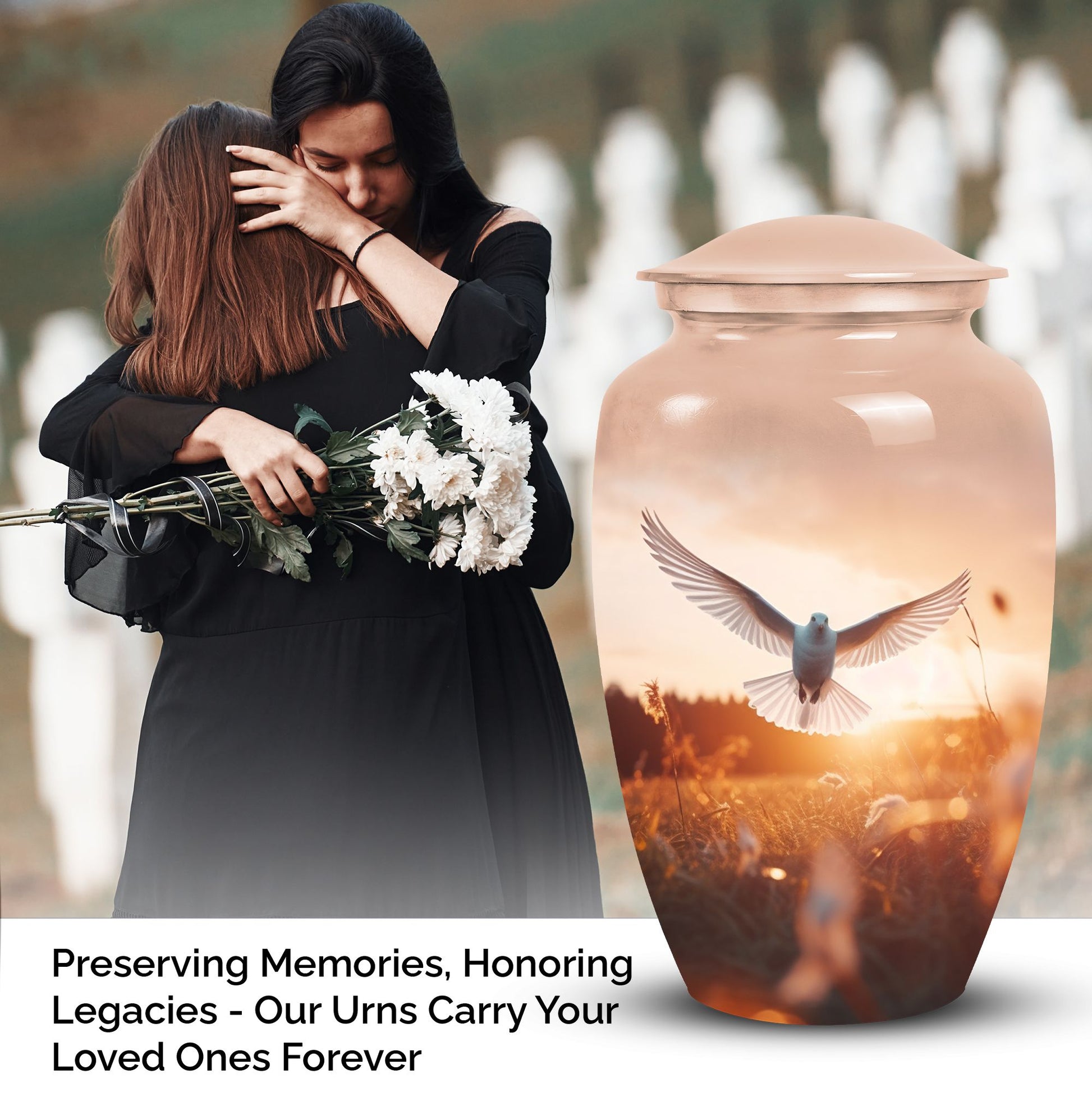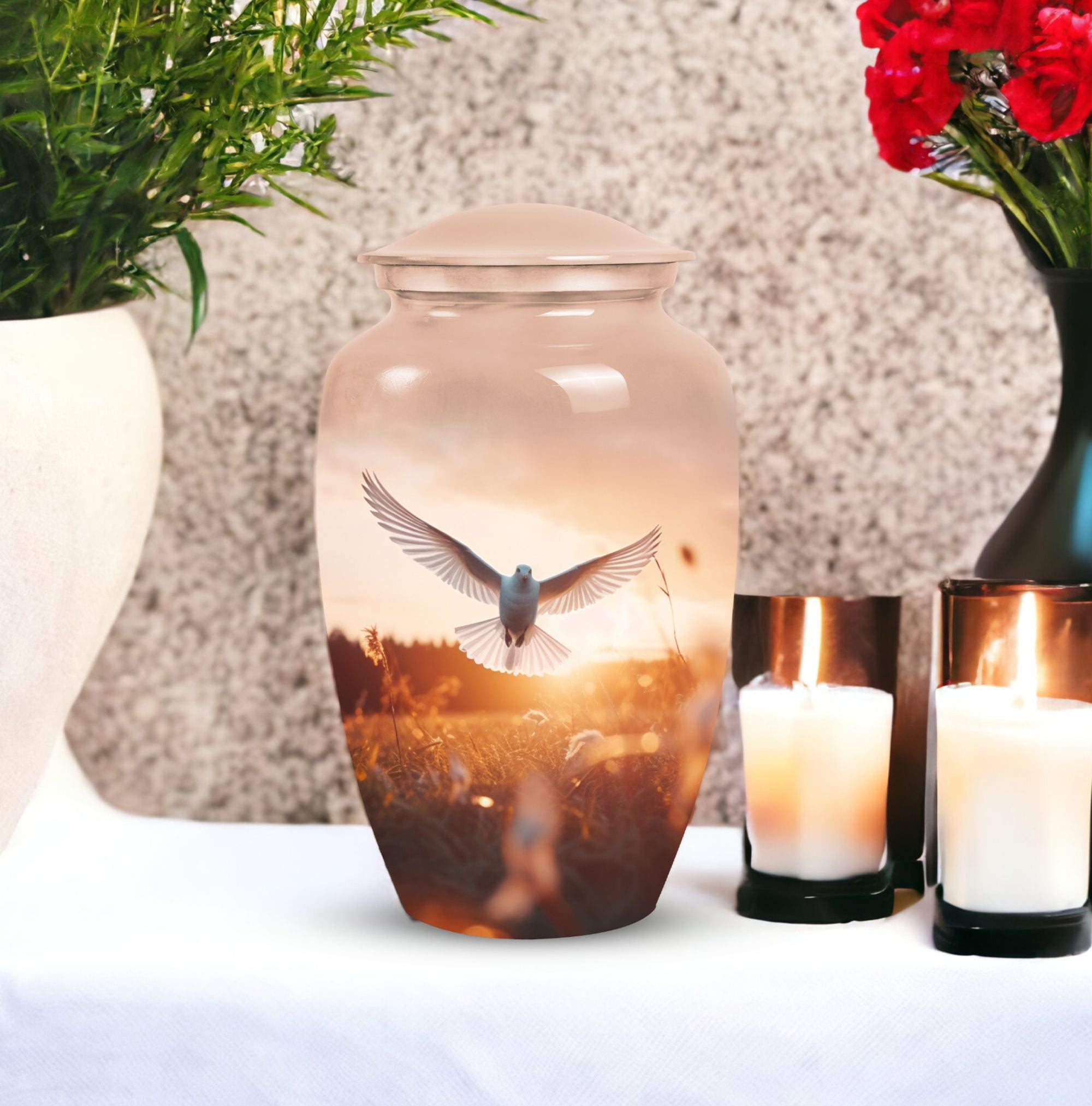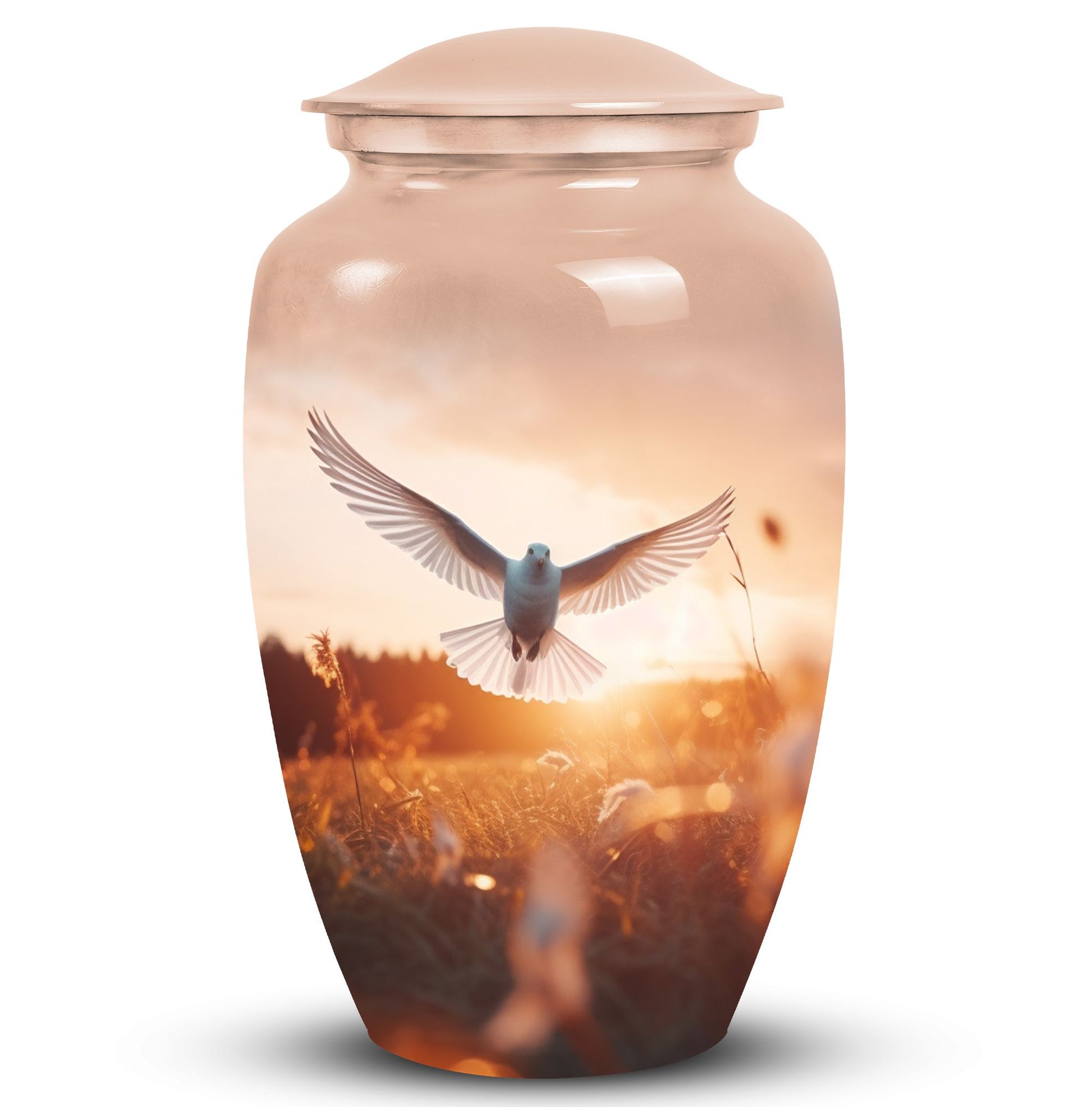 Discover the serene beauty and elegance of our Dove Urns For Human Ashes. Designed to carry the full importance of their sacred role, these urns encompass a sense of tranquility and serenity, while assuring you of their substantial capacity to securely contain the ashes of adult human beings. Complementing the dignity and sacredness of their purpose, our urns are as visually captivating as they are functional. Precisely designed cremation containers offer an intimate yet respectful final abode for your treasured memories. Emerging as a unique choice from the usual cremation companion urns, the Dove Urns set apart by their crafting finesse. For those seeking resplendent burial urns that embody grace and dignity, these urns stand as an undeniably solid choice. Be comforted with the knowledge that the Dove Urns cradle your loved one's remains with enduring respect and honor. Give them an everlasting peaceful sanctuary designed specially for adult humans - a final resting place as unforgettable as the life they celebrated.
