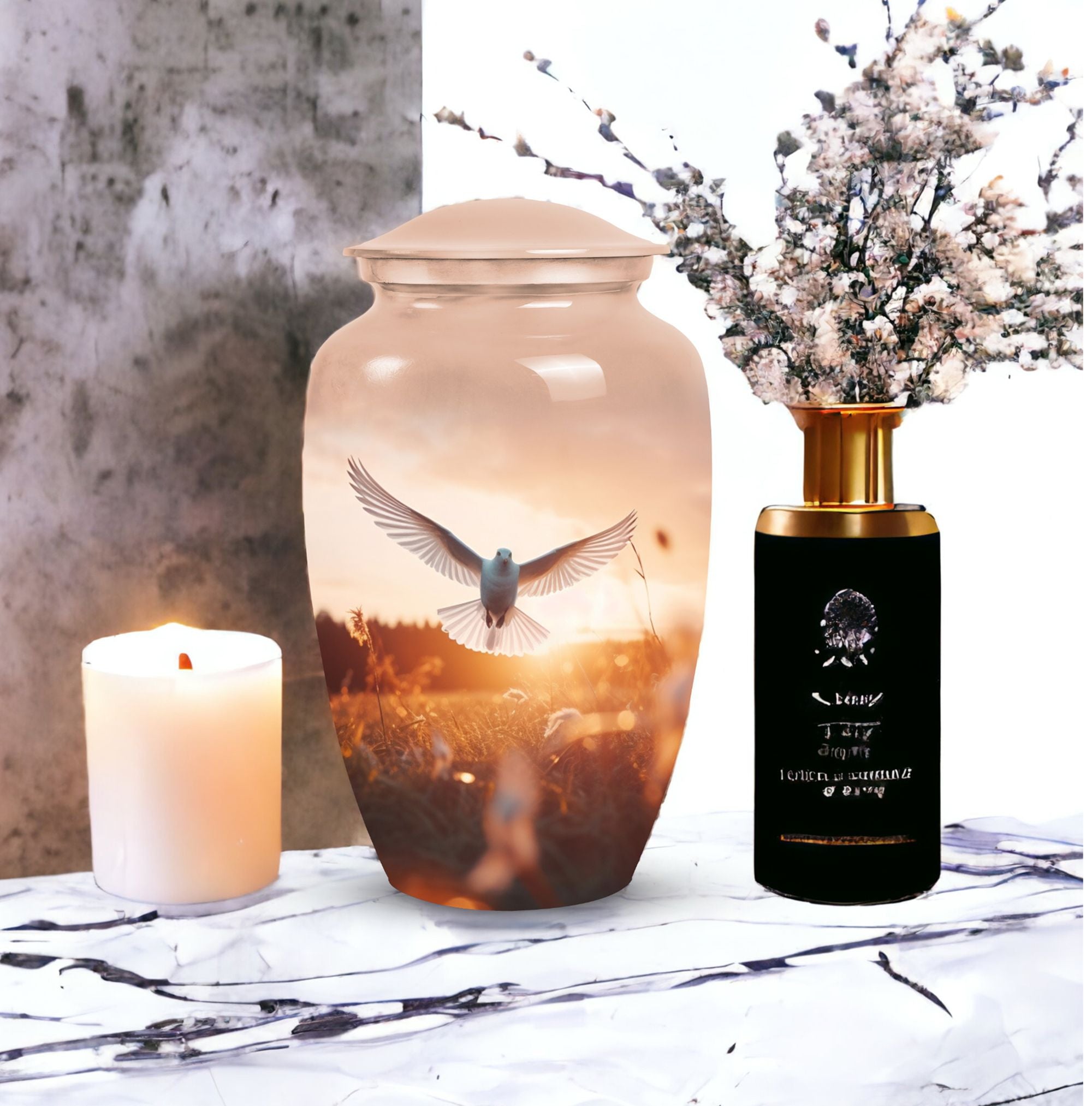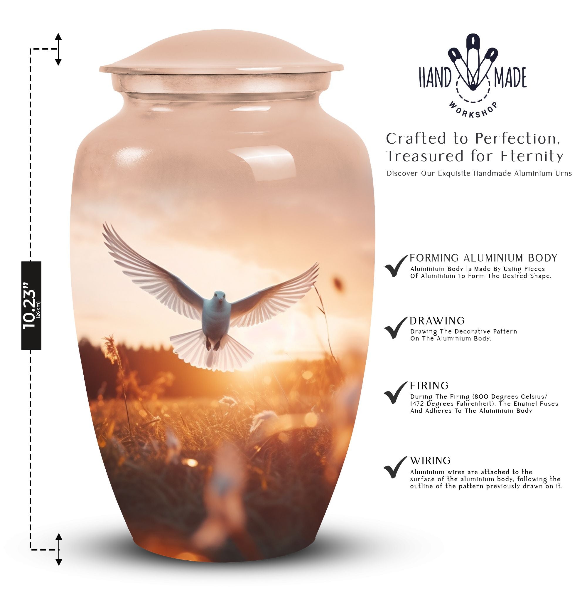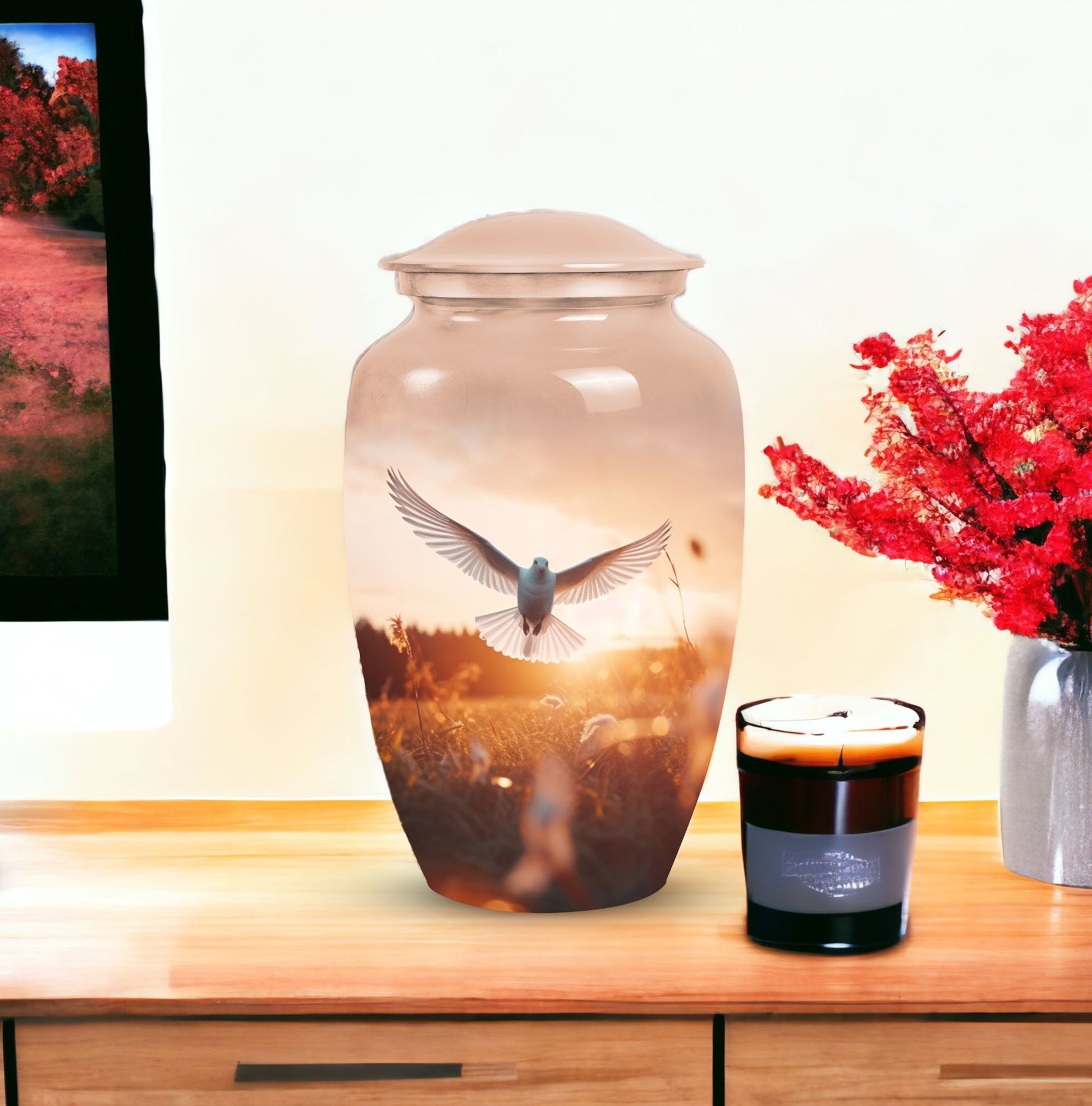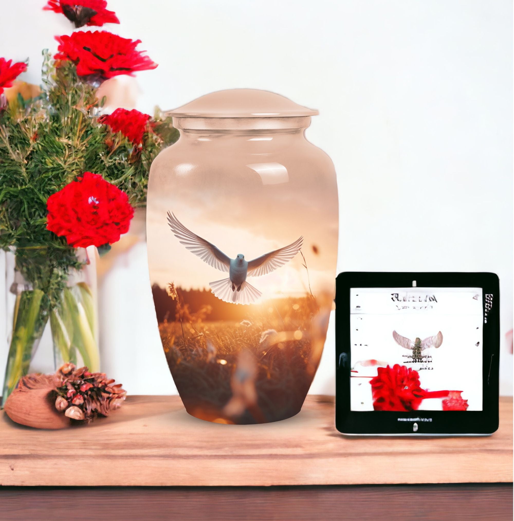 Discover the serene beauty and elegance of our Dove Urns For Human Ashes. Designed to carry the full importance of their sacred role, these urns encompass a sense of tranquility and serenity, while assuring you of their substantial capacity to securely contain the ashes of adult human beings. Complementing the dignity and sacredness of their purpose, our urns are as visually captivating as they are functional. Precisely designed cremation containers offer an intimate yet respectful final abode for your treasured memories. Emerging as a unique choice from the usual cremation companion urns, the Dove Urns set apart by their crafting finesse. For those seeking resplendent burial urns that embody grace and dignity, these urns stand as an undeniably solid choice. Be comforted with the knowledge that the Dove Urns cradle your loved one's remains with enduring respect and honor. Give them an everlasting peaceful sanctuary designed specially for adult humans - a final resting place as unforgettable as the life they celebrated.