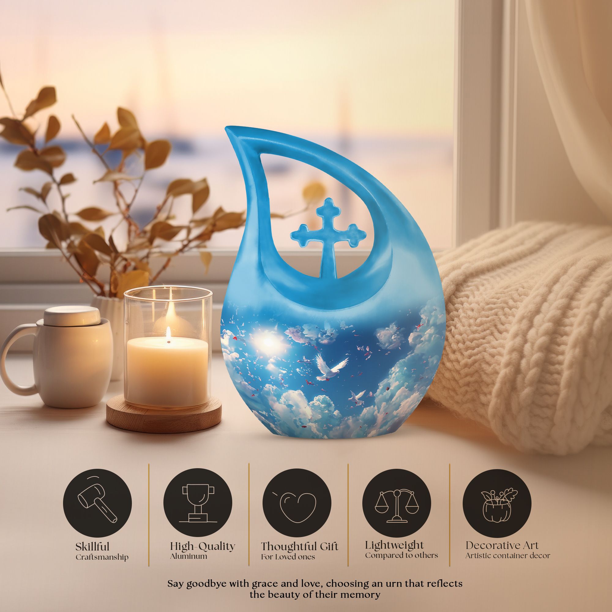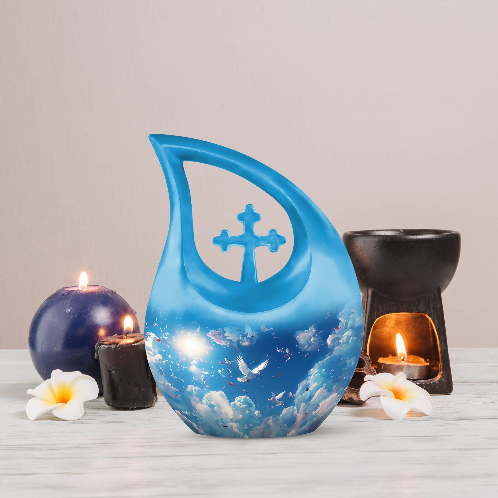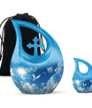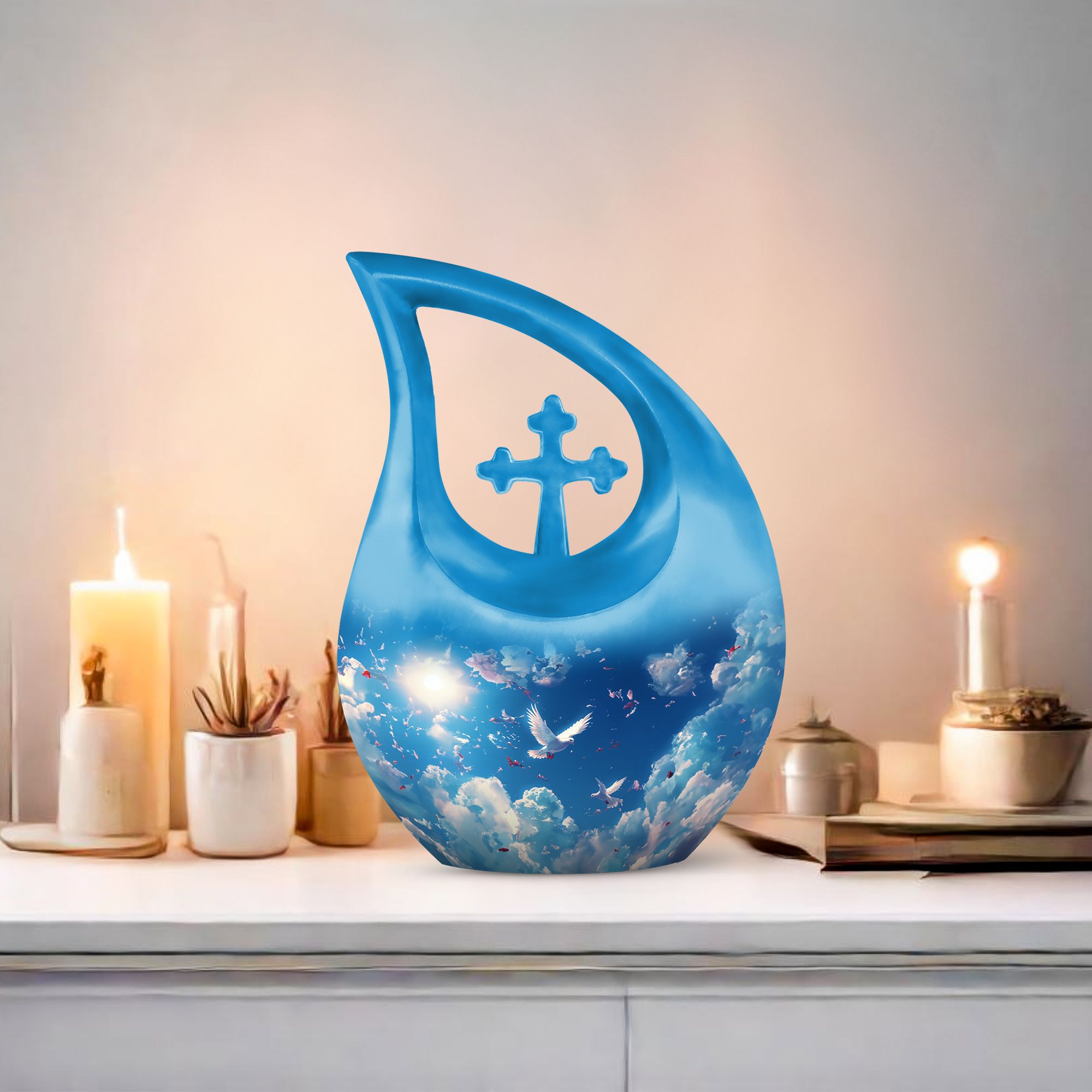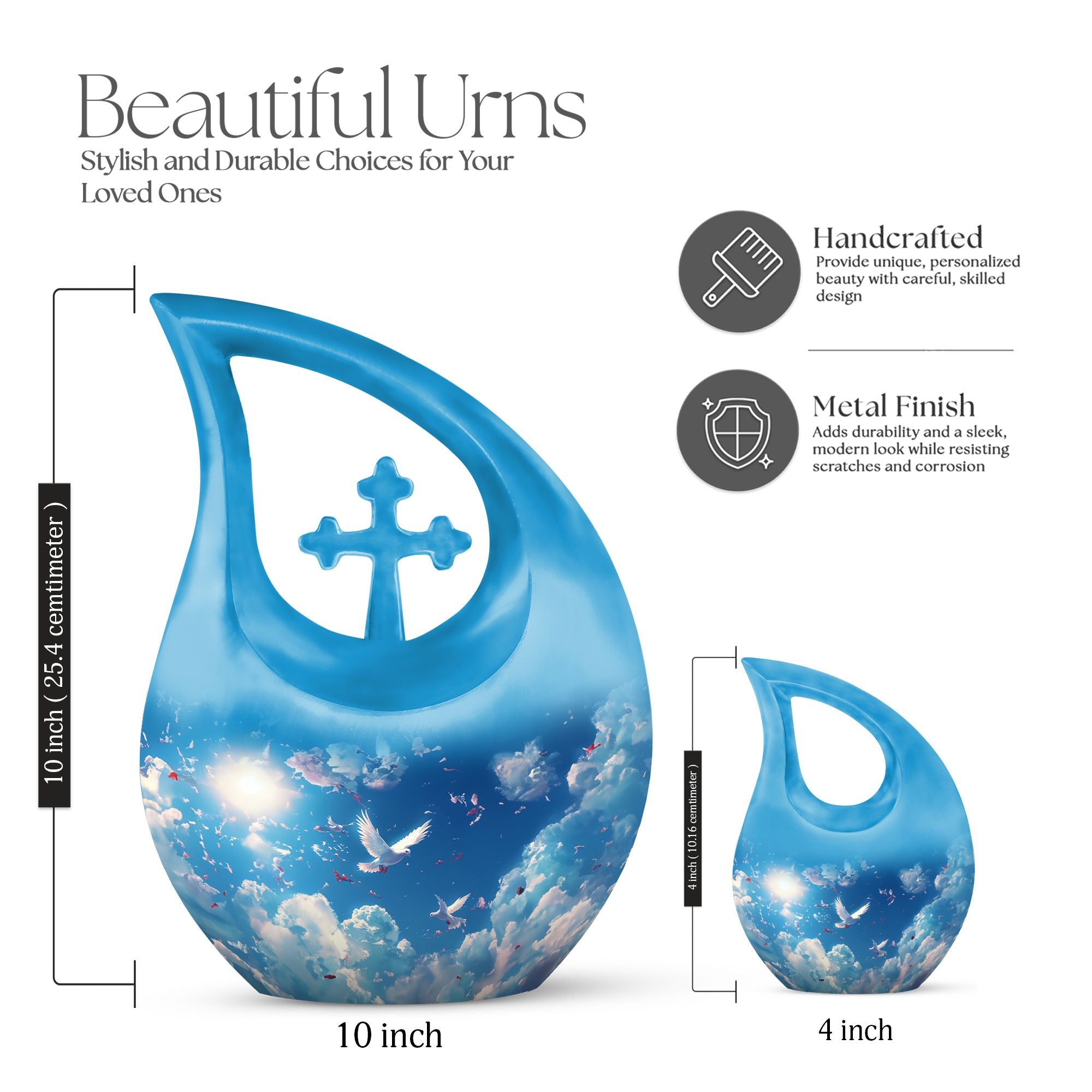 Honor your loved one's memory with our compelling Dove Urn. Forged from robust aluminium, this large urn features an intricate cross drop pattern that proudly symbolizes your precious connection. With an impressive 10-inch height and weighing 3.3 pounds, this urn can safely hold up to 200 cubic inches of ashes, offering a fitting funeral option for your much-missed relative. We believe in personal tributes, which is why we offer the option to customize this urn further by engraving names. To ensure respectful containment, each urn comes with a plush velvet pouch. Elevate your memorial ceremonial supplies with this exquisite funeral urn for ashes. Emphasizing a dove theme, our product serves as a beautiful, decorative touch to your home or mausoleum. This item is more than just an urn for mom or any loved one; it's a tangible token of your love and remembrance.