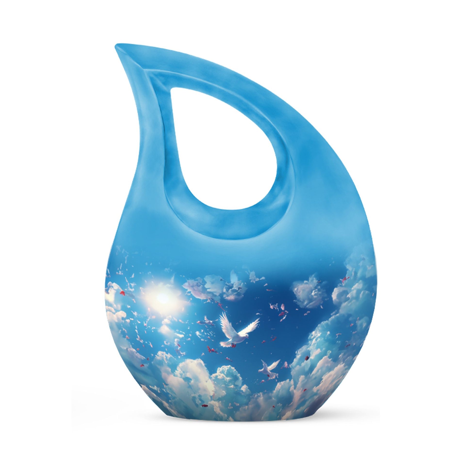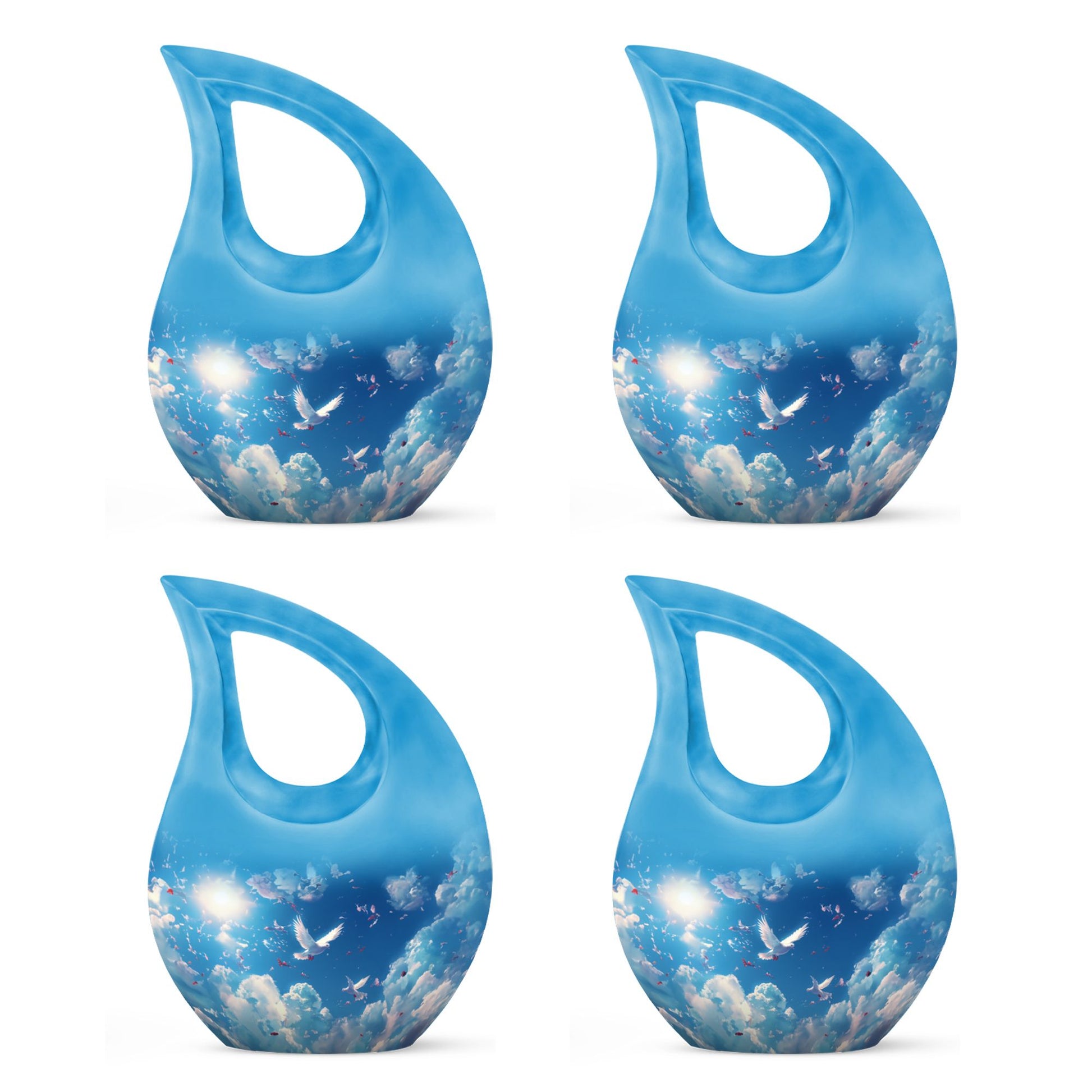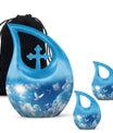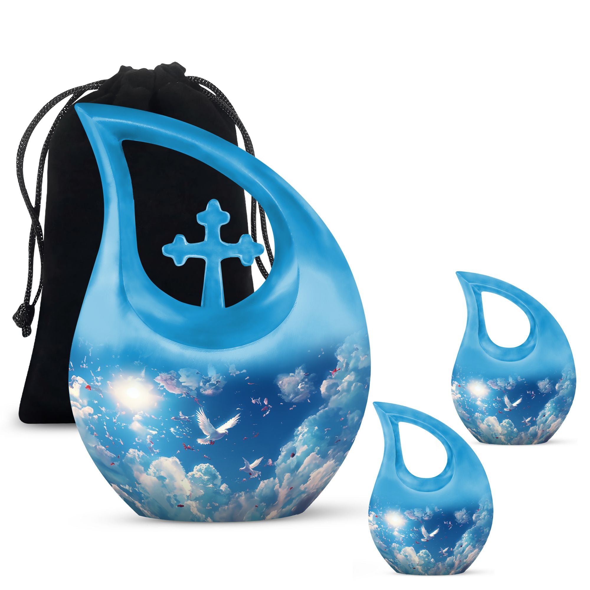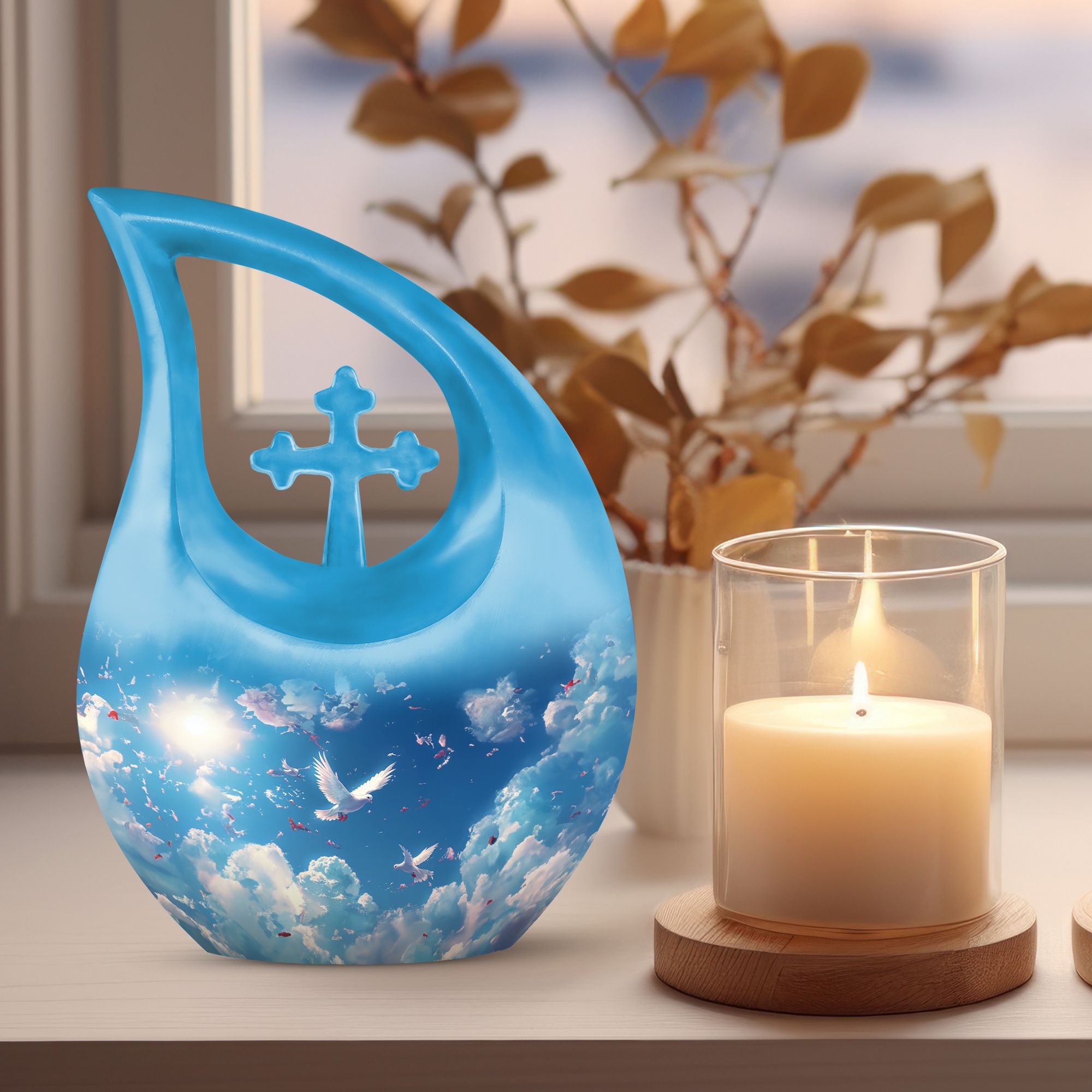 Honor your loved one's memory with our compelling Dove Urn. Forged from robust aluminium, this large urn features an intricate cross drop pattern that proudly symbolizes your precious connection. With an impressive 10-inch height and weighing 3.3 pounds, this urn can safely hold up to 200 cubic inches of ashes, offering a fitting funeral option for your much-missed relative. We believe in personal tributes, which is why we offer the option to customize this urn further by engraving names. To ensure respectful containment, each urn comes with a plush velvet pouch. Elevate your memorial ceremonial supplies with this exquisite funeral urn for ashes. Emphasizing a dove theme, our product serves as a beautiful, decorative touch to your home or mausoleum. This item is more than just an urn for mom or any loved one; it's a tangible token of your love and remembrance.