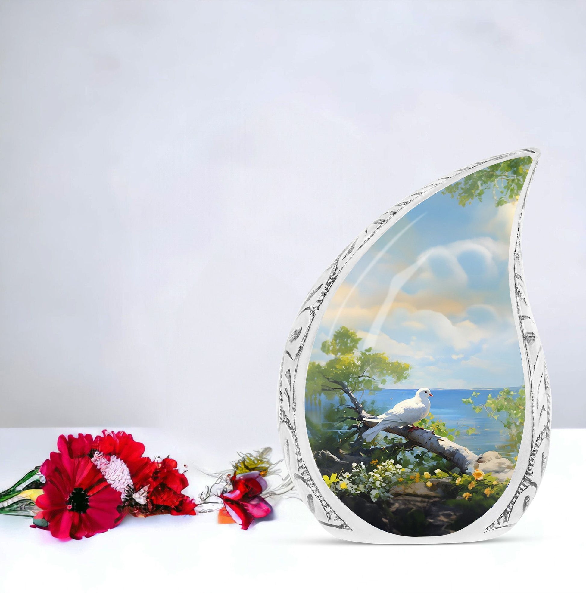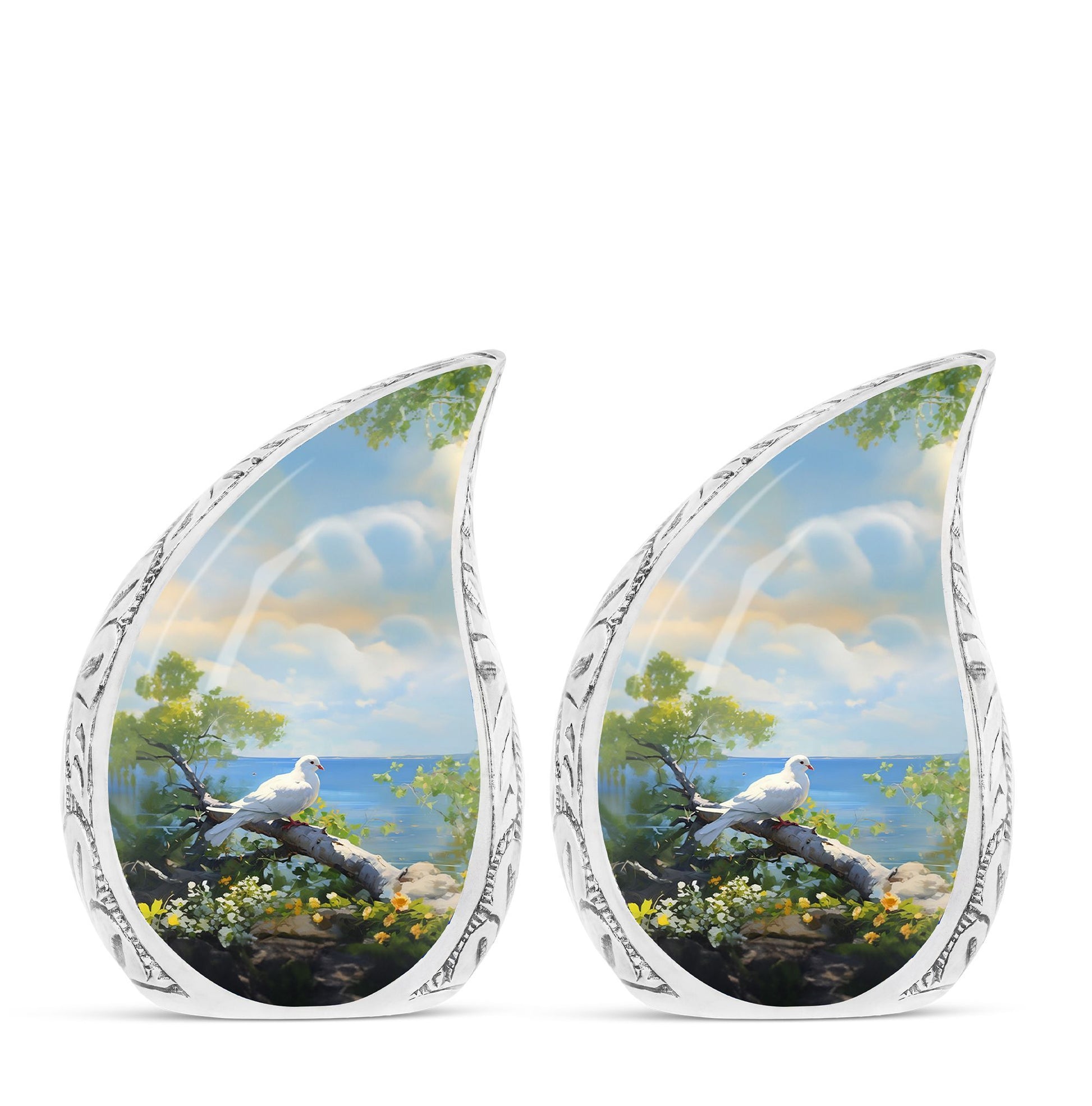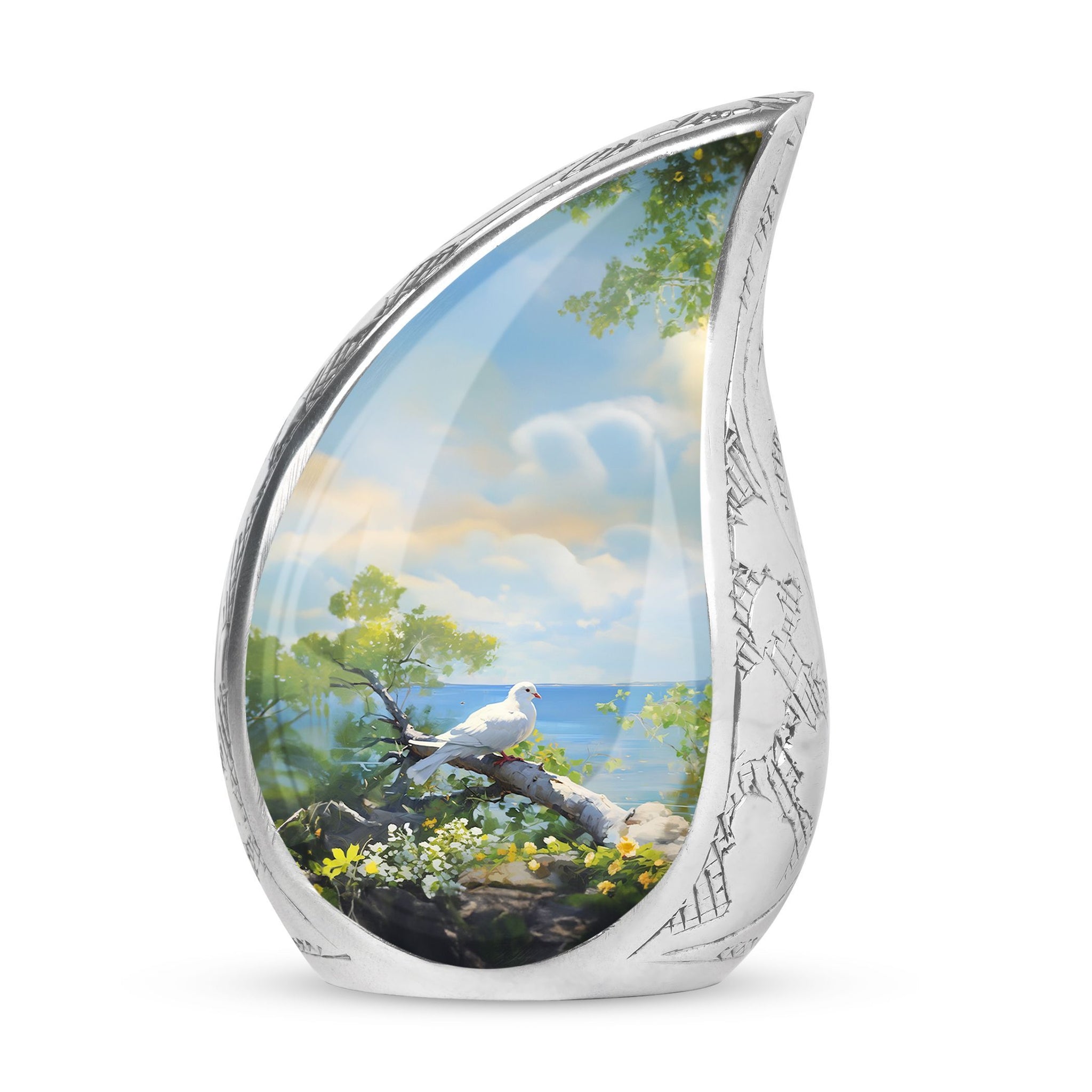 Find solace and comfort with our Dove Memorial Urn, a unique tribute to honor your loved ones. Crafted from high-quality aluminium, this large urn weighs 3.3 pounds and boasts finesse. Its classical urn style will blend seamlessly with any decor, offering a timeless look. Measuring 10 inches in height and able to hold up to 200 cubic inches, it is handsomely sized to house the ashes of adults. Each purchase includes a velvet pouch for dignified containment of ashes, maintaining respect and reverence at all times. What sets this urn apart is the ability to customize it. Engrave names onto it, making the urn not just a receptacle, but a lovingly personalized monument of remembrance. This product beautifully fits within keywords such as Personalized Urns for Human Ashes, Metal Cremation Urns, and Cremation Urns for Human Ashes. These terms not just align with its physical attributes, but embody its emotional value too. This Dove Memorial Urn is not just a product, but a holder of memories, a bearer of love, and a symbol of respect.