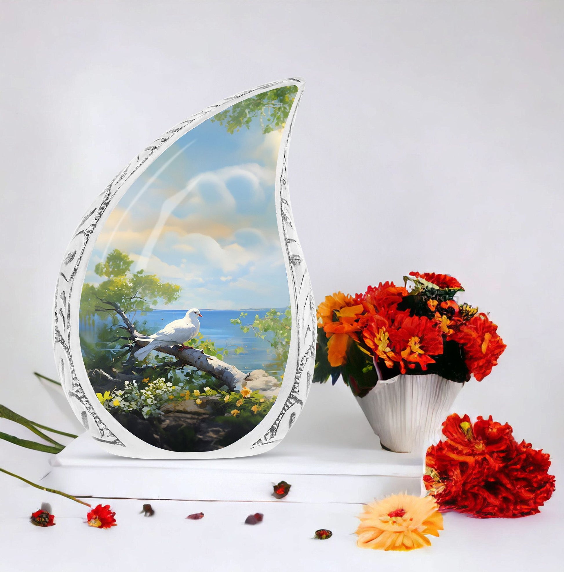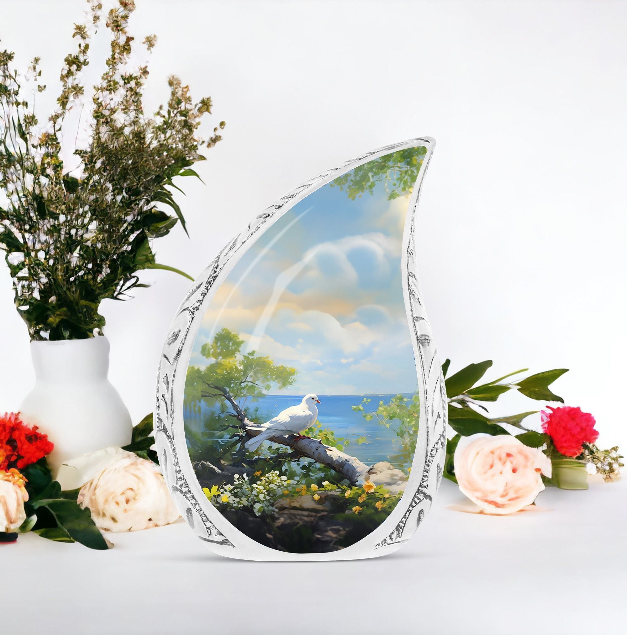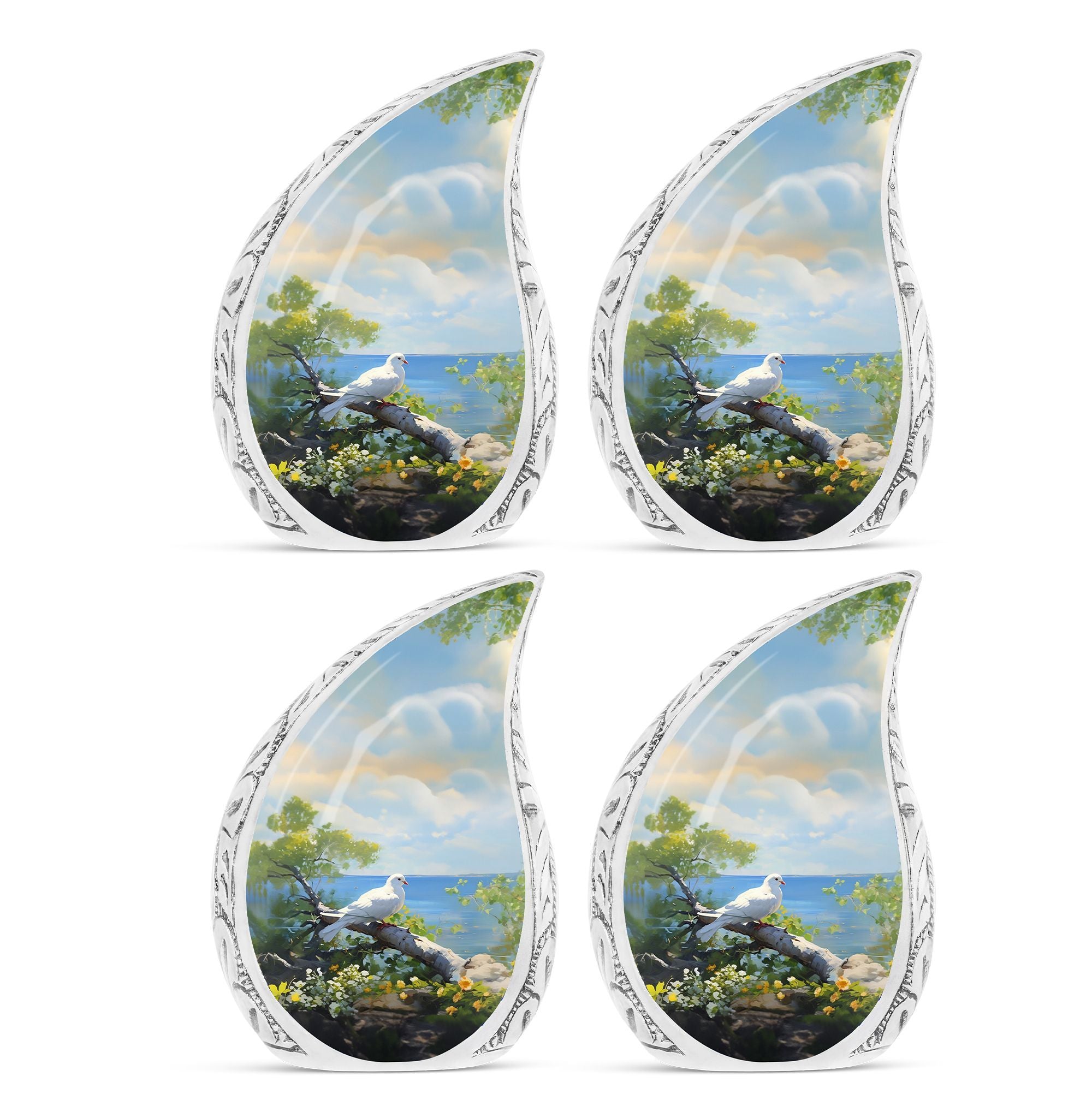 Find solace and comfort with our Dove Memorial Urn, a unique tribute to honor your loved ones. Crafted from high-quality aluminium, this large urn weighs 3.3 pounds and boasts finesse. Its classical urn style will blend seamlessly with any decor, offering a timeless look. Measuring 10 inches in height and able to hold up to 200 cubic inches, it is handsomely sized to house the ashes of adults. Each purchase includes a velvet pouch for dignified containment of ashes, maintaining respect and reverence at all times. What sets this urn apart is the ability to customize it. Engrave names onto it, making the urn not just a receptacle, but a lovingly personalized monument of remembrance. This product beautifully fits within keywords such as Personalized Urns for Human Ashes, Metal Cremation Urns, and Cremation Urns for Human Ashes. These terms not just align with its physical attributes, but embody its emotional value too. This Dove Memorial Urn is not just a product, but a holder of memories, a bearer of love, and a symbol of respect.