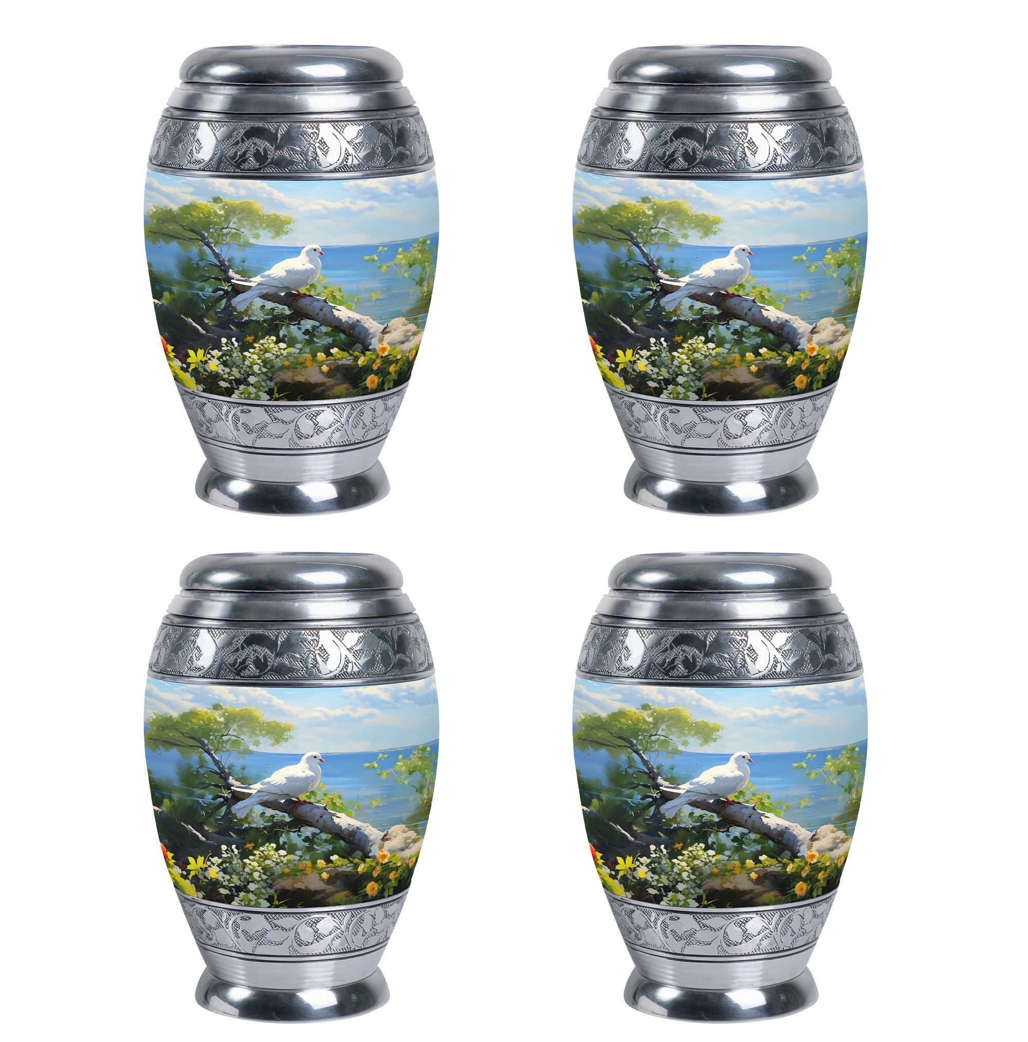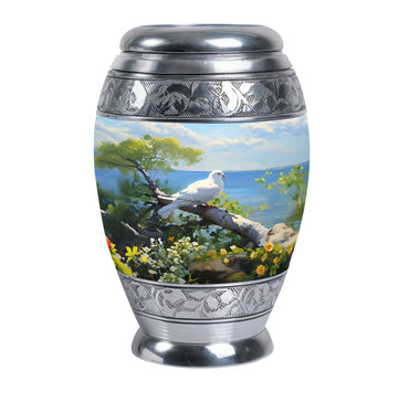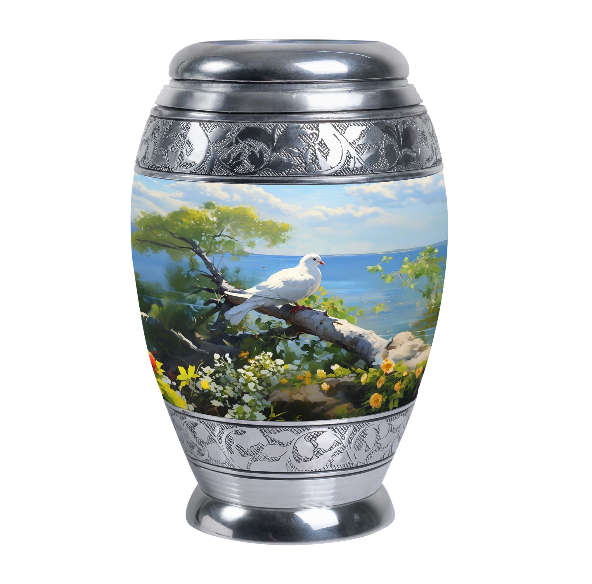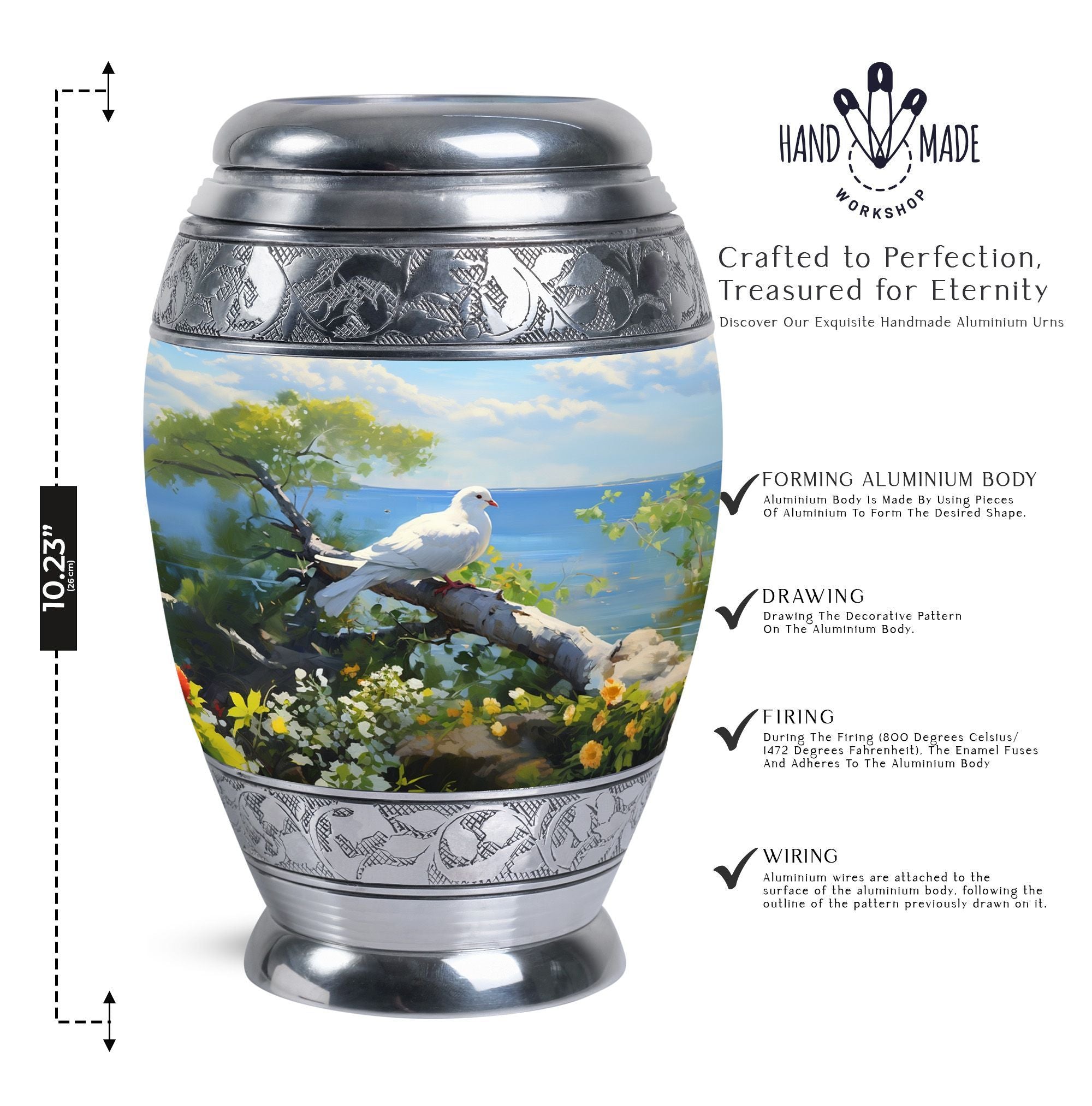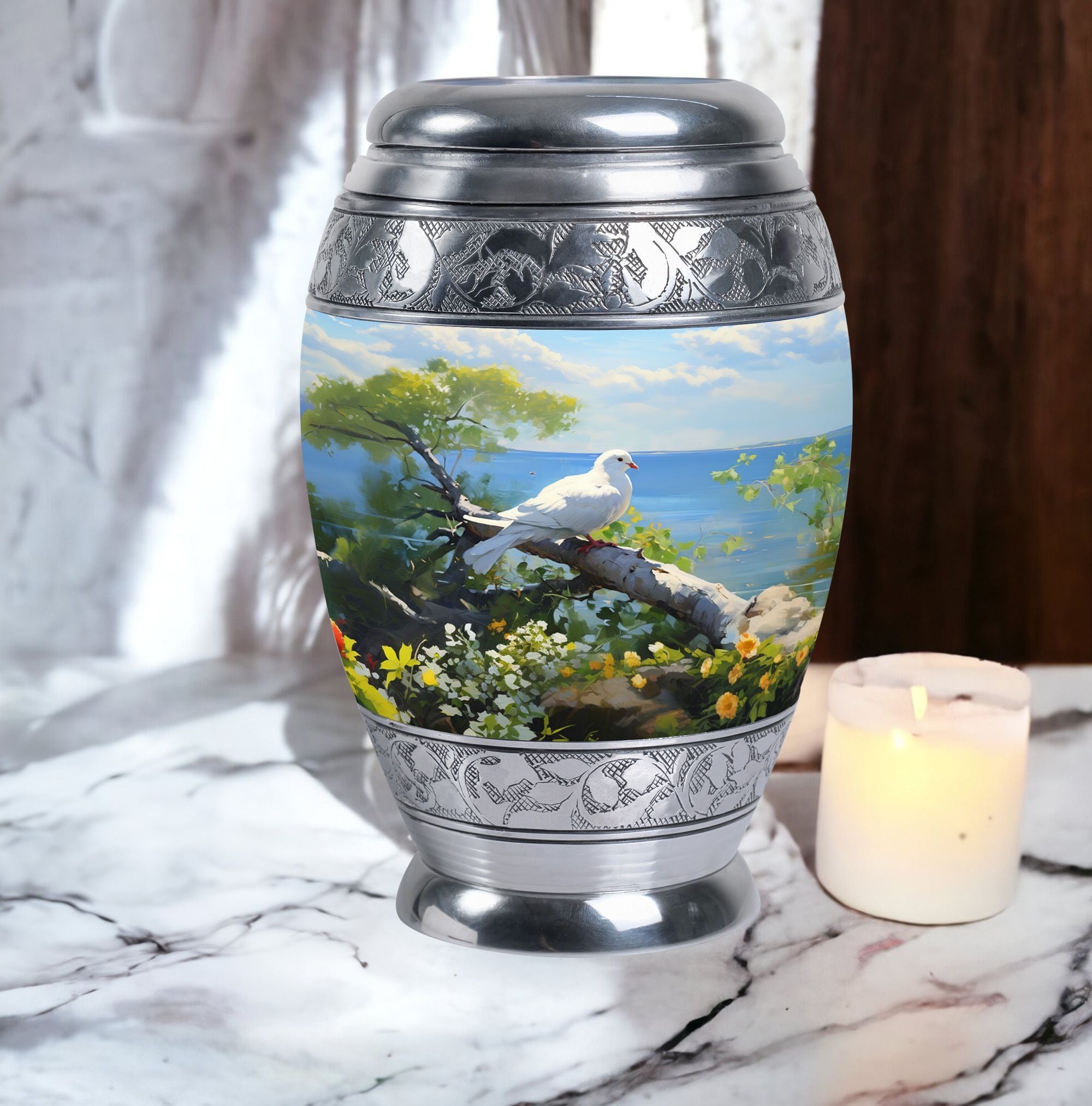 Pay tribute to your loved ones with this dignified Dove Memorial Urn. Crafted in an elegant classic design, our unique urns for human ashes are more than just a resting place for your lost one; they epitomize their lasting legacy. At a size of 3 inches, this large urn encompasses thoughtful design, fusing function with aesthetic detail. Made of high-quality aluminium, this burden-bearing memorial urn boasts durability that will endure time, keeping your dear one's memory alive. With a stature reaching 10 inches in height, the urn can accommodate up to 200 cubic inches, demonstrating its capacity in a compact size. Enveloped in a velvety pouch, the urn ensures the preserved containment of ashes. Further personalize this sacred item with engraved names, making it truly significant and unique. As an essential in our memorial ceremony supplies collection, this urn is expertly constructed with a thorough consideration for both usability and remembrance. Whether you're after personalized or metal cremation urns, this product is a suitable choice reflecting compassion and respect for the departed.