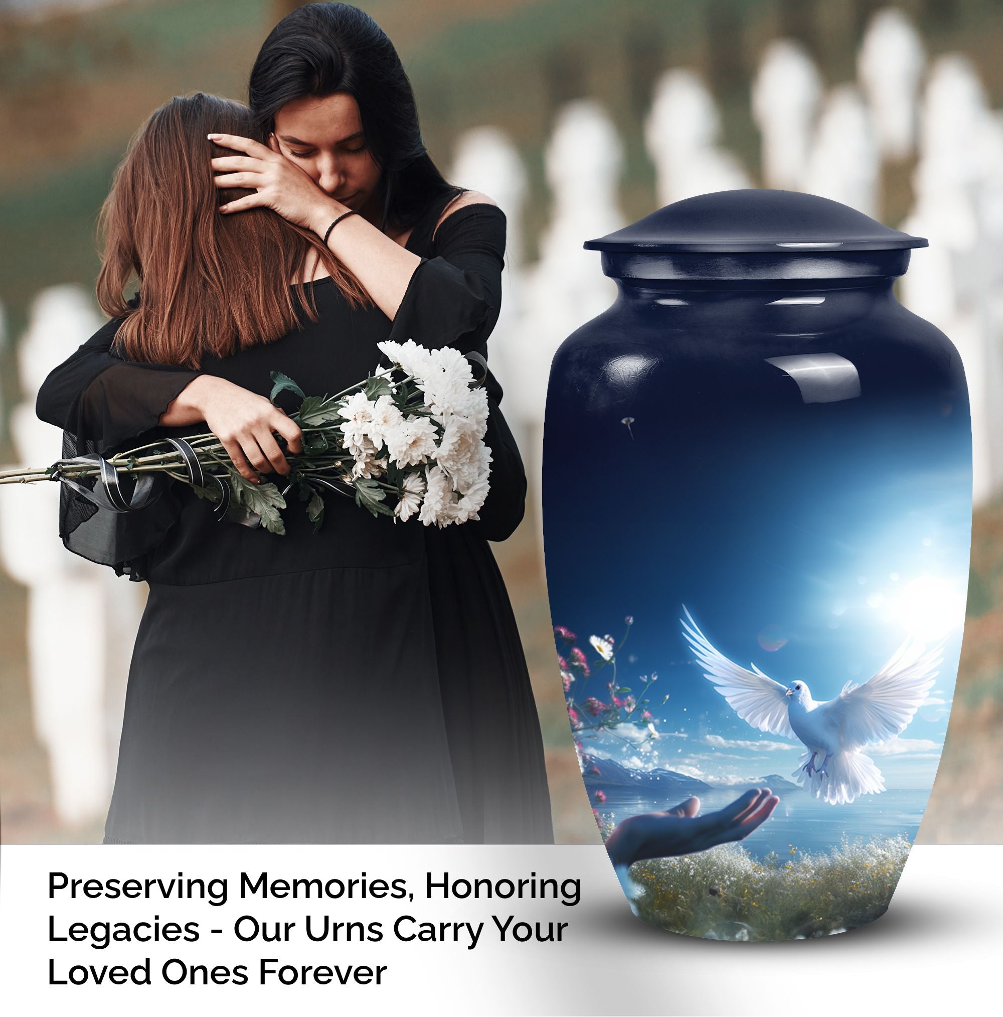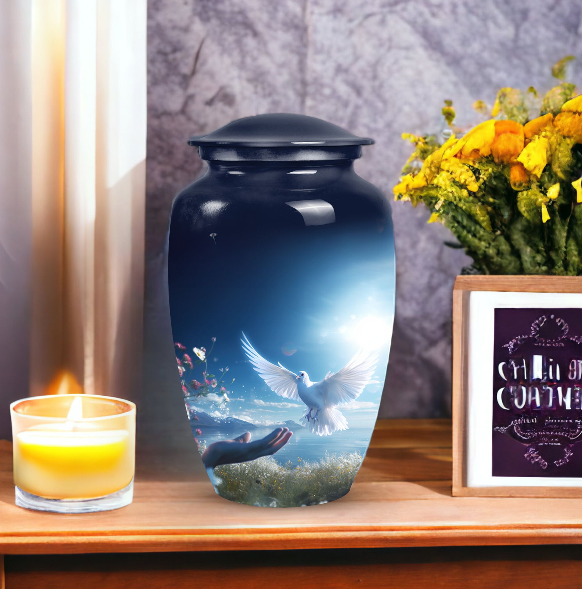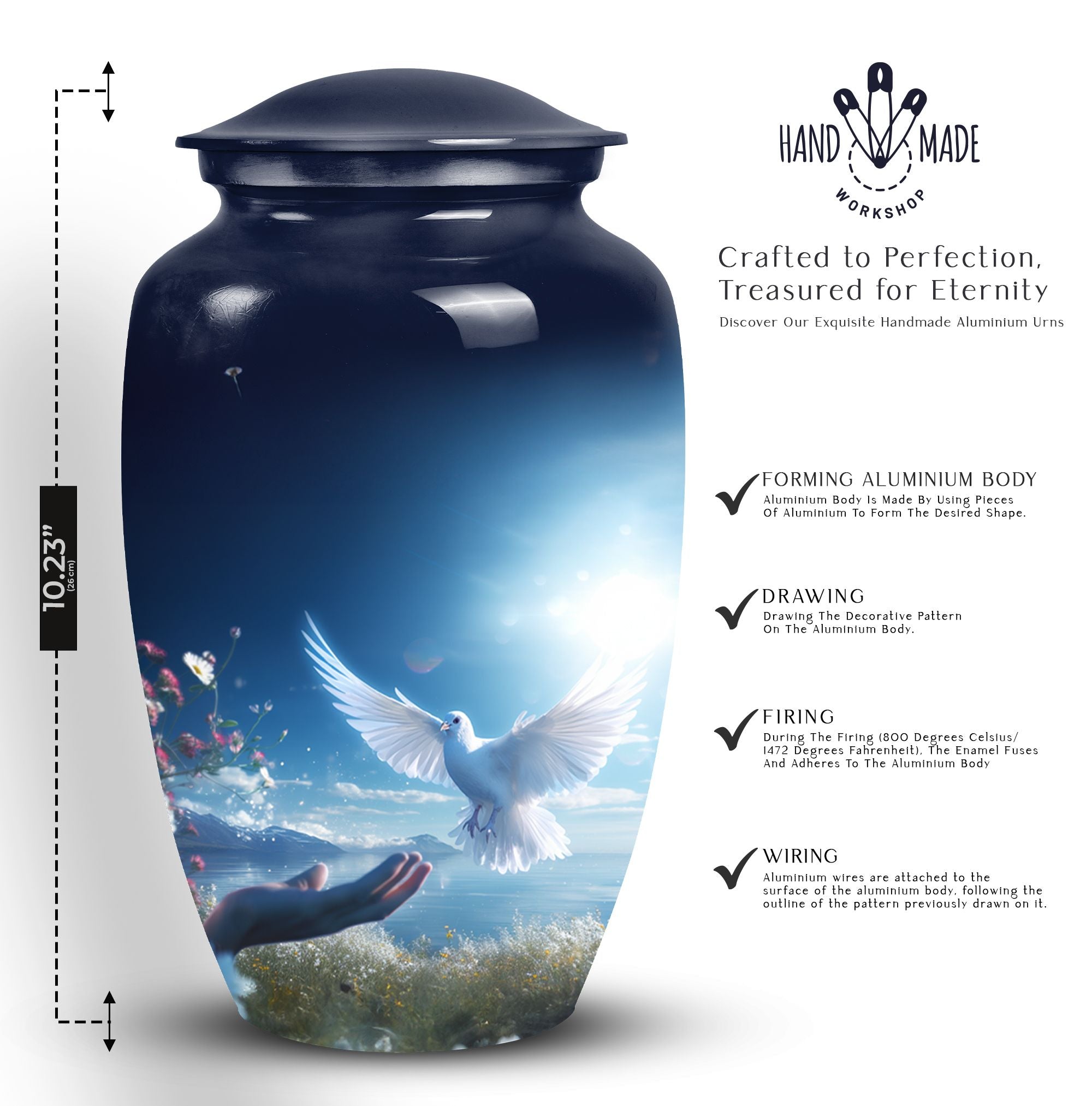 Celebrate a life lived in faith and grace with our exquisite Dove Urn. Skillfully crafted from high-quality metal, this urn manifests a timeless elegance sure to honor the cherished memories of your loved one. The Urn Ash Holder, a harmonious balance between beauty and function, aptly encapsulates the tenderness and tranquility of the dove - a symbol of peace and serenity, perfect for preserving the sanctity of human ashes. The design offers a dignified, yet heartfelt rendition to the idiom 'An Urn For Ashes', standing as a poignant token to capture years of shared love, laughter, and stories. Although meant primarily for adults, this Dove Urn easily transcends age and would be suitable for seniors as well. This incredible metal urn, aptly described as 'Urns For Human Ashes Adult,' is designed with a thoughtful attention to detail, striking the right note between sentiment and symbolism. So let your loved one's spirit soar high, nestling into the cosmos, with our beautifully designed Dove Urn.