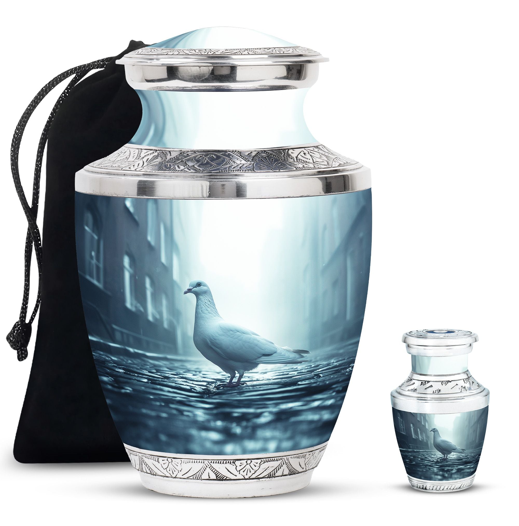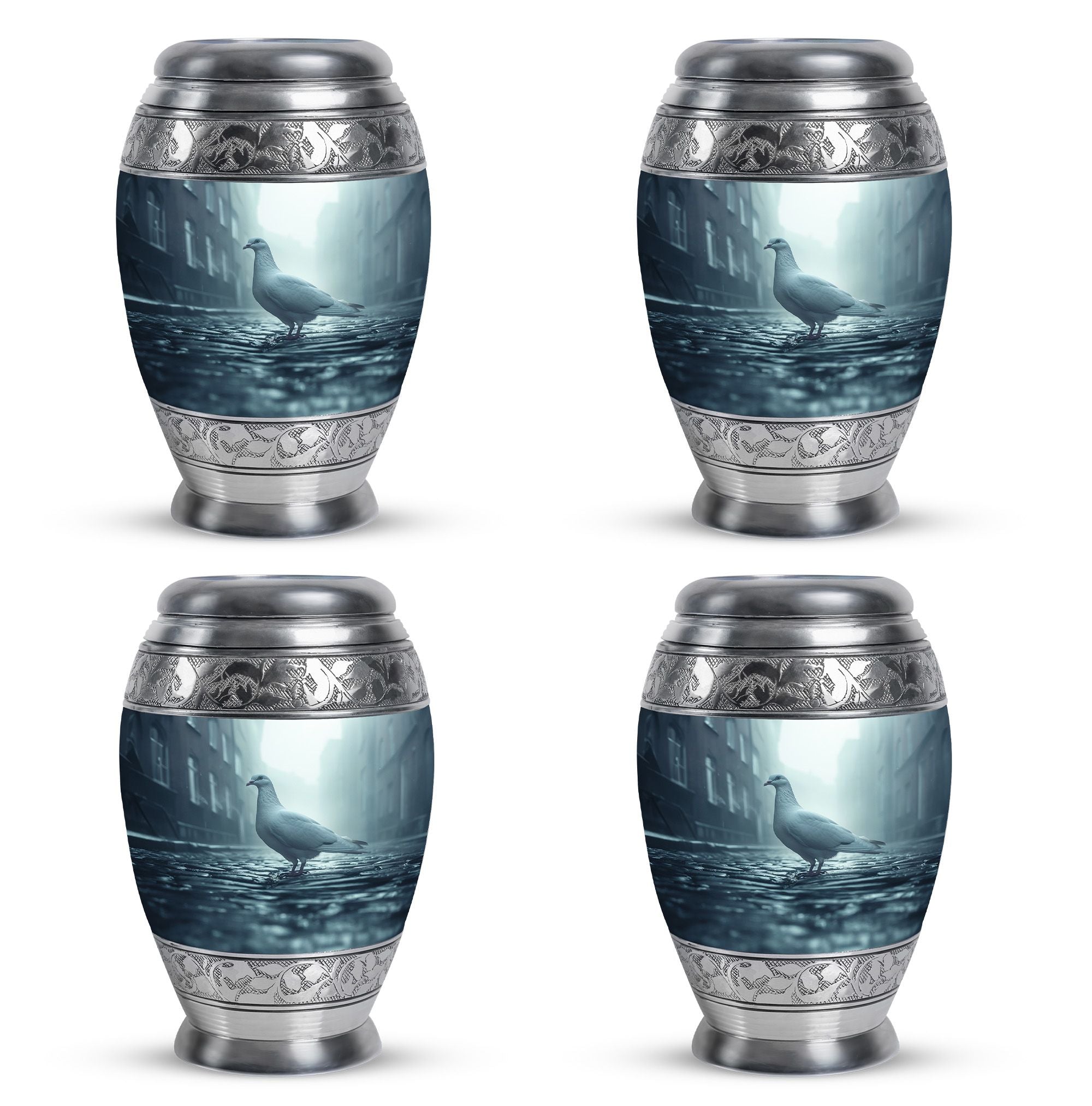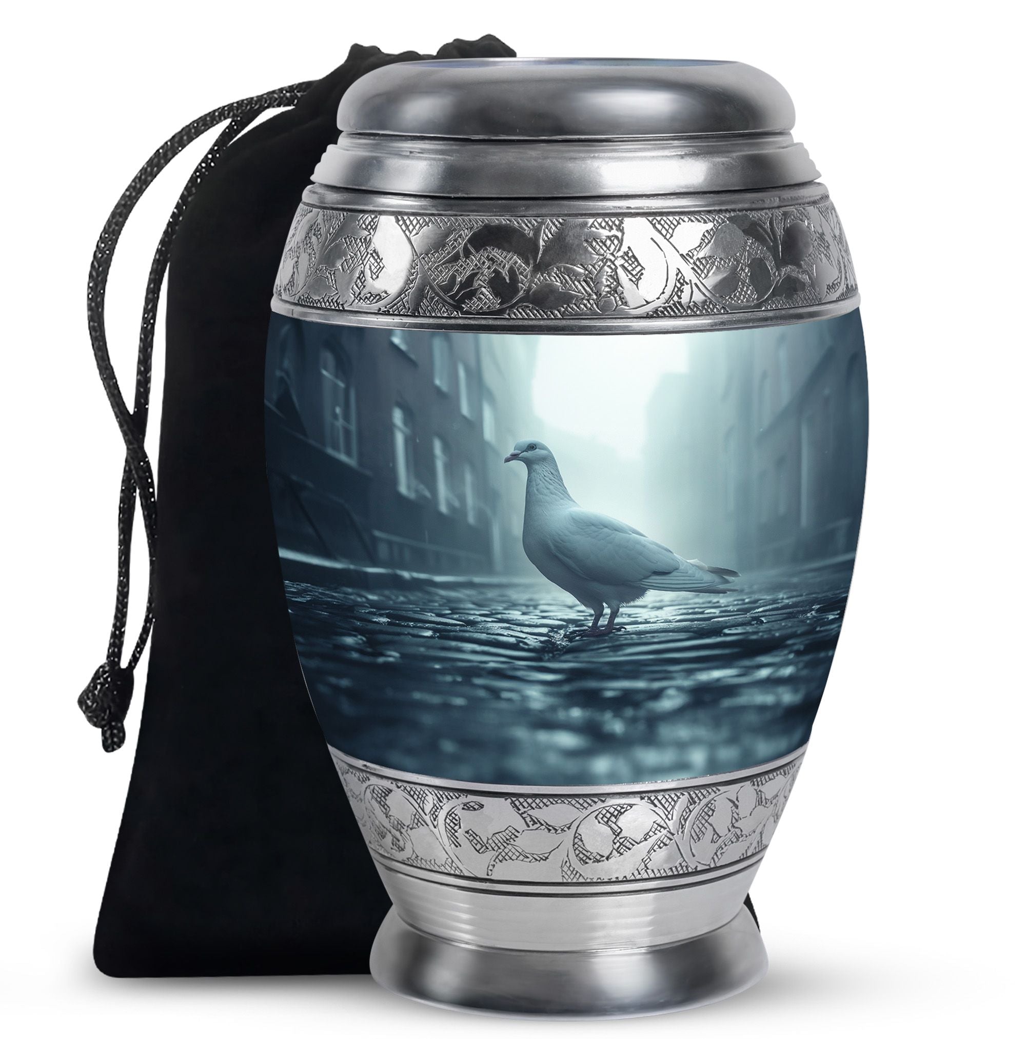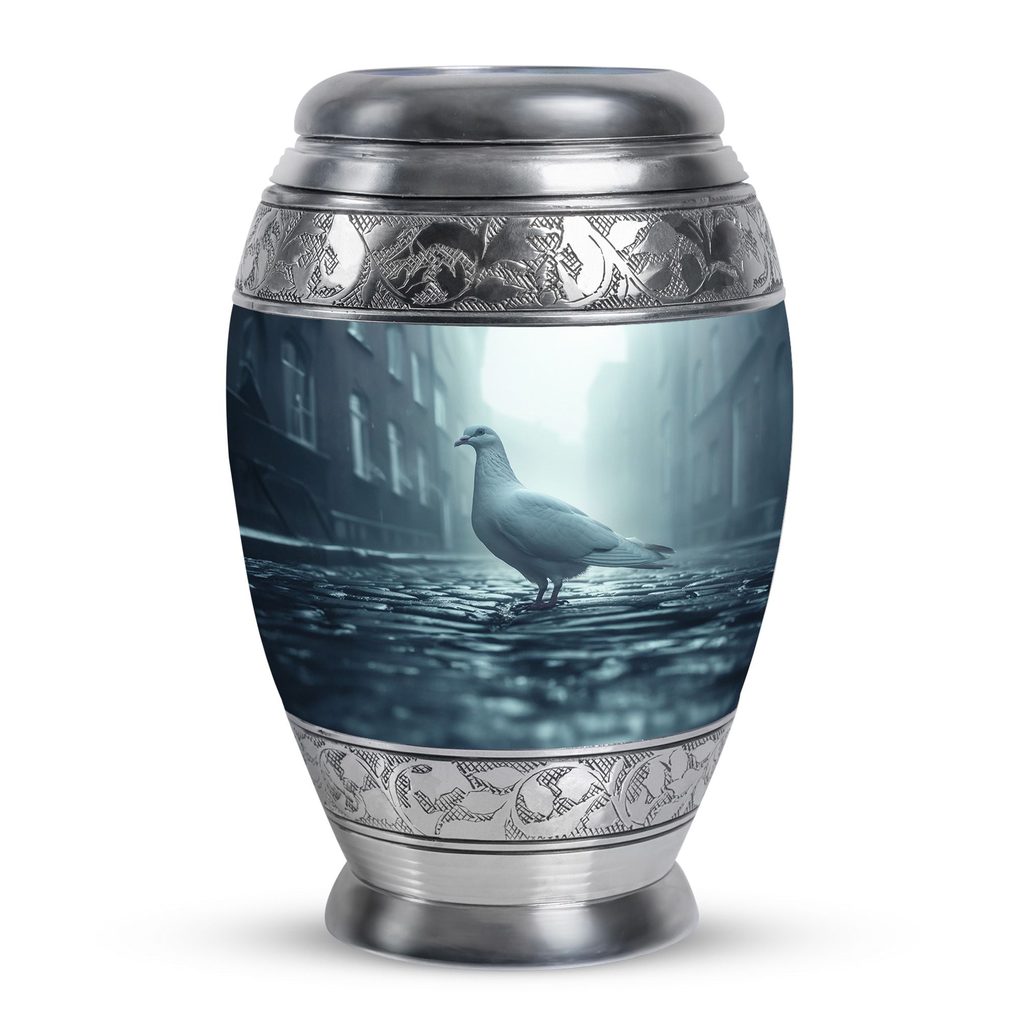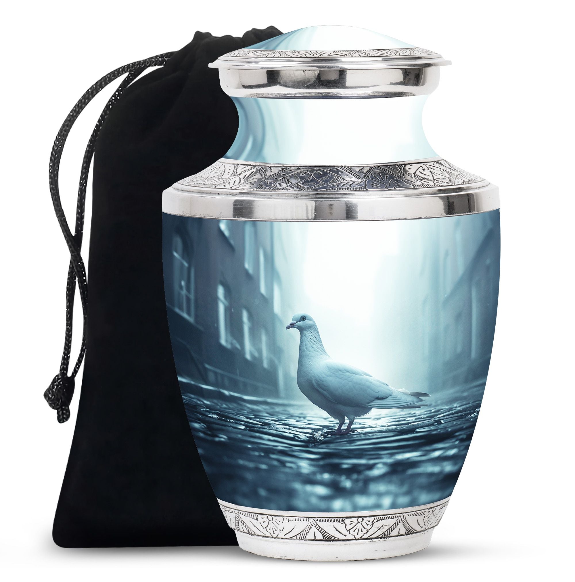 Crafted from durable aluminium, this mini urn blends elegant artistry with lasting strength. Its secure screw-top lid and 10-inch height with 200-cubic-inch capacity make it suitable as a small cremation urns for human ashes adult, adult size cremation urns, or urn for cremation. The graceful white dove motif symbolizes peace and remembrance, making it perfect for both display and intimate memorials, and also suitable as mini cremation urns or urns cremation.