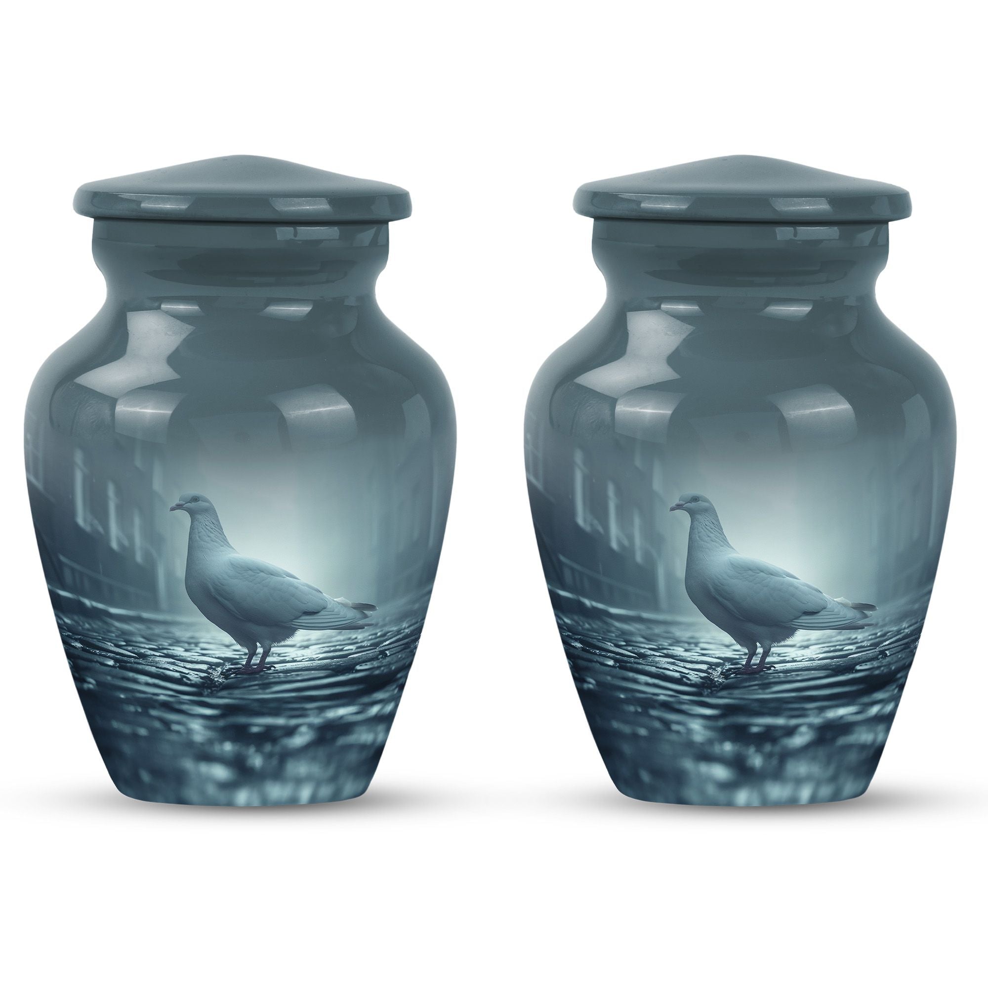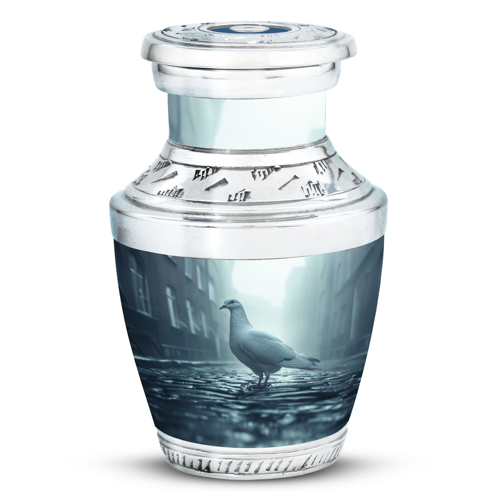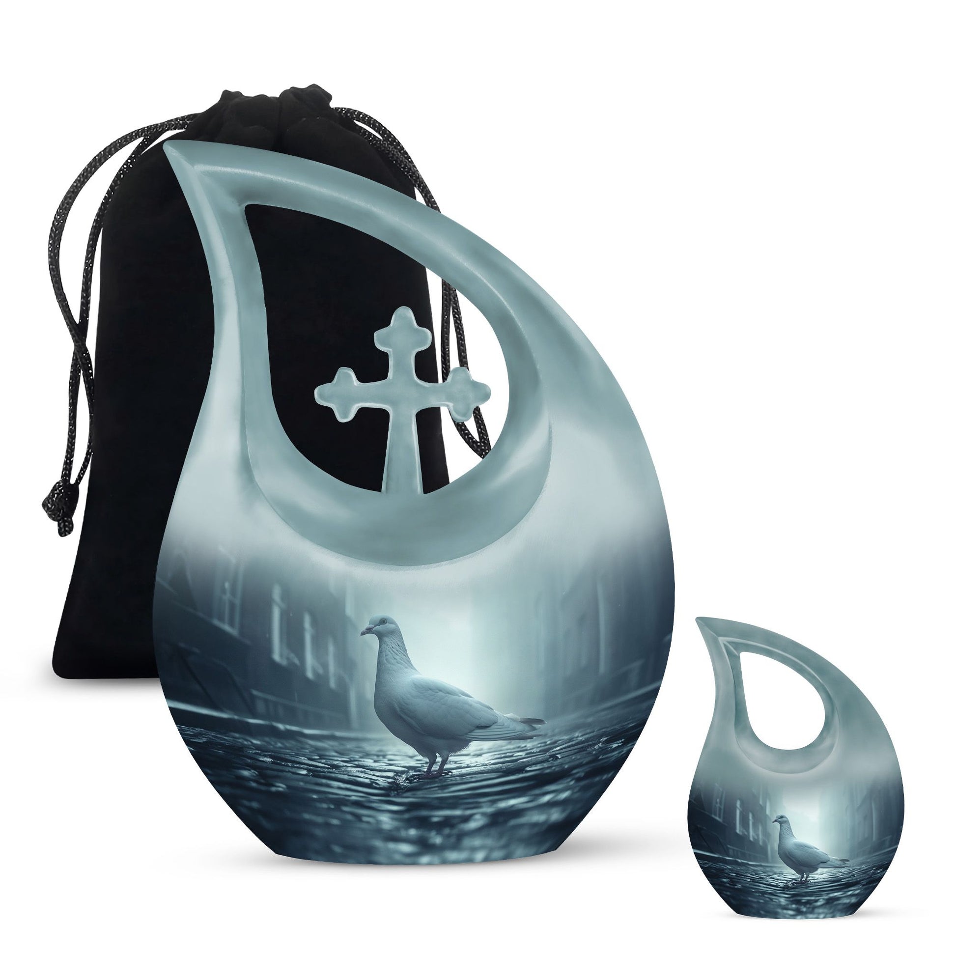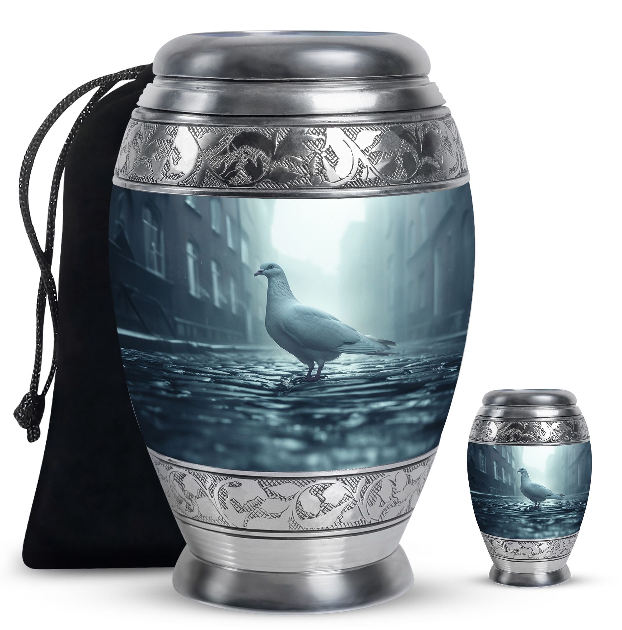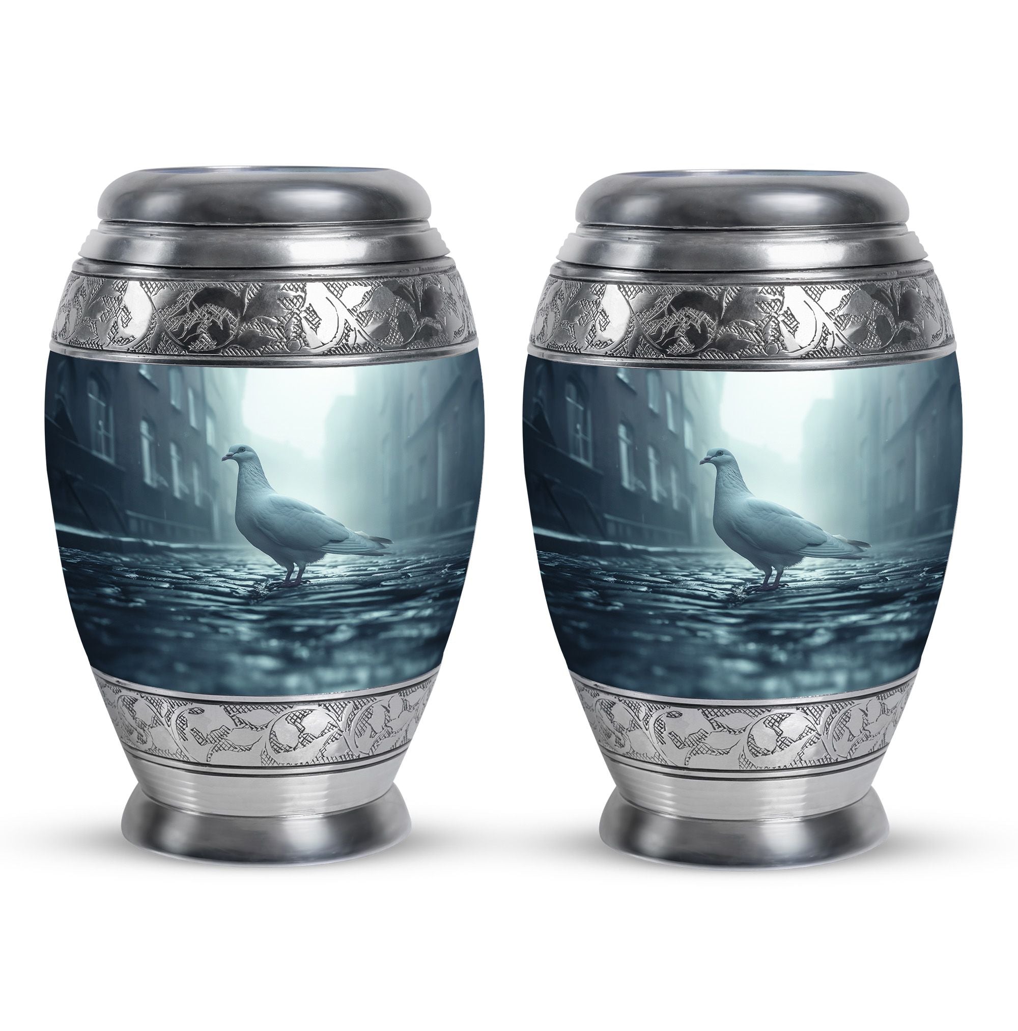 Crafted from durable aluminium, this mini urn blends elegant artistry with lasting strength. Its secure screw-top lid and 10-inch height with 200-cubic-inch capacity make it suitable as a small cremation urns for human ashes adult, adult size cremation urns, or urn for cremation. The graceful white dove motif symbolizes peace and remembrance, making it perfect for both display and intimate memorials, and also suitable as mini cremation urns or urns cremation.