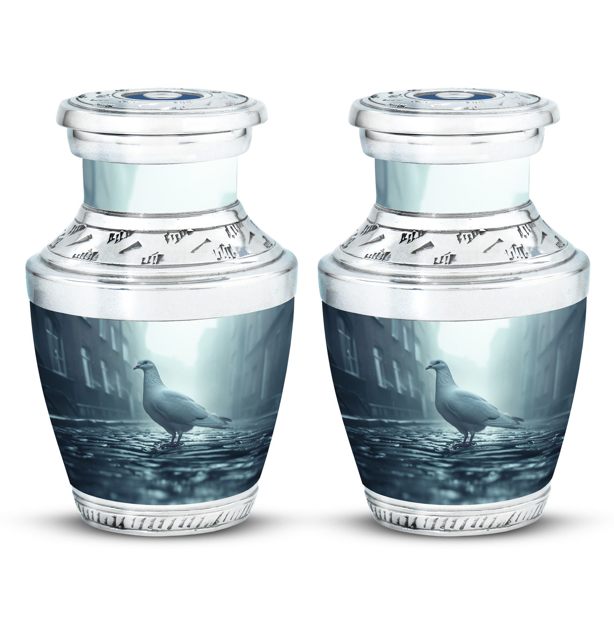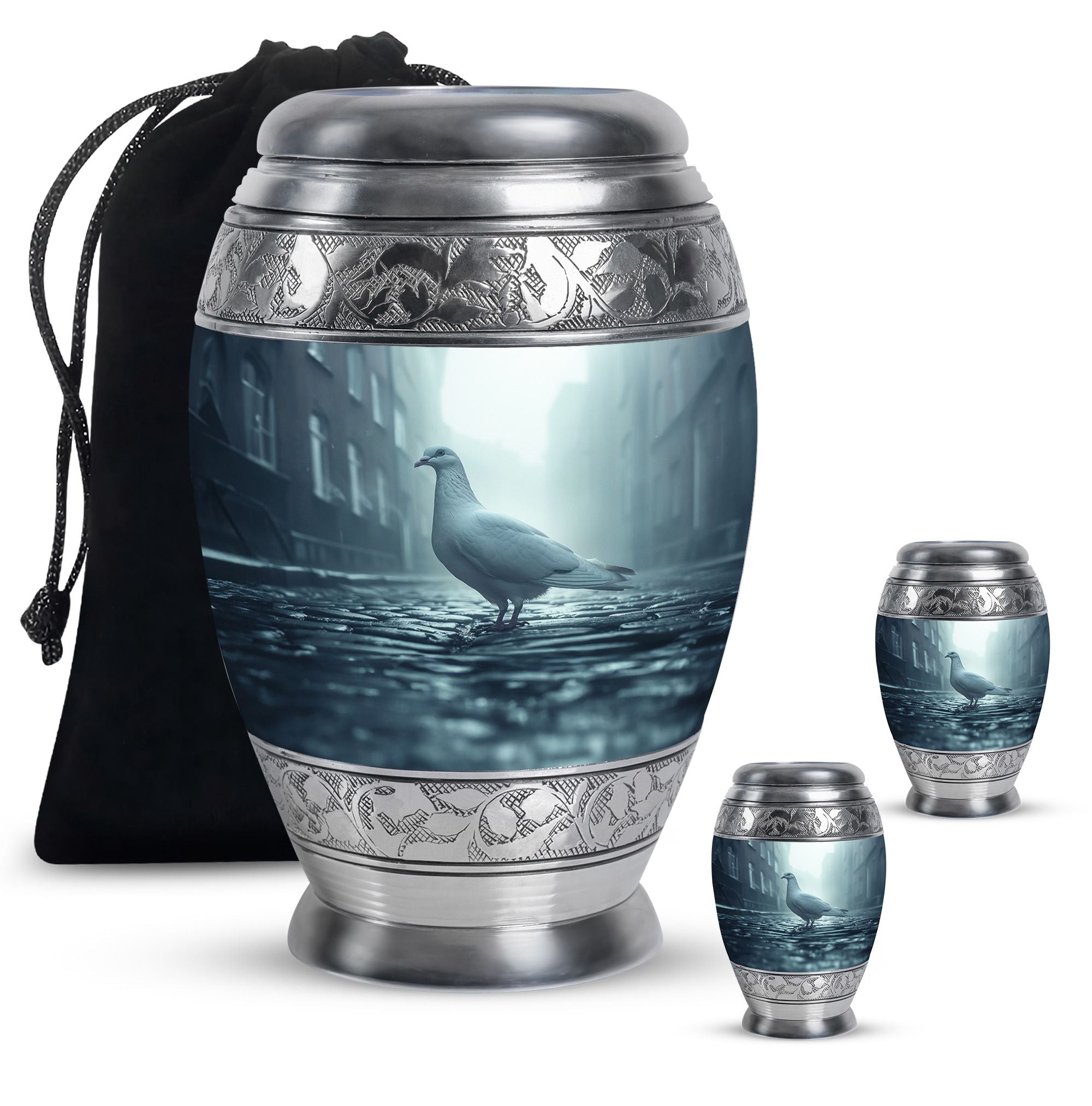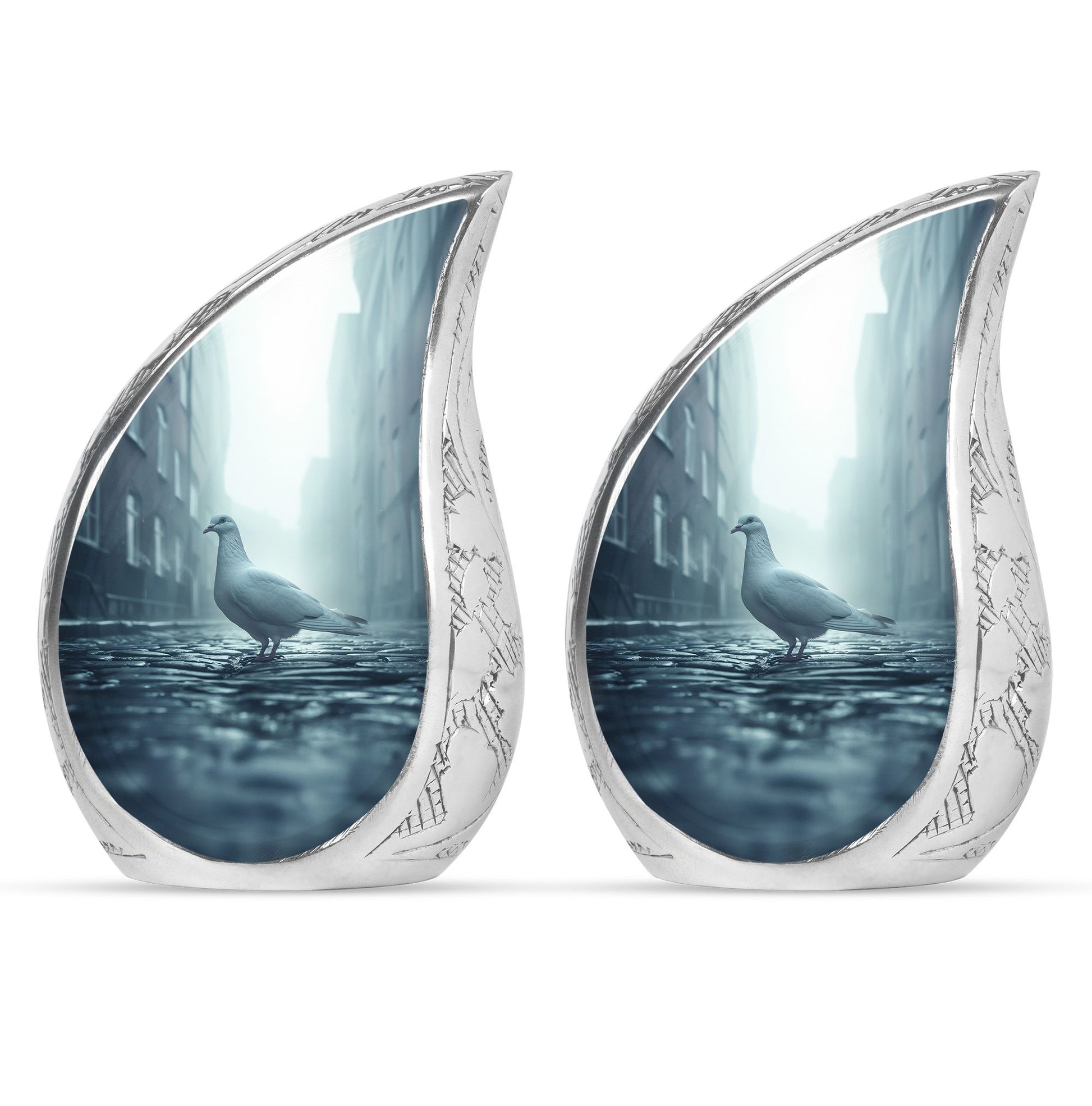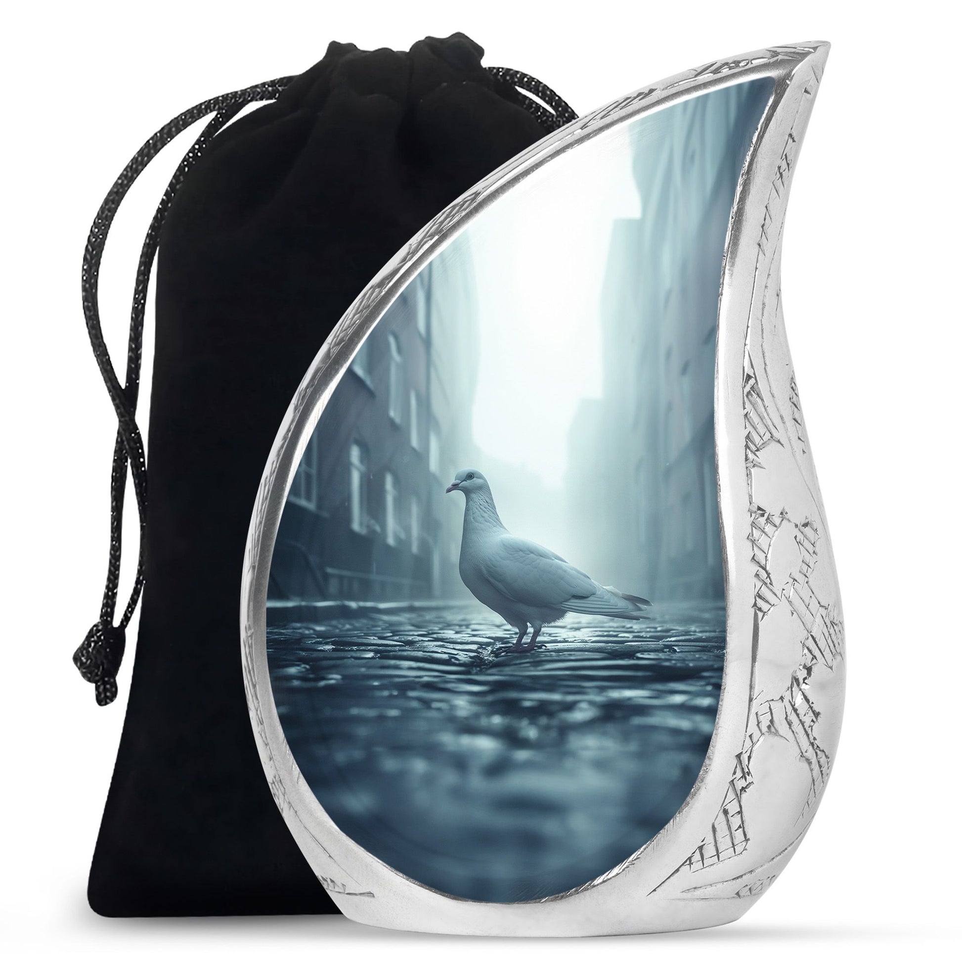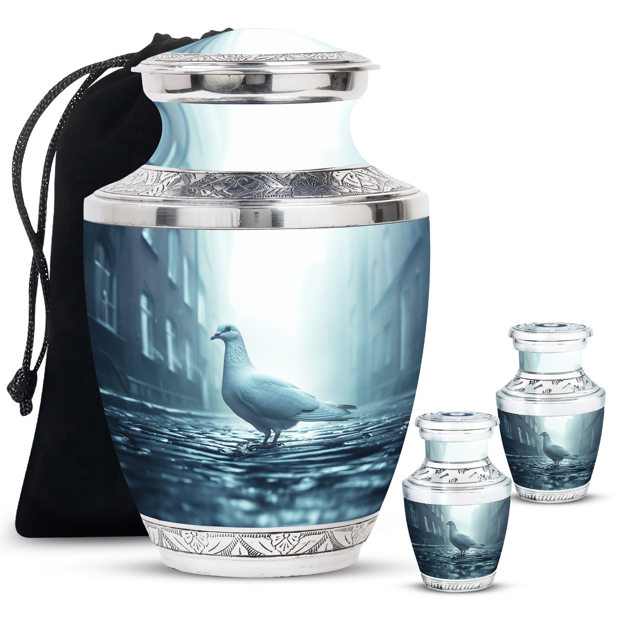 Crafted from durable aluminium, this mini urn blends elegant artistry with lasting strength. Its secure screw-top lid and 10-inch height with 200-cubic-inch capacity make it suitable as a small cremation urns for human ashes adult, adult size cremation urns, or urn for cremation. The graceful white dove motif symbolizes peace and remembrance, making it perfect for both display and intimate memorials, and also suitable as mini cremation urns or urns cremation.