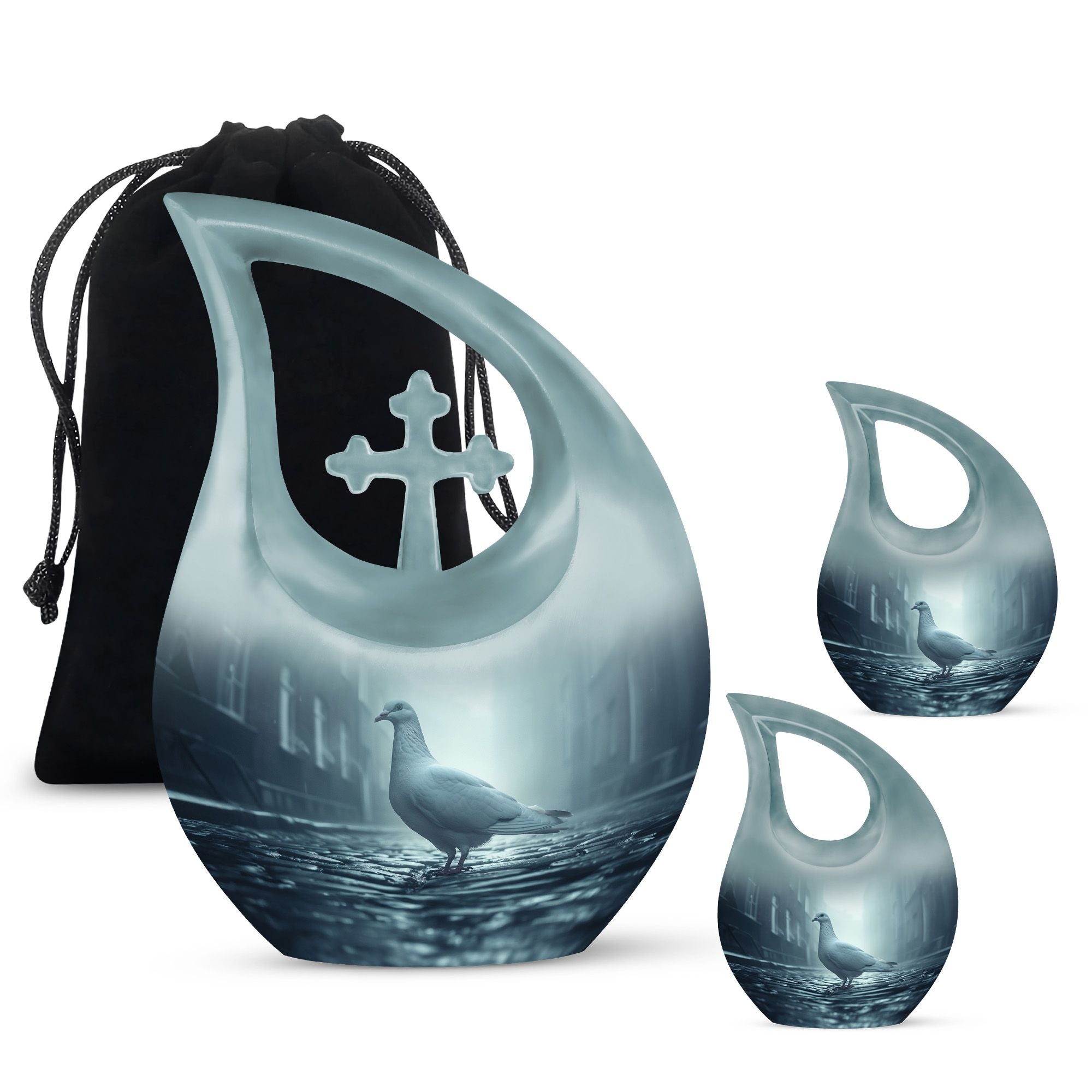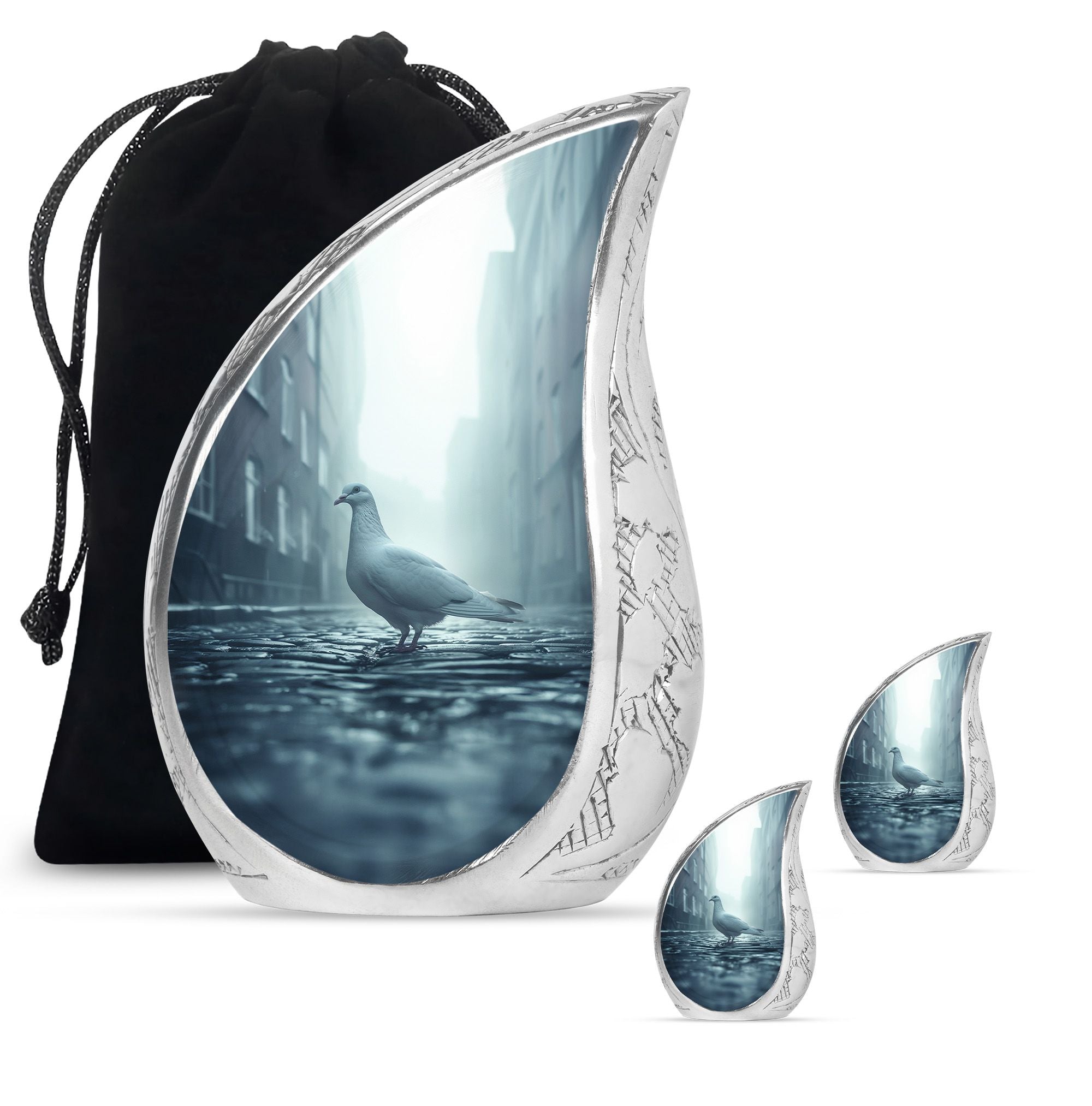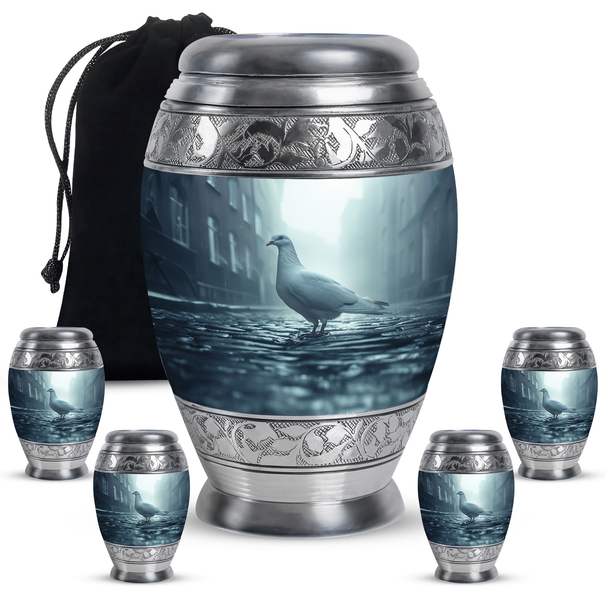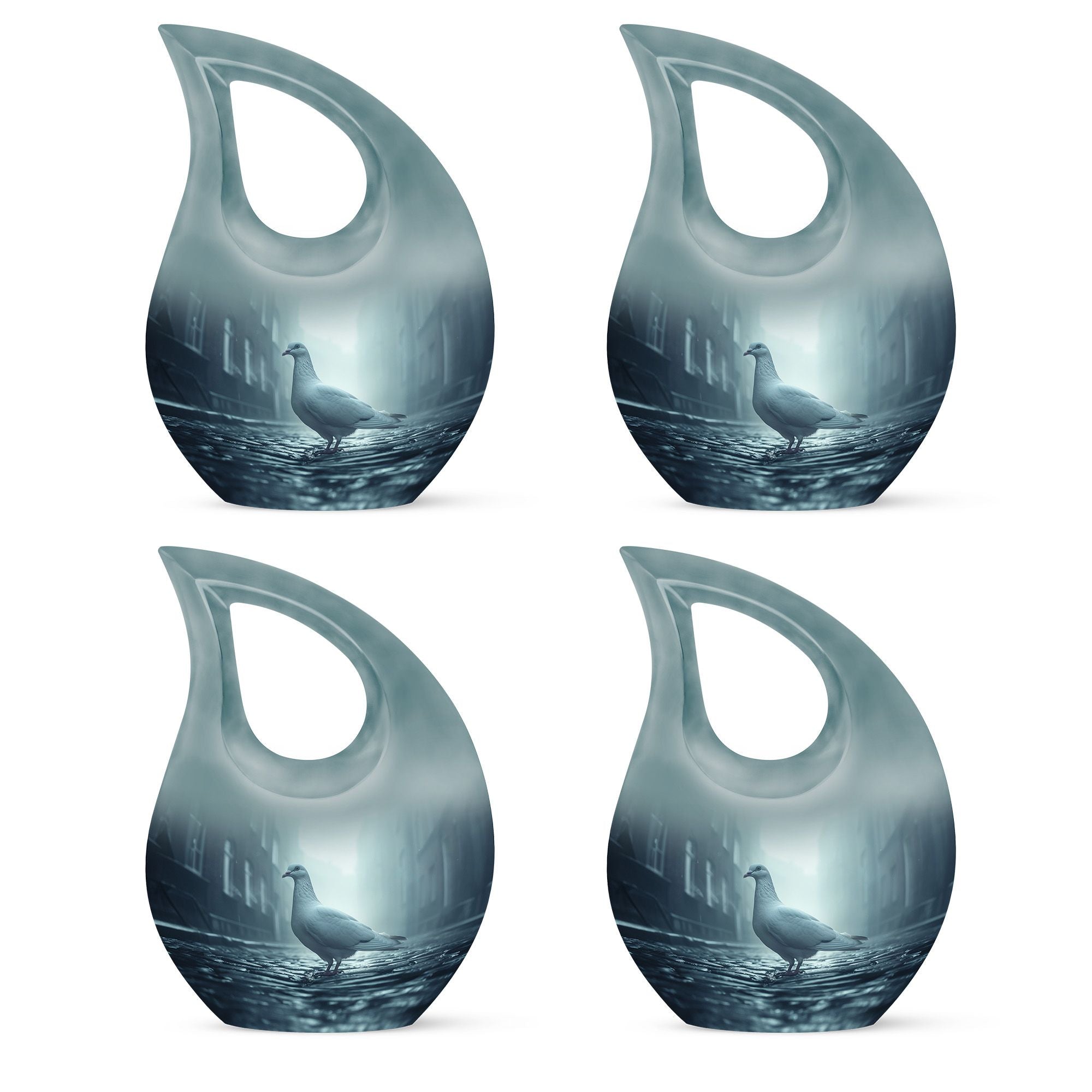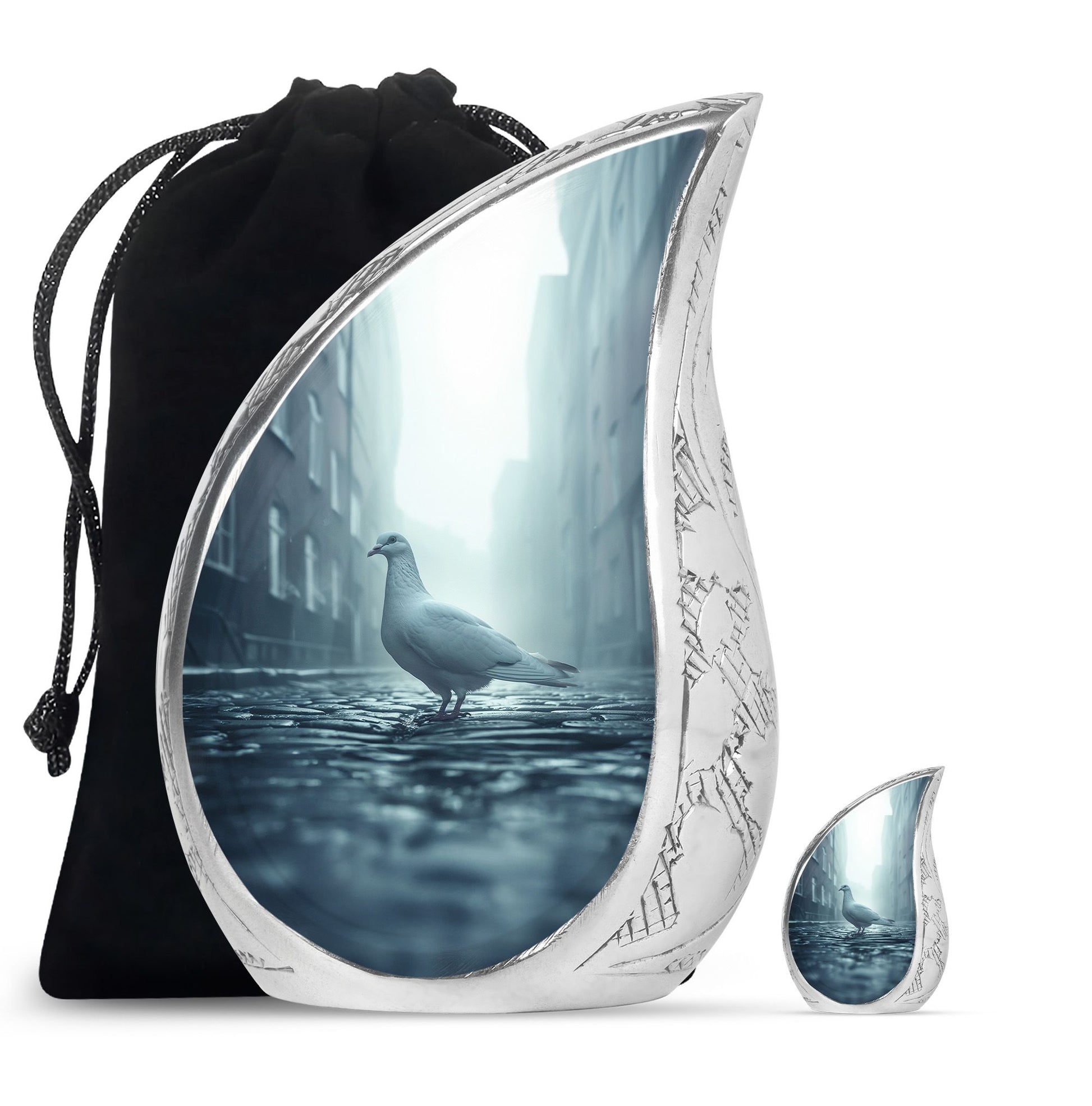 Crafted from durable aluminium, this mini urn blends elegant artistry with lasting strength. Its secure screw-top lid and 10-inch height with 200-cubic-inch capacity make it suitable as a small cremation urns for human ashes adult, adult size cremation urns, or urn for cremation. The graceful white dove motif symbolizes peace and remembrance, making it perfect for both display and intimate memorials, and also suitable as mini cremation urns or urns cremation.