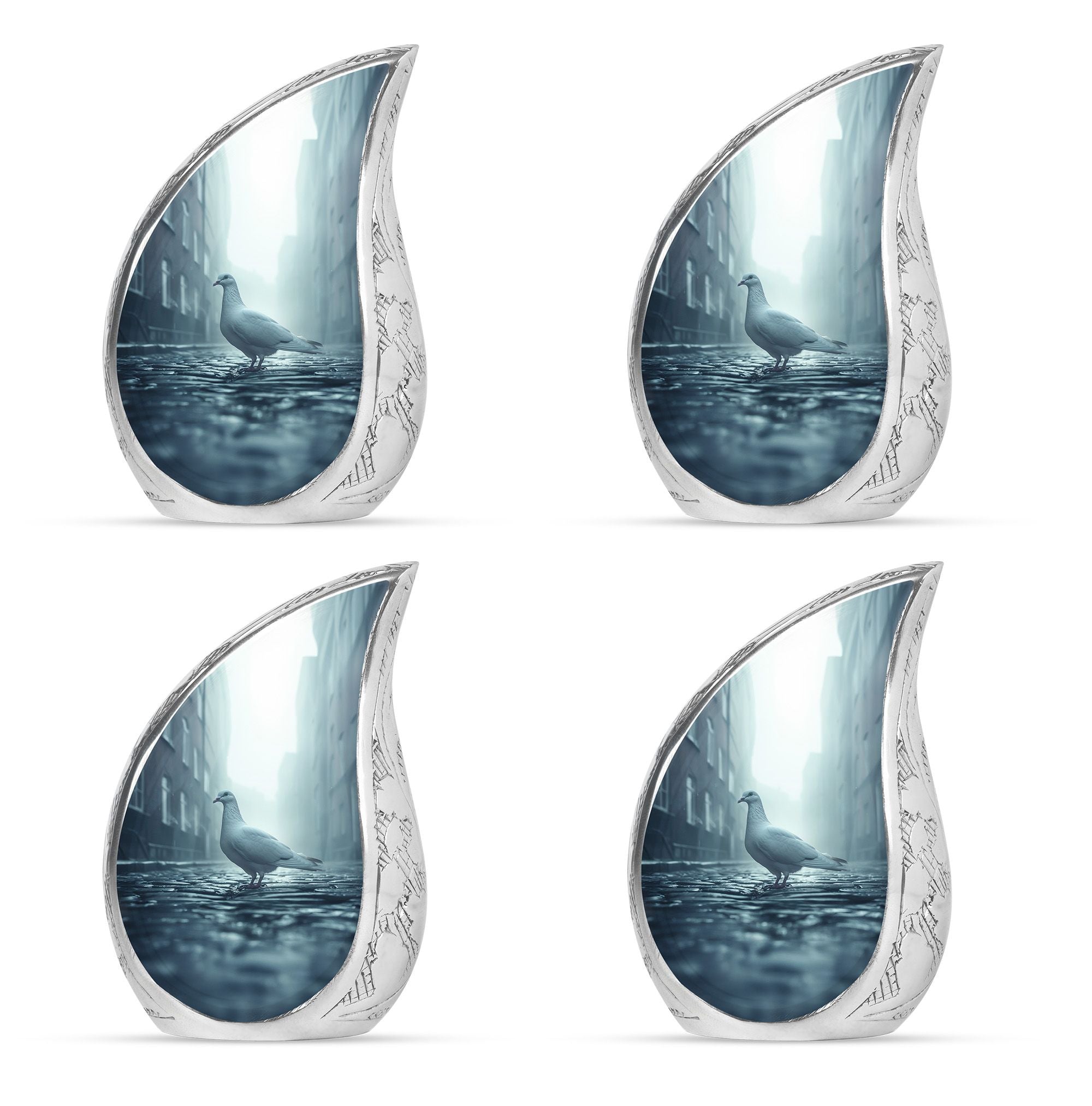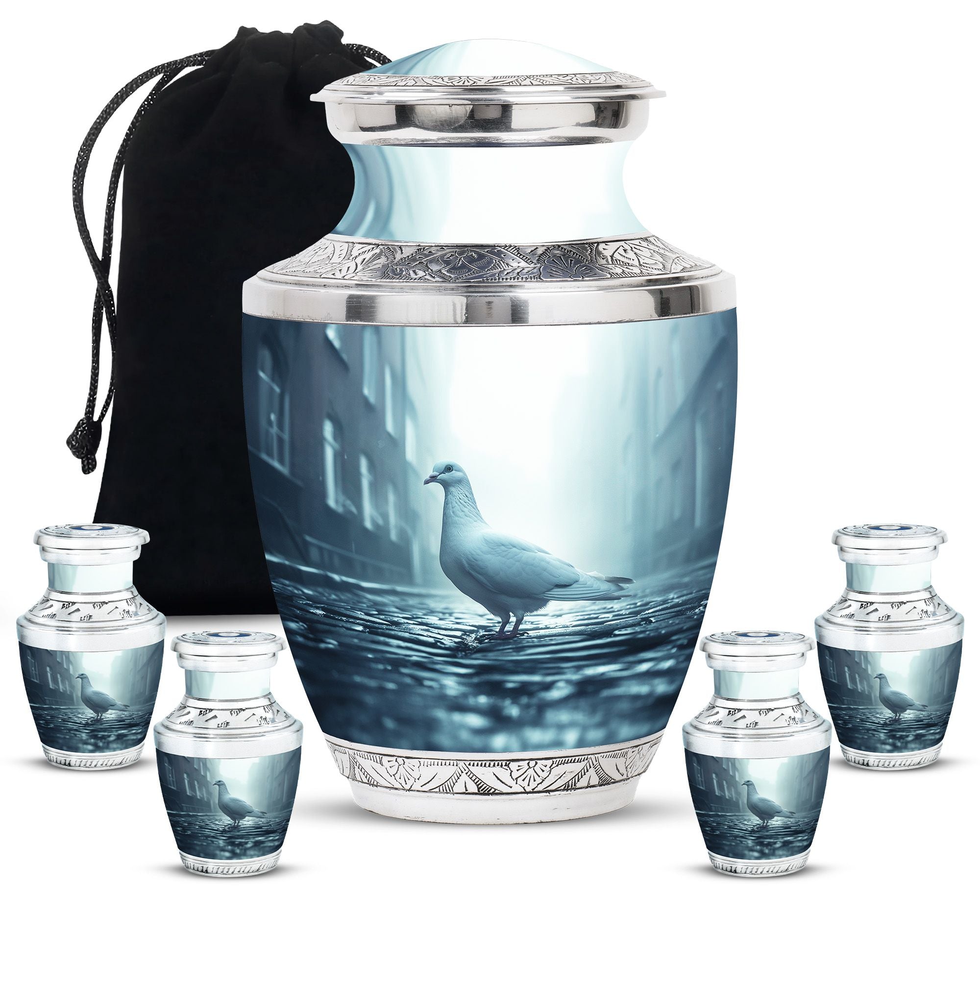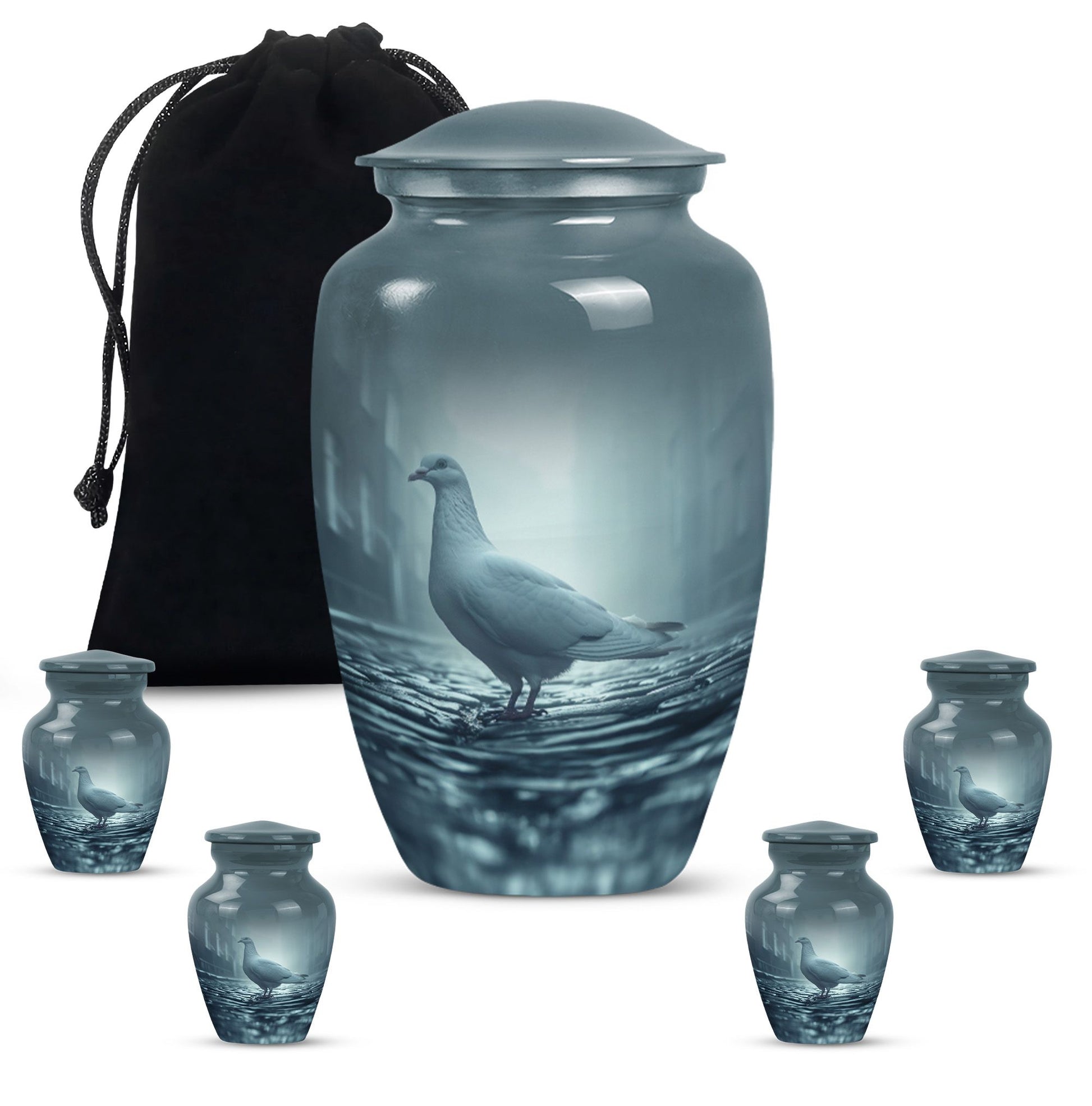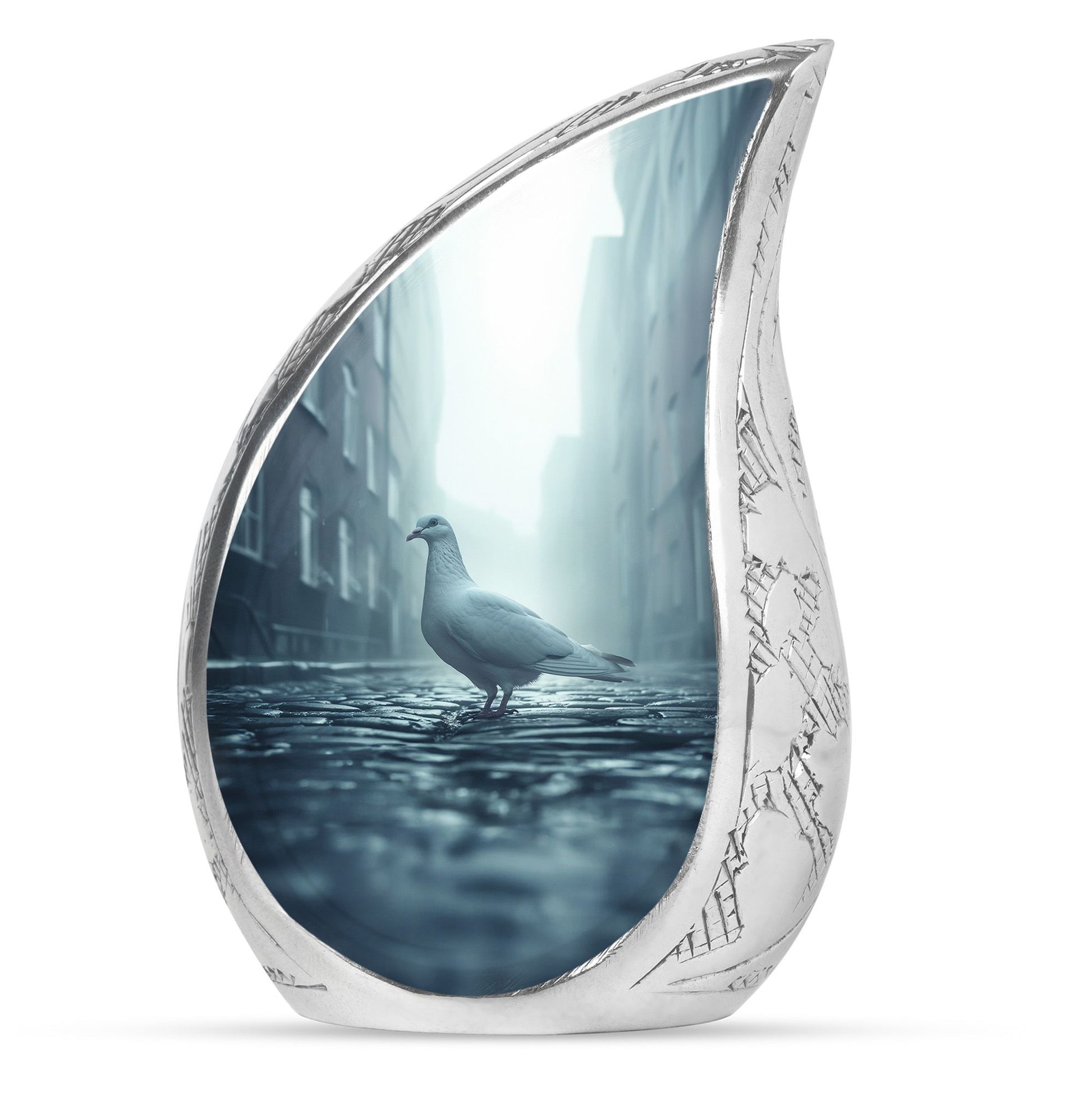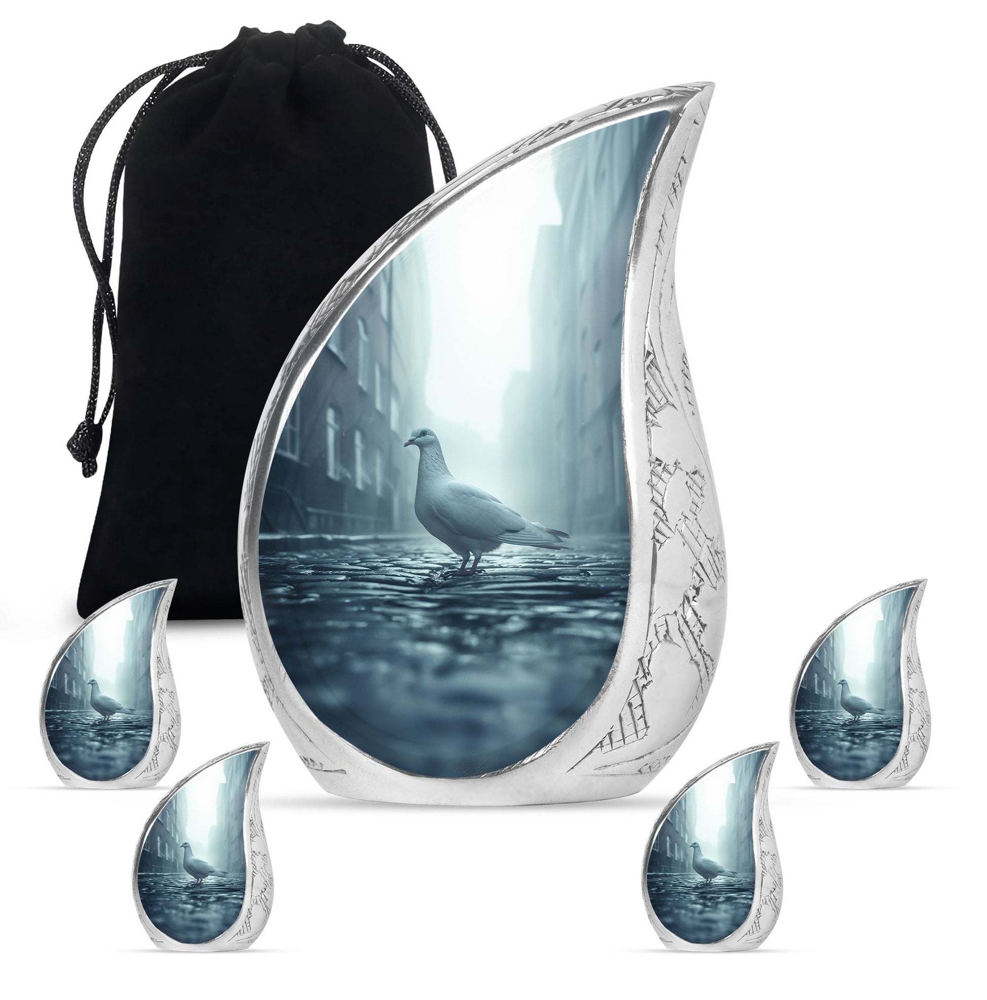Crafted from durable aluminium, this mini urn blends elegant artistry with lasting strength. Its secure screw-top lid and 10-inch height with 200-cubic-inch capacity make it suitable as a small cremation urns for human ashes adult, adult size cremation urns, or urn for cremation. The graceful white dove motif symbolizes peace and remembrance, making it perfect for both display and intimate memorials, and also suitable as mini cremation urns or urns cremation.