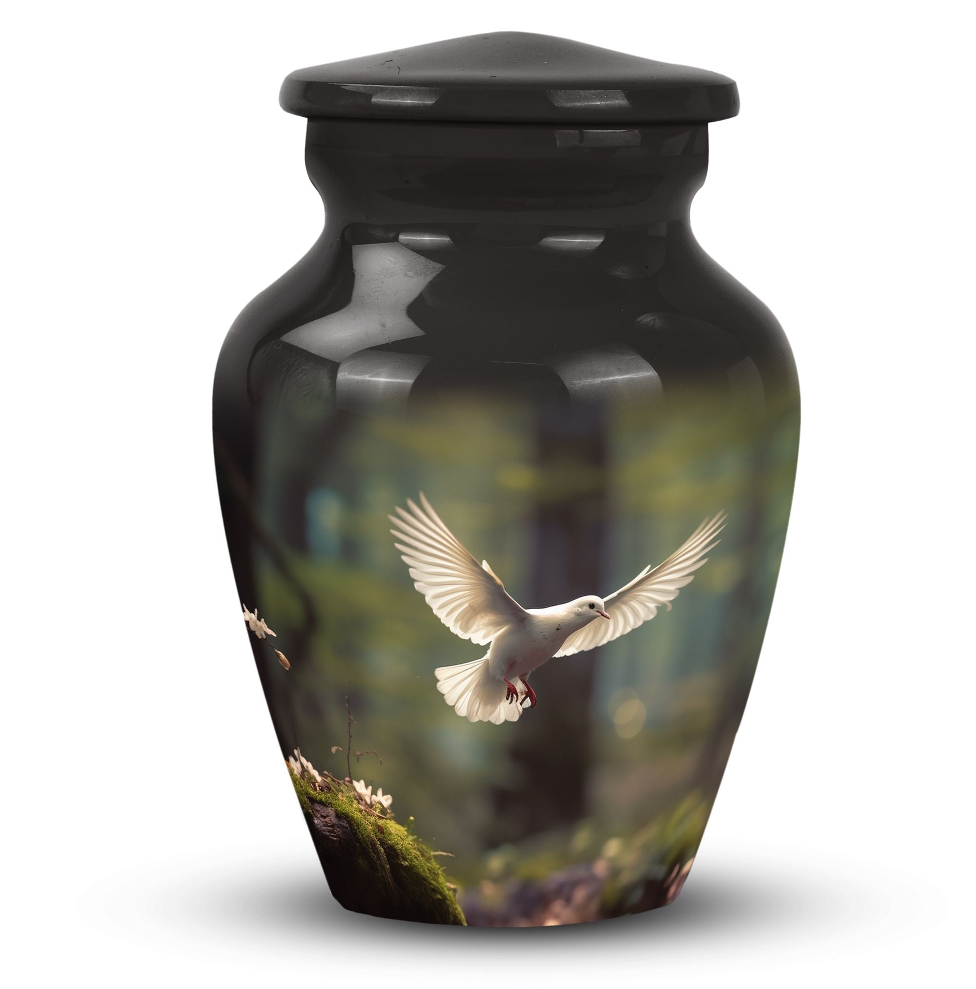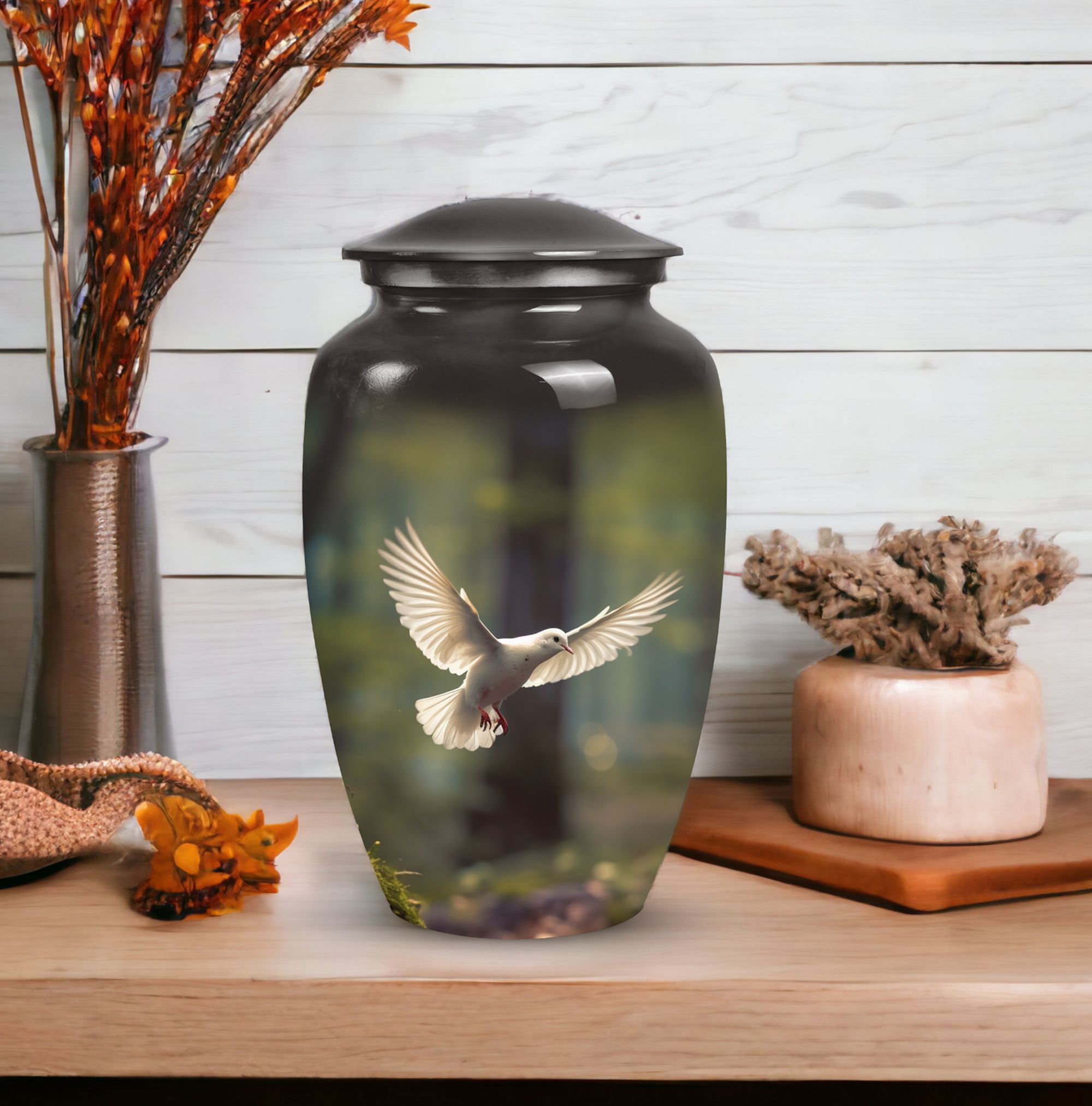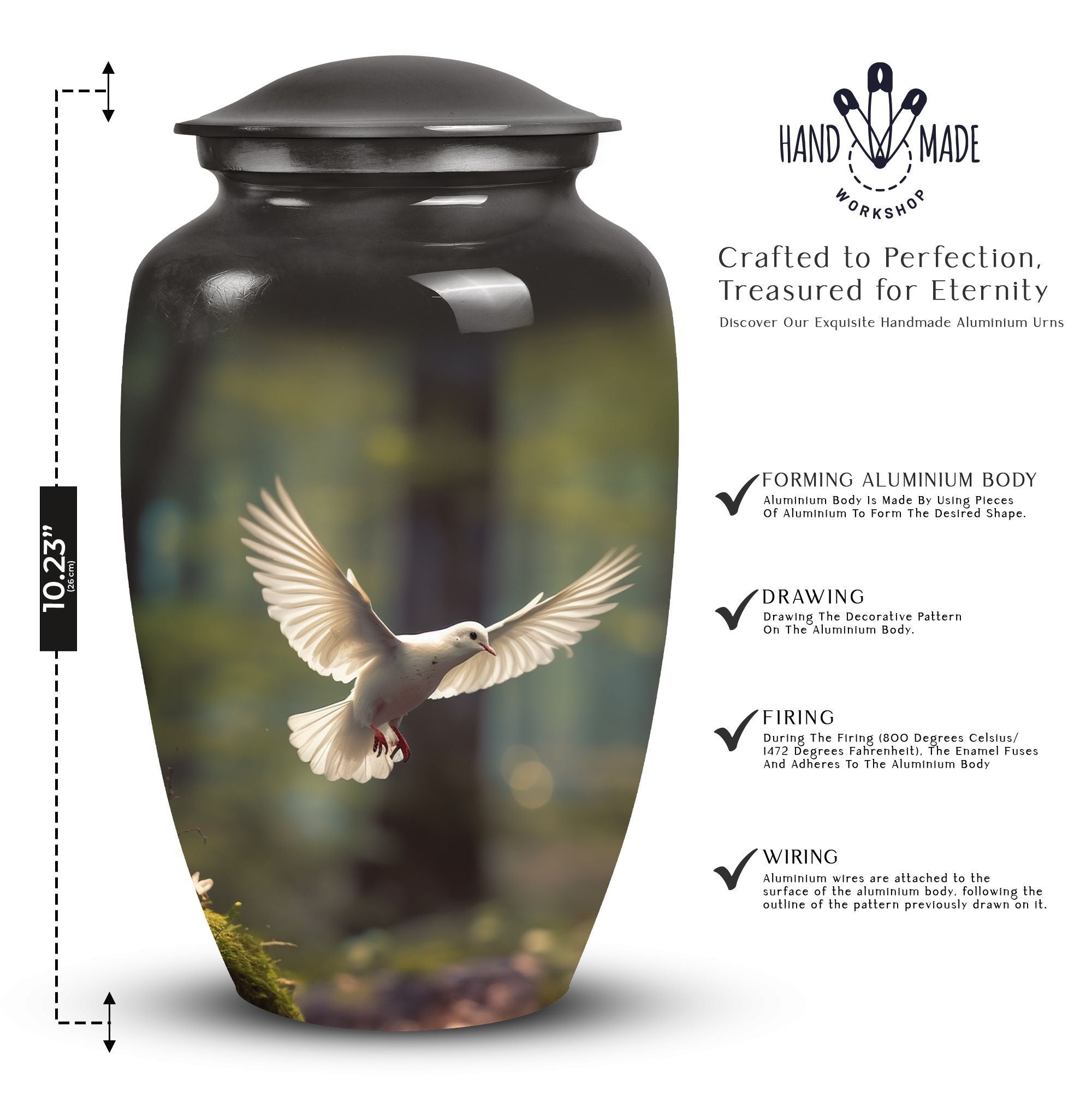 Our Dove Flying Memorial Urn is a deeply moving keepsake, designed to cherish the memory of your loved ones. With a size of 3 inches and weighting 3.3 pounds, this large urn is sure to be a fitting tribute. The 10 inches tall classic urn, made from high-quality aluminium, is a stately presence. With a capacity for 200 cubic inches, it comfortably contains ashes, securely stored in the accompanying velvet pouch. Besides its aesthetic appeal, it's highly functional and serves the solemn purpose of a cherished ashes holder. Special emphasis has been given to make this memorial urn a personalized space; engrave names of your beloved for an intimate touch. Often sought under titles like 'Custom Cremation Urns', 'Unique Urns for Ashes', and 'Large Urns for Ashes', it embodies an unmatched blend of elegance and memorial significance. Experience the comfort of knowing your loved one's memory is preserved with our Dove Flying Memorial Urn.
