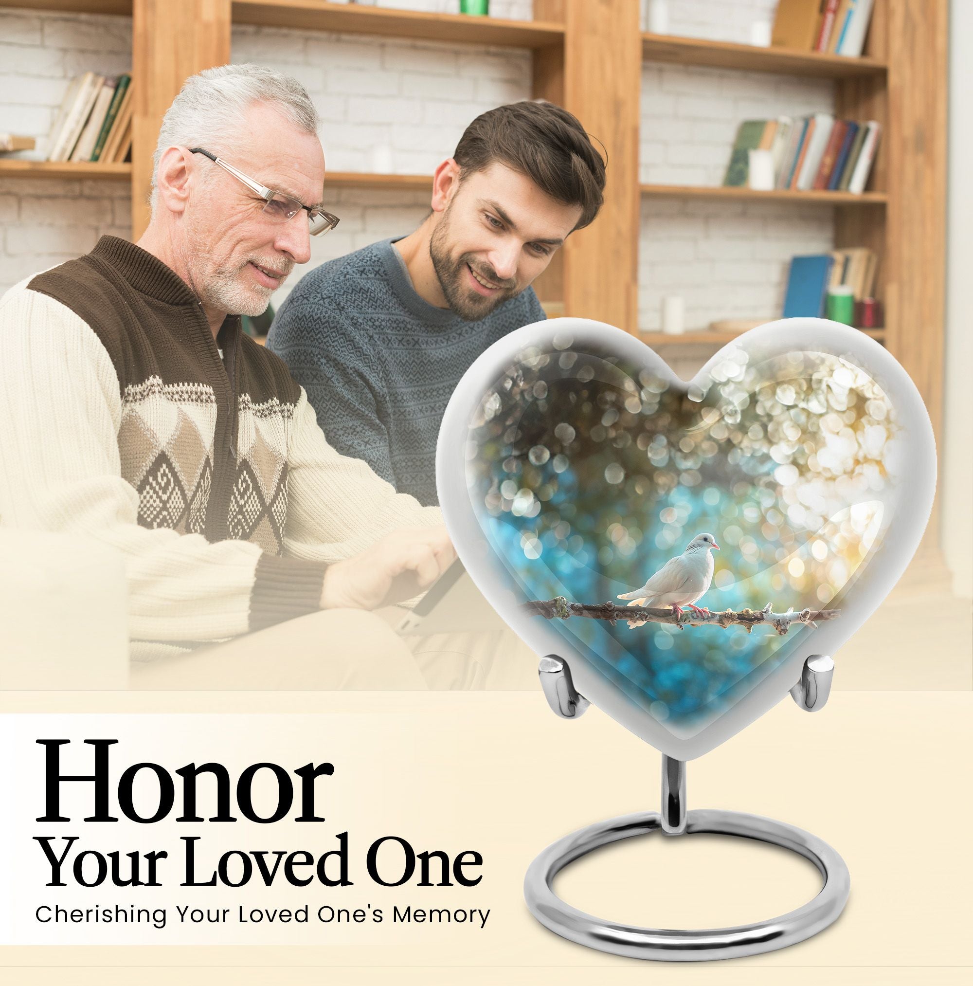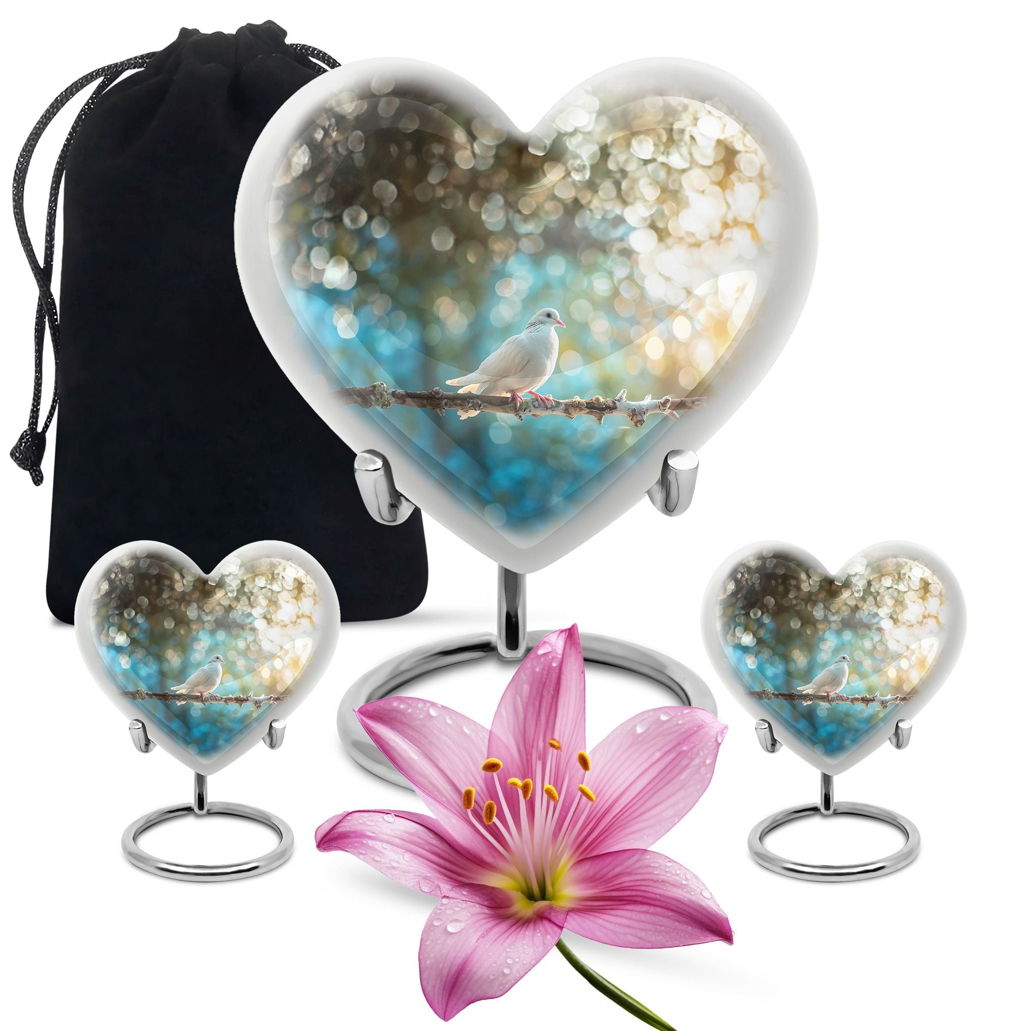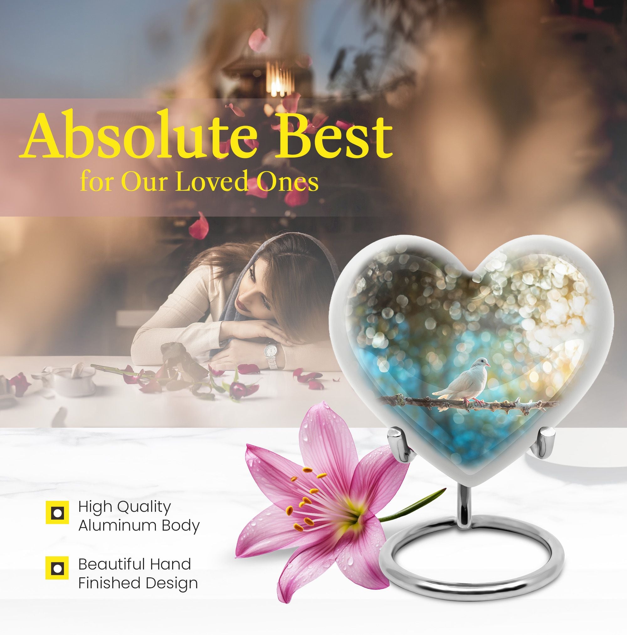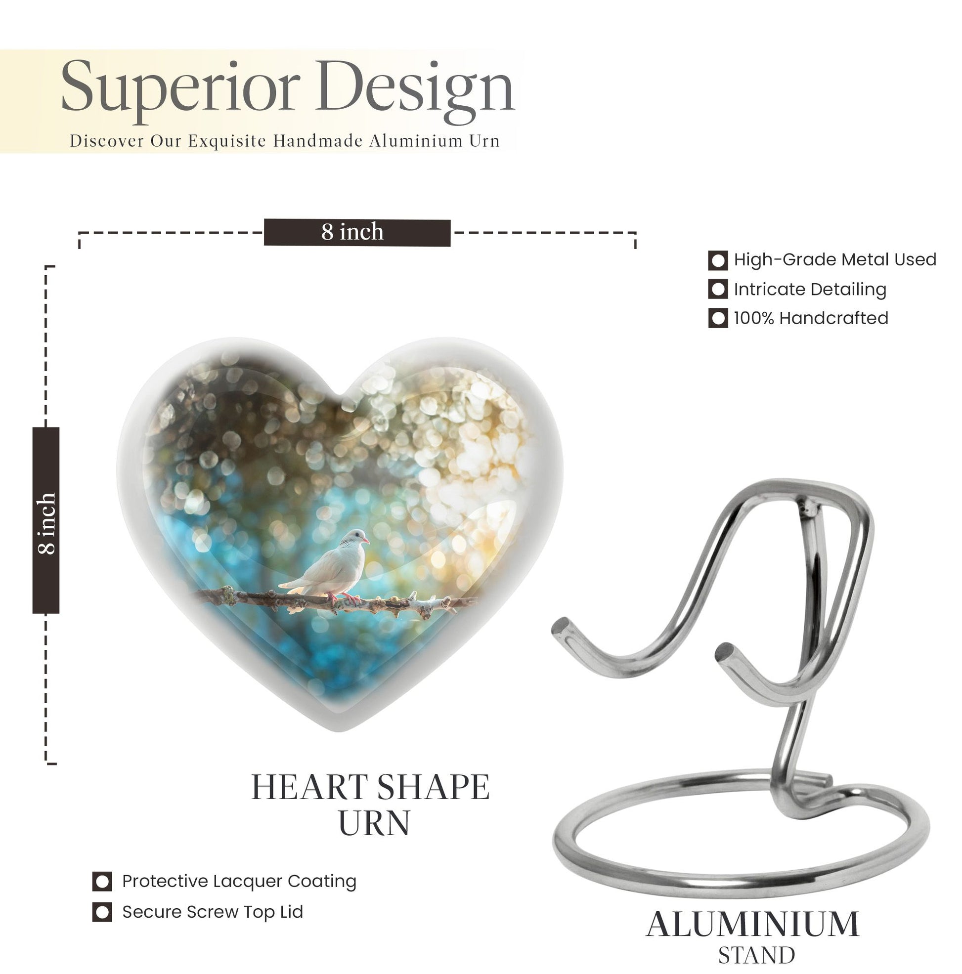 Experience serenity in times of grief with our large Dove Urn, a remarkable and beautiful piece from our collection of funeral burial urns. This 10-inch Aluminium urn, weighing a solid 3.3 pounds, captivates with its heart-themed design, emulating affection and profound love. The design is a unique fusion of craftsmanship and tradition, symbolizing peace and tranquility. Personalization options are available, allowing for the intricate engraving of names to forever remember those unforgettable beings. This cremation urn has a robust capacity of 200 cubic inches, allowing for a generous containment of ashes. We also provide a velvet pouch for the respectful keeping of the ashes. Our Dove Urn is the perfect tribute to your loved one, turning those grieving moments into serene memories. Ideal for those searching for 'urn human ash urn ash', 'adult cremation urns', 'Memorial large urns for human ashes', our Dove Urn is a preferred choice.