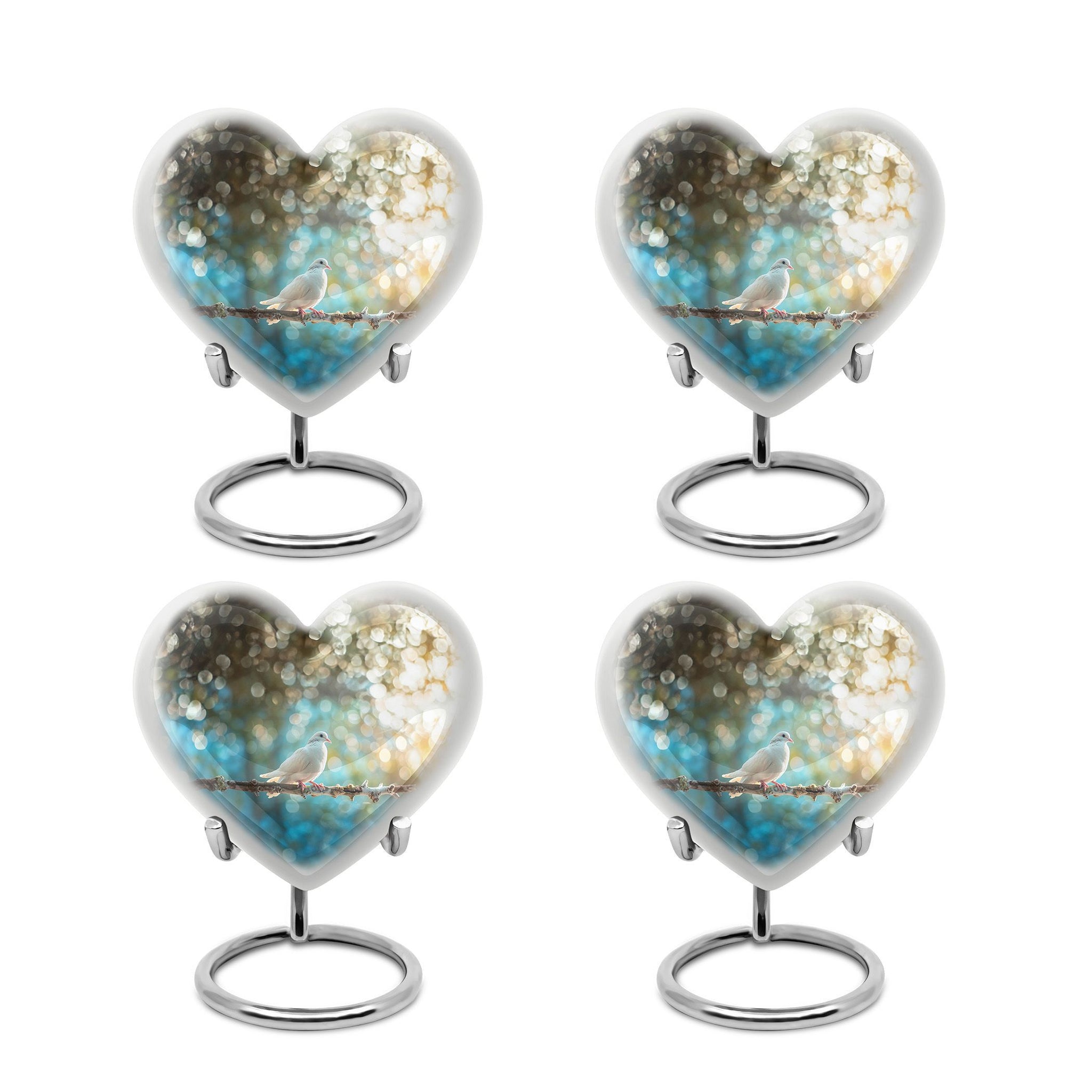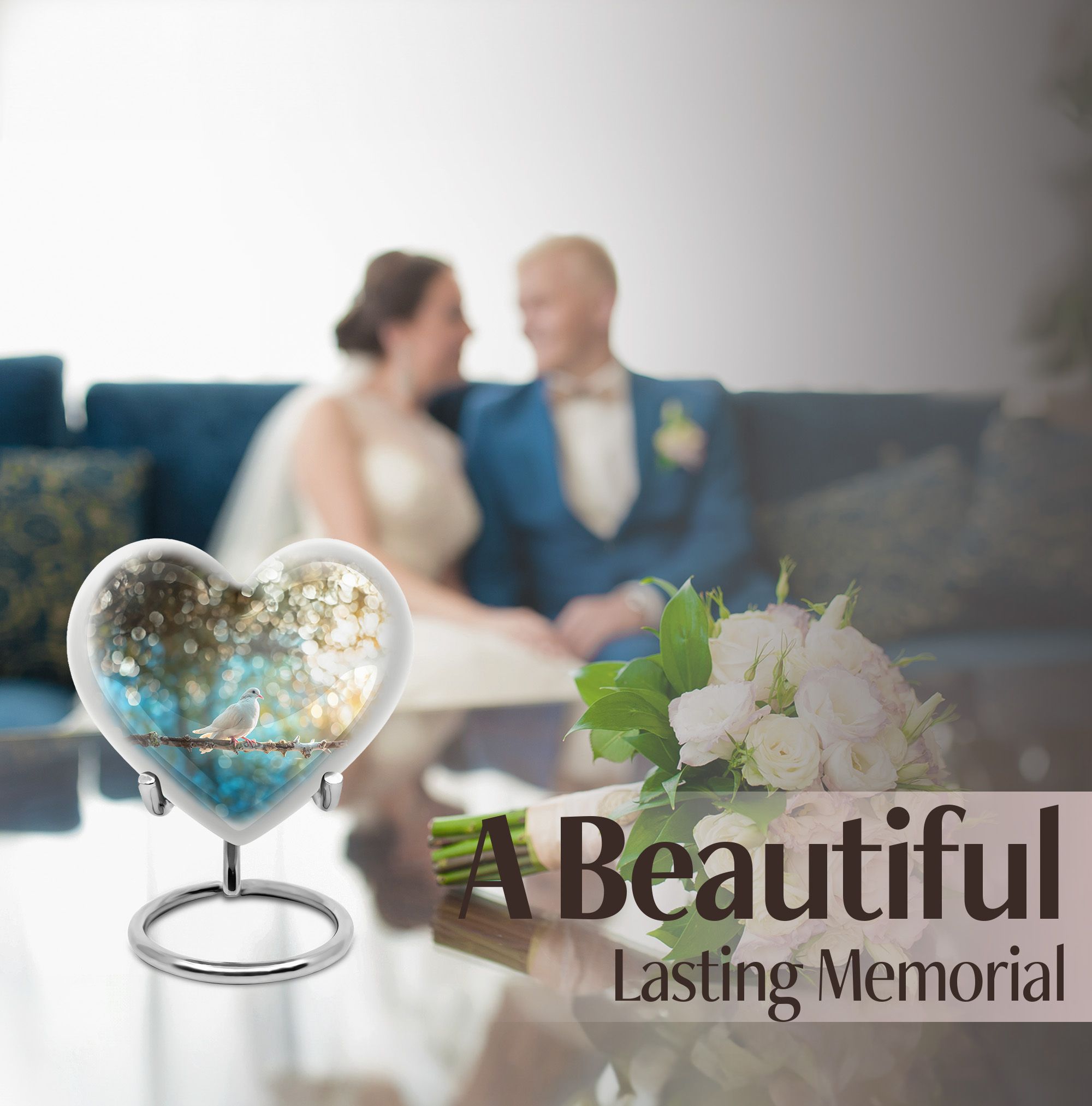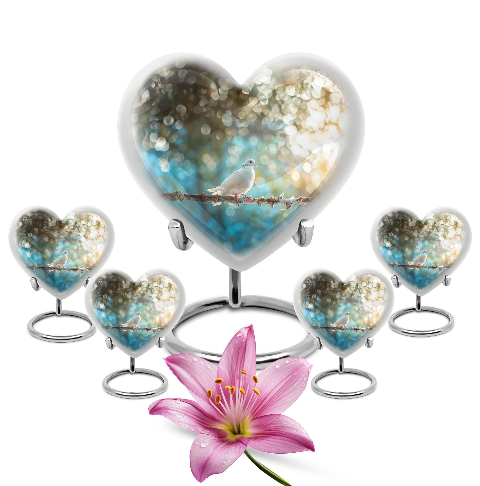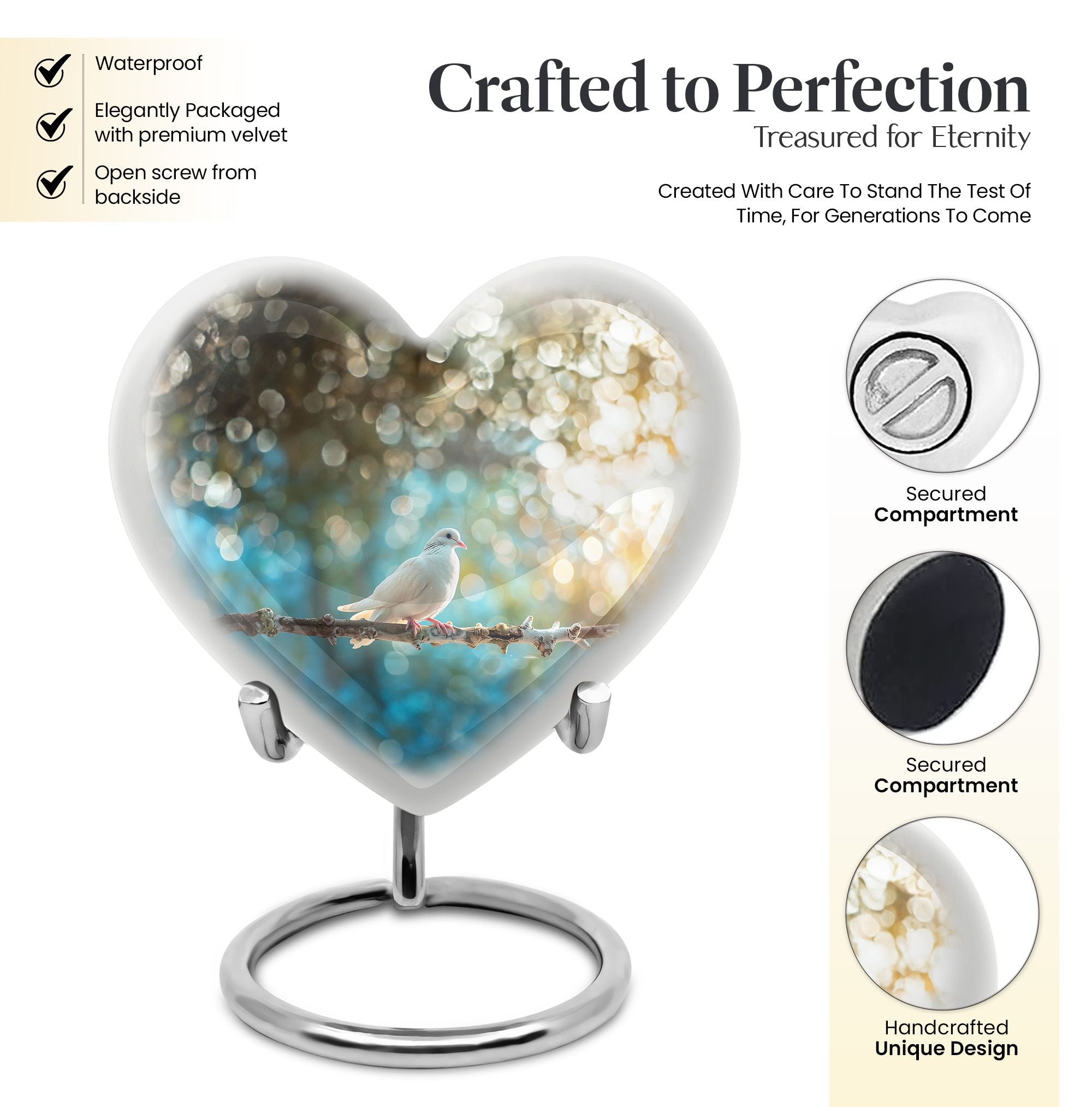 Experience serenity in times of grief with our large Dove Urn, a remarkable and beautiful piece from our collection of funeral burial urns. This 10-inch Aluminium urn, weighing a solid 3.3 pounds, captivates with its heart-themed design, emulating affection and profound love. The design is a unique fusion of craftsmanship and tradition, symbolizing peace and tranquility. Personalization options are available, allowing for the intricate engraving of names to forever remember those unforgettable beings. This cremation urn has a robust capacity of 200 cubic inches, allowing for a generous containment of ashes. We also provide a velvet pouch for the respectful keeping of the ashes. Our Dove Urn is the perfect tribute to your loved one, turning those grieving moments into serene memories. Ideal for those searching for 'urn human ash urn ash', 'adult cremation urns', 'Memorial large urns for human ashes', our Dove Urn is a preferred choice.