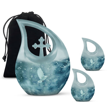 Expertly crafted from premium aluminum, this funeral cremation urn for ashes features a stunning snow-white background adorned with delicate doves in flight — representing the soul’s journey to peace. The smooth finish and artistic detailing make it a fitting piece for any setting. Designed for long-lasting strength and grace, it’s available as a cremation urns large & small combo, perfect for families wishing to share memories through keepsake urns. Each funeral adult urn and small funeral urn is carefully crafted for both style and security, featuring a durable screw-top lid to safeguard your loved one’s ashes.