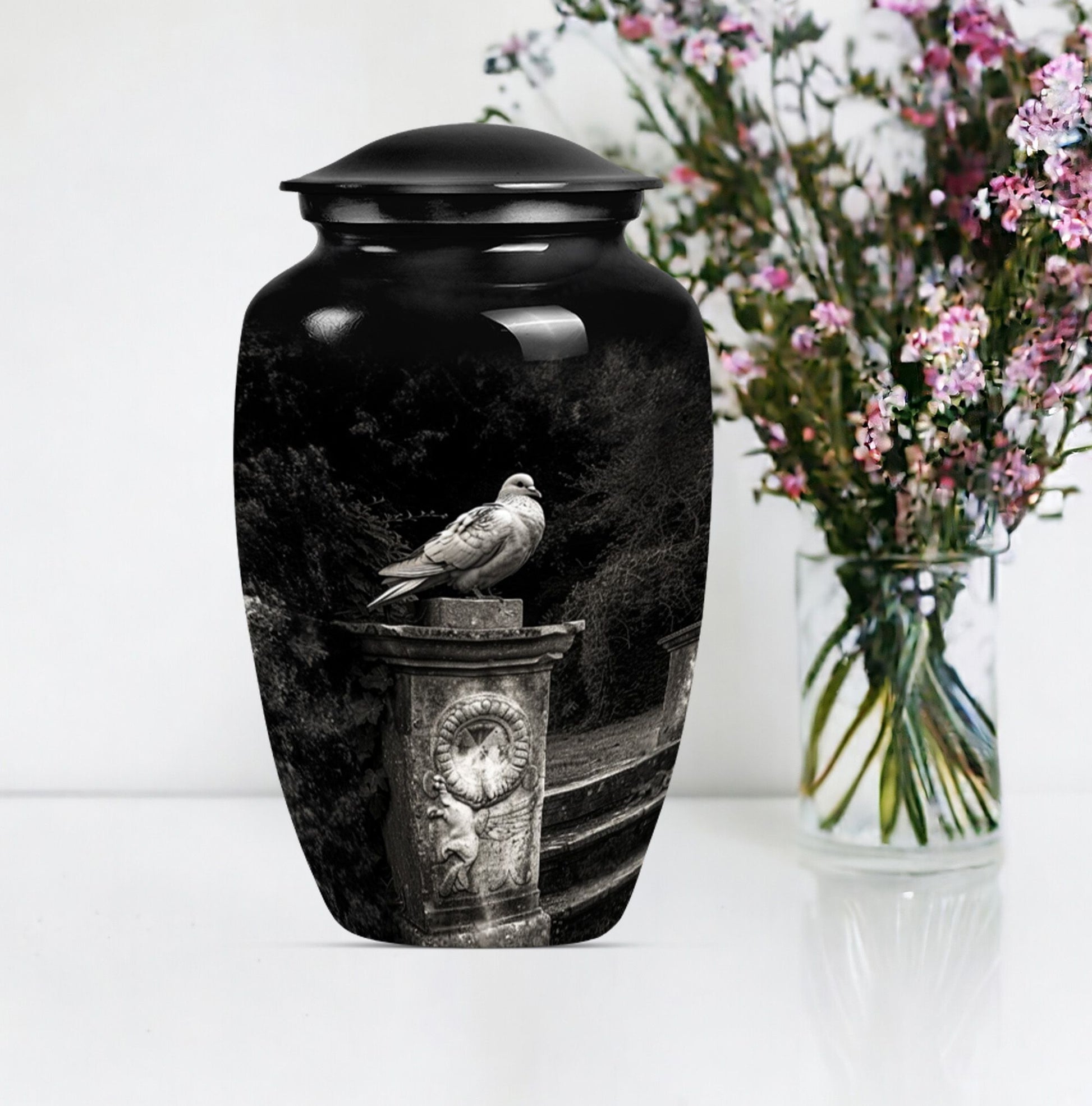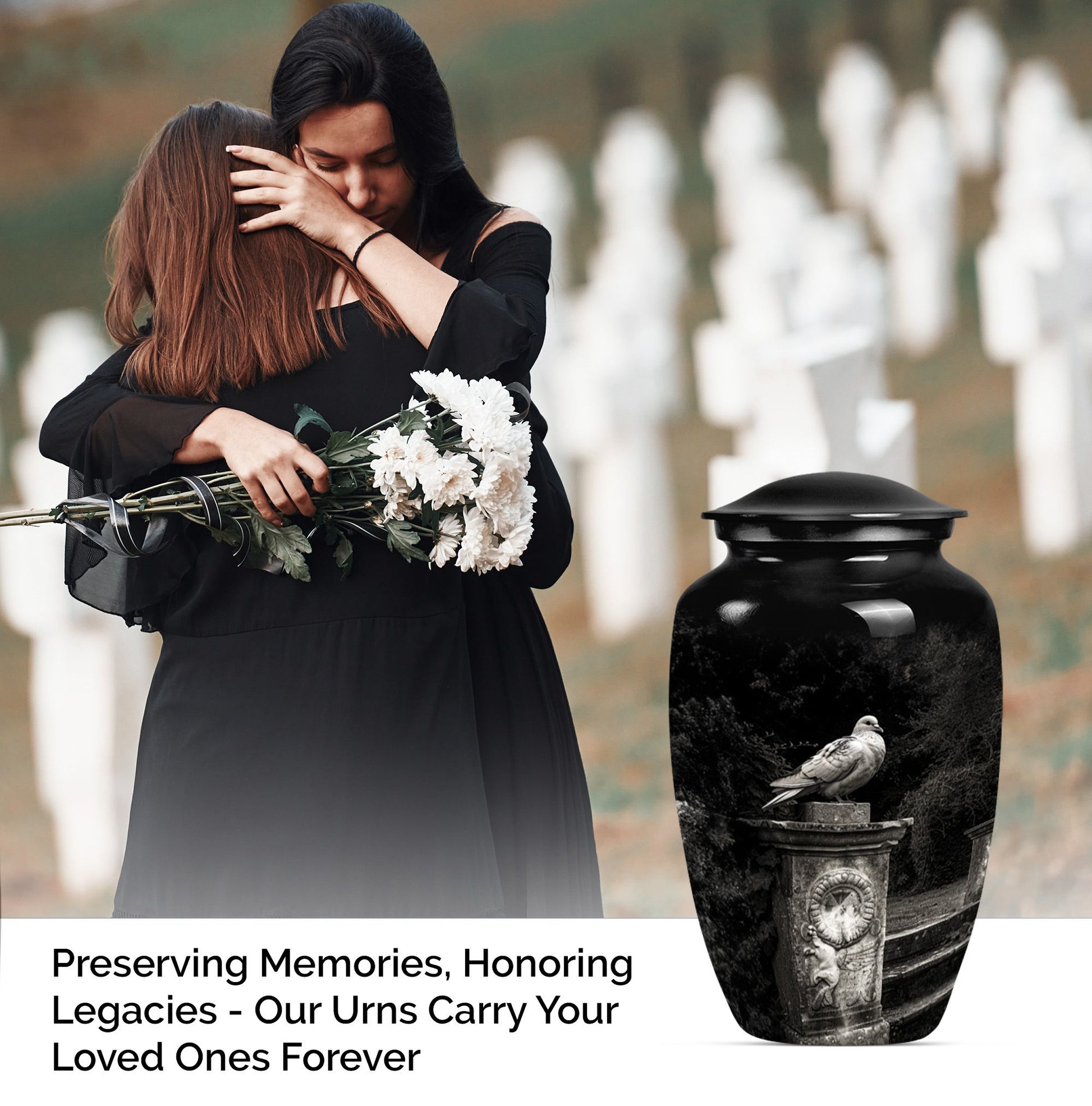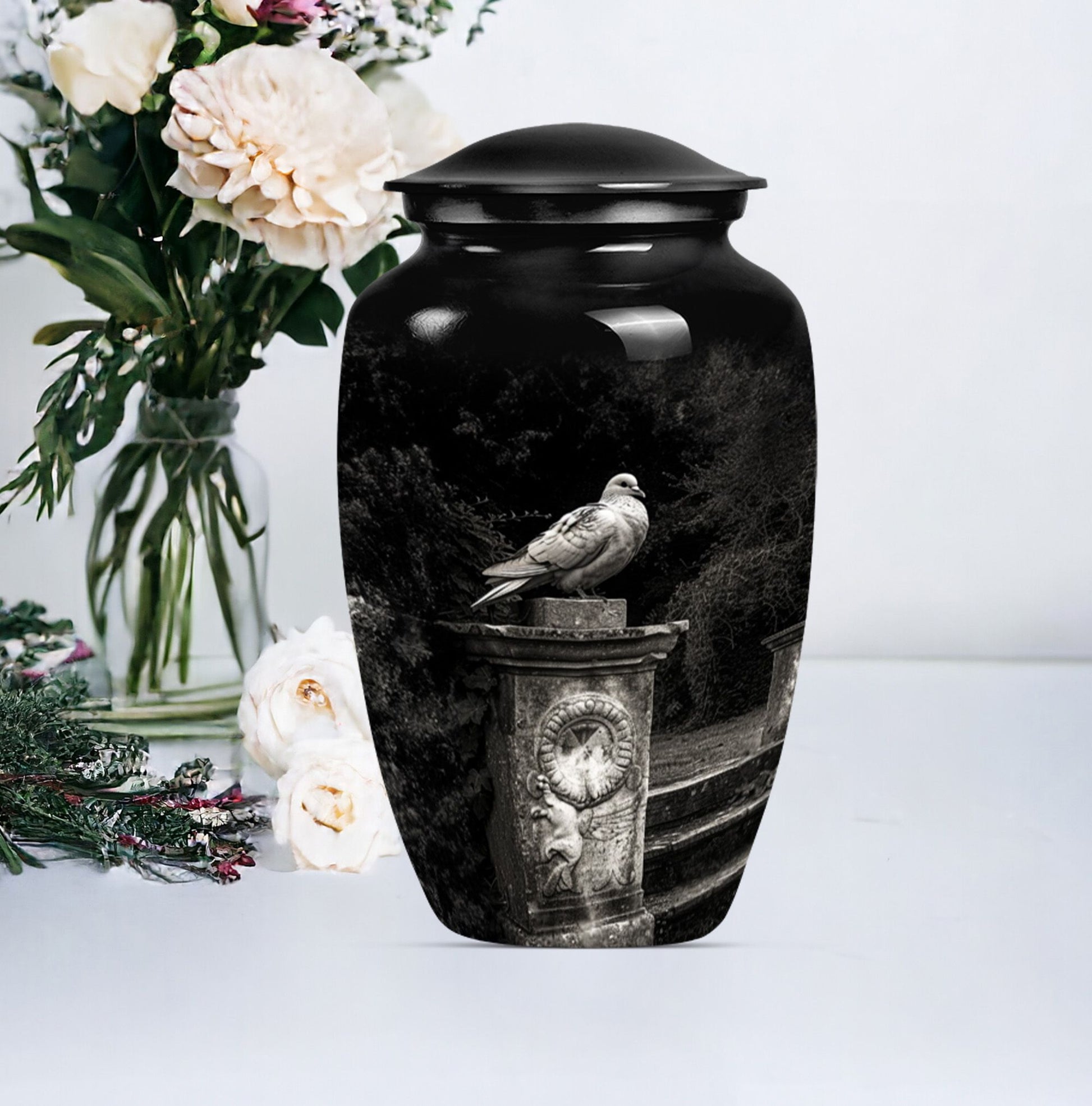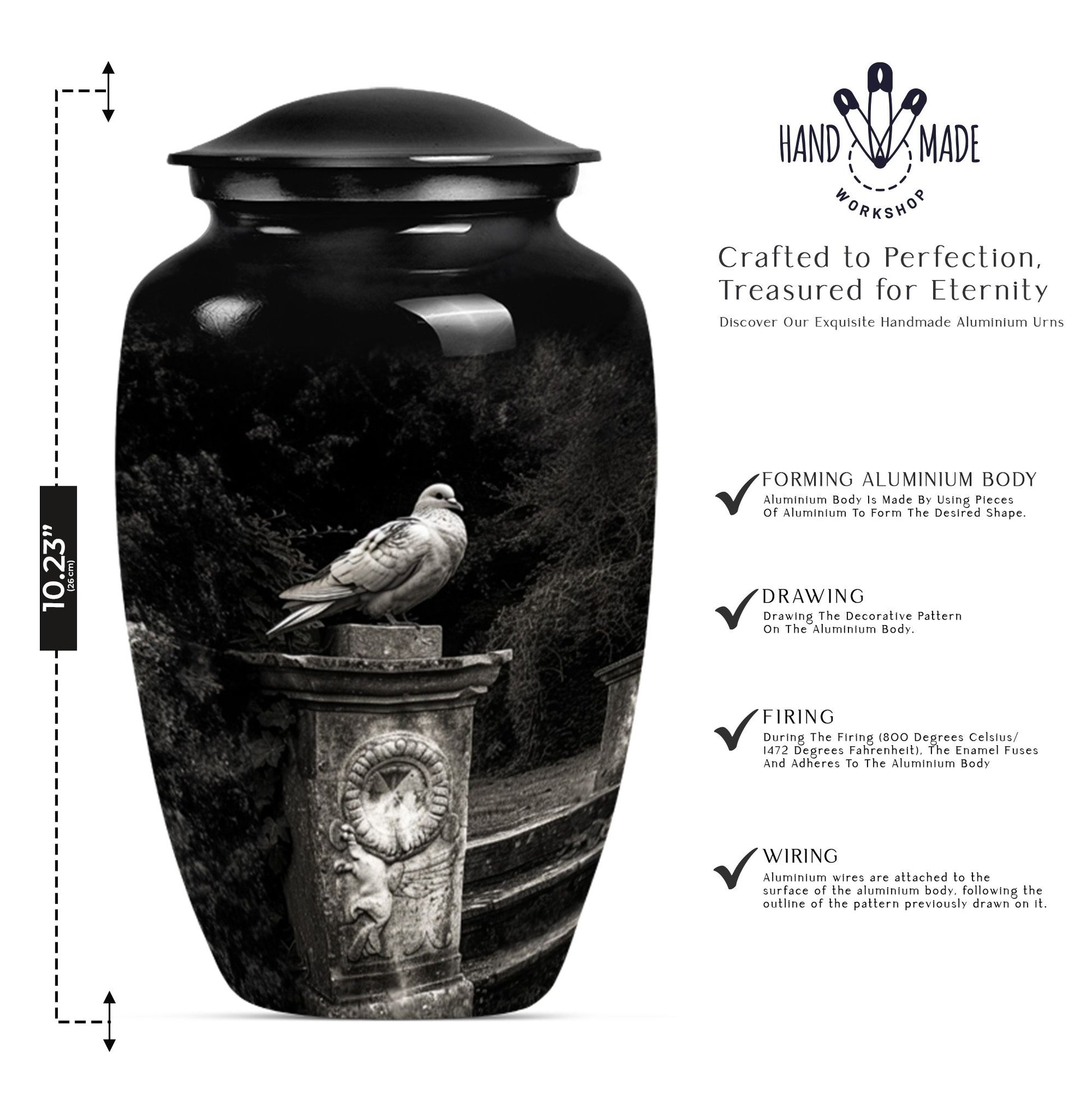 Enable peaceful rest for your beloved with our 10 Inch Dove Urn, a paramount pick from our range of large urns. Crafted meticulously from top-quality aluminium, this cremation urn presents an ethereal 'Purple Meadow' theme that radiates an air of serene tranquility. Balancing robustness and aesthetic charm, it weighs 3.3 pounds, a testament of its sturdy construction. With a capacity of 200 cubic inches, it offers sufficient containment for ashes, catering to diverse needs. Personalize this dove urn as you see fit. The package also includes a velvet pouch, providing a discreet and tasteful holder for the cremains. Ideal for mom or dad, this urn for human ashes features a cross design, signifying an eternal rest for your loved ones. It's a beautiful homage for those seeking memorial urns or burial urns that evoke love, loss, and remembrance with dignity and respect.