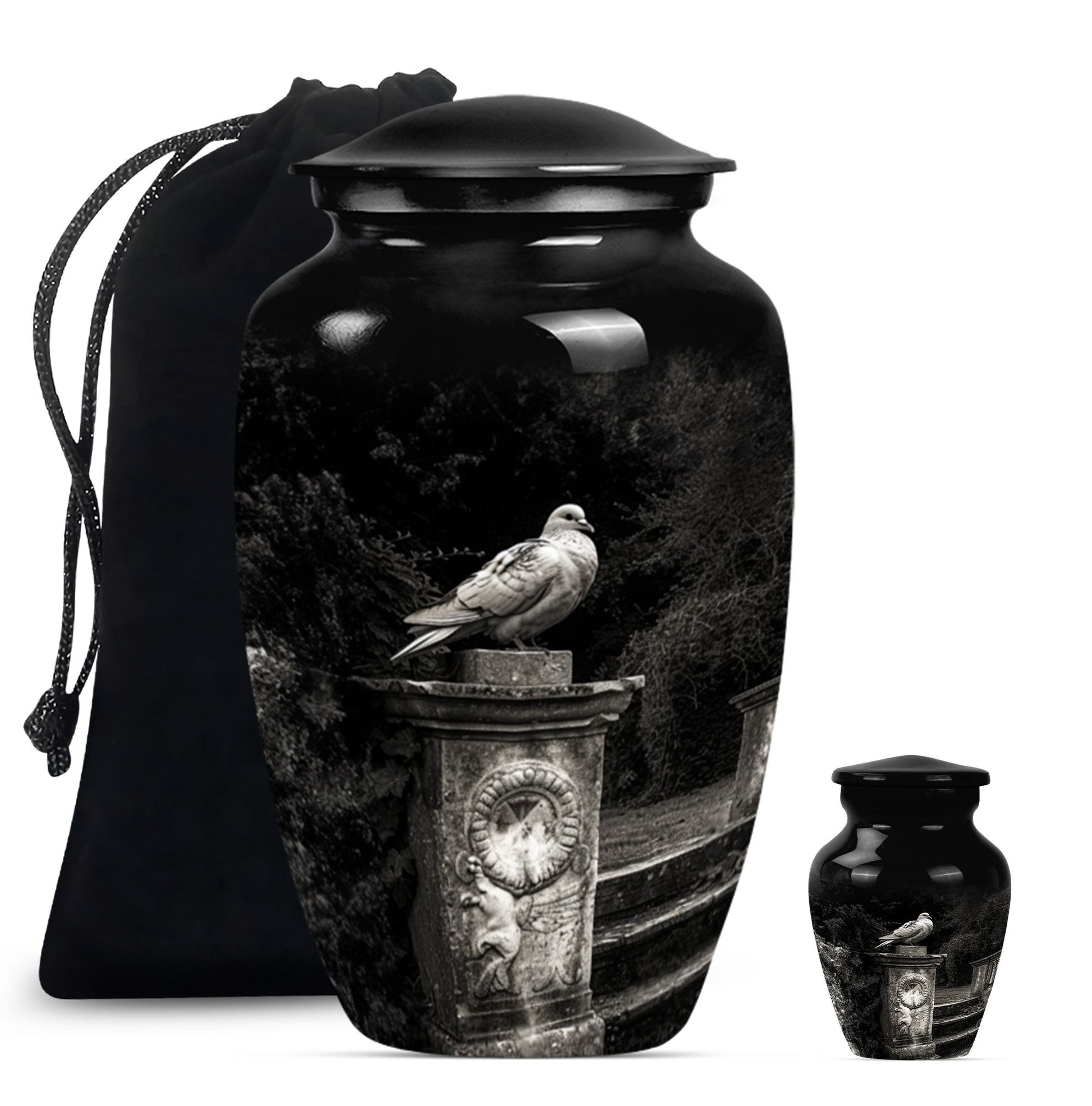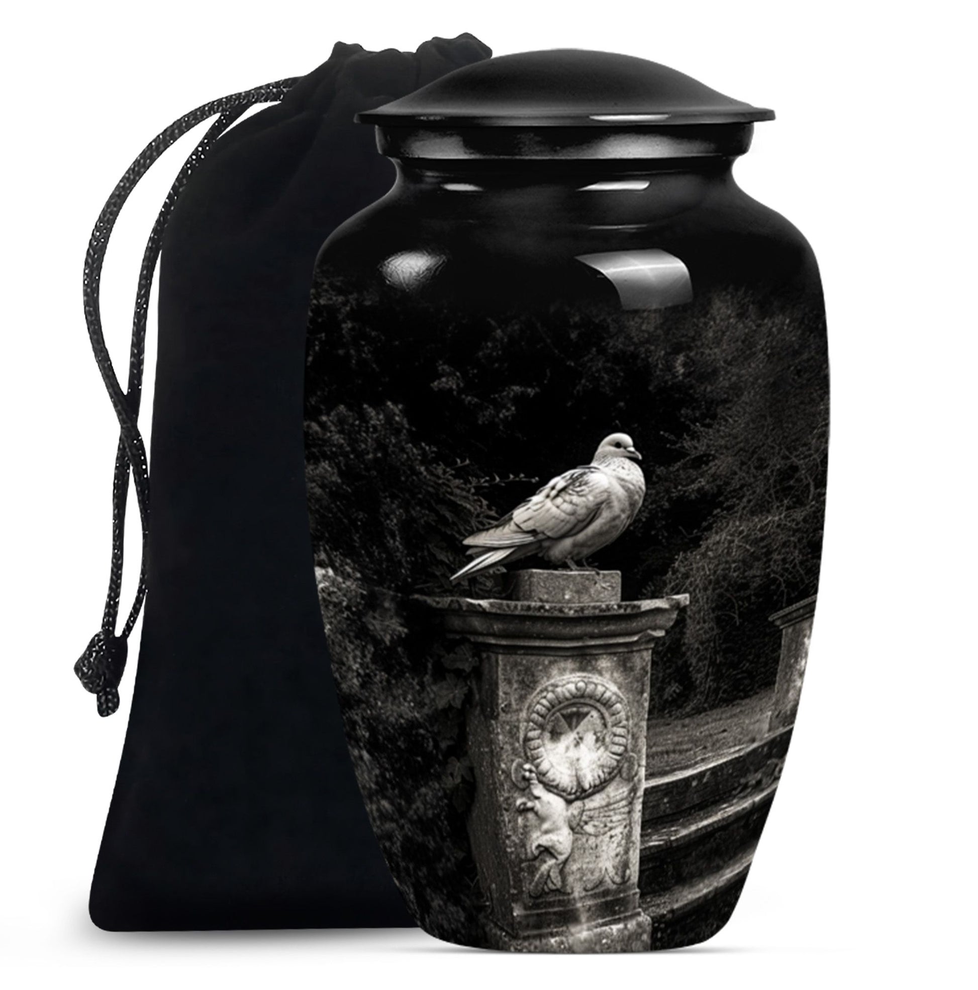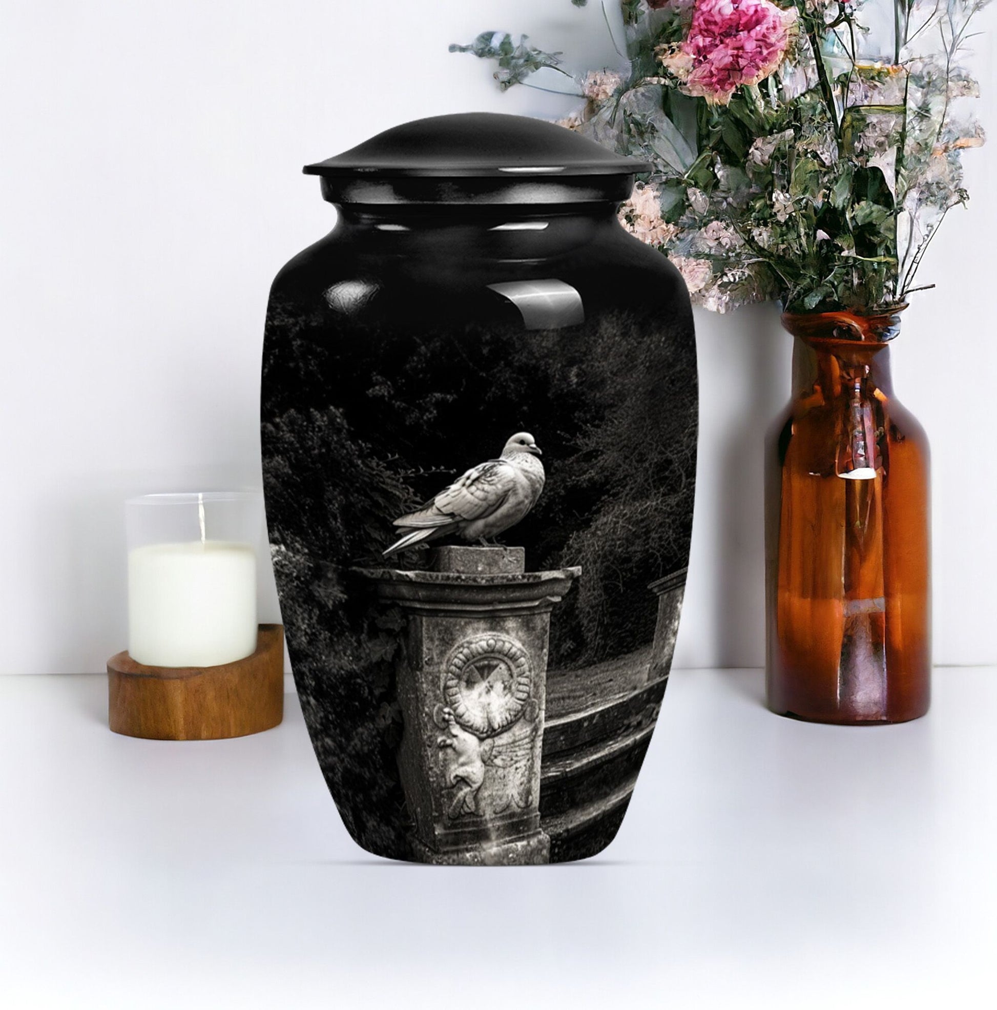 Enable peaceful rest for your beloved with our 10 Inch Dove Urn, a paramount pick from our range of large urns. Crafted meticulously from top-quality aluminium, this cremation urn presents an ethereal 'Purple Meadow' theme that radiates an air of serene tranquility. Balancing robustness and aesthetic charm, it weighs 3.3 pounds, a testament of its sturdy construction. With a capacity of 200 cubic inches, it offers sufficient containment for ashes, catering to diverse needs. Personalize this dove urn as you see fit. The package also includes a velvet pouch, providing a discreet and tasteful holder for the cremains. Ideal for mom or dad, this urn for human ashes features a cross design, signifying an eternal rest for your loved ones. It's a beautiful homage for those seeking memorial urns or burial urns that evoke love, loss, and remembrance with dignity and respect.
