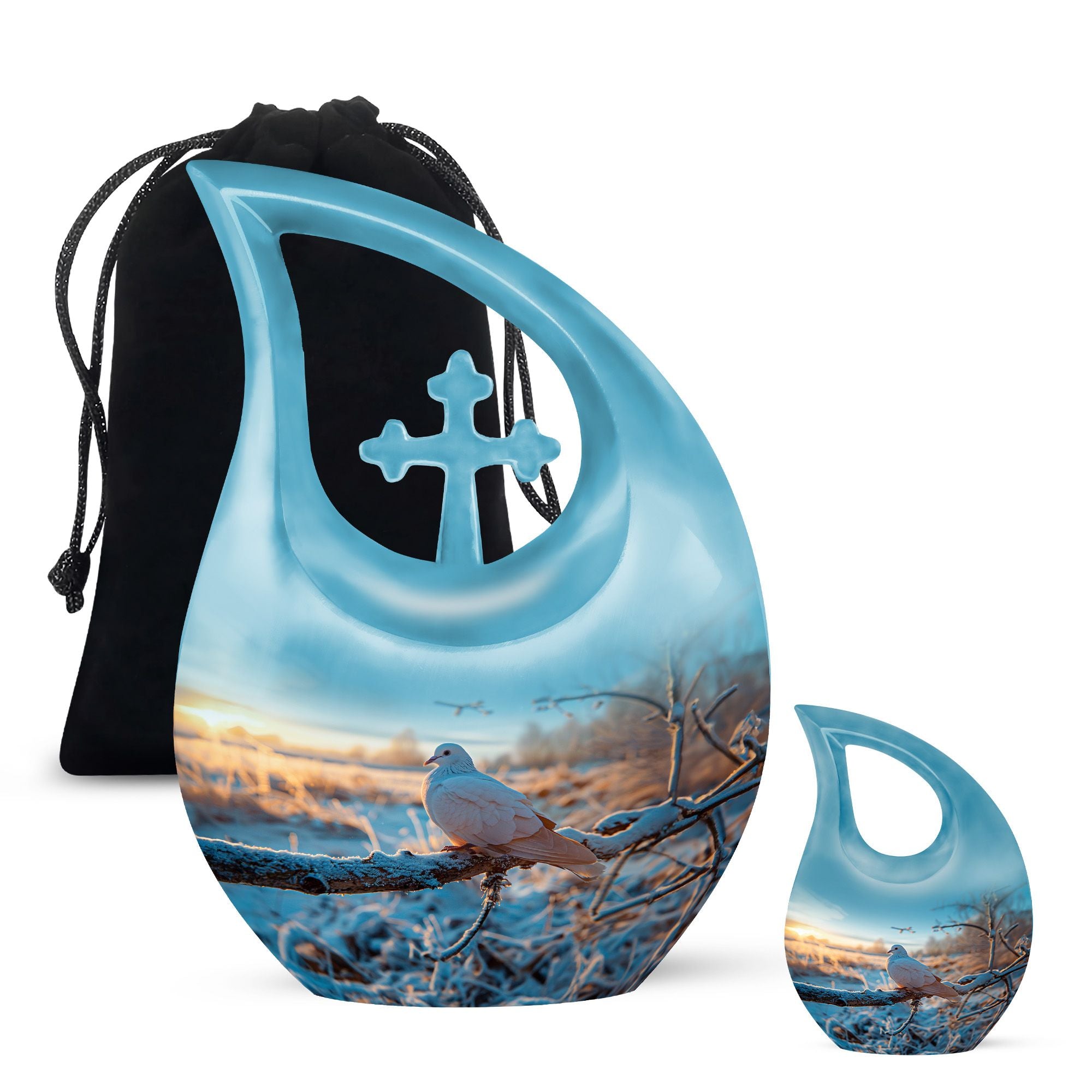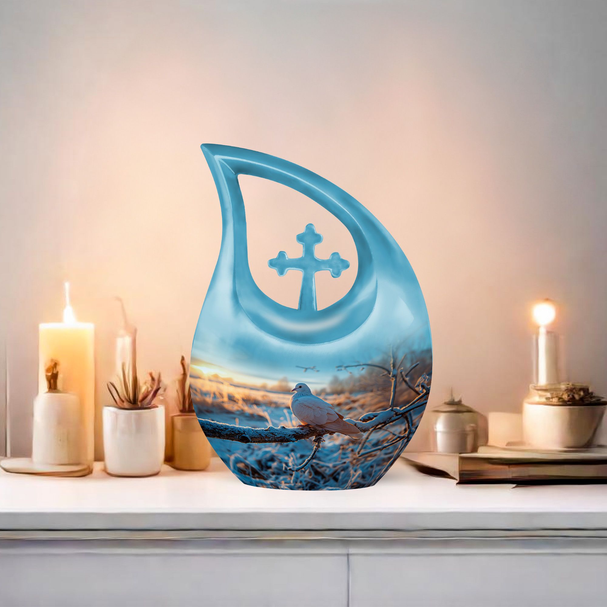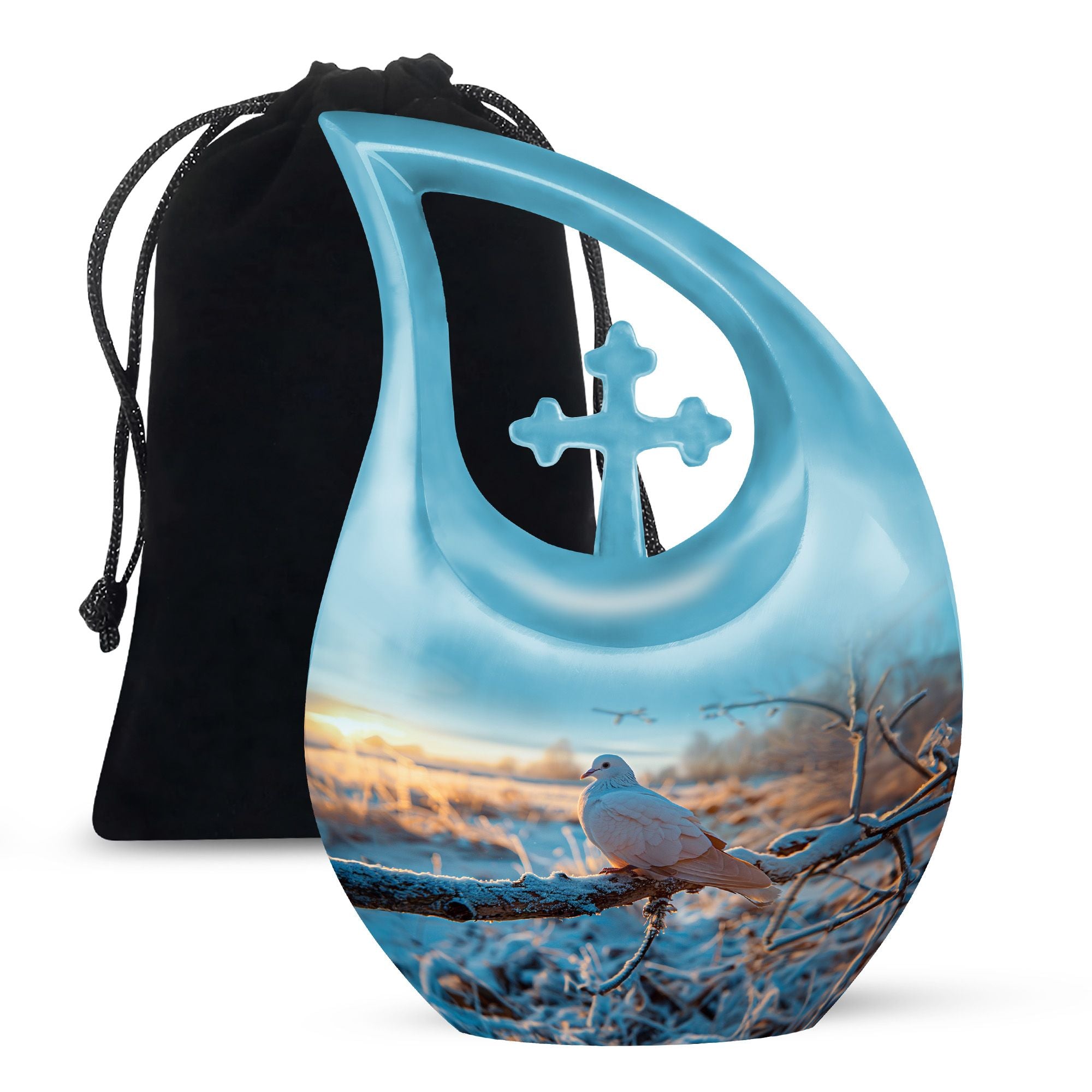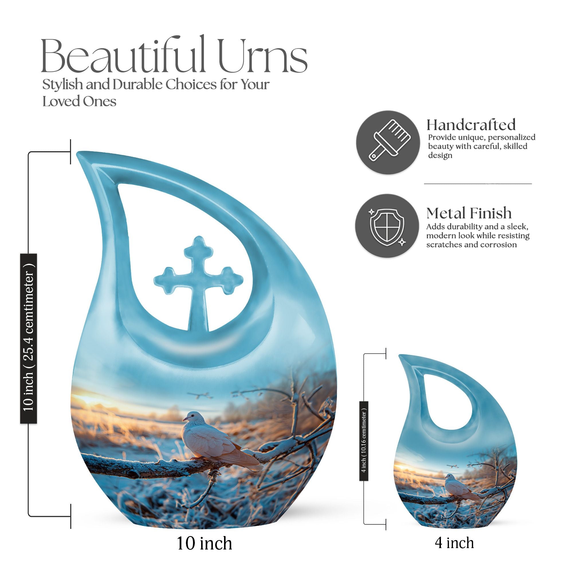 Commemorate your loved ones with this heartfelt Dove Urn, an essential part of Memorial Ceremony Supplies. A tangible symbol of love and memory, every detail of this Urn For Human Ashes speaks to its craftsmanship. Expertly fashioned from robust and beautiful Aluminium, this 10-Inch Large Urn stands as a testament to the dignity and respect we bestow upon our cherished ones. The exquisite Cross Drop theme gives the urn an air of spiritual serenity that smoothly aligns with the Dove, a universal symbol of peace. The urn has a capacity of up to 200 cubic inches, making it ideal for most adult ashes. Weighing a solid 3.3 pounds and with dimensions locked at an ideal 10 inches in height, this urn possesses the perfect balance between visual appeal and practical storage. The package also comes with a velvet pouch, which provides a dignified containment of the ashes. Add a touch of personal sentiment with the option to personalize the urn with engraved names, making each urn a unique keepsake. This urn can also be found under search terms such as Pink Urns For Human Ashes, Urn For Mom, Butterfly Urns For Ashes and Angel Urn. This describes the sense of sacred beauty and tranquility this urn brings to any memorial ceremony.