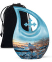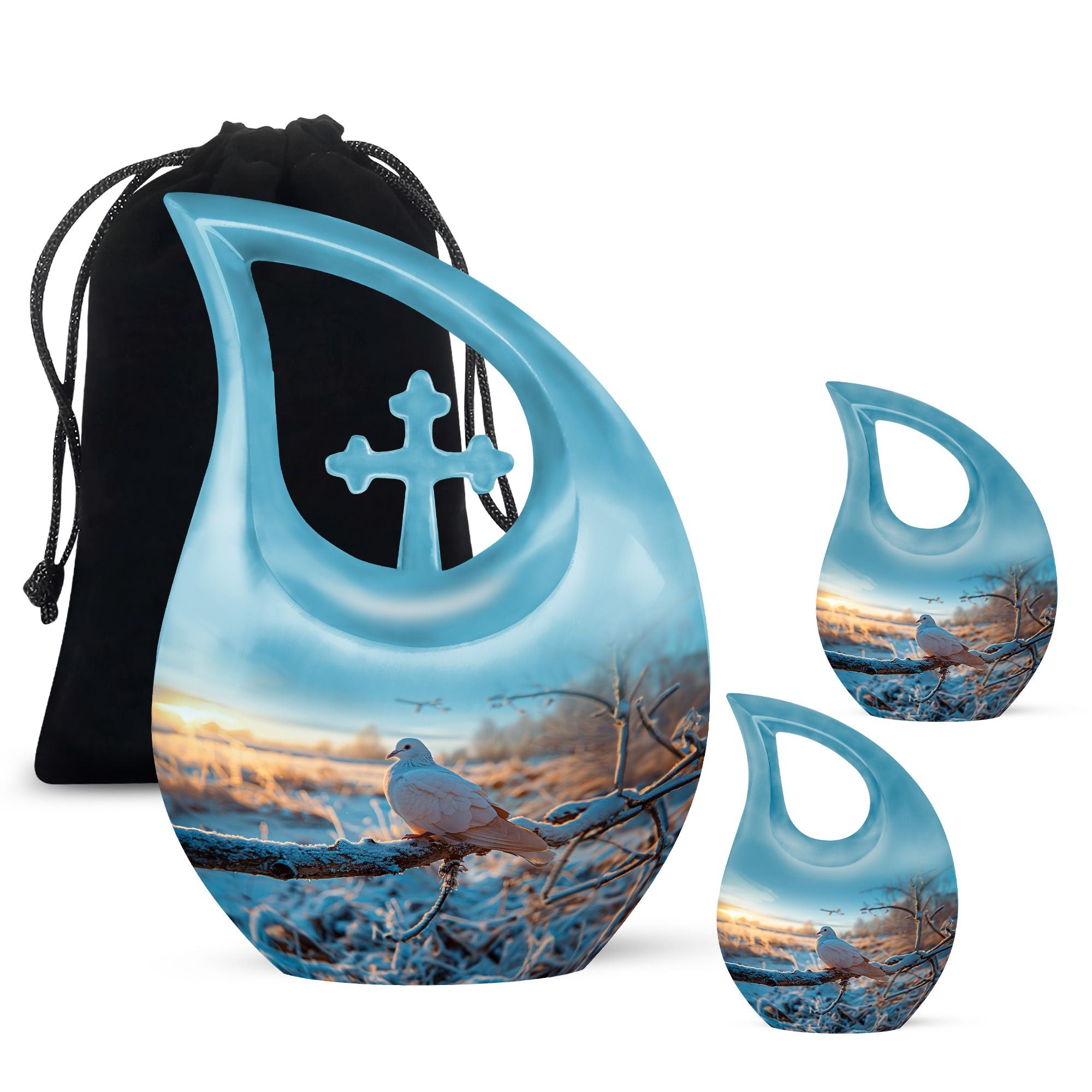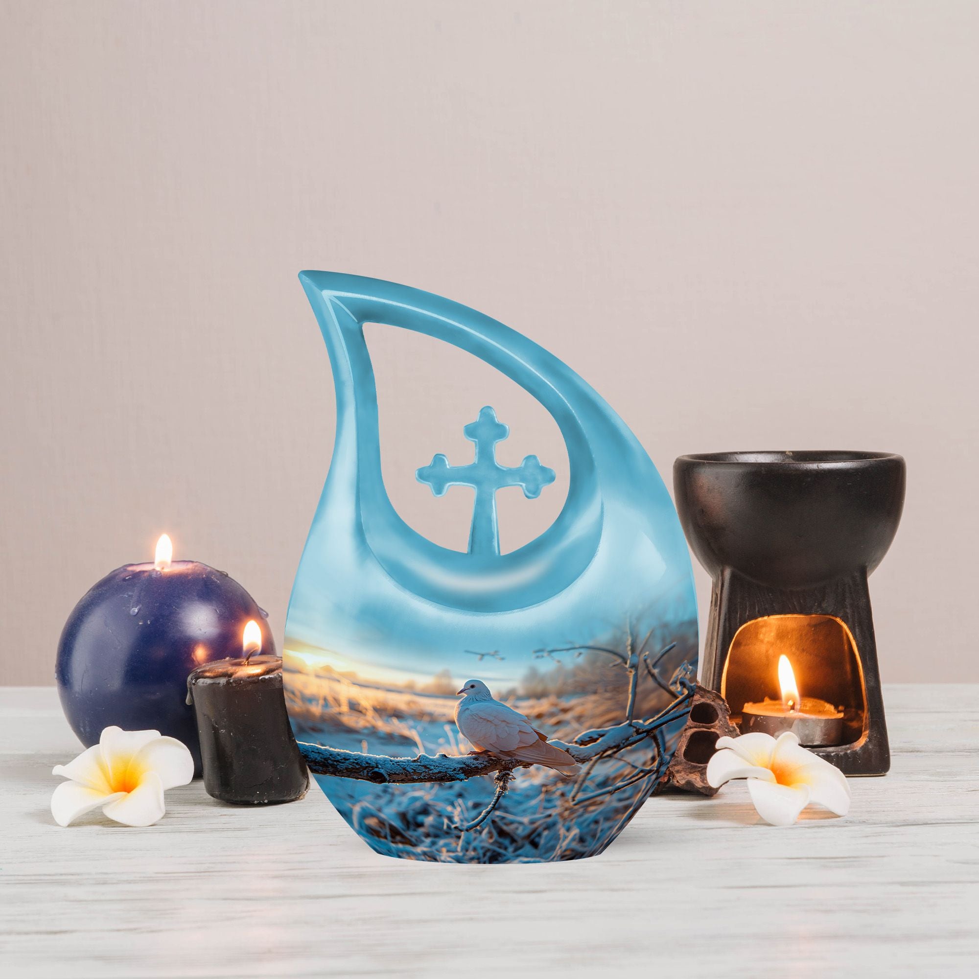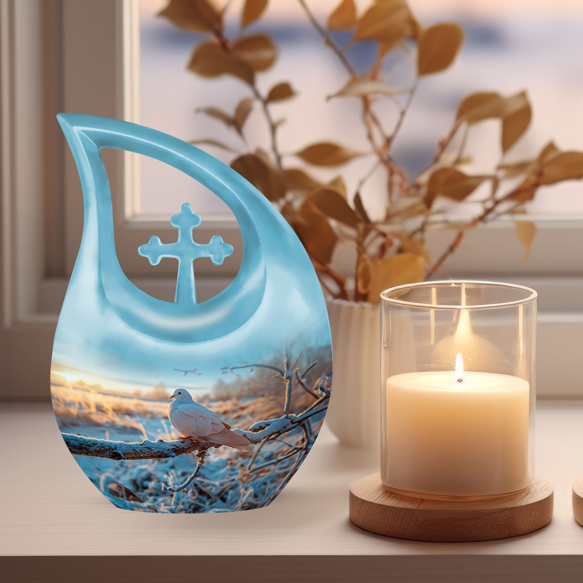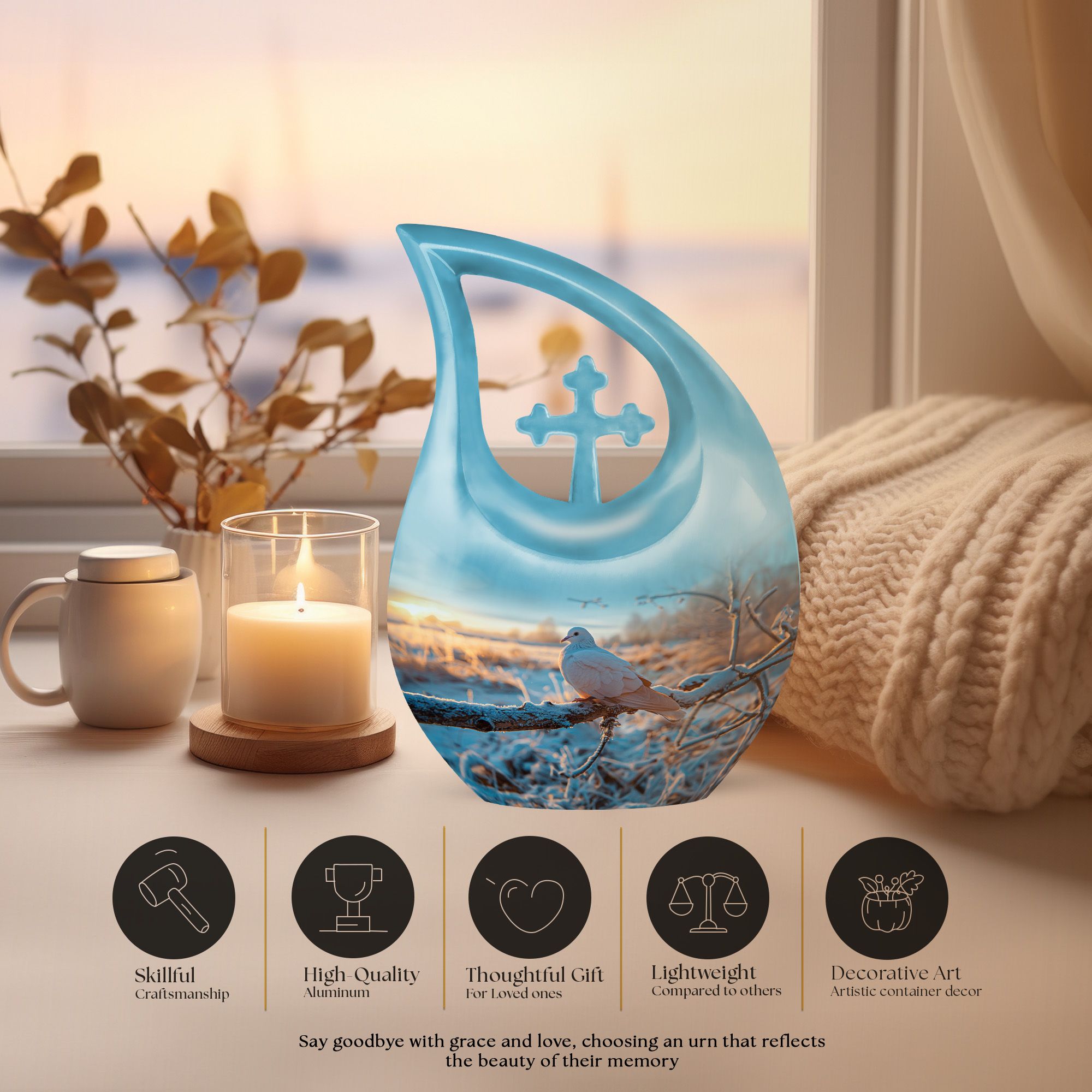 Commemorate your loved ones with this heartfelt Dove Urn, an essential part of Memorial Ceremony Supplies. A tangible symbol of love and memory, every detail of this Urn For Human Ashes speaks to its craftsmanship. Expertly fashioned from robust and beautiful Aluminium, this 10-Inch Large Urn stands as a testament to the dignity and respect we bestow upon our cherished ones. The exquisite Cross Drop theme gives the urn an air of spiritual serenity that smoothly aligns with the Dove, a universal symbol of peace. The urn has a capacity of up to 200 cubic inches, making it ideal for most adult ashes. Weighing a solid 3.3 pounds and with dimensions locked at an ideal 10 inches in height, this urn possesses the perfect balance between visual appeal and practical storage. The package also comes with a velvet pouch, which provides a dignified containment of the ashes. Add a touch of personal sentiment with the option to personalize the urn with engraved names, making each urn a unique keepsake. This urn can also be found under search terms such as Pink Urns For Human Ashes, Urn For Mom, Butterfly Urns For Ashes and Angel Urn. This describes the sense of sacred beauty and tranquility this urn brings to any memorial ceremony.