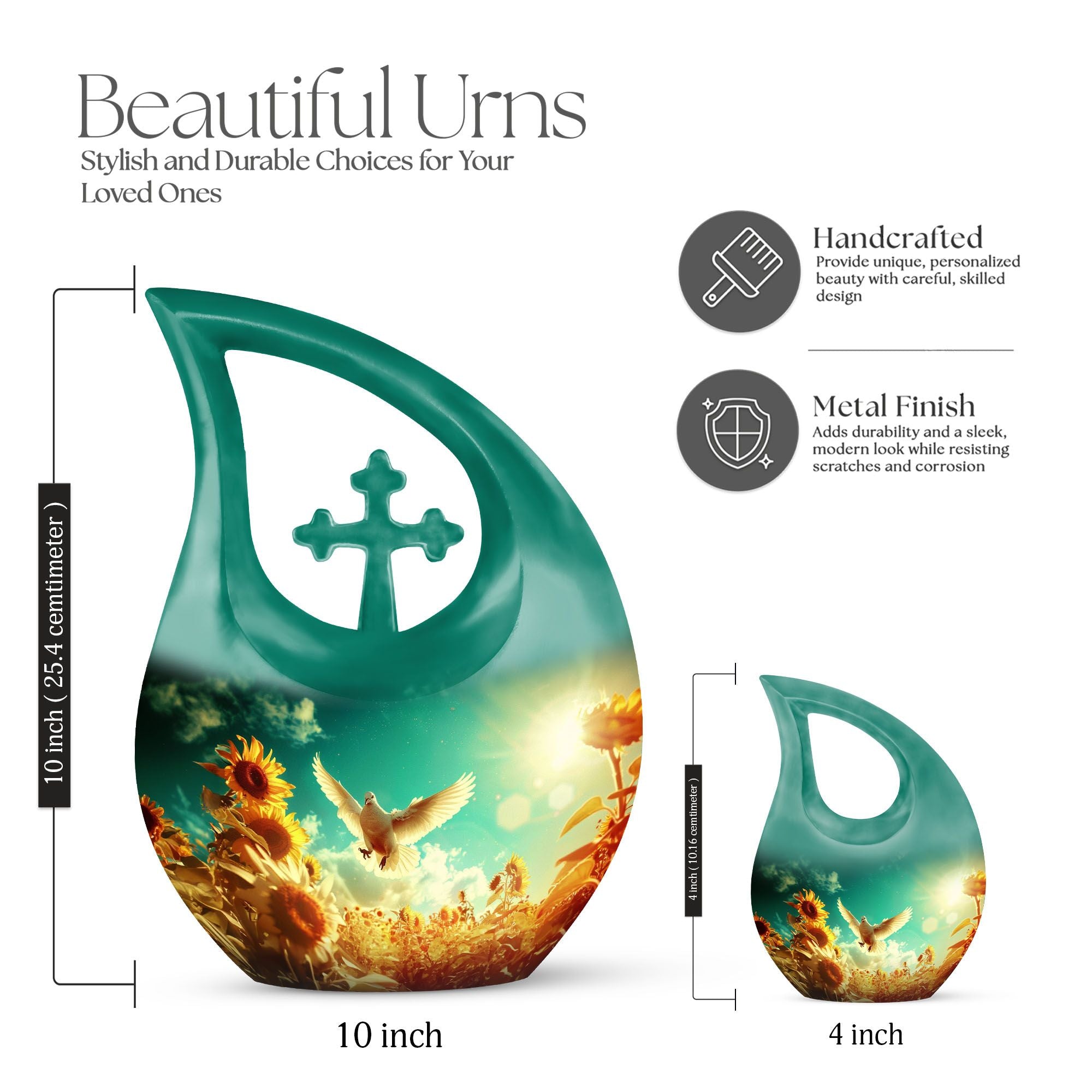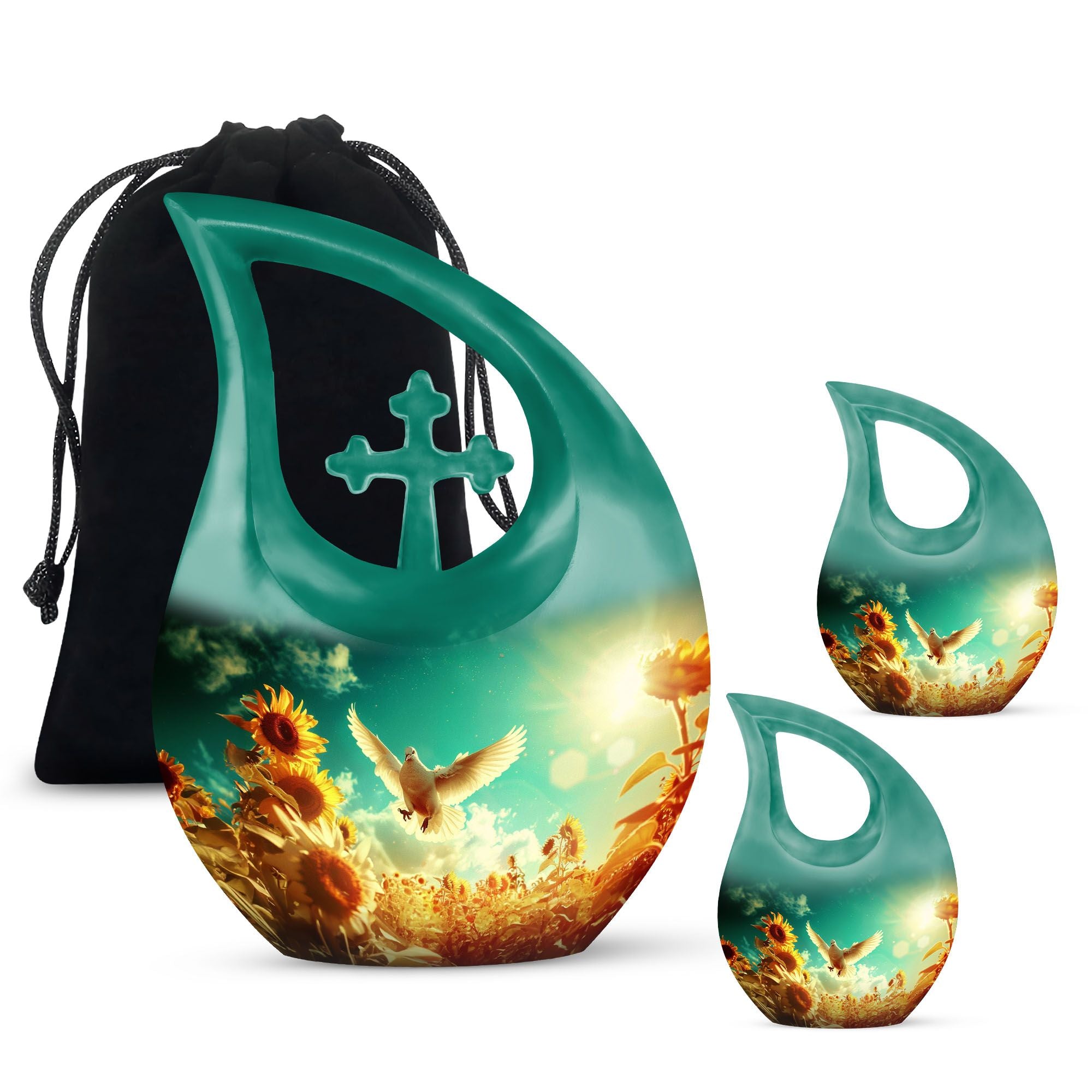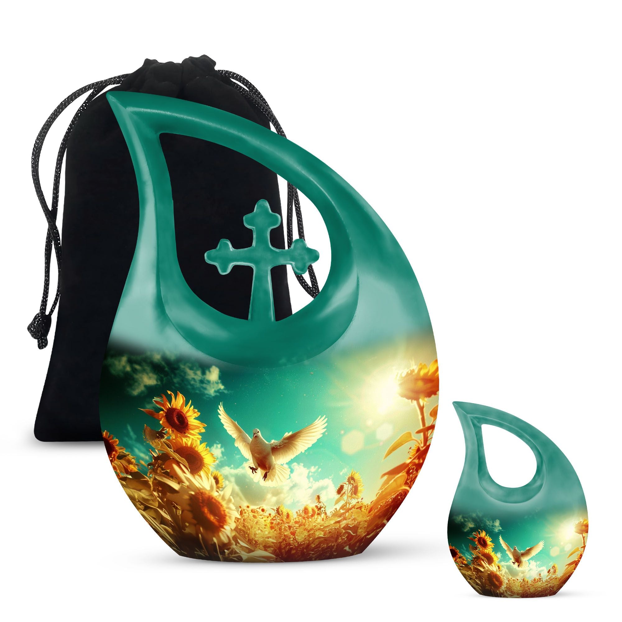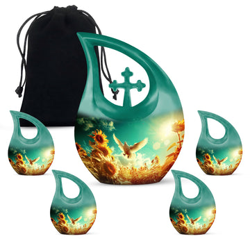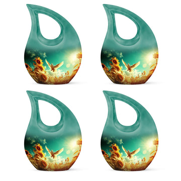 Expertly handcrafted from durable aluminum, this sunflower cremation ashes urn features a luminous white finish accented with soft gold tones. The dove and sunflower design bring harmony and light, representing life’s renewal and faith. Its secure screw-top lid ensures the ashes are safely preserved. Suitable as adult urns women, men urns for human ashes, or urns for human ashes adult female, it’s ideal for home memorials, burials, or display.