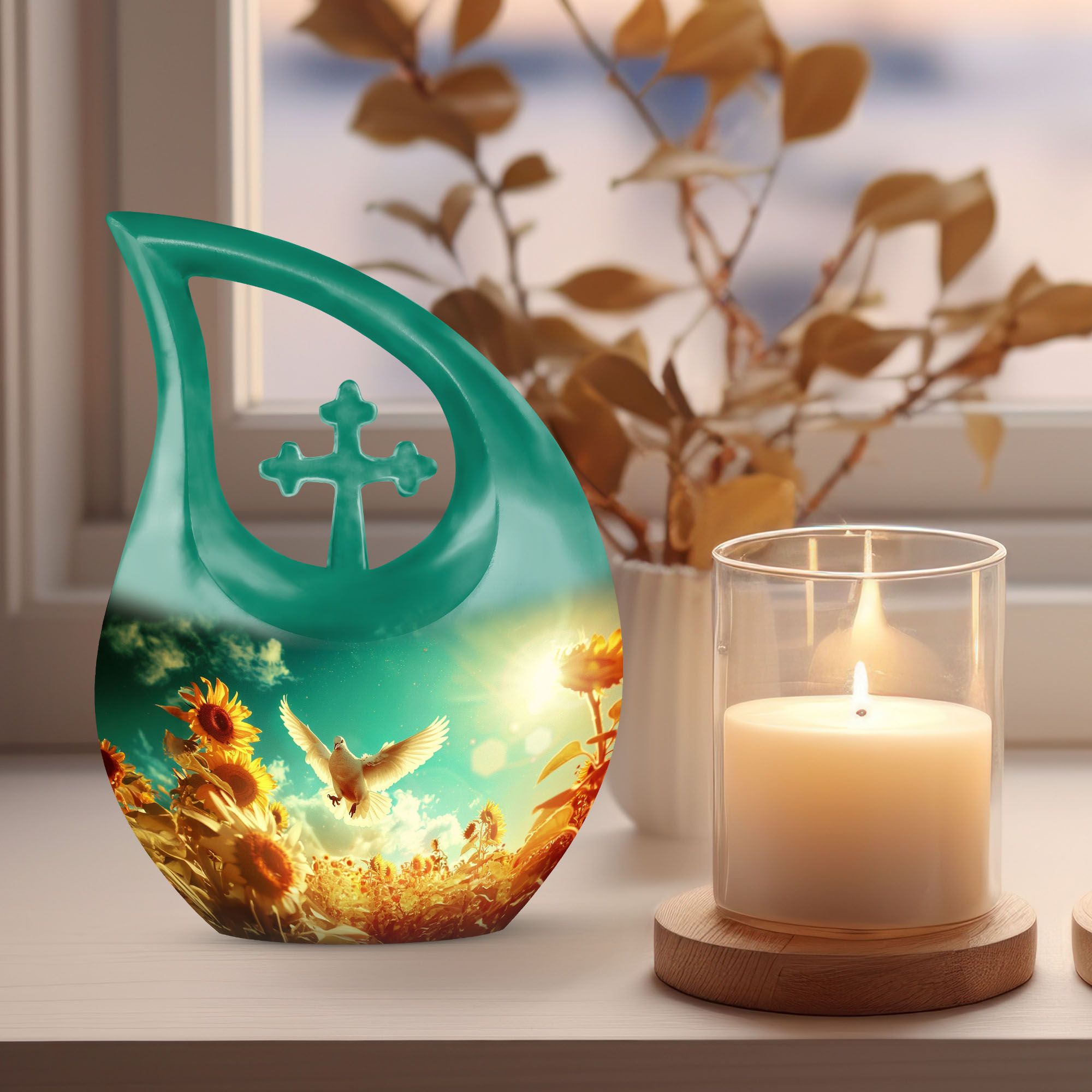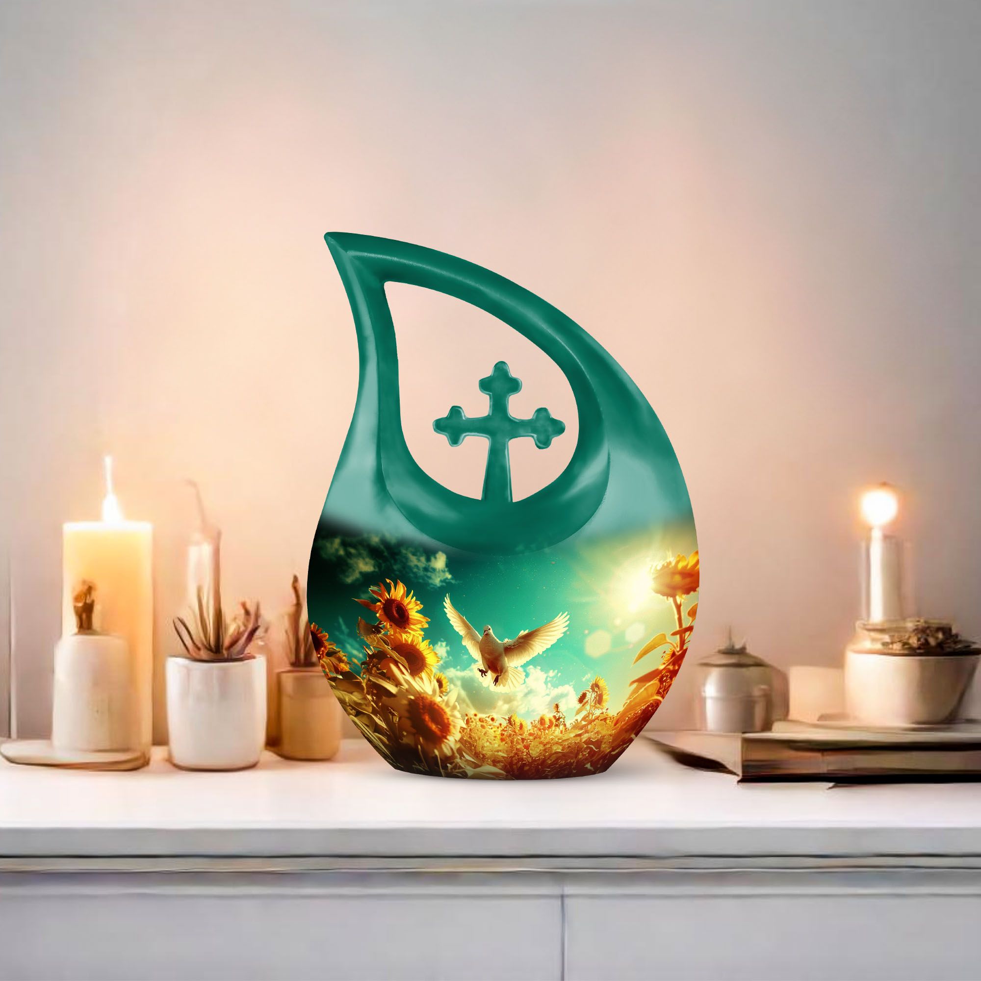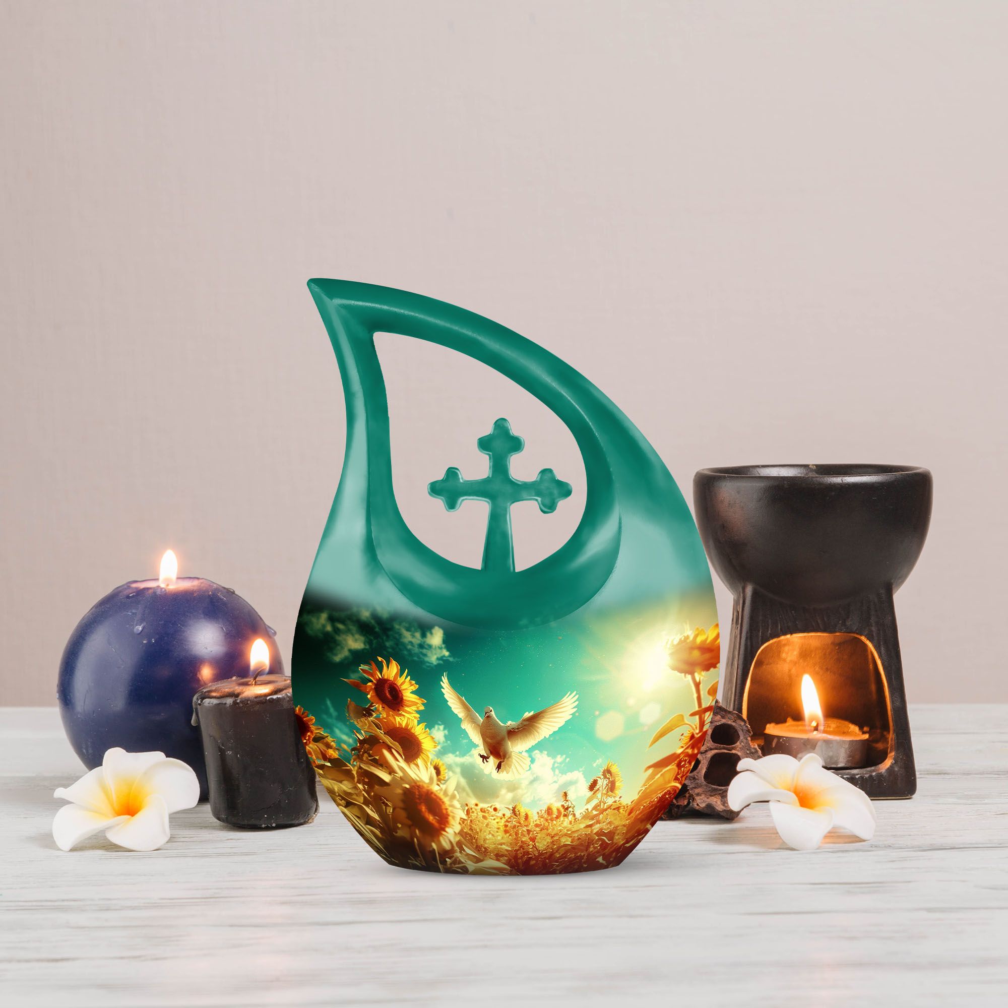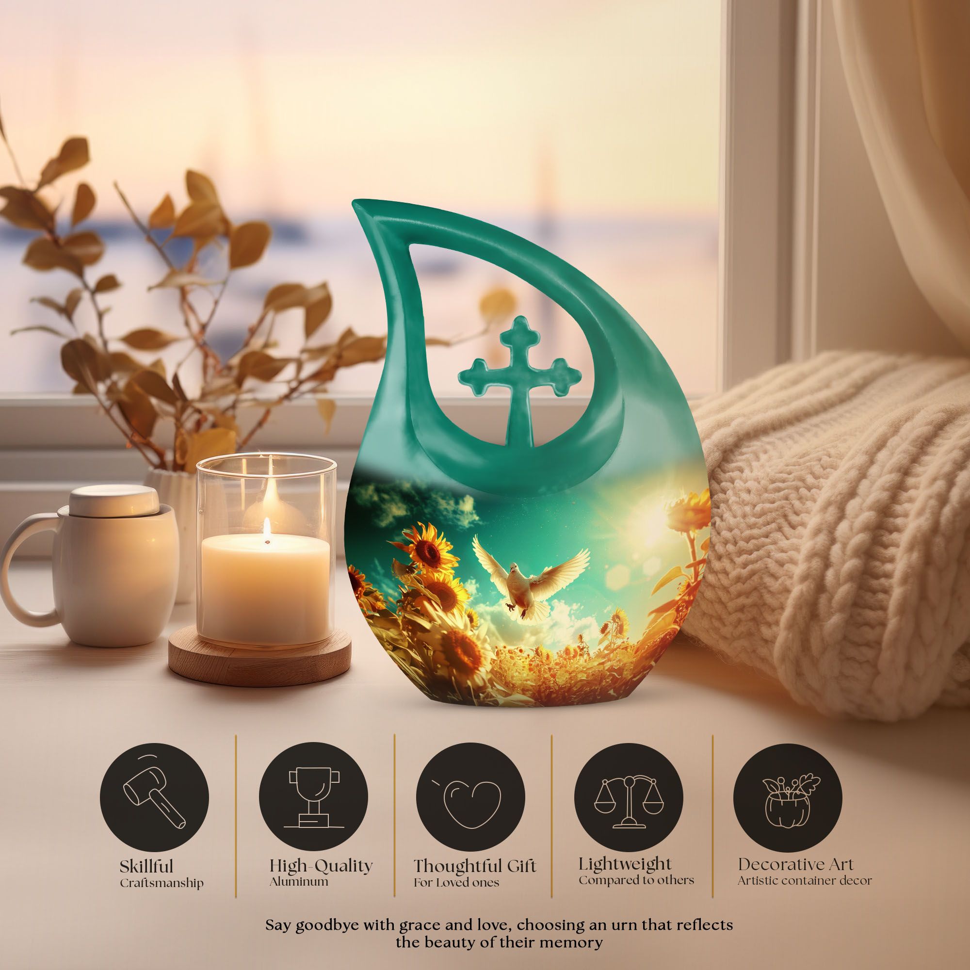 Expertly handcrafted from durable aluminum, this sunflower cremation ashes urn features a luminous white finish accented with soft gold tones. The dove and sunflower design bring harmony and light, representing life’s renewal and faith. Its secure screw-top lid ensures the ashes are safely preserved. Suitable as adult urns women, men urns for human ashes, or urns for human ashes adult female, it’s ideal for home memorials, burials, or display.