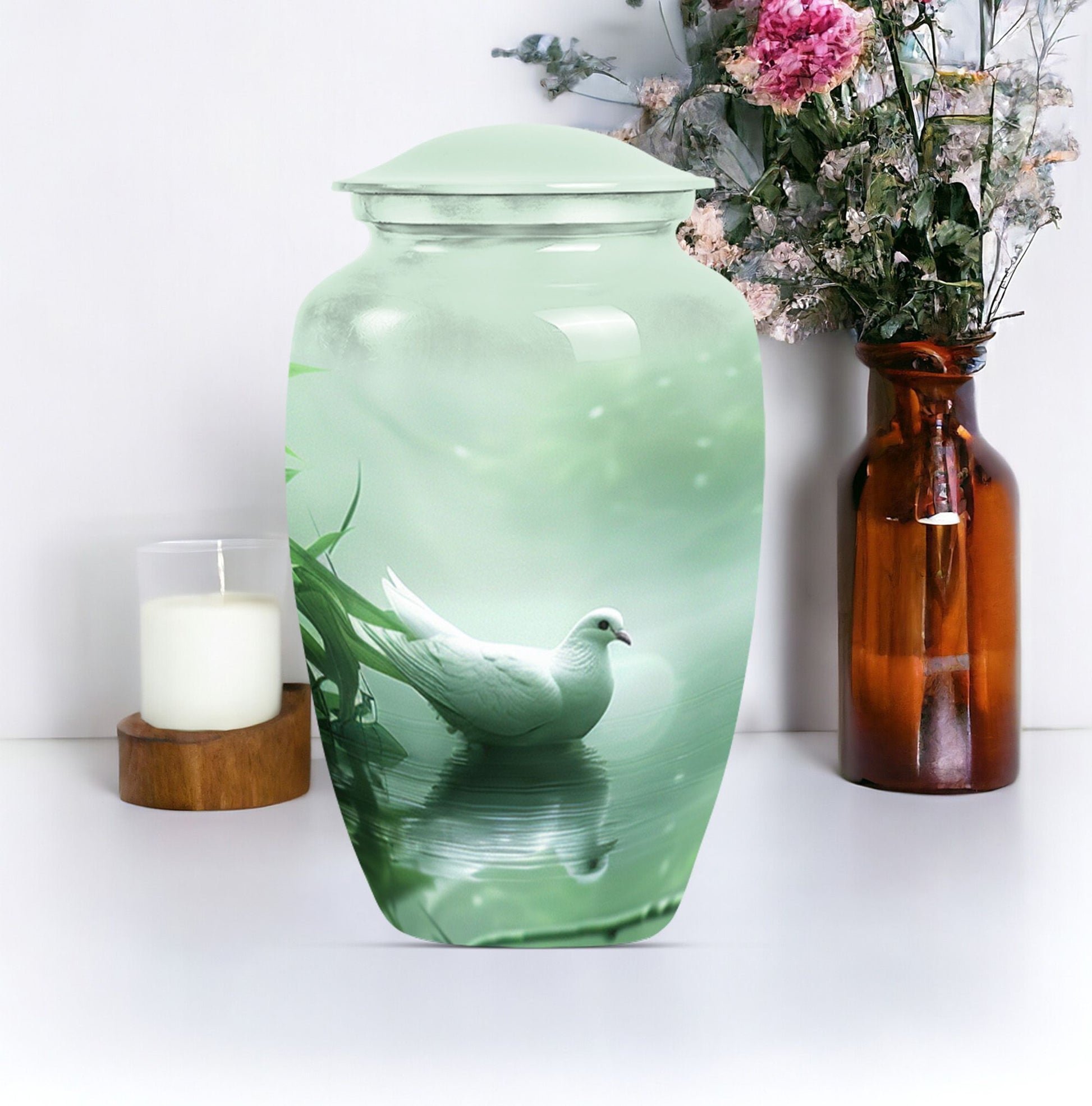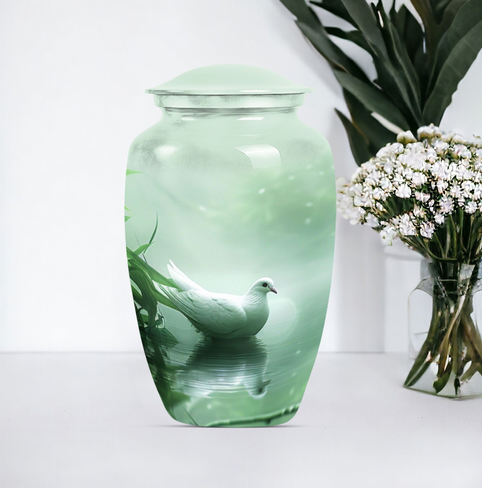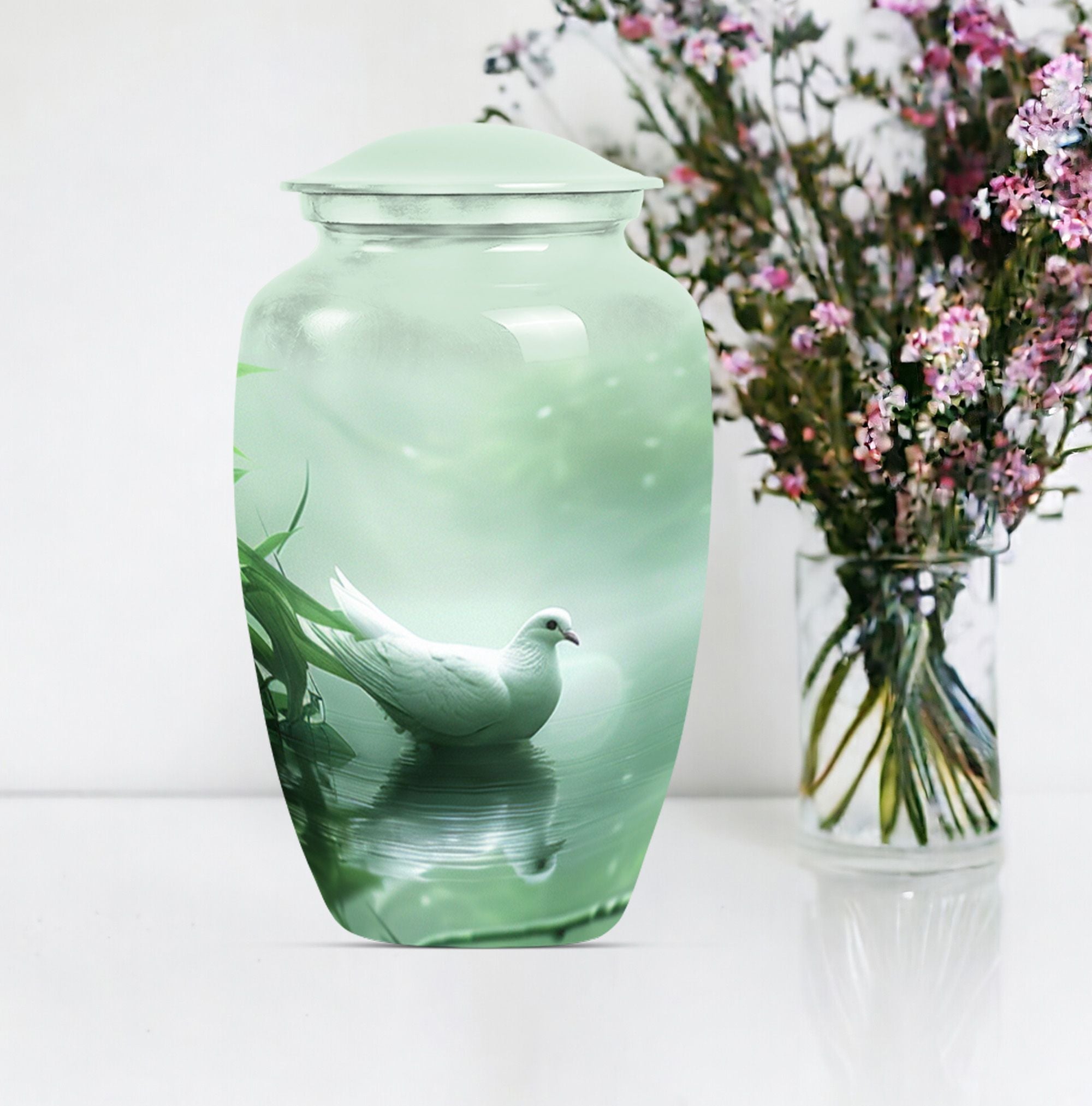 Experience a touch of serene solace while honoring a beloved soul with our meticulously crafted 'Dove Urn'. Made from high-quality Aluminium, this exquisite 10-inch urn for human ashes offers an impressive weight of 3.3 pounds and can gracefully contain up to a capacity of 200 cubic inches. The theme, 'Purple Meadow' wraps the urn in an aura of tranquil beauty, making it a notable selection among large urns category. Complimenting its aesthetic appeal, the urn also extends convenience with its package contents including a soft velvet pouch for containment of ashes. The urn has room for personalization. You can engrave the names as a loving tribute. This unique 'Dove Urn' serves as an elegant keepsake for honoring life while keeping the memory of your loved ones vibrant. A find among funeral urns for adults, the Dove Urn speaks of grace, tranquillity and remembrance.