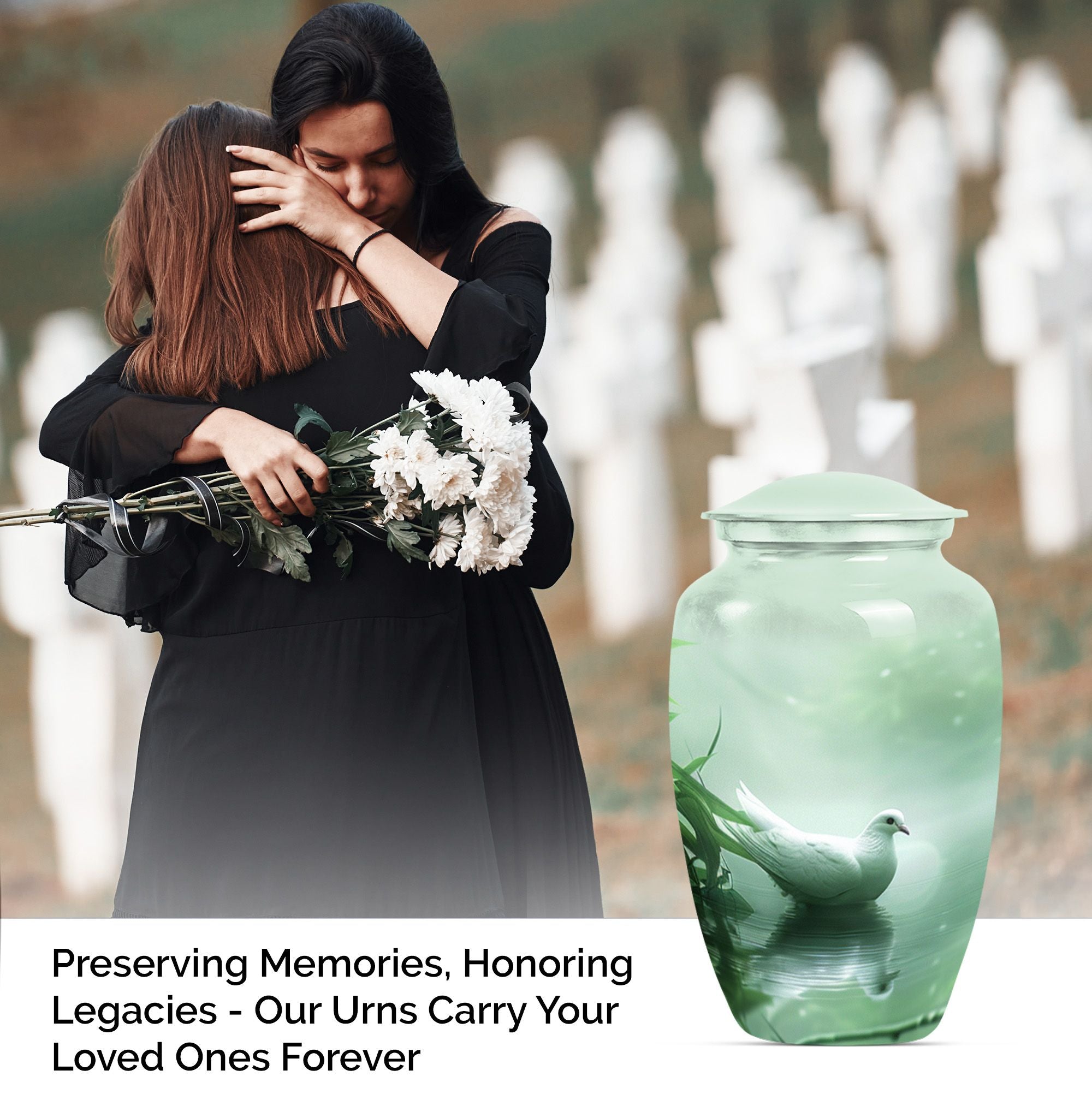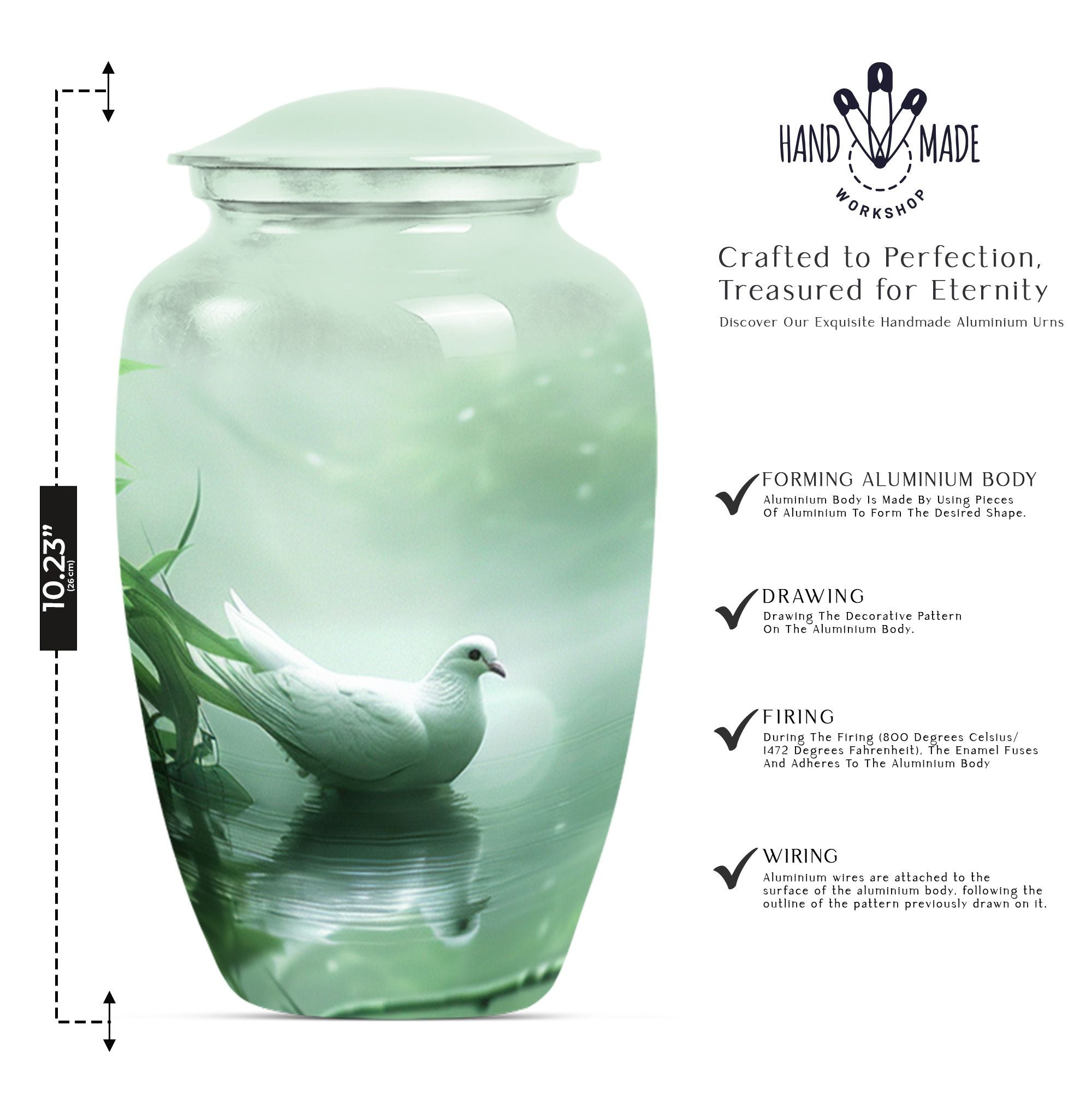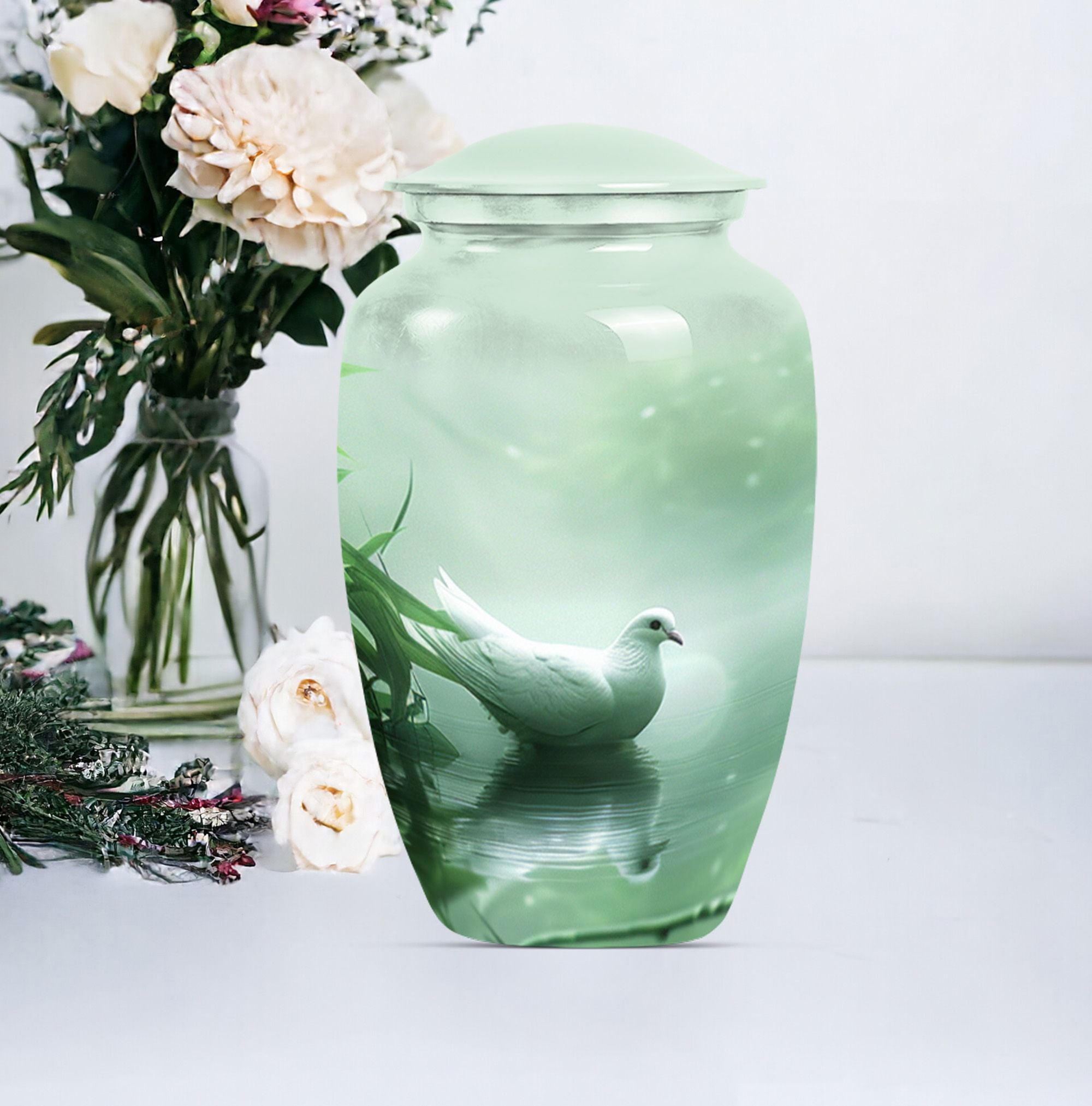 Experience a touch of serene solace while honoring a beloved soul with our meticulously crafted 'Dove Urn'. Made from high-quality Aluminium, this exquisite 10-inch urn for human ashes offers an impressive weight of 3.3 pounds and can gracefully contain up to a capacity of 200 cubic inches. The theme, 'Purple Meadow' wraps the urn in an aura of tranquil beauty, making it a notable selection among large urns category. Complimenting its aesthetic appeal, the urn also extends convenience with its package contents including a soft velvet pouch for containment of ashes. The urn has room for personalization. You can engrave the names as a loving tribute. This unique 'Dove Urn' serves as an elegant keepsake for honoring life while keeping the memory of your loved ones vibrant. A find among funeral urns for adults, the Dove Urn speaks of grace, tranquillity and remembrance.