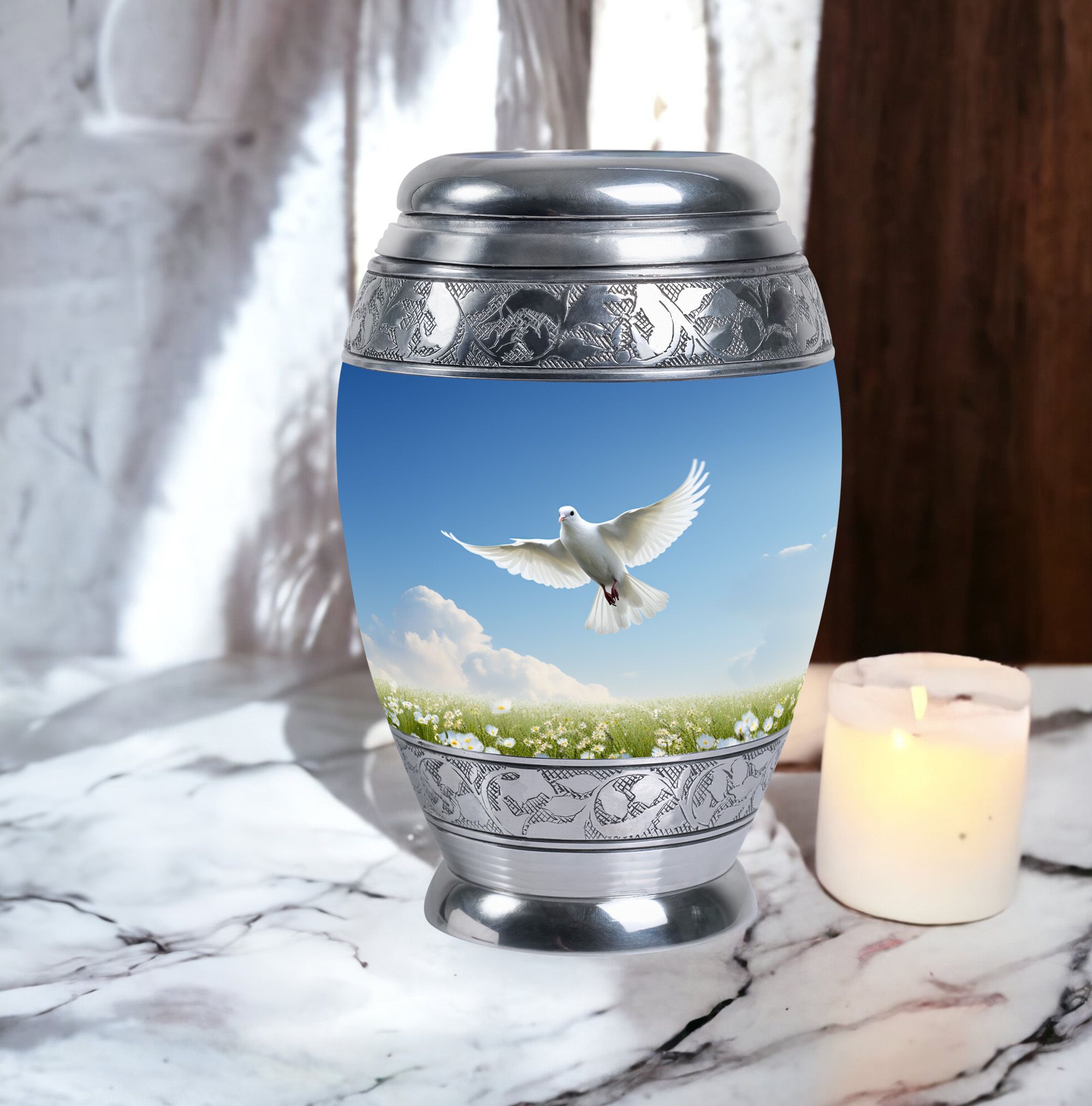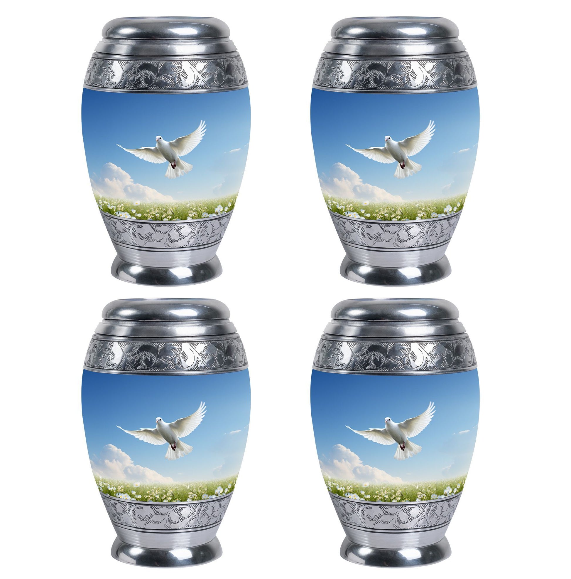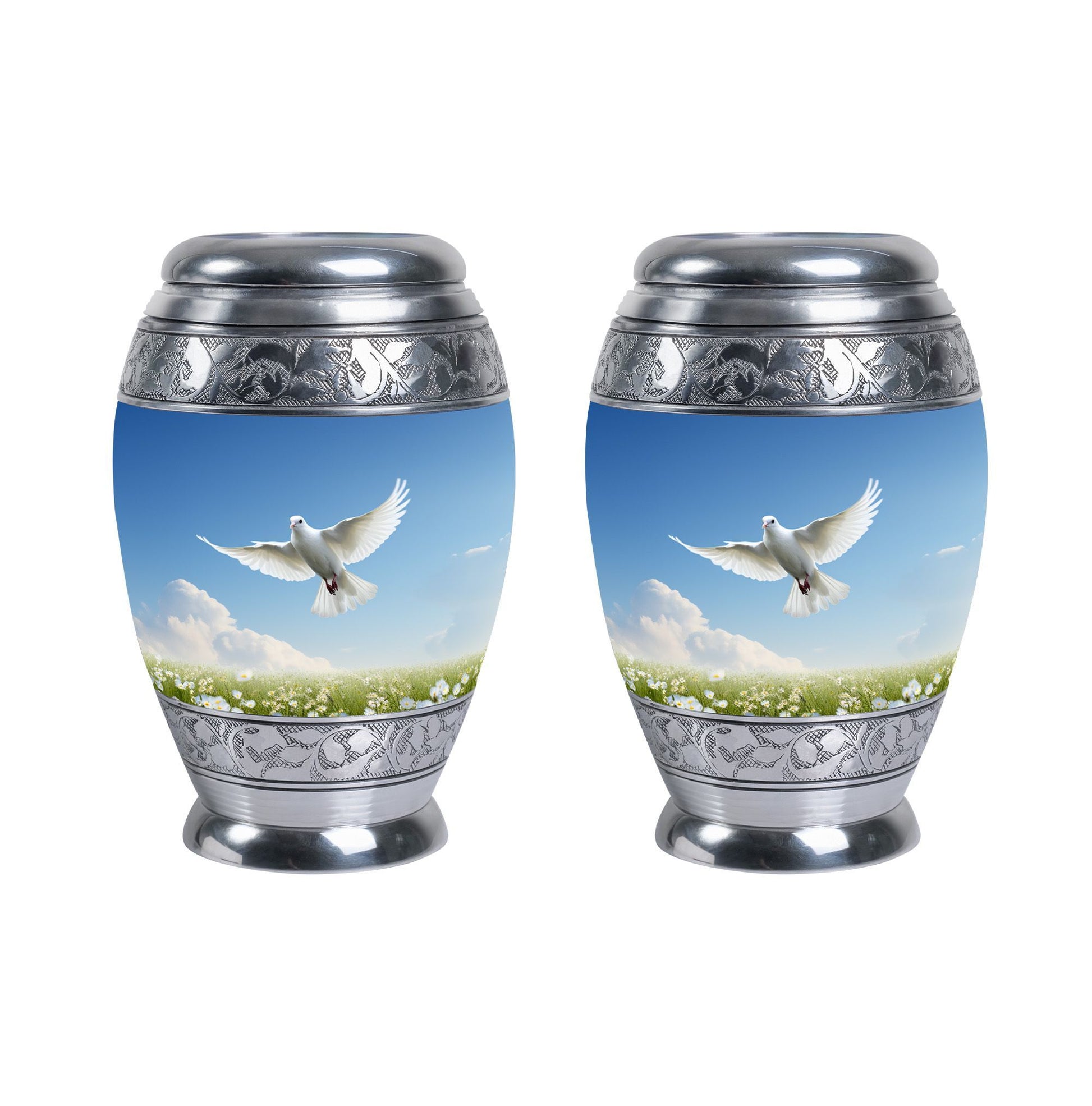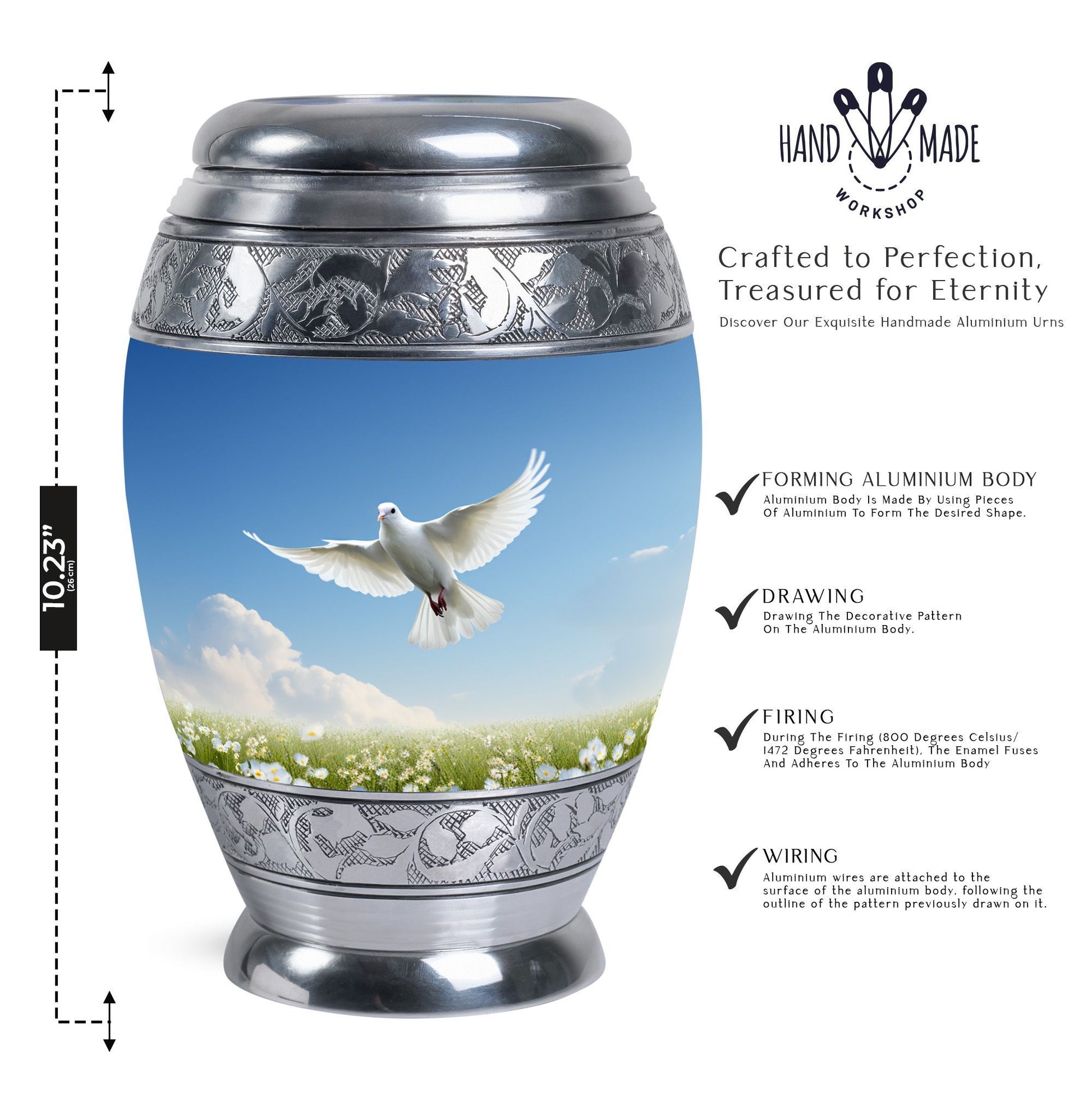 Our Aluminium Dove Urns for Ashes are robust, elegantly designed large urns that provide a dignified and respectful final resting place for your loved one. Constructed to a generous 3-inch size, these urns for ashes for adults are weighty at 3.3 pounds, standing a majestic 10 inches in height, reflecting the grandeur of your loved one’s personality. They offer a substantial capacity, holding up to 200 cubic inches of ash. Our classic urn design is timeless and sophisticated, uniting the material and spiritual in a tribute of enduring love. We provide a velvet pouch for the containment of ashes, ensuring a safe and protected space. In addition, you can personalize the urn with engraved names, making each piece truly unique. Whether you are in need of burial urns for adults, looking for a meaningful urn container, or specific urns for Dad, our range of custom cremation urns is sure to meet your needs. Dive into a heartfelt buying experience and honor your loved ones in the most exclusive way.