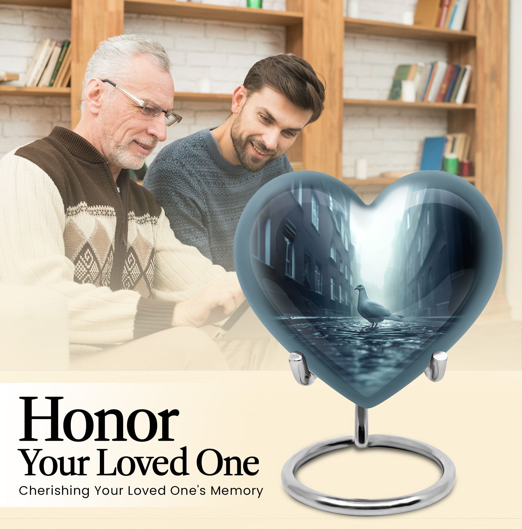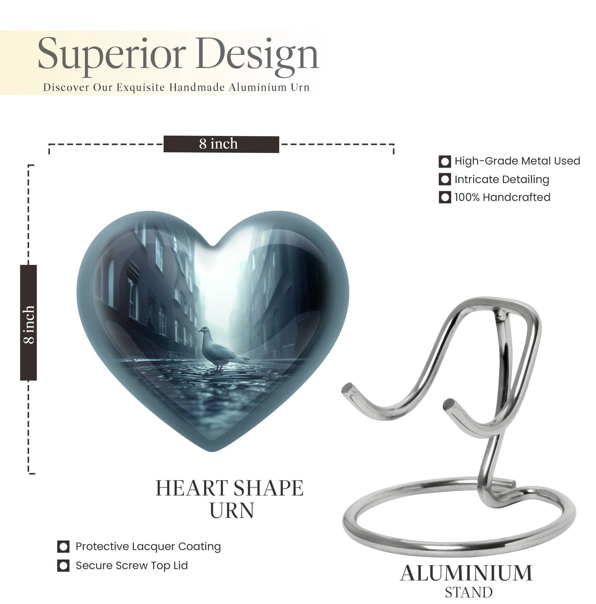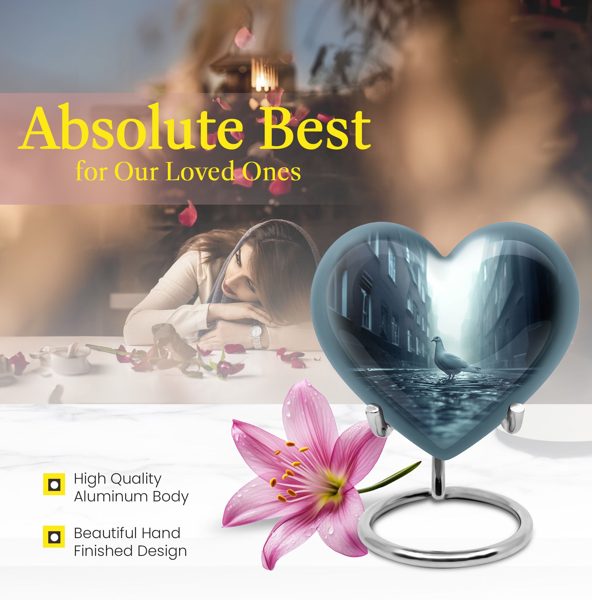 Honor the departed in a heartfelt manner with our 10-inch Dove Urn. Crafted from durable aluminium, this burial urn represents love and serenity that beautifully echoes your emotions. With a weight of 3.3 pounds and dimensions of 10 inches height, the urn comfortably holds up to 200 cubic inches of cremated remains. For added ease, we provide a velvet pouch to contain the ashes, ensuring a dignified containment. This urn hits a poignant note with its dove theme, a symbol of peace and the spirit soaring free. Moreover, each of our large urns is customizable, allowing you to personalize the urn with engraved names, creating a lasting tribute to your loved one. Ideal for adults and seniors in search of memorial urns or cremation urns for burial, our Dove Urn is a testament of everlasting tranquility and an emblem of love, speed, and sacrifice. Kindly note, this product omits the 'design' characteristic in its description for its theme itself captures the essence beautifully.