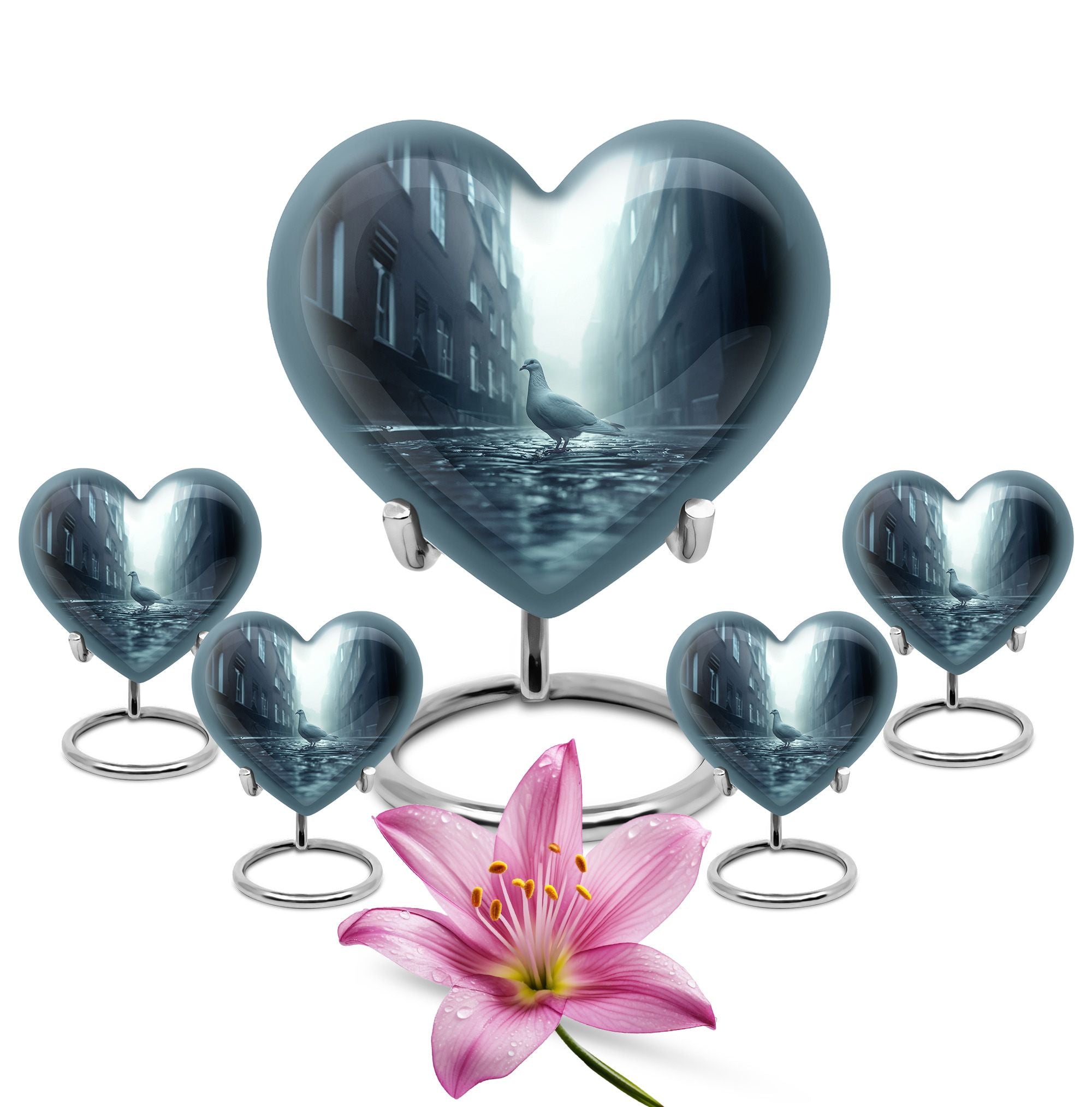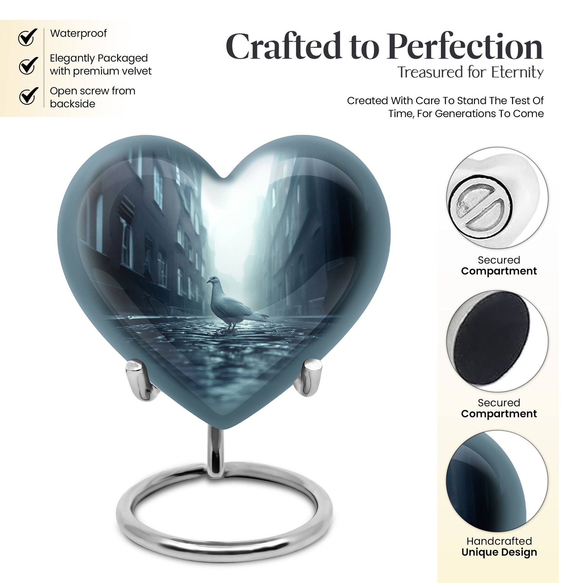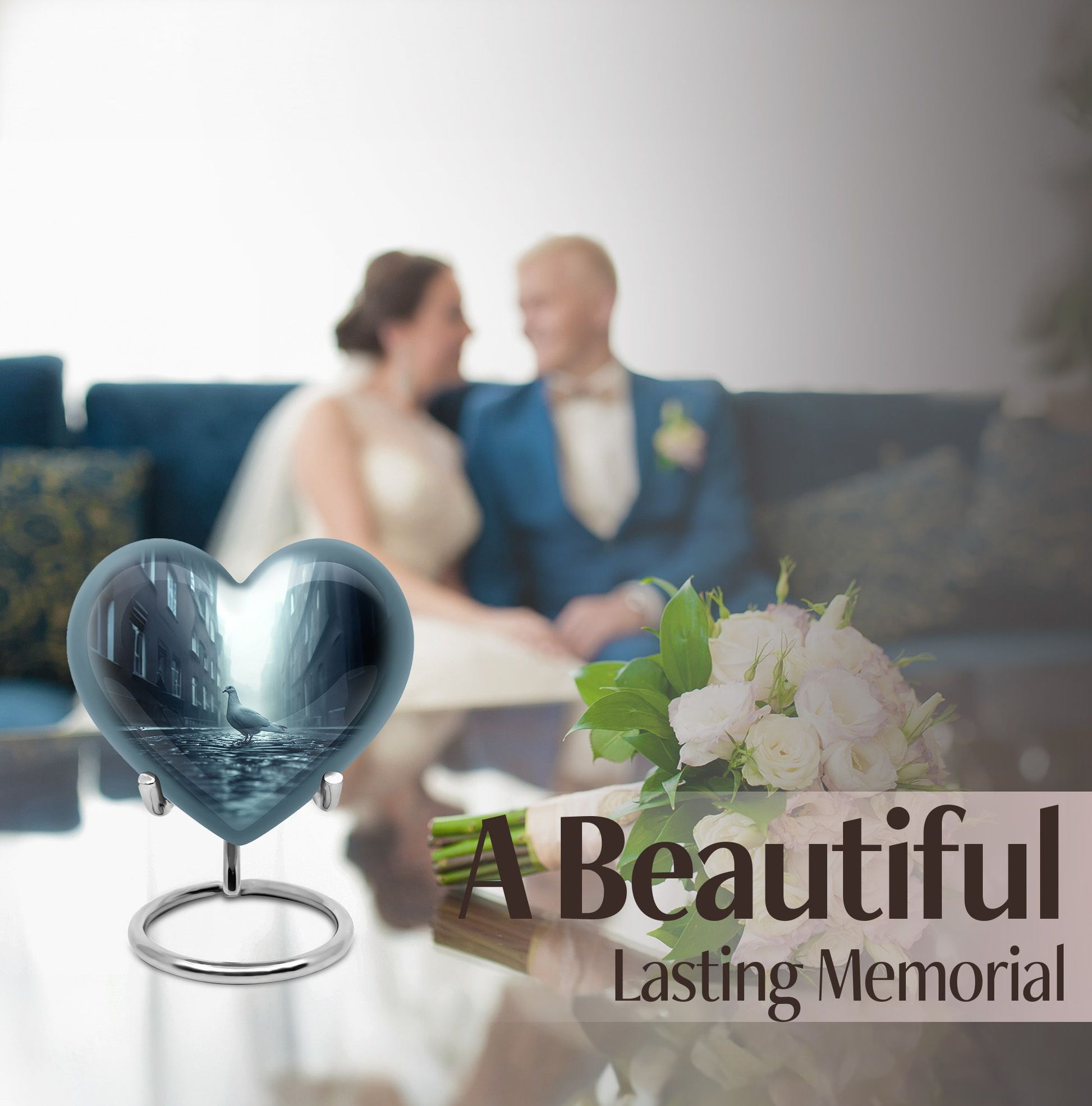 Honor the departed in a heartfelt manner with our 10-inch Dove Urn. Crafted from durable aluminium, this burial urn represents love and serenity that beautifully echoes your emotions. With a weight of 3.3 pounds and dimensions of 10 inches height, the urn comfortably holds up to 200 cubic inches of cremated remains. For added ease, we provide a velvet pouch to contain the ashes, ensuring a dignified containment. This urn hits a poignant note with its dove theme, a symbol of peace and the spirit soaring free. Moreover, each of our large urns is customizable, allowing you to personalize the urn with engraved names, creating a lasting tribute to your loved one. Ideal for adults and seniors in search of memorial urns or cremation urns for burial, our Dove Urn is a testament of everlasting tranquility and an emblem of love, speed, and sacrifice. Kindly note, this product omits the 'design' characteristic in its description for its theme itself captures the essence beautifully.
