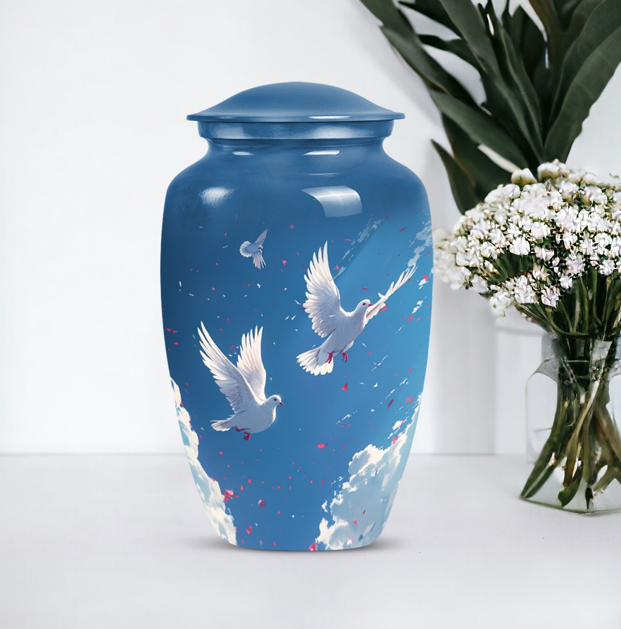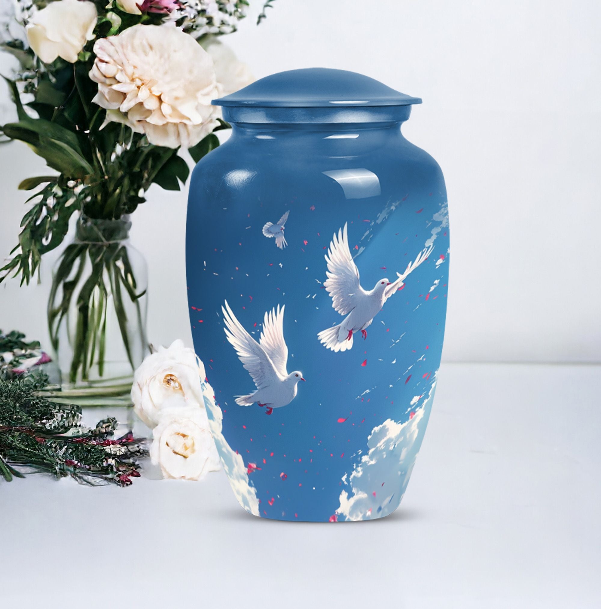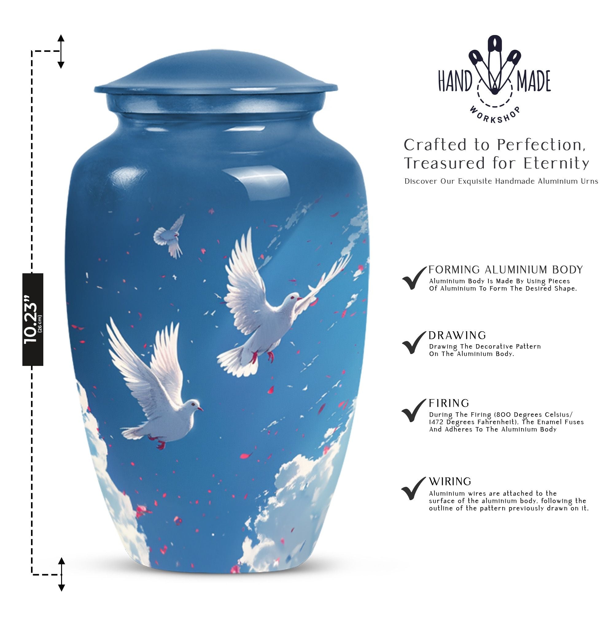 This 10-inch elegant Dove Urn is an exceptional choice to honor your loved ones. As a solemn tribute, these large urns offer up to 200 cubic inches of capacity, suitable for any adult or senior funeral urn needs. Crafted from robust and lightweight aluminium, it weighs merely 3.3 pounds. The traditional floral theme adds to the tranquillity of its exclusive design. It arrives encased in a luxurious velvet pouch, safeguarding the sanctity of the contained ashes. The urn also offers a unique personalized touch - engrave the names of your loved ones, retaining their memory in an intimate manner. Suitable as burial urns and in-memory of funeral urns for men, these urns amplify the significance of a peaceful and dignified ceremony. Make a respectful gesture with this unique cremation urn, portraying your deep love and loss beautifully.