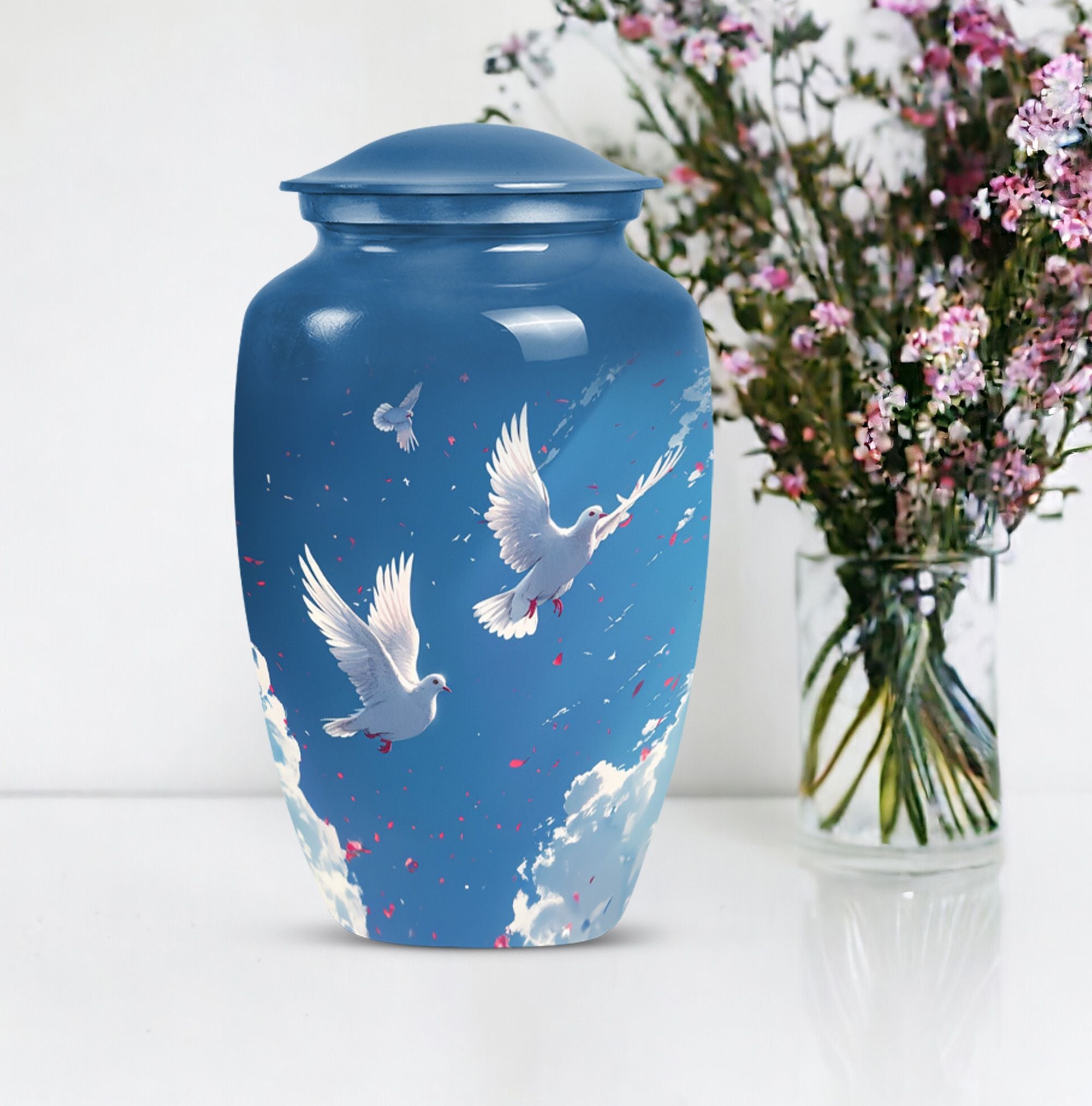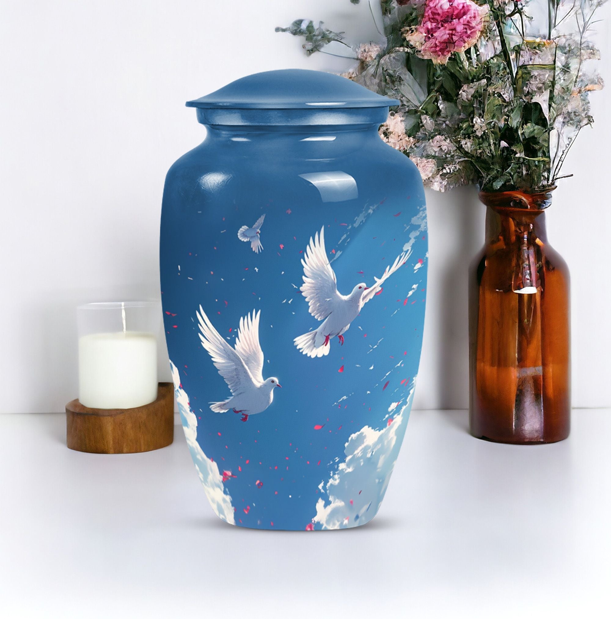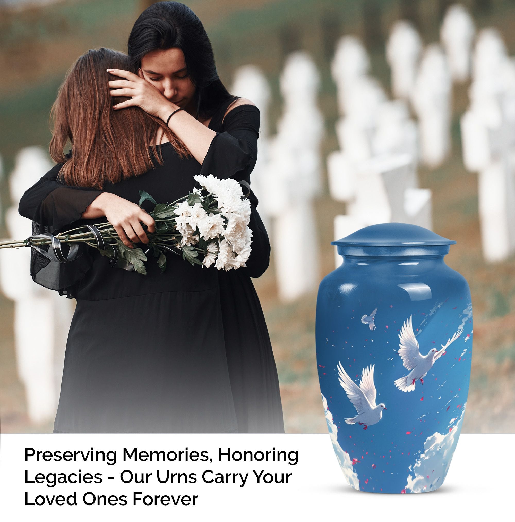 This 10-inch elegant Dove Urn is an exceptional choice to honor your loved ones. As a solemn tribute, these large urns offer up to 200 cubic inches of capacity, suitable for any adult or senior funeral urn needs. Crafted from robust and lightweight aluminium, it weighs merely 3.3 pounds. The traditional floral theme adds to the tranquillity of its exclusive design. It arrives encased in a luxurious velvet pouch, safeguarding the sanctity of the contained ashes. The urn also offers a unique personalized touch - engrave the names of your loved ones, retaining their memory in an intimate manner. Suitable as burial urns and in-memory of funeral urns for men, these urns amplify the significance of a peaceful and dignified ceremony. Make a respectful gesture with this unique cremation urn, portraying your deep love and loss beautifully.