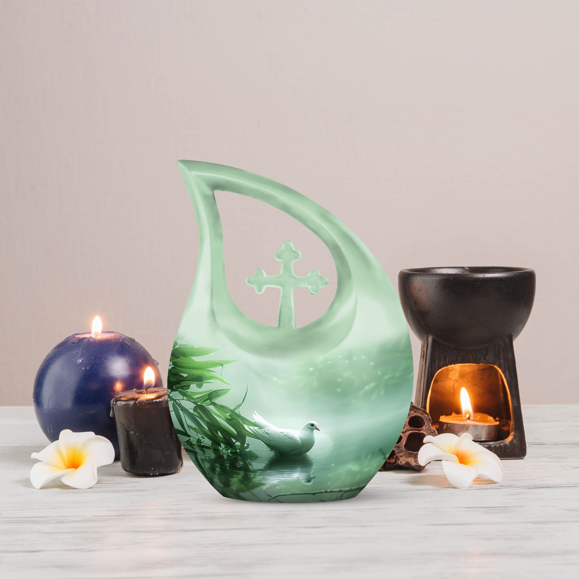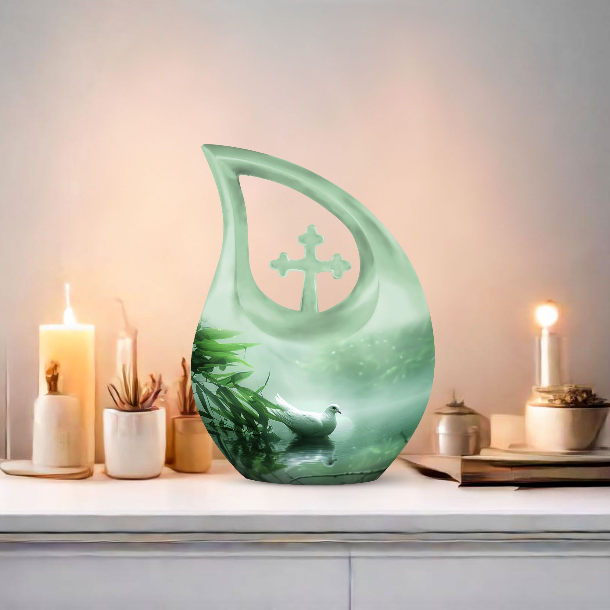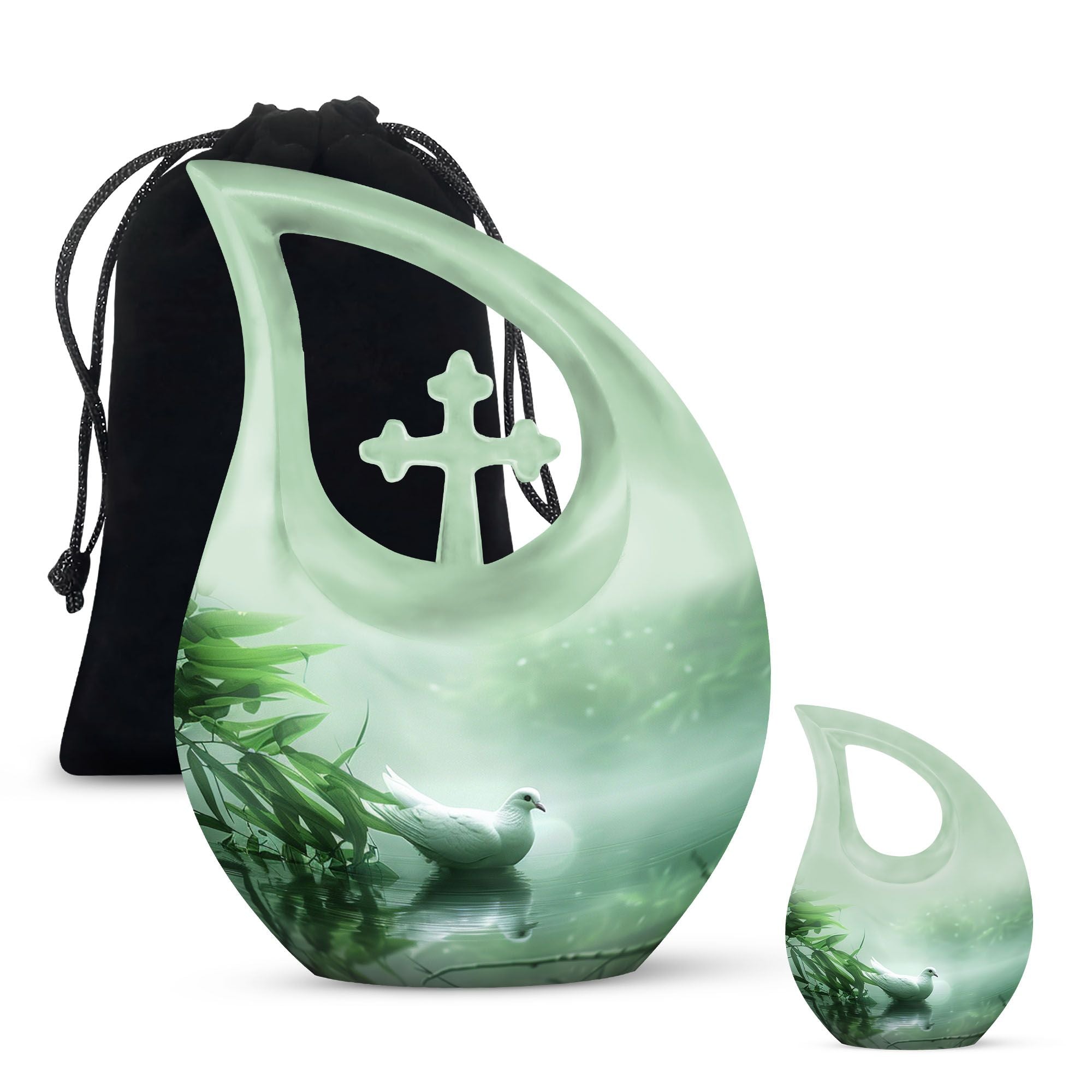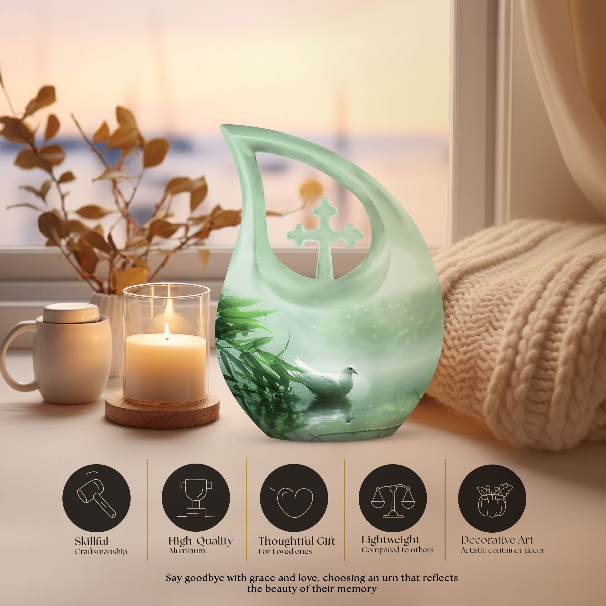 Meticulously handcrafted from premium aluminum, this aesthetic urn for home decor features a smooth matte finish adorned with an elegant dove motif — a timeless symbol of purity and hope. Its refined craftsmanship makes it a beautiful urn women love to display, while also serving as a dignified men urn for human ashes or small urn for ashes adult male in the matching keepsake sizes.