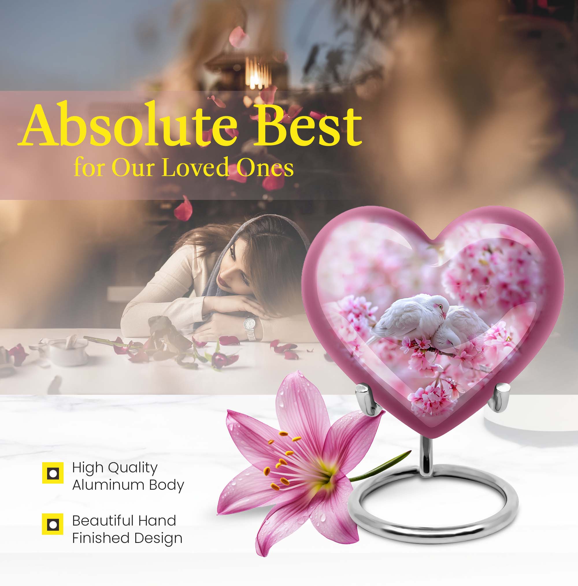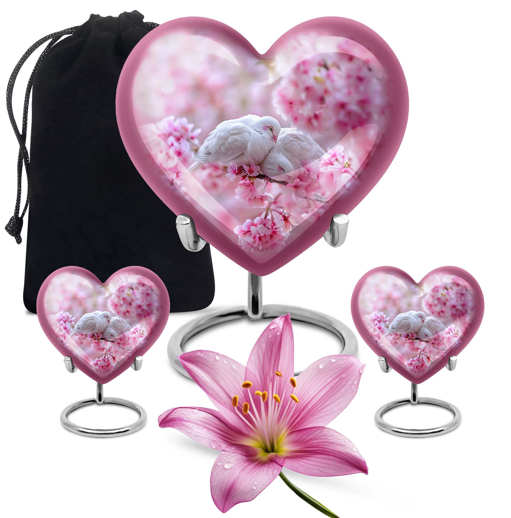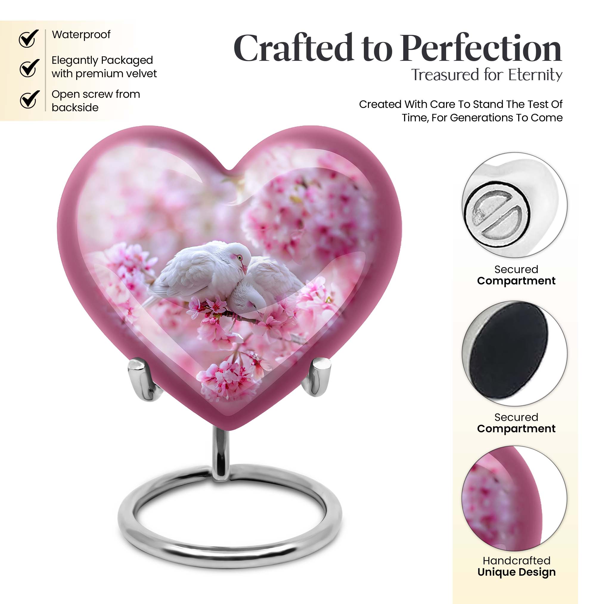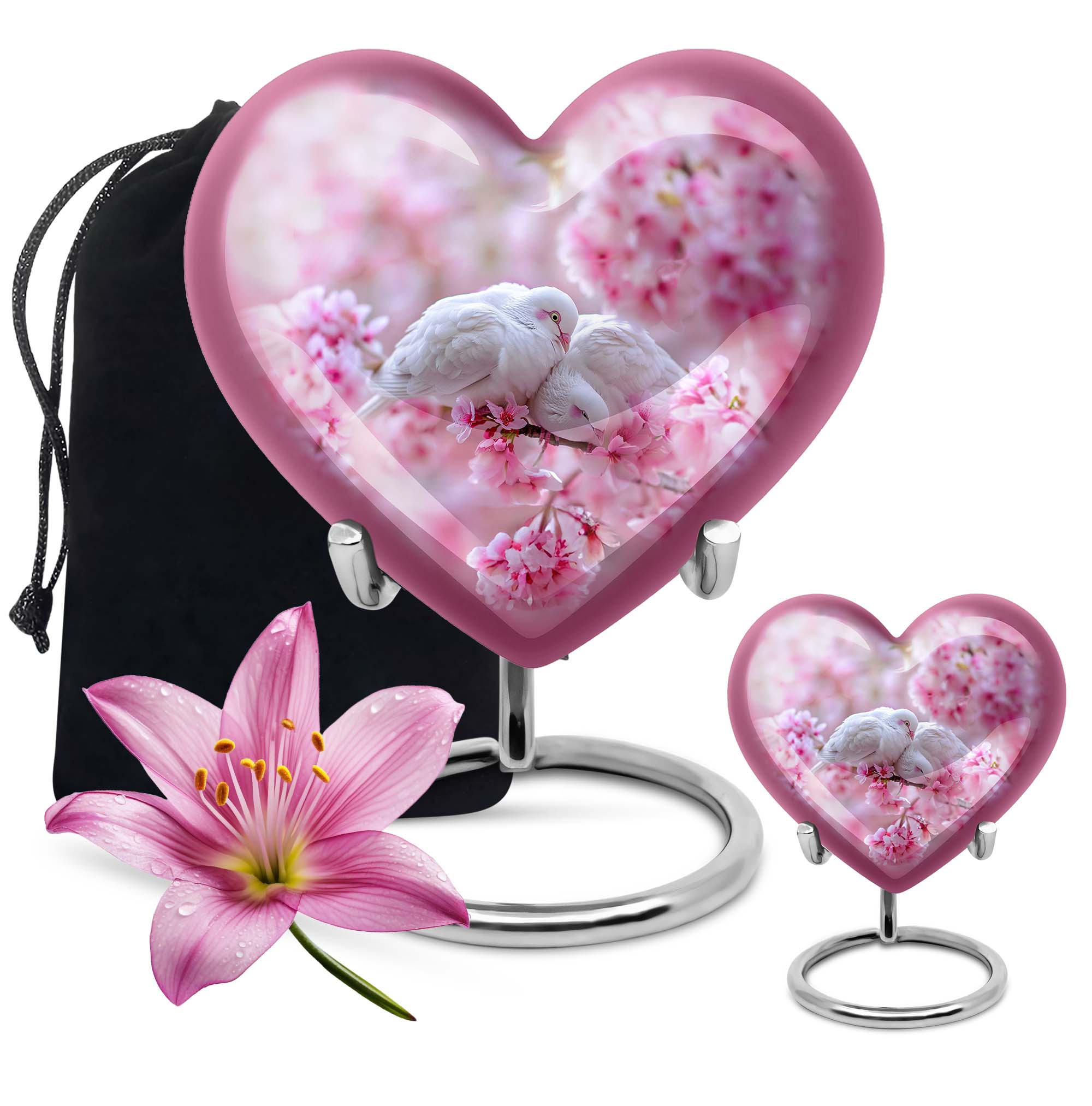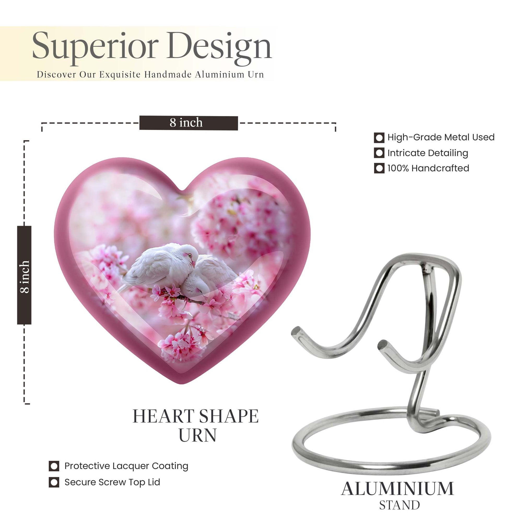The Dove Urn brings beauty and tranquillity to your remembrance, enhancing your memorial experience. Known for its sturdiness, this funeral urn weighs 3.3 pounds with a large capacity of 200 cubic inches, allowing it to comfortably receive the ashes of an adult male or female. Measuring 10 inches in height, this sizeable tribute offers sufficient space for personalization. Add an engraved name to create a unique, enduring homage to your loved one. The urn is completed with a Purple Meadow theme lending a distinctively serene aura. Its heart design, while not the centerpiece of this description, adds an extra layer of depth and love to this piece. Stylish yet functional, the urn comes with a velvet pouch for an elegant containment of ashes. Crafted from high-quality aluminium, it effectively safeguards against time, preserving precious memories for years in a burial setting. Whether you're in need of an urn for mom or a significant other, this product extends beyond being a mere box for ashes. Embrace peace and honour with the Dove Urn, an exemplar of memorial urns.