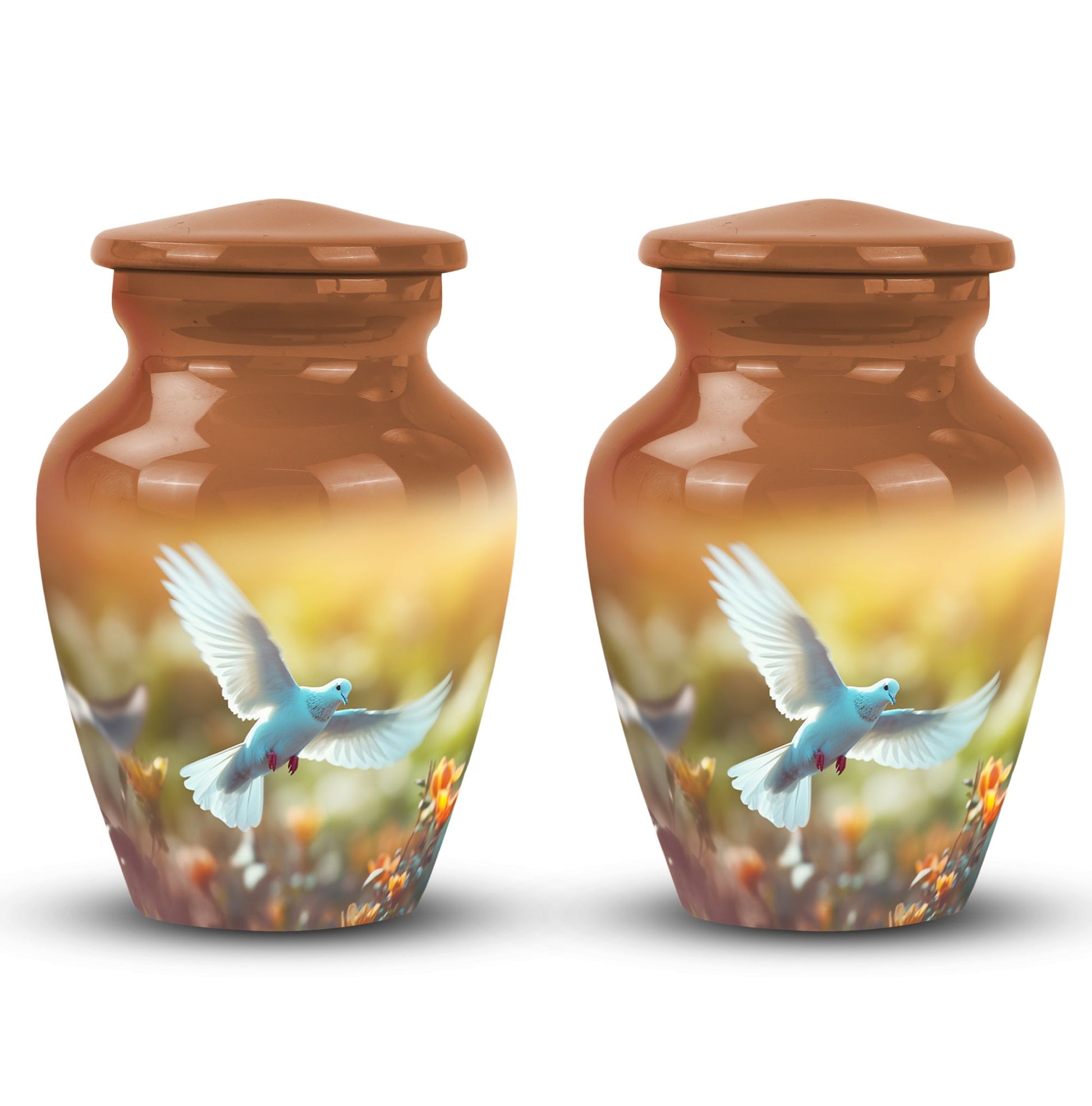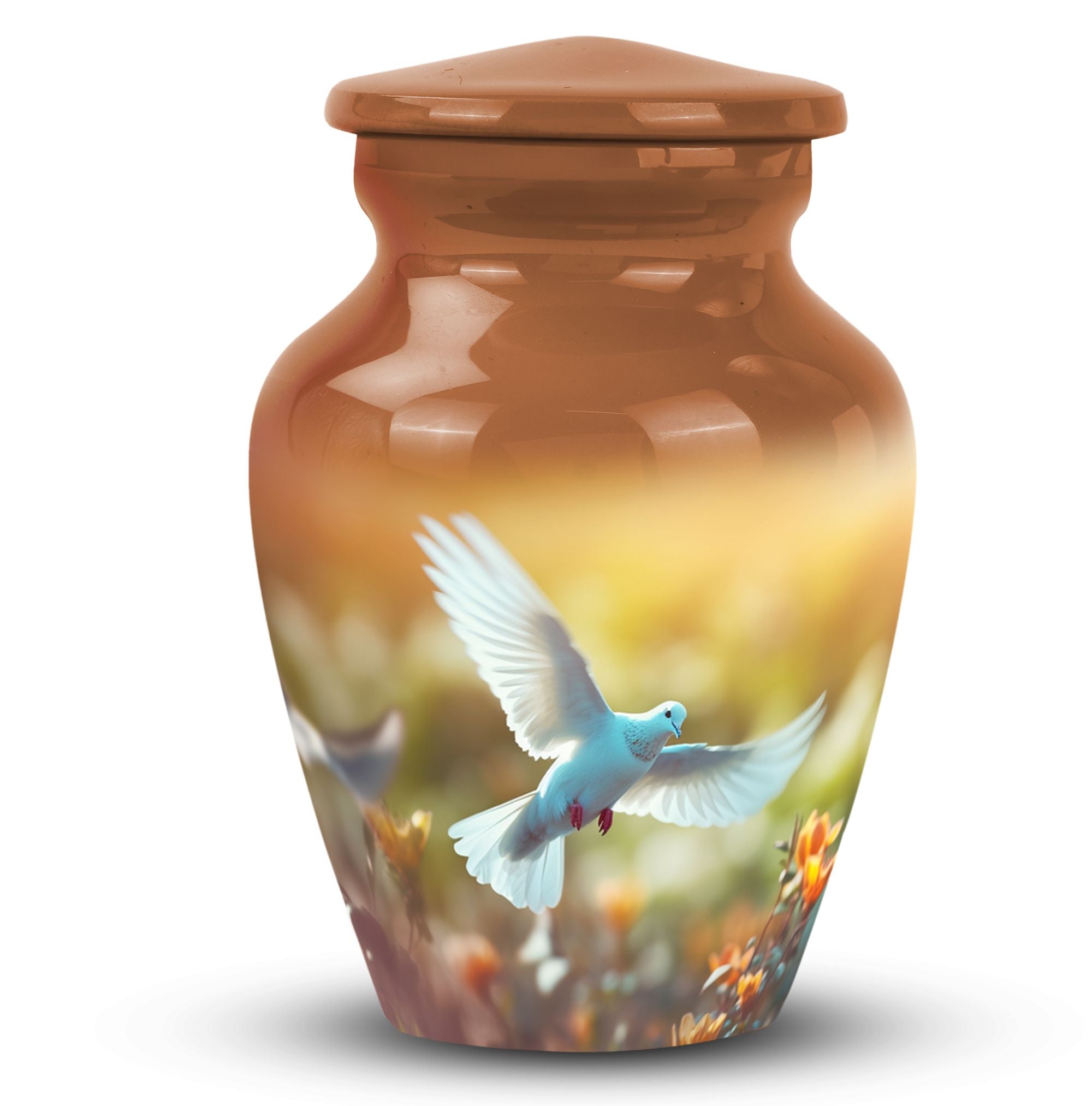 Experience an esteemed way of paying respect to your departed loved ones with our Large Urn. Made from high-quality Aluminium, this 3 inch Classic, Dove Urn is an elegant, lasting tribute. Its respectable size of 10 inches in height and a weight of 3.3 pounds makes it an capacious space for your treasured one's cremated remains, with a capacity of 200 cubic inches. It is a respectful and affectionate choice for commemoration. To offer an individual touch, you can personalize the urn with engraved names. Your engraved Memorial Urn comes along with a velvet pouch, making containment of ashes secure and personal. Keywords such as Urns for Cremated Remains, Urns for Moms Ashes, Human Cremation Ashes, and Burial Urns for Human Ashes speak to its broad relevance and sacred purpose. Trust in this Dove Urn to provide a solemn sanctuary for your cherished one's ashes.