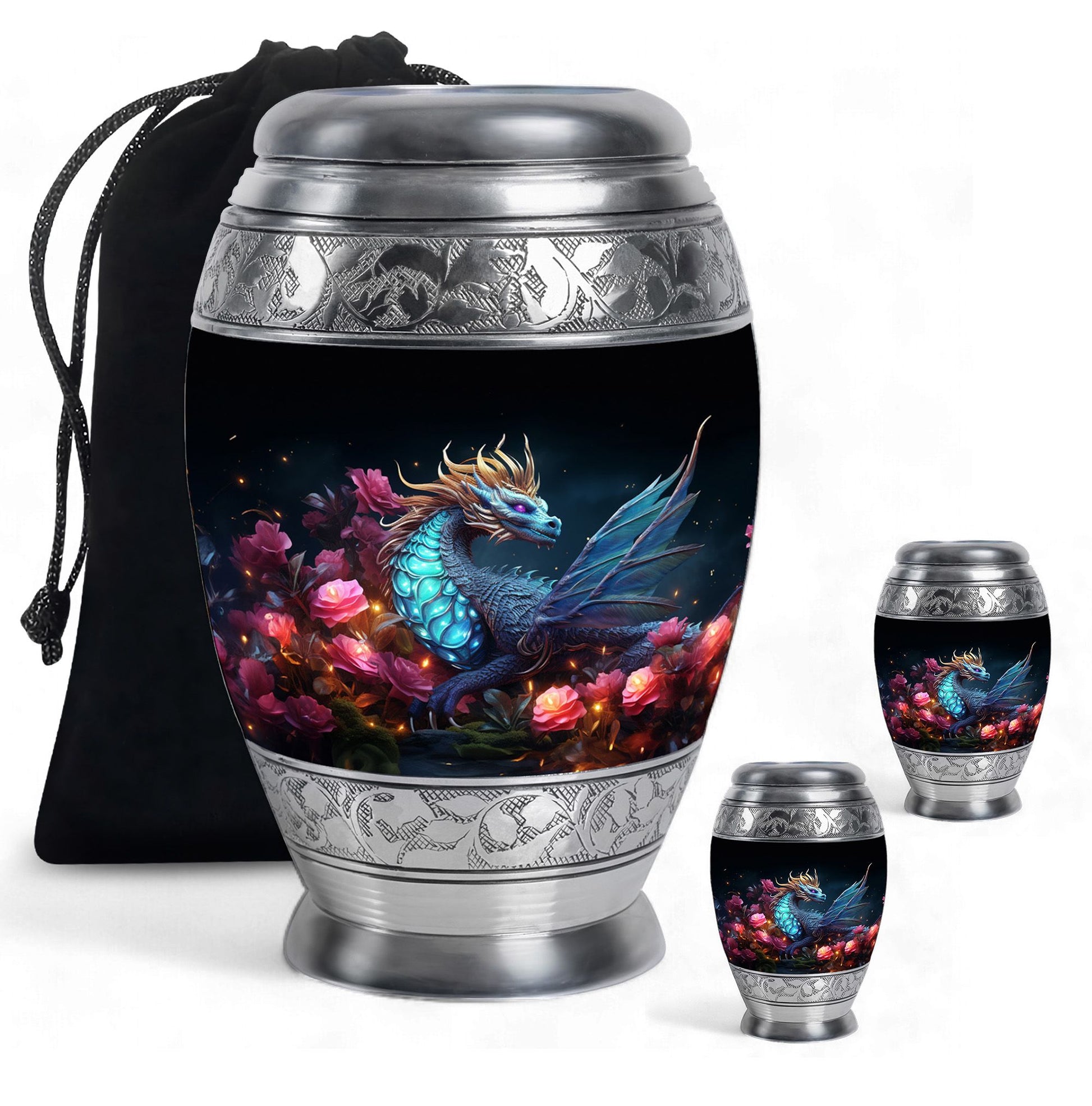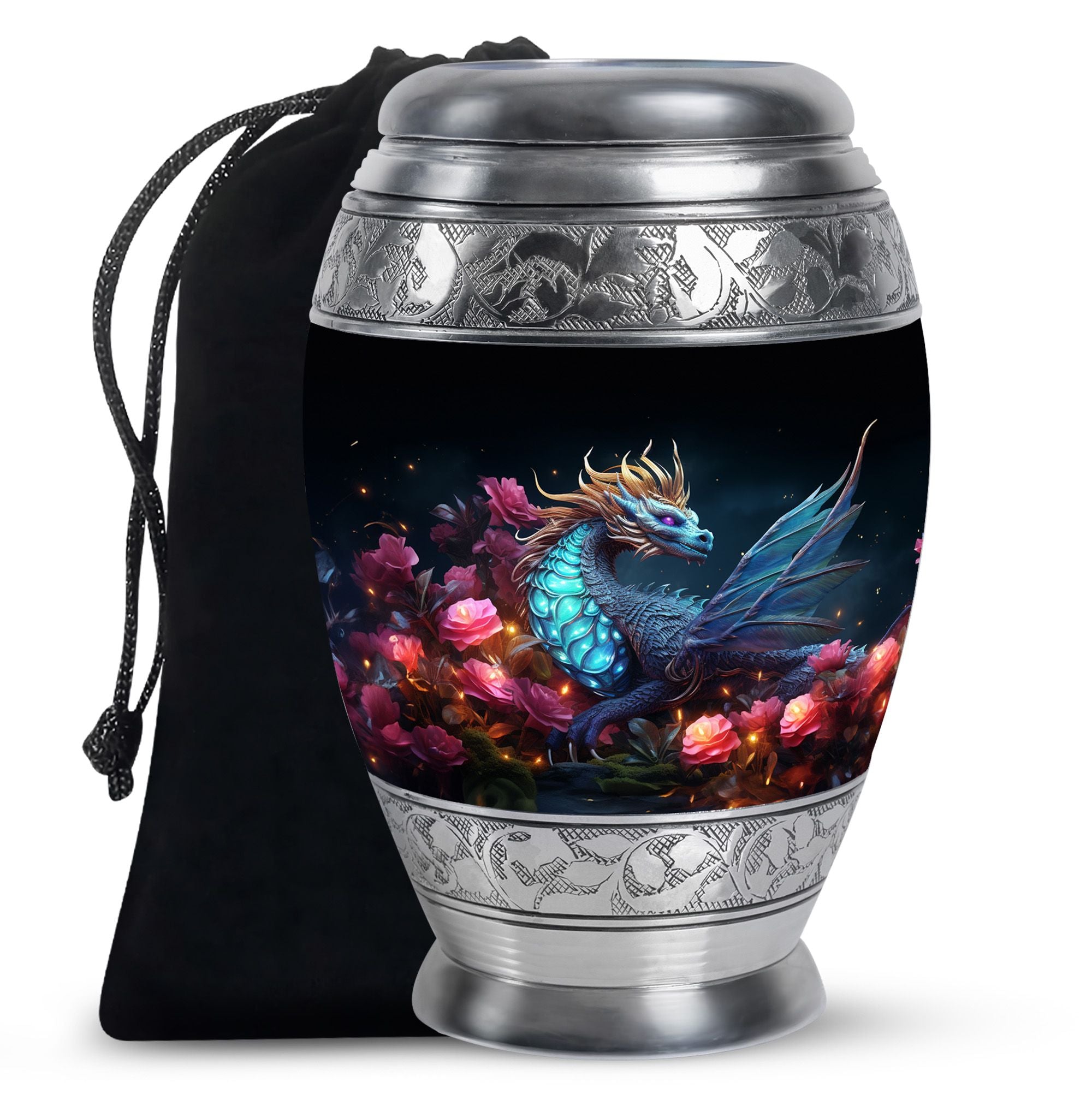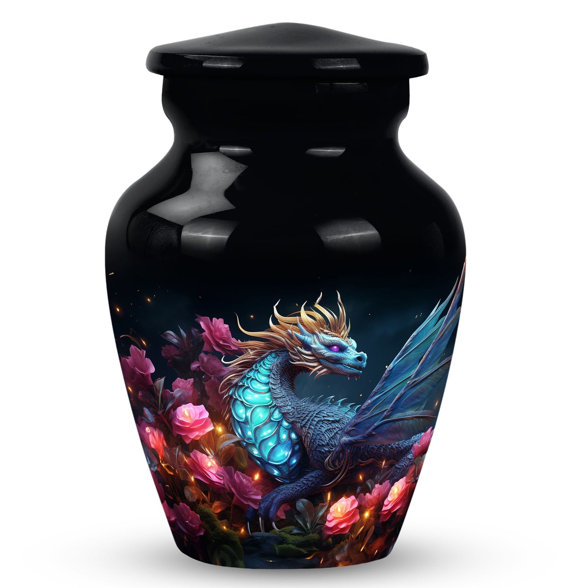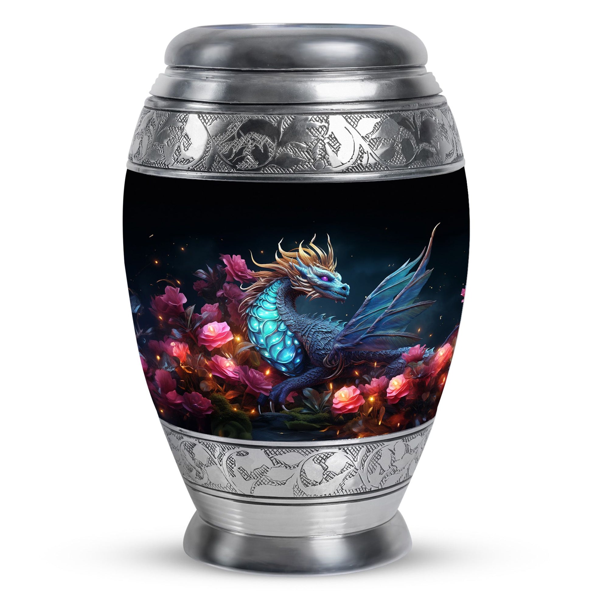 The Dragon Amidst Moonlit Roses cremation urn is a breathtaking symbol of strength, love, and transformation. Featuring a majestic dragon surrounded by moonlit roses, this urn embodies courage, eternal guardianship, and devotion. It’s a perfect choice for families who wish to celebrate the enduring spirit of a loved one through art and symbolism.
