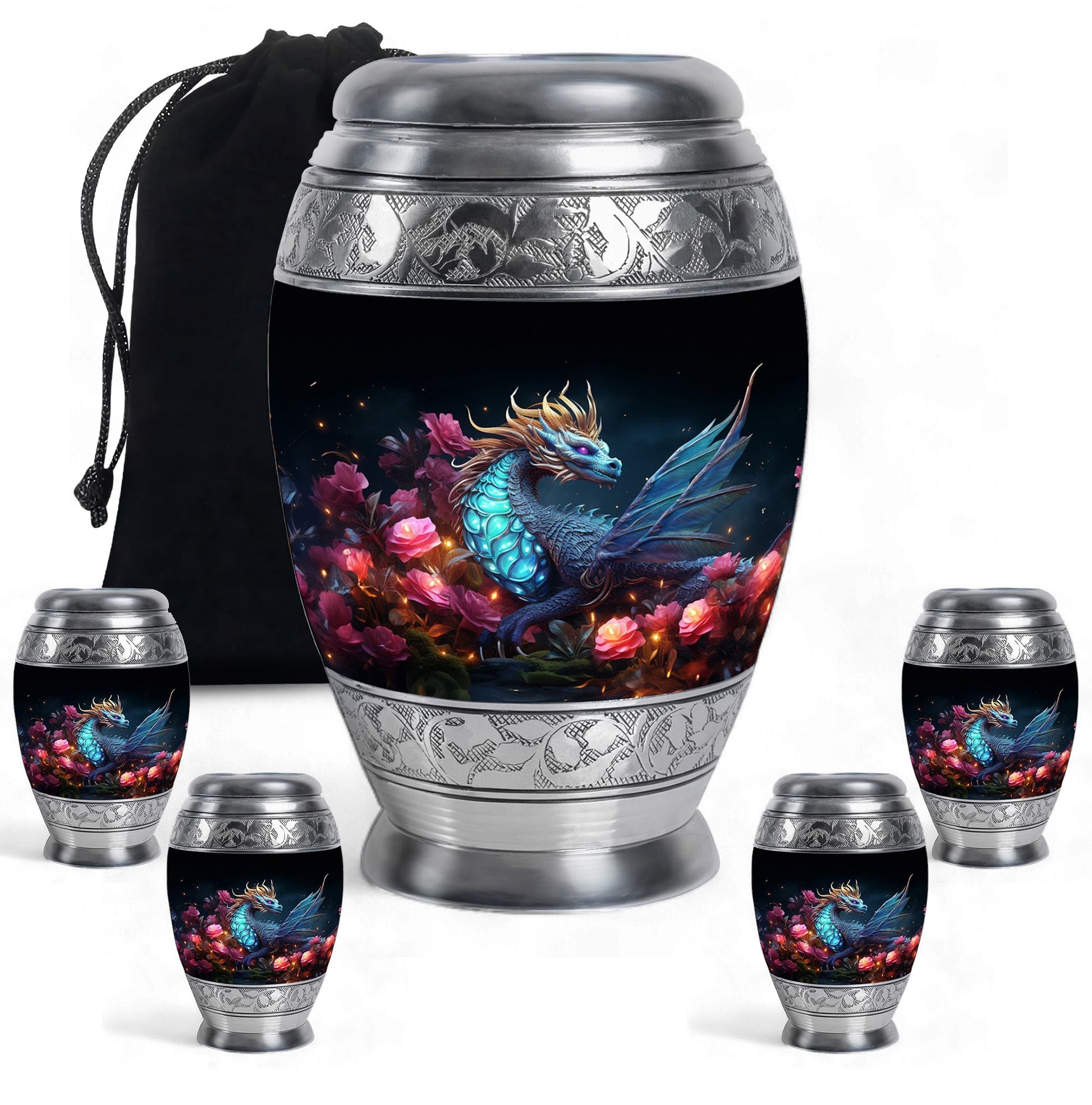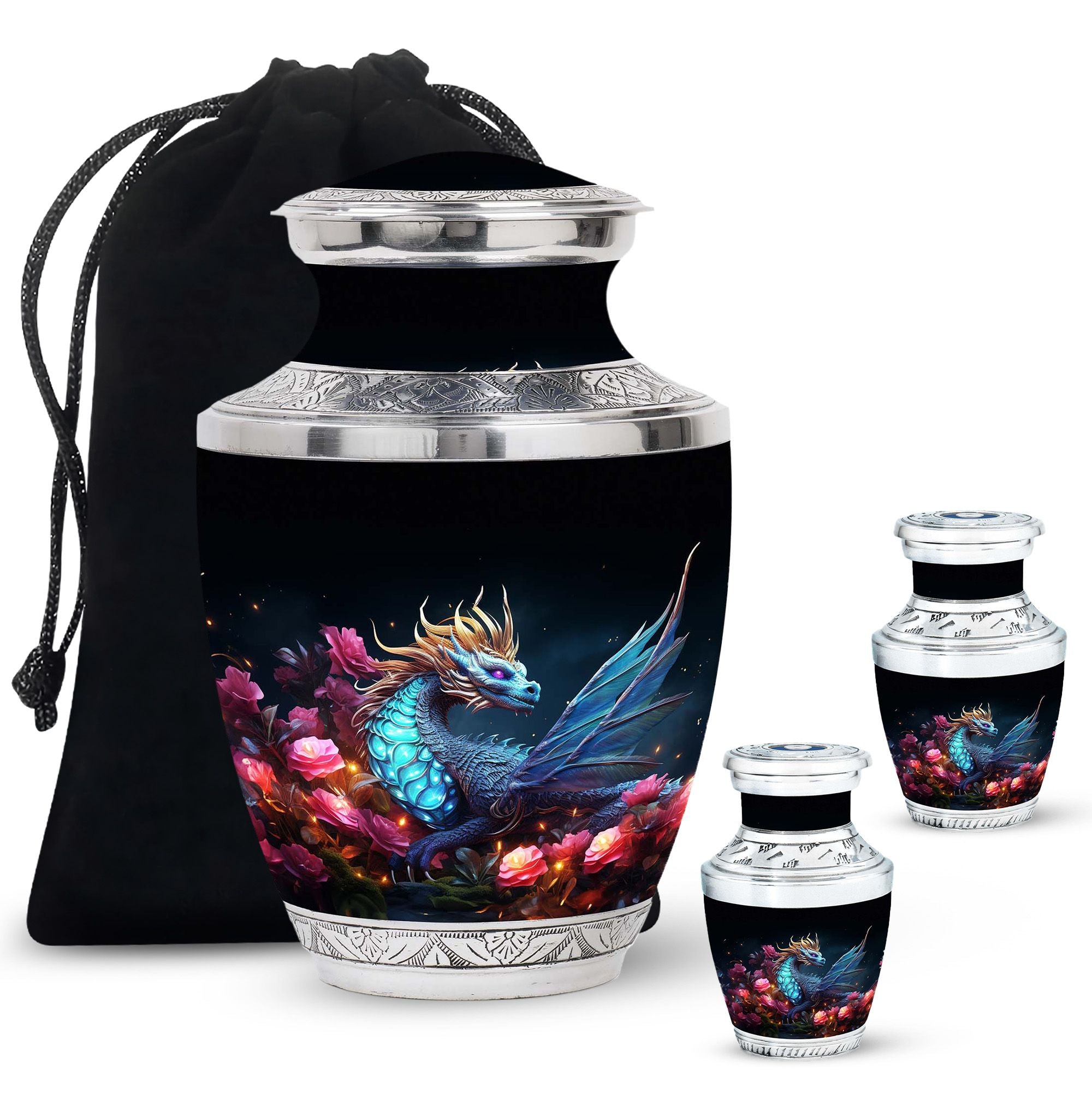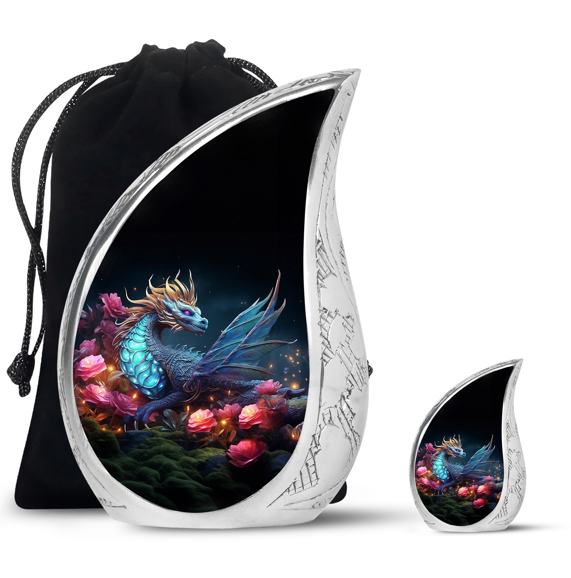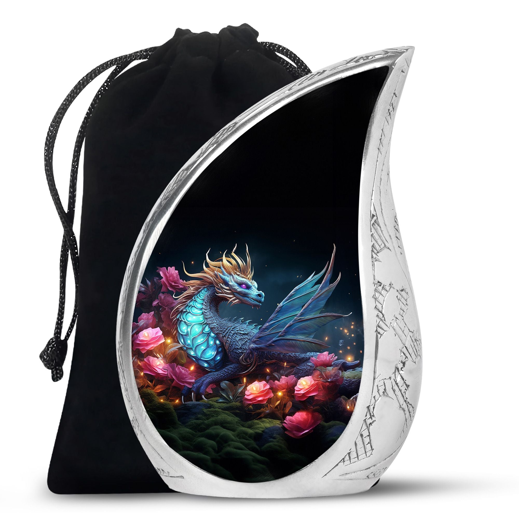 The Dragon Amidst Moonlit Roses cremation urn is a breathtaking symbol of strength, love, and transformation. Featuring a majestic dragon surrounded by moonlit roses, this urn embodies courage, eternal guardianship, and devotion. It’s a perfect choice for families who wish to celebrate the enduring spirit of a loved one through art and symbolism.
