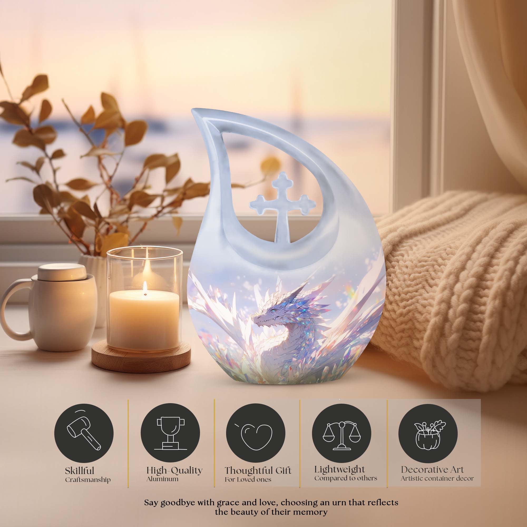 The White Dragon Urn offers a meaningful and symbolic tribute for honoring a cherished mother, father, or loved one. With its serene white finish and protective dragon design, this cremation urn serves as a powerful symbol of strength, purity, and eternal guardianship—ideal for families seeking urns for human ashes adult female or urns for ashes adult male.