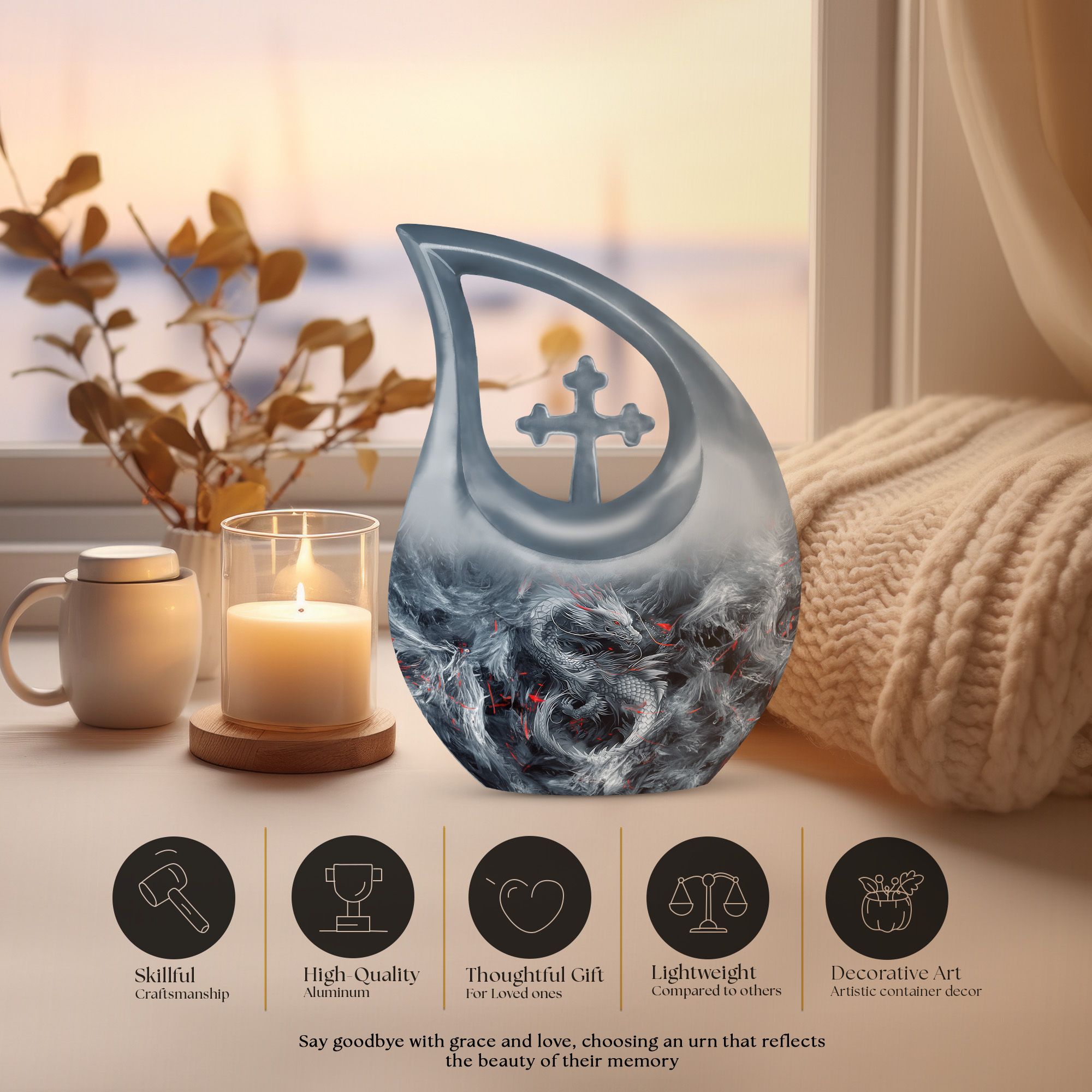 Expertly crafted from premium aluminium, this large cremation urn showcases a bold dragon design symbolizing protection, courage, and eternal spirit. Its solid construction and smooth finish make it suitable for display or burial. As a large human ashes urn, it is thoughtfully designed with a secure screw-top lid to safely hold remains. This piece works beautifully as a large urn for ashes adult male or a large urn for ashes for women, offering versatility for families. Among urns for ashes large adult use, it blends artistic detail with dependable craftsmanship.