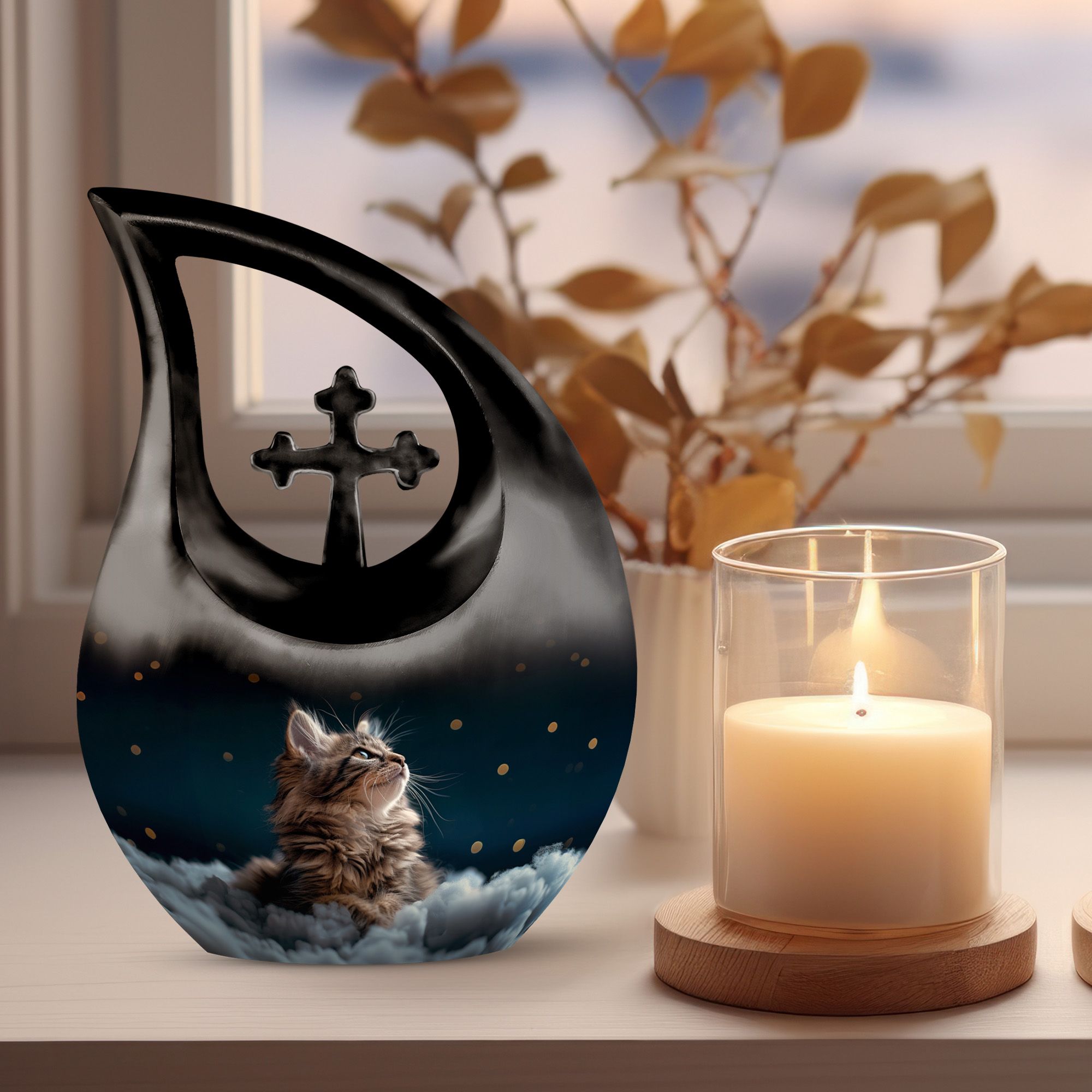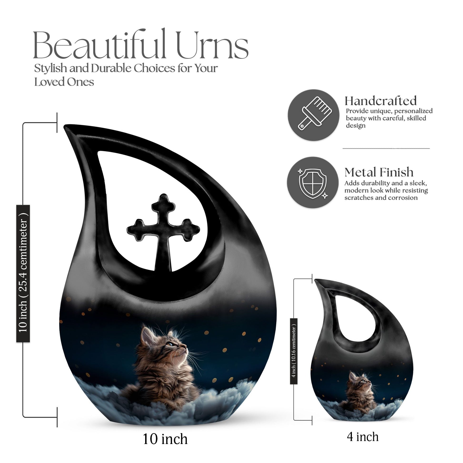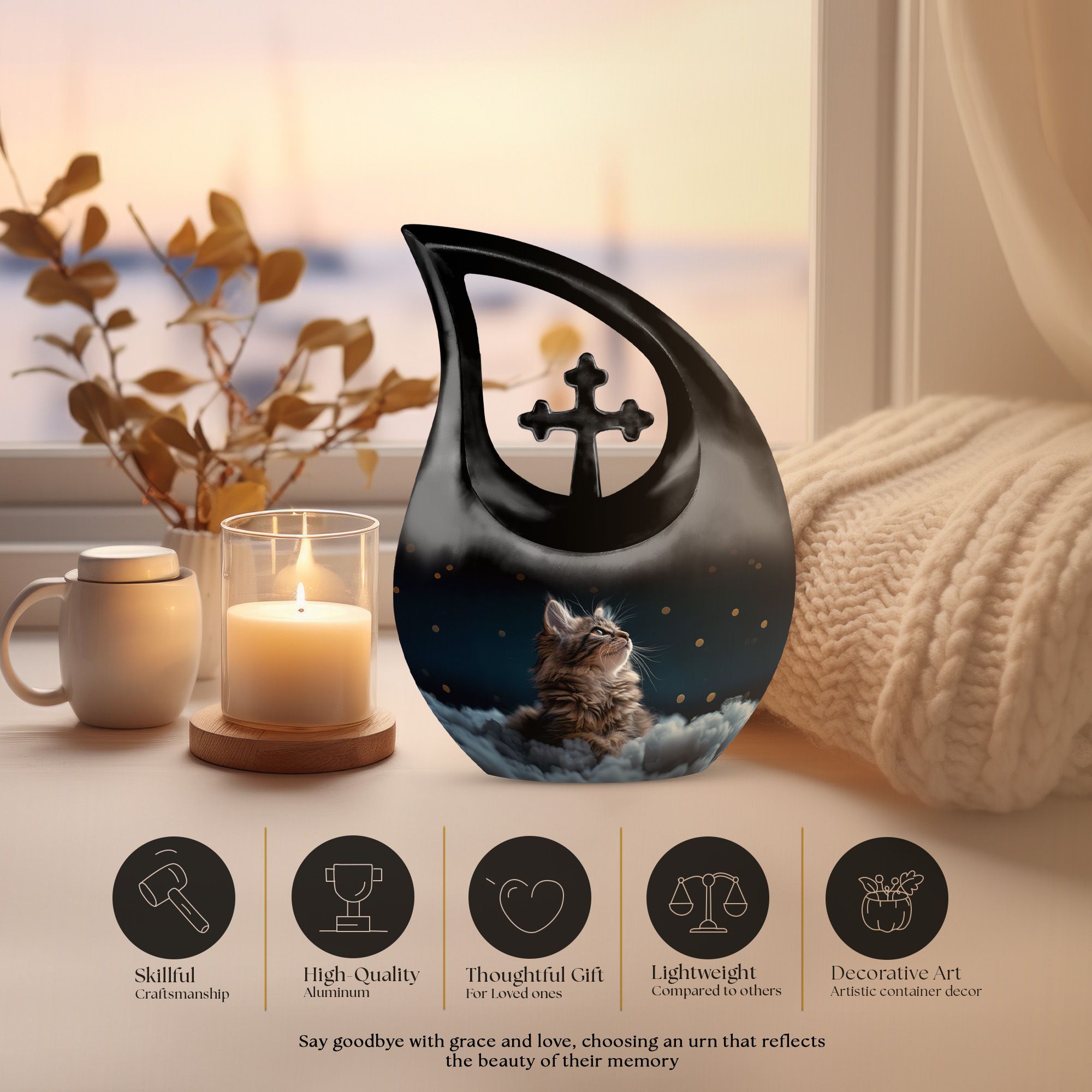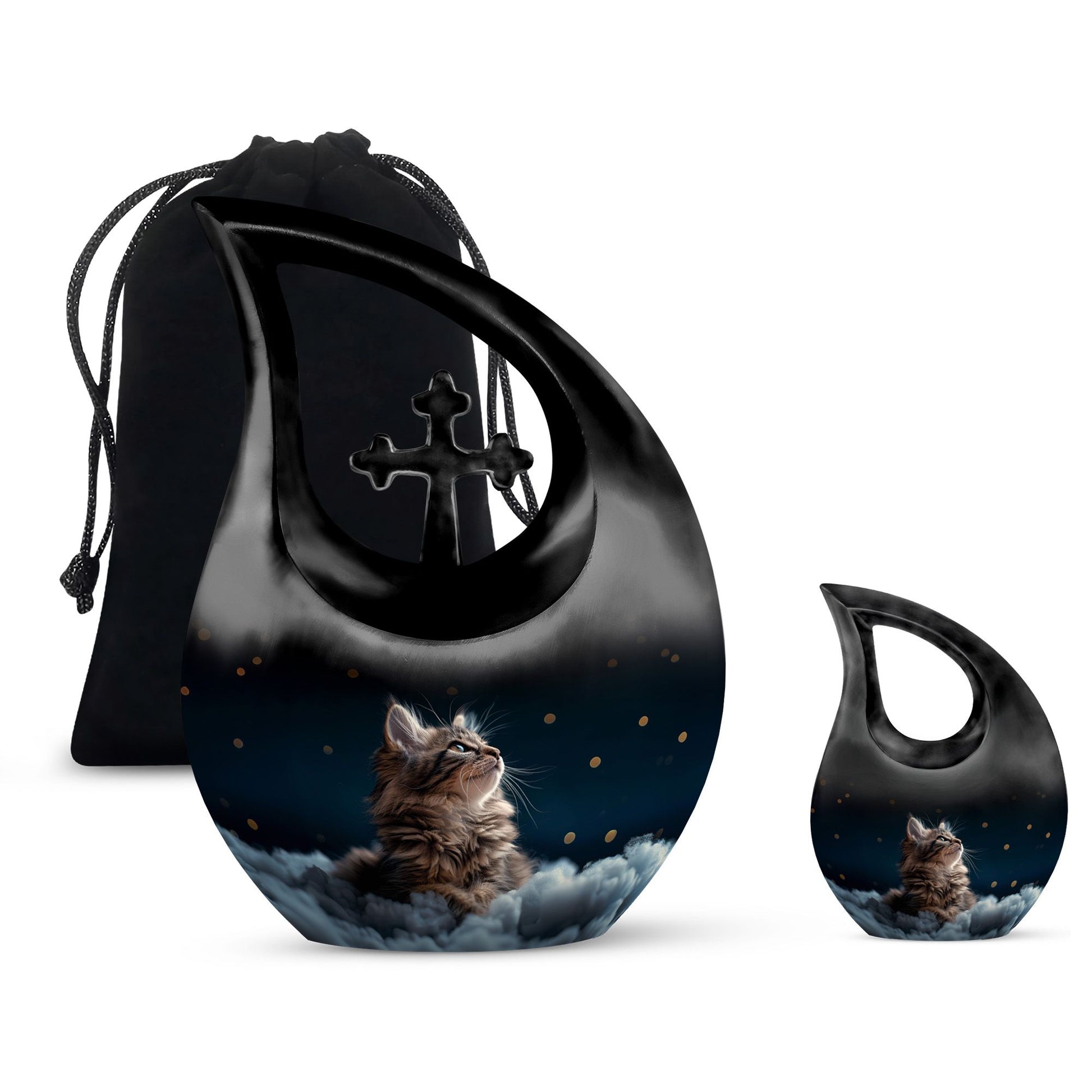 Honor the life of your loved one with the Stargazer's Dream Full Size Urn, a testament to enduring love and a poignant remembrance. Our 10-inch urn, delicately created from high-quality aluminium, exhibits a unique Cross Drop theme that captivates and soothes. Weighing in at just 3.3 pounds, this Large Urn neatly encapsulates up to 200 cubic inches of ashes, a fitting tribute for adults and seniors alike. Delivering comfort beyond mere aesthetics, each purchase includes a velvet pouch that gently contains the remnants of your beloved. Trust in our craftsmanship - these aren't just memorial urns, but priceless vessels of hallowed memories. Further add your personal touch with engraved names to immortalize your heartfelt sentiments. Whether you're seeking stargazer's dream urns, male urns, or drop shaped cremation urns for adults, our selection satisfies all your ceremonial needs. Please note, little urns for human ashes also available. This urn is for you – a home for hearts that continue to sparkle like the stars above.