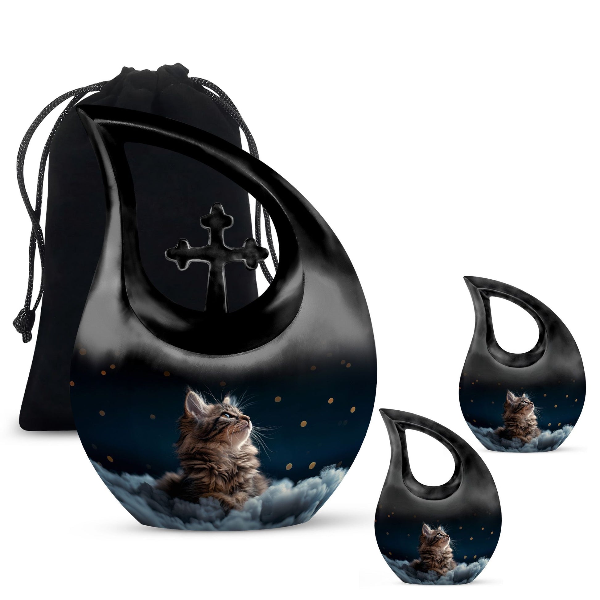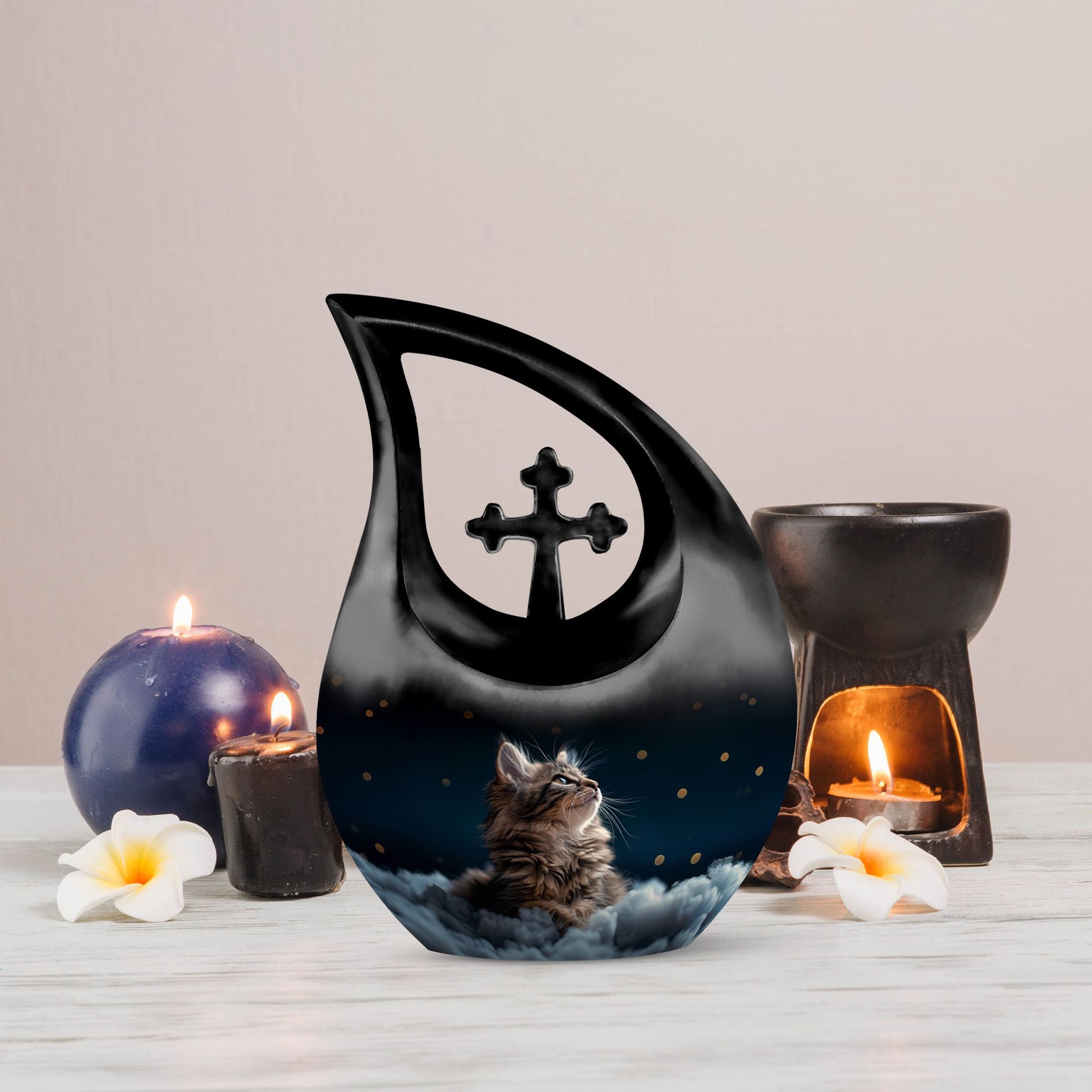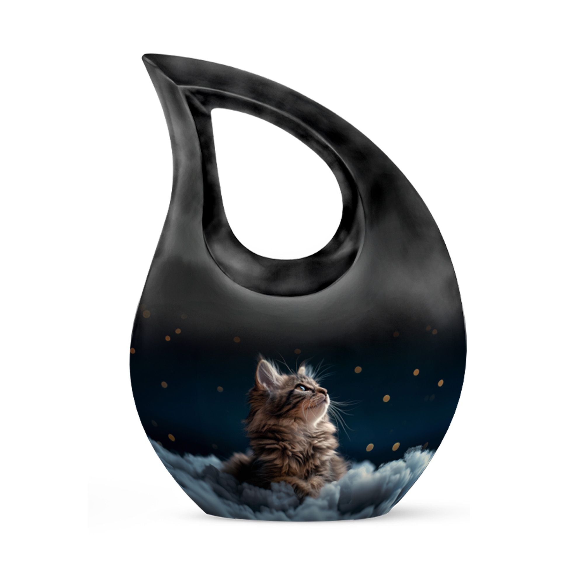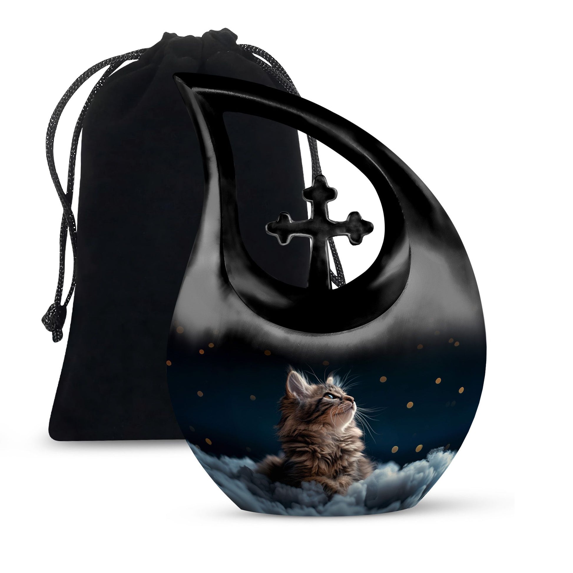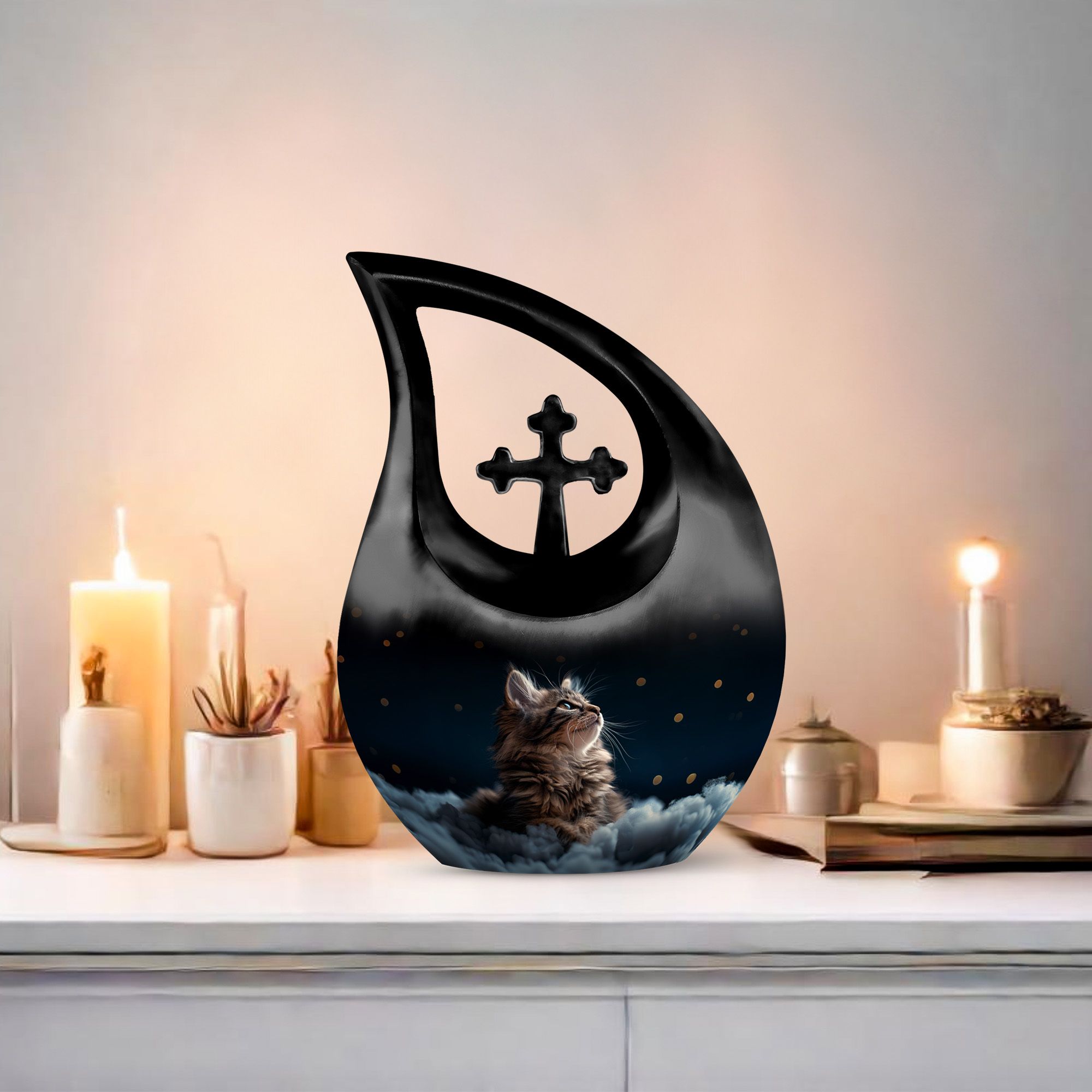 Honor the life of your loved one with the Stargazer's Dream Full Size Urn, a testament to enduring love and a poignant remembrance. Our 10-inch urn, delicately created from high-quality aluminium, exhibits a unique Cross Drop theme that captivates and soothes. Weighing in at just 3.3 pounds, this Large Urn neatly encapsulates up to 200 cubic inches of ashes, a fitting tribute for adults and seniors alike. Delivering comfort beyond mere aesthetics, each purchase includes a velvet pouch that gently contains the remnants of your beloved. Trust in our craftsmanship - these aren't just memorial urns, but priceless vessels of hallowed memories. Further add your personal touch with engraved names to immortalize your heartfelt sentiments. Whether you're seeking stargazer's dream urns, male urns, or drop shaped cremation urns for adults, our selection satisfies all your ceremonial needs. Please note, little urns for human ashes also available. This urn is for you – a home for hearts that continue to sparkle like the stars above.