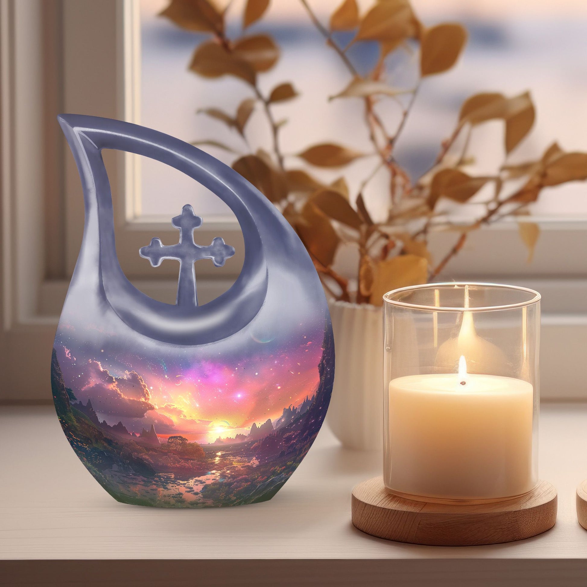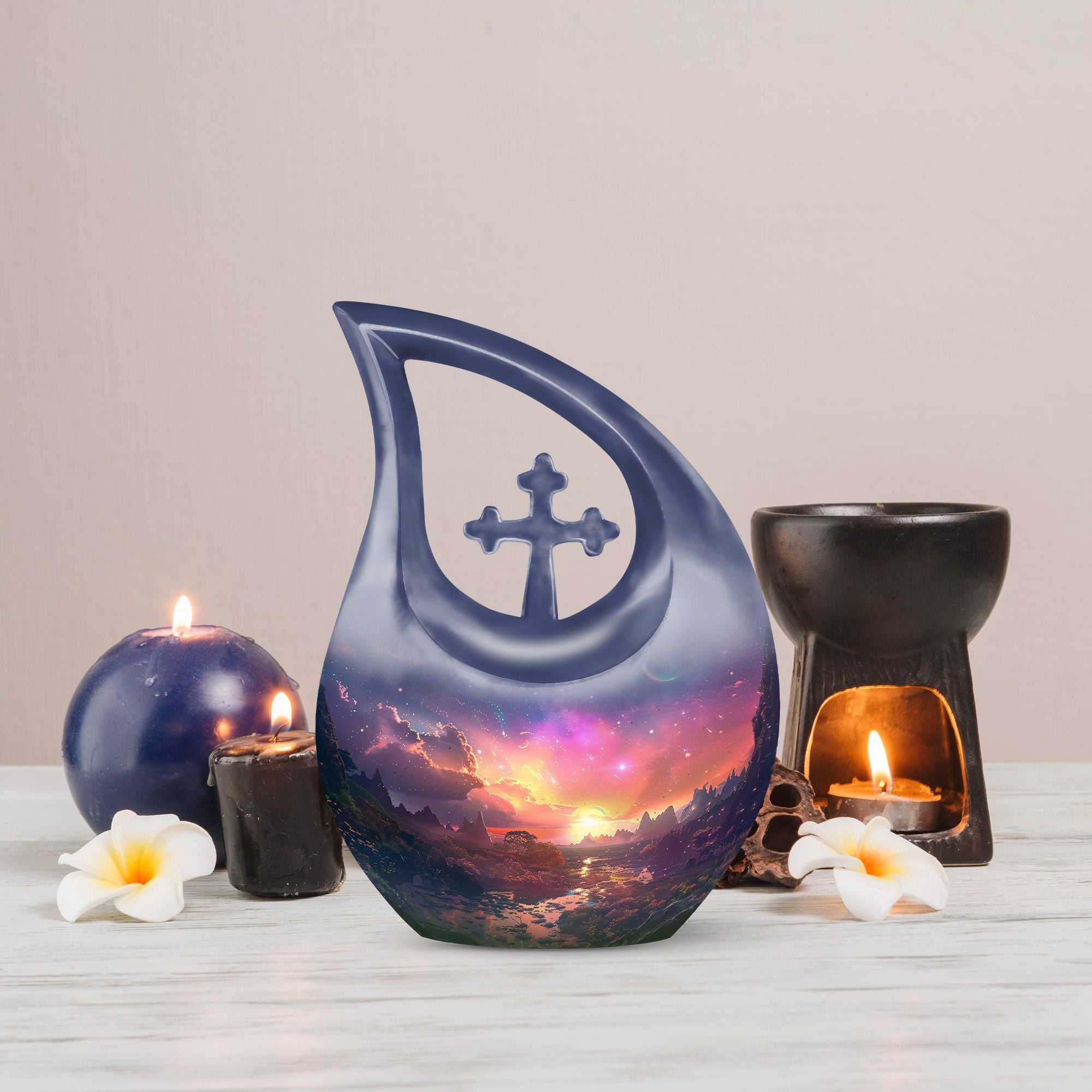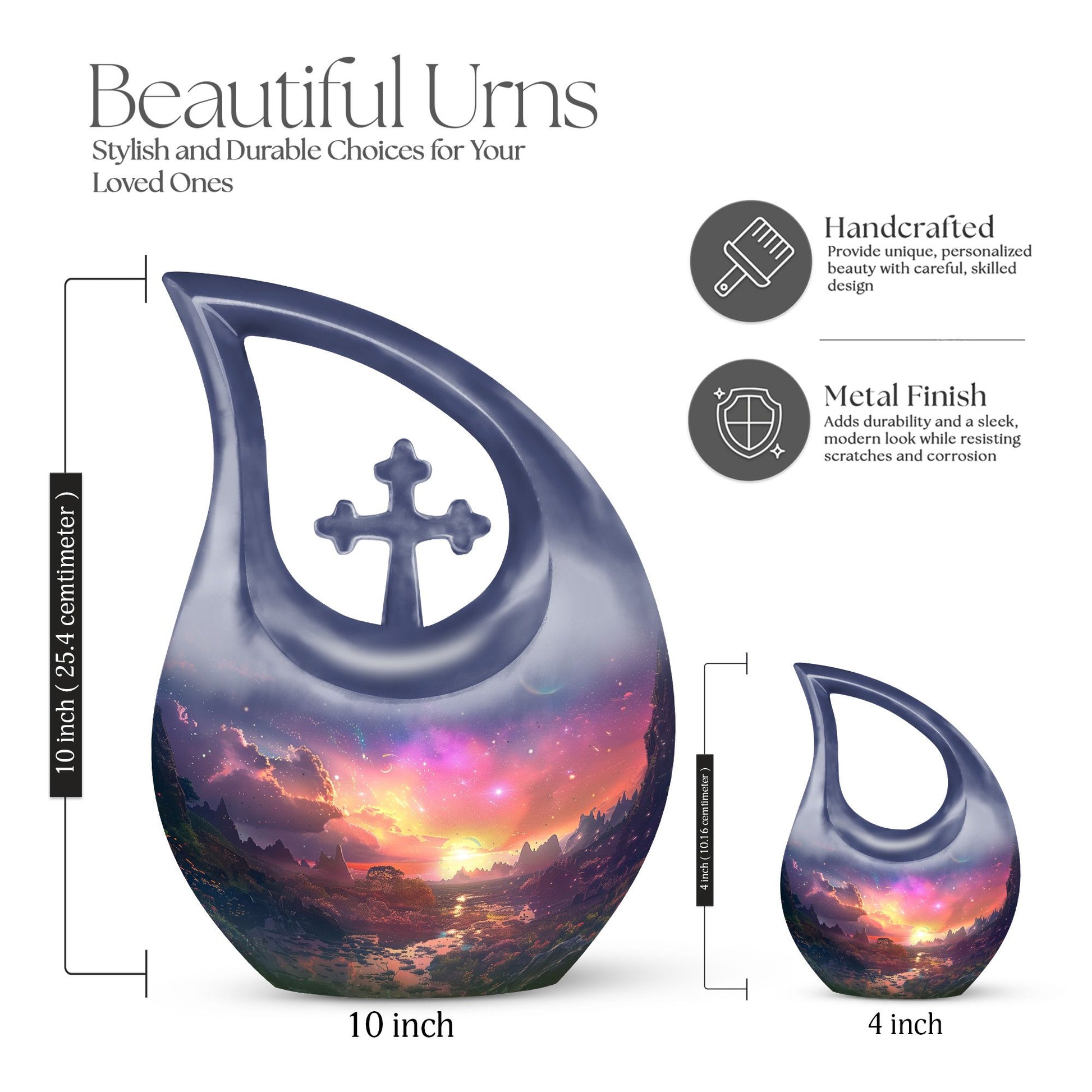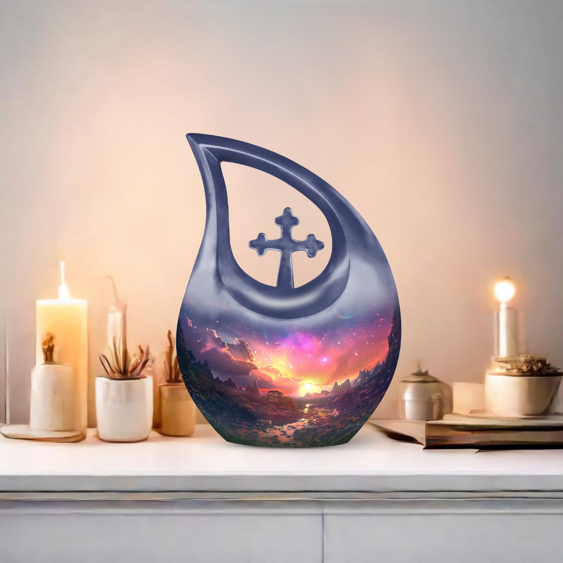Illuminate your cherished memories with the Dreamscape Twilight Urn, a beautifully crafted vessel to hold the ashes of a loved one. This large-sized urn, standing tall at 10 inches, comfortably accommodates up to 200 cubic inches of ashes. Made from high-quality aluminium, this personalized urn weighs a solid 3.3 pounds, ensuring durability and longevity. Its mesmerizing cross drop theme echoes a sublime dreamy twilight, resonating a peaceful serenity that befits its purpose. The inclusion of a soft velvet pouch adds a delicate touch, safeguarding the containment of ashes within. From Inexpensive Urns to Companion Urns For two adults, our range offers variety and individuality. This urn allows for customization, making it a touching tribute to uniquely honor and remember your loved one. The phrase 'memorial urns' and the terms 'cremation boxes' and 'cremation urns for mom' are often used by consumers in this category, reflecting the sensitive nature of the product's purpose.