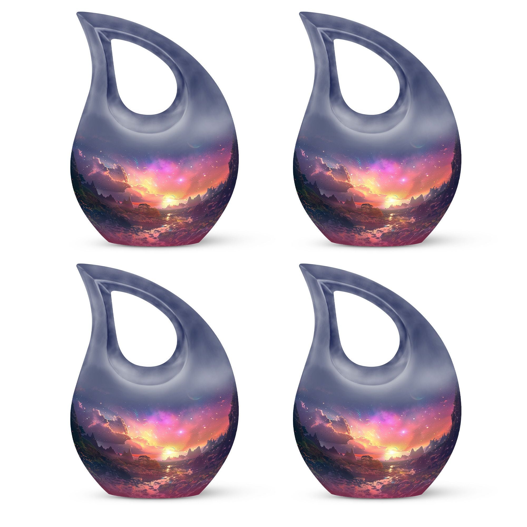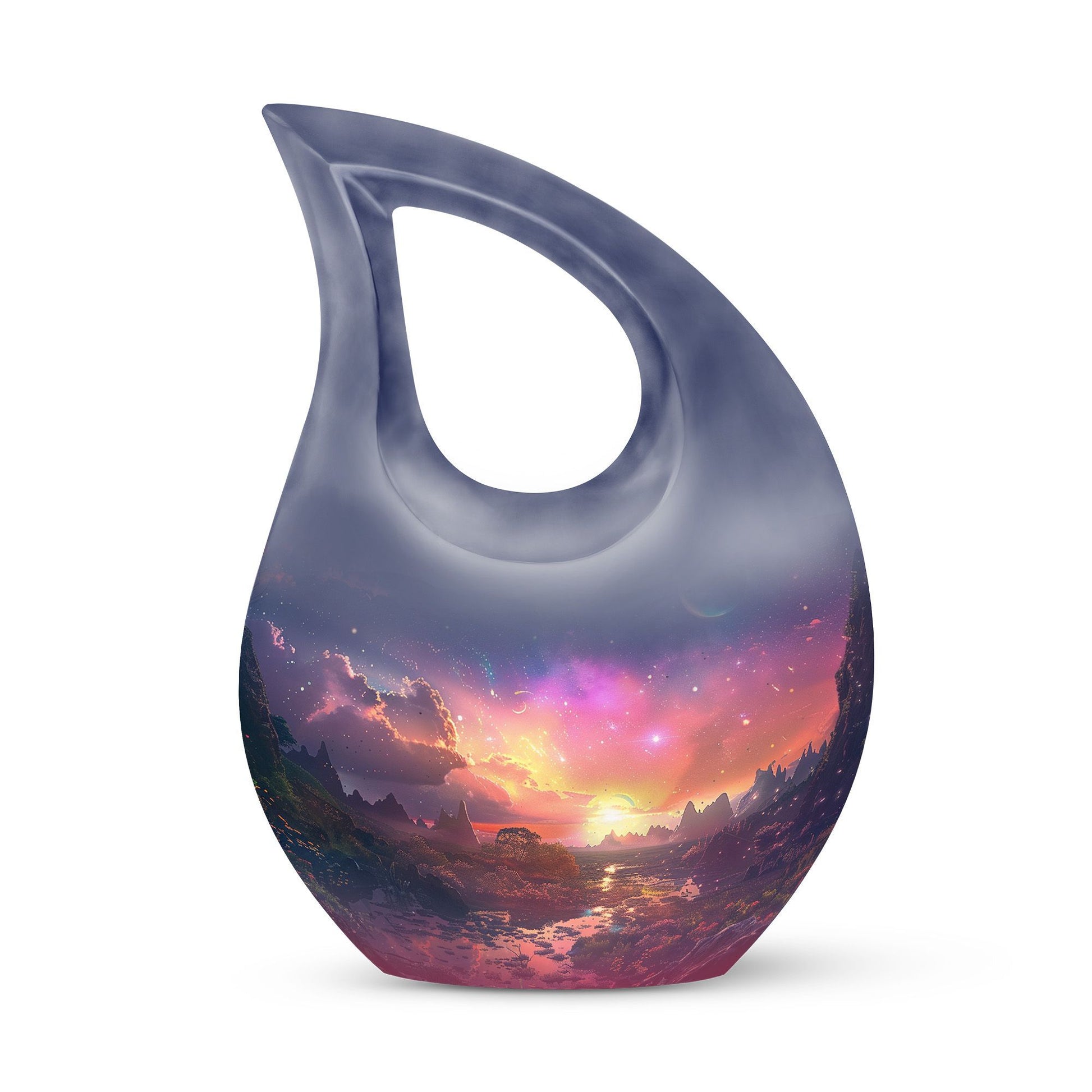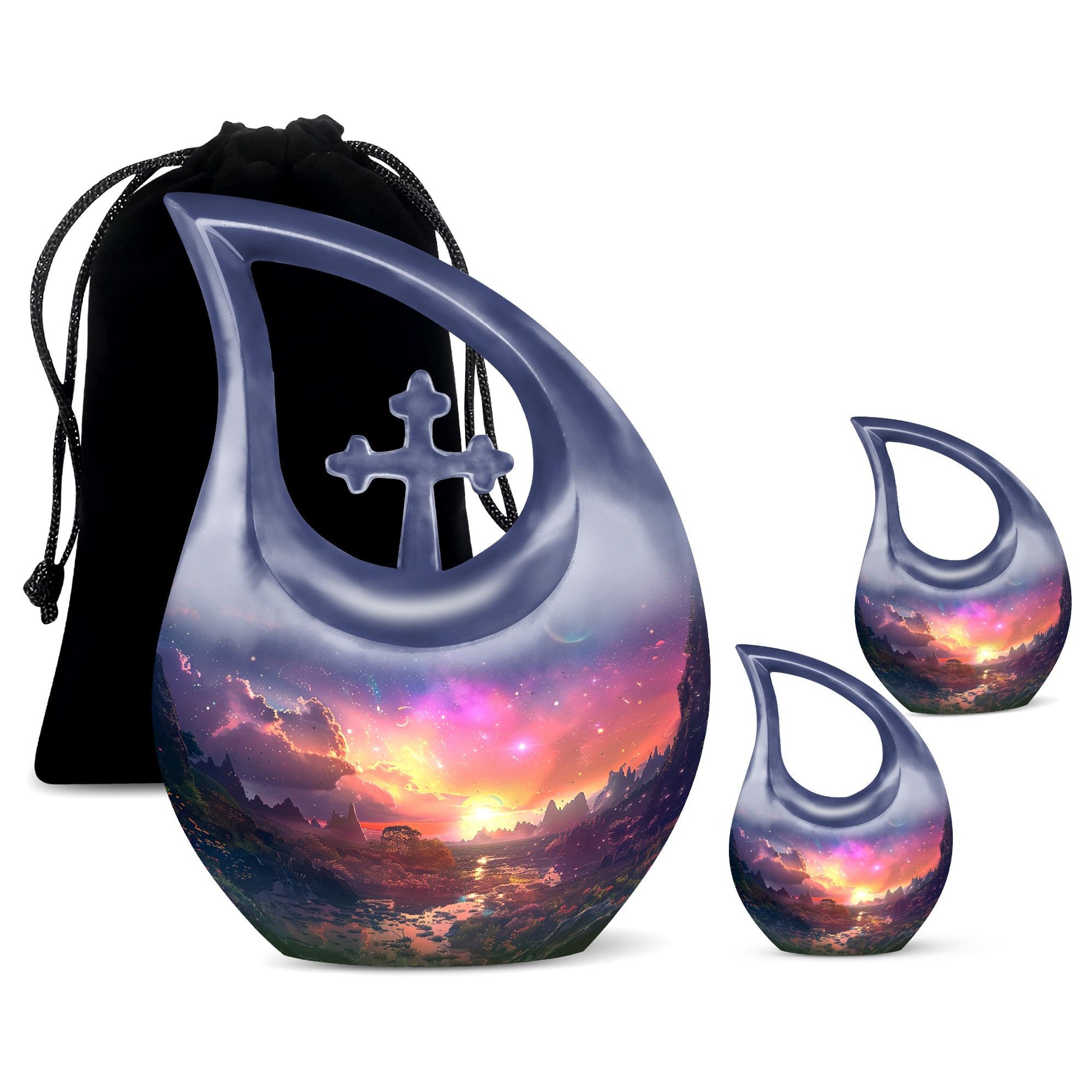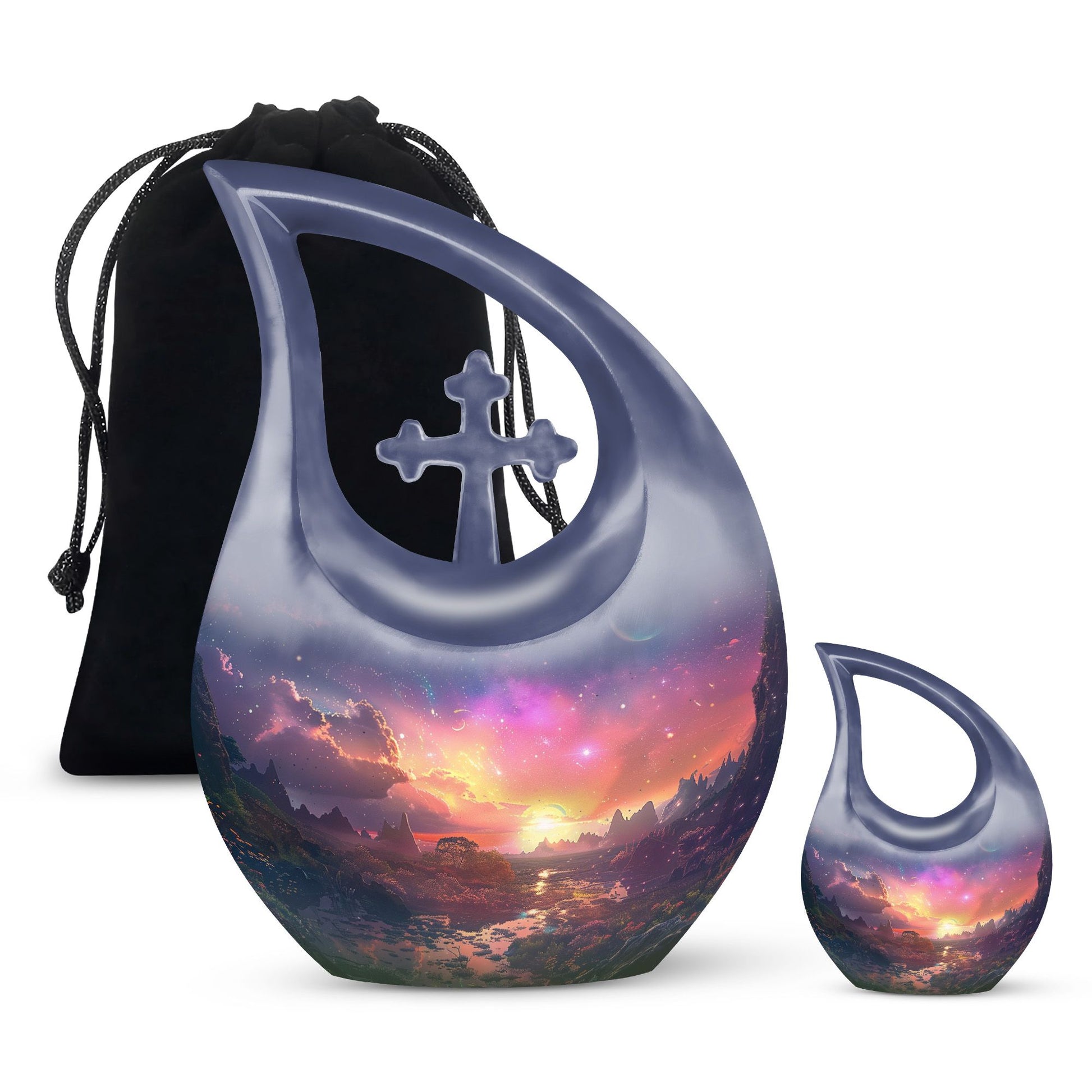 Illuminate your cherished memories with the Dreamscape Twilight Urn, a beautifully crafted vessel to hold the ashes of a loved one. This large-sized urn, standing tall at 10 inches, comfortably accommodates up to 200 cubic inches of ashes. Made from high-quality aluminium, this personalized urn weighs a solid 3.3 pounds, ensuring durability and longevity. Its mesmerizing cross drop theme echoes a sublime dreamy twilight, resonating a peaceful serenity that befits its purpose. The inclusion of a soft velvet pouch adds a delicate touch, safeguarding the containment of ashes within. From Inexpensive Urns to Companion Urns For two adults, our range offers variety and individuality. This urn allows for customization, making it a touching tribute to uniquely honor and remember your loved one. The phrase 'memorial urns' and the terms 'cremation boxes' and 'cremation urns for mom' are often used by consumers in this category, reflecting the sensitive nature of the product's purpose.