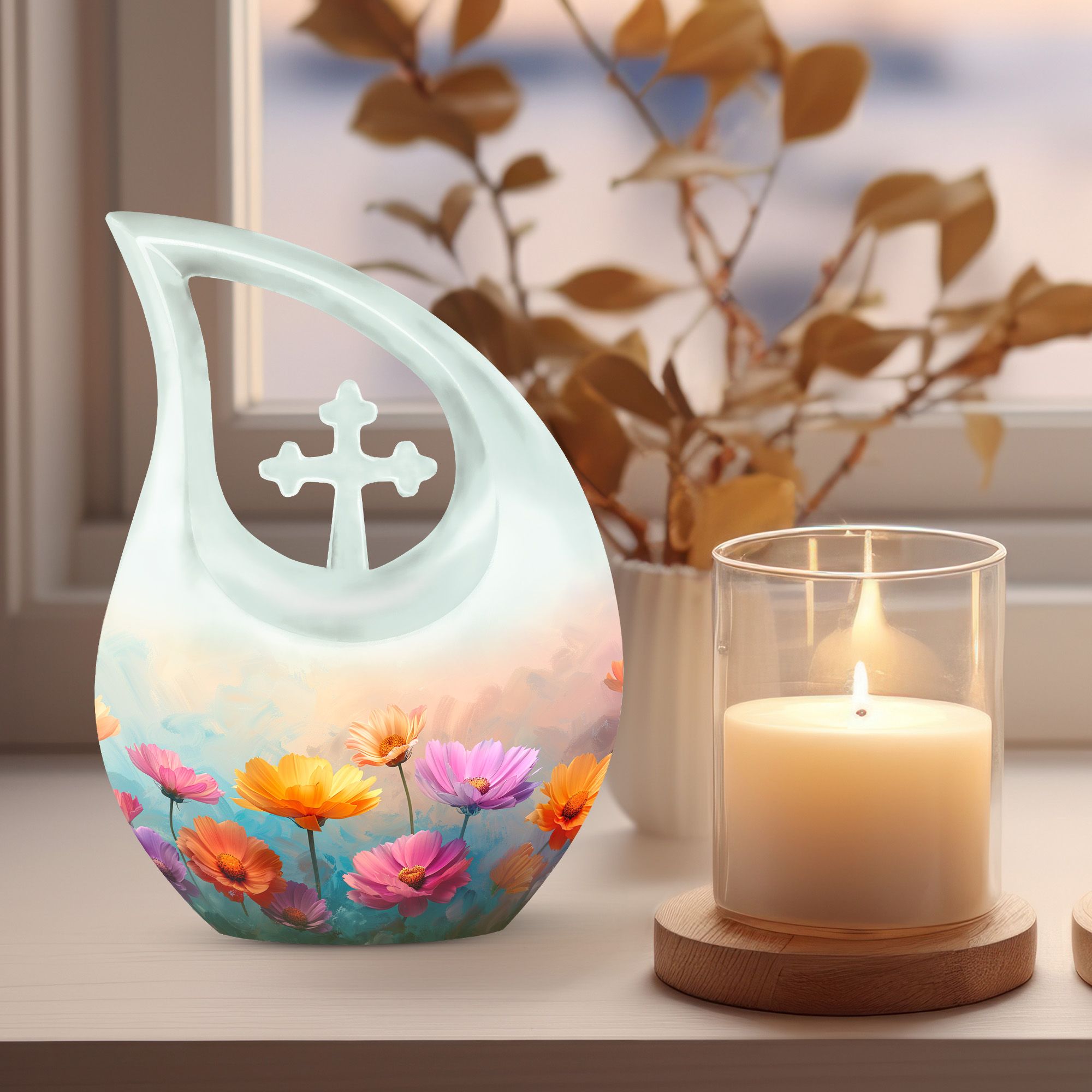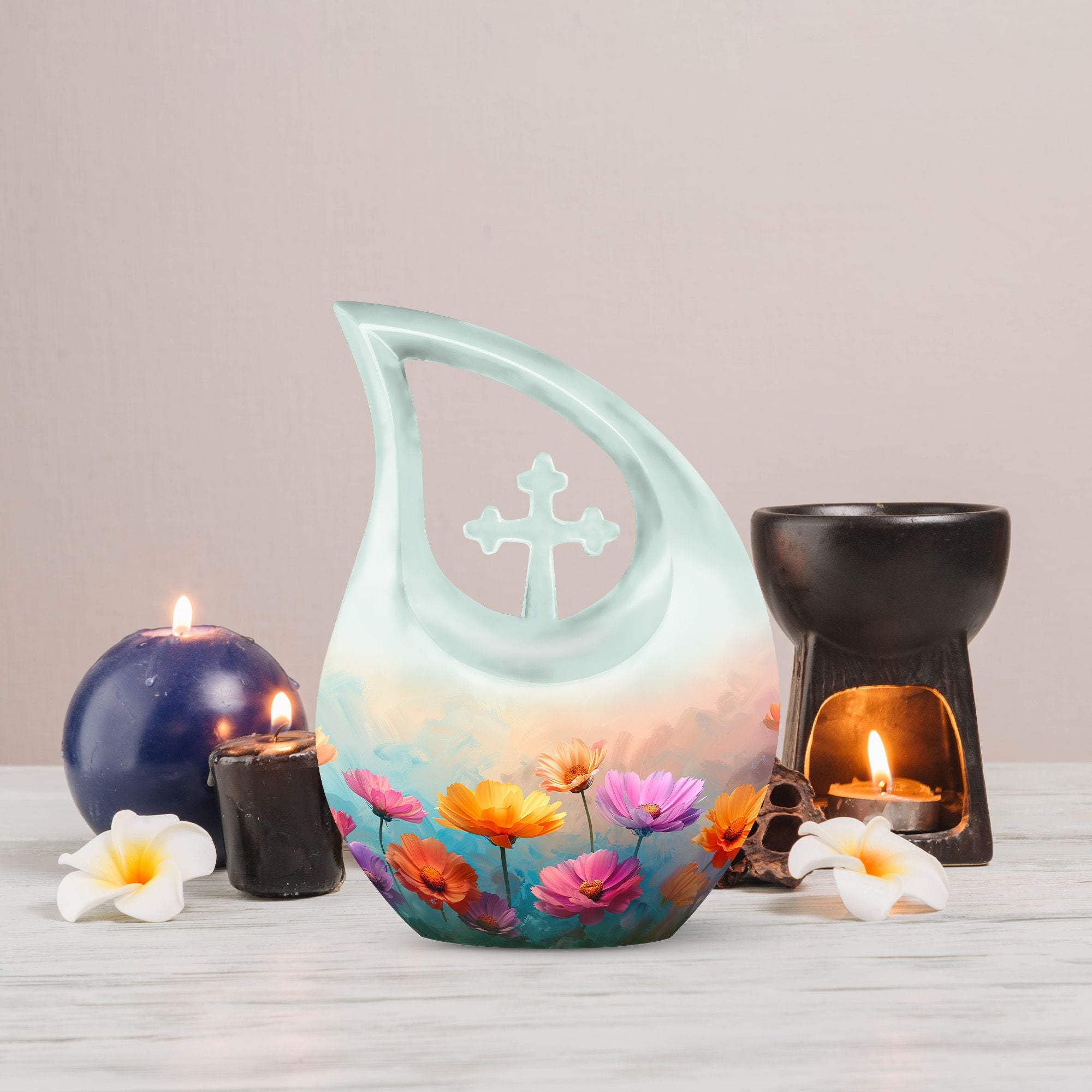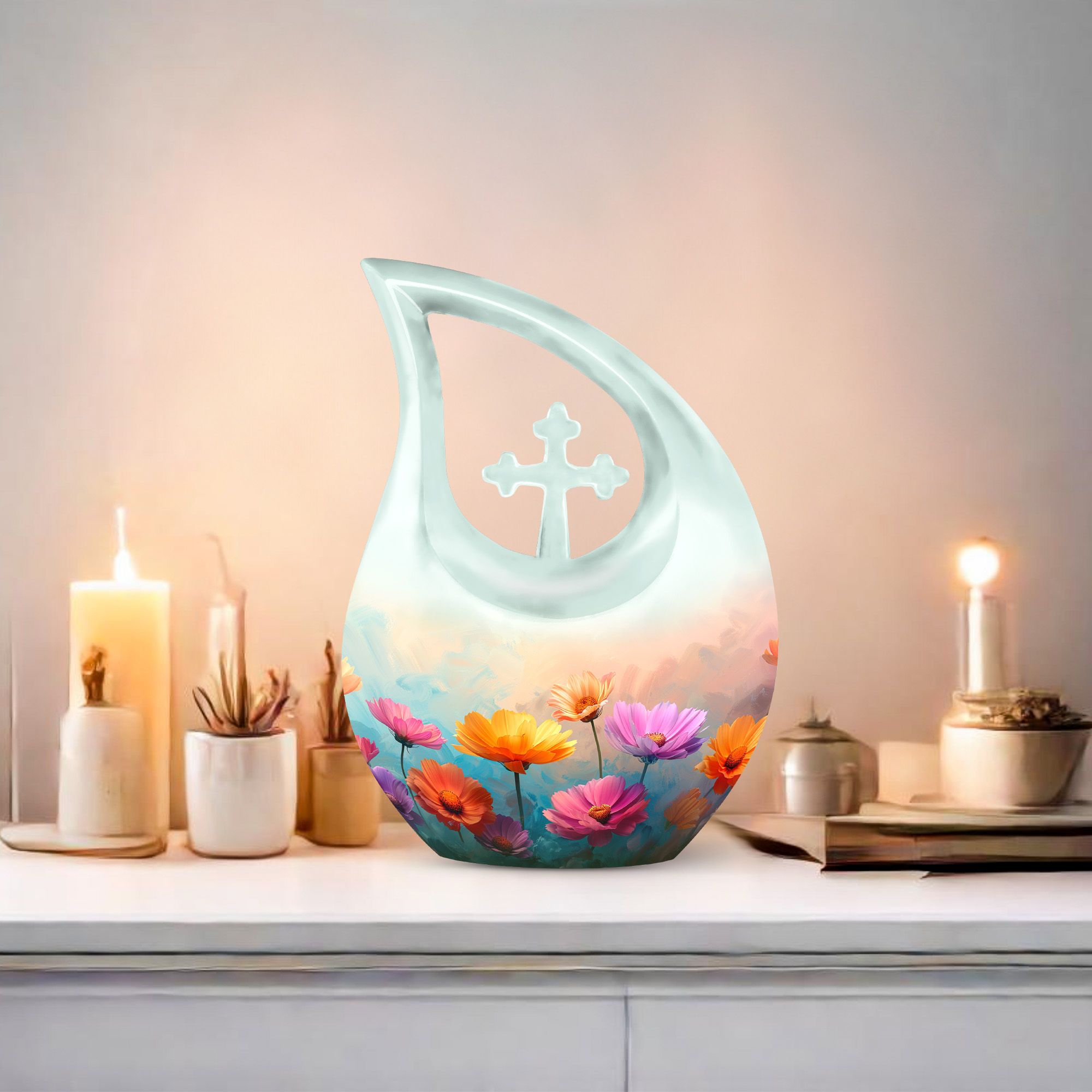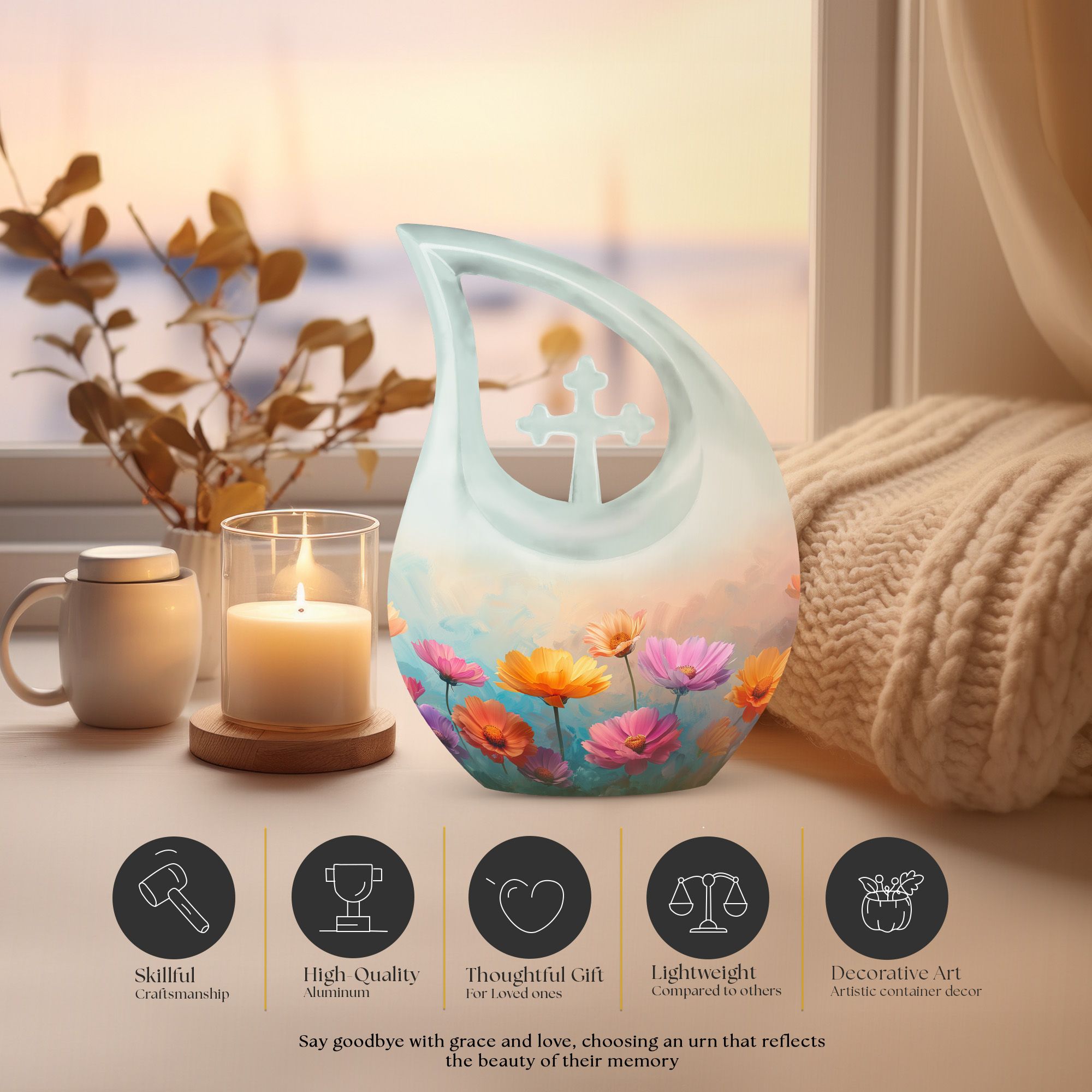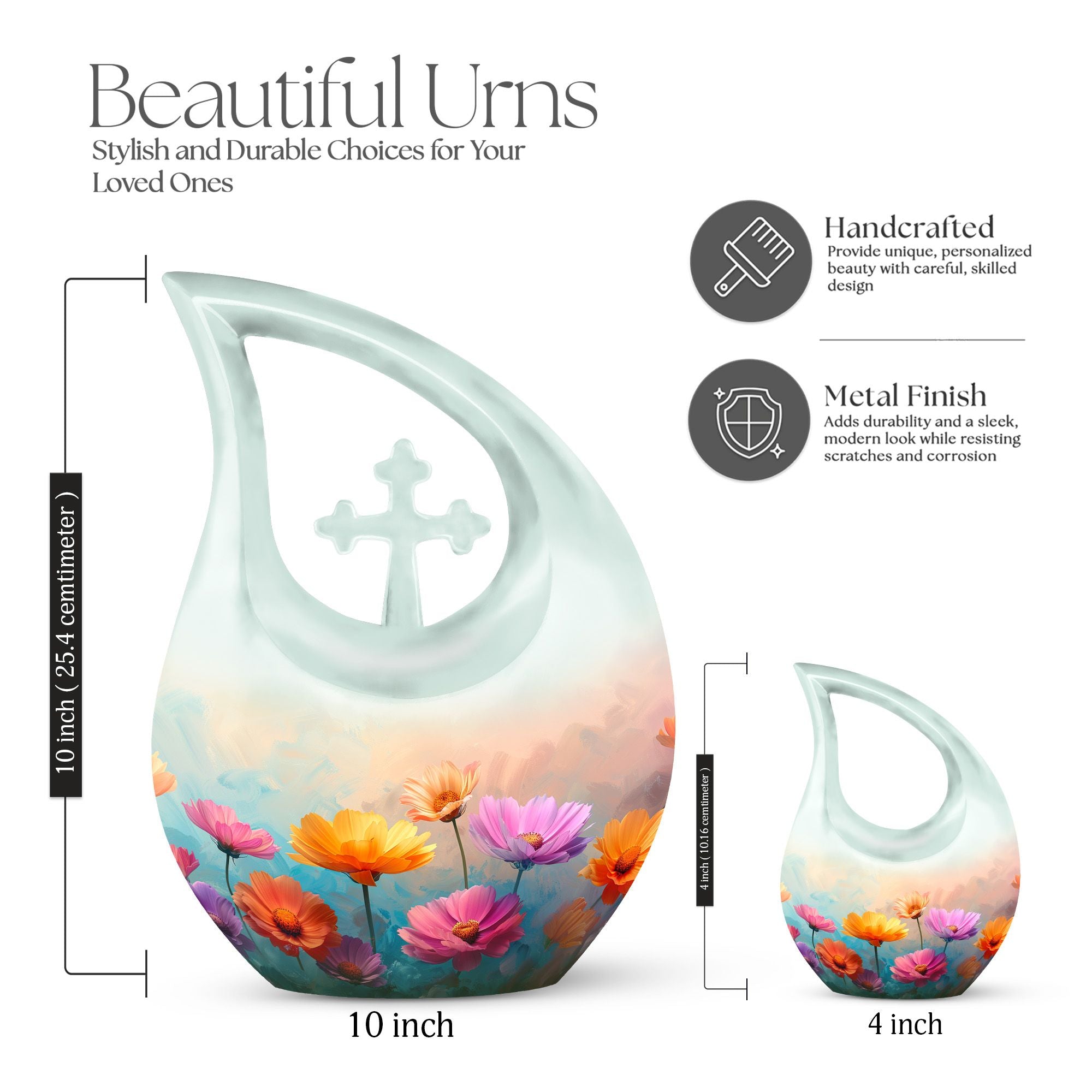 Honor the memory of your beloved with our Dreamy Blossoms A Urn, a perfect choice for those seeking large urns or double urns for ashes. Encased within this 10-inch urn, are plentiful memory spaces with its capacity of 200 cubic inches. It weighs a solid but manageable 3.3 pounds and is constructed from quality and lasting aluminium. Its motif features a tasteful cross drop, invoking a sense of reverence and peace. The package includes a soft velvet pouch for tasteful containment and discreet storage of ashes. What gives the Dreamy Blossoms A Urn its unique identity, is the offered customization. Personalize this remarkable piece with engraved names to make a heart-touching tribute to your loved ones. This product is ideal for those seeking unique urns for ashes or cheap cremation urns without sacrificing quality. Celebrate their life journey with our Dreamy Blossoms A Urn. Please note that design elements are not included in the description due to specifications.